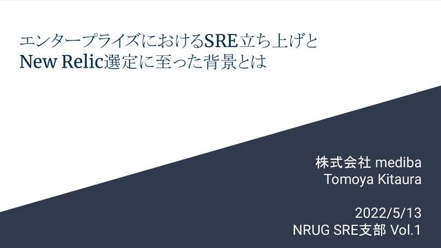 エンタープライズにおけるSRE立ち上げと New Relic選定に至った背景とは 株式会社 mediba Tomoya Kitaura 2022/5/13 NRUG SRE支部
