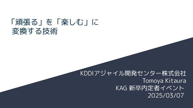 「頑張る」を「楽しむ」に 変換する技術 KDDIアジャイル開発センター株式会社 Tomoya Kitaura KAG 新卒内定者イベント 2025/03/07