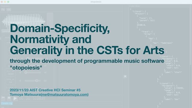 } let FadeInOut = |time_in,time_out,origin|{ let time_in = Param("time_in",0.01,0.0..inf); let time_out = Param("time_out",0.01,0.0..inf); Region({ start: origin.start dur : origin.dur content: apply_fadeinout(start,dur,time_in,time_out,origin.content) }) } let project = |sample_rate|{ let tracks = Track([ FadeInOut( 0.1, 0.1, region: { start:0.0, dur: 1.0, content: || sinewave{ Param("freq",440.0,20.0..20000.0) Param("amp",1.0,0.0..1.0) Param("phase",0.0,0.0..1.0) } } ) ]); tracks.map(|t| t.render()).sum() } • FadeInOut function takes a region, return new Region, with modi fi cation of the content (Code syntax is pseudo-code)