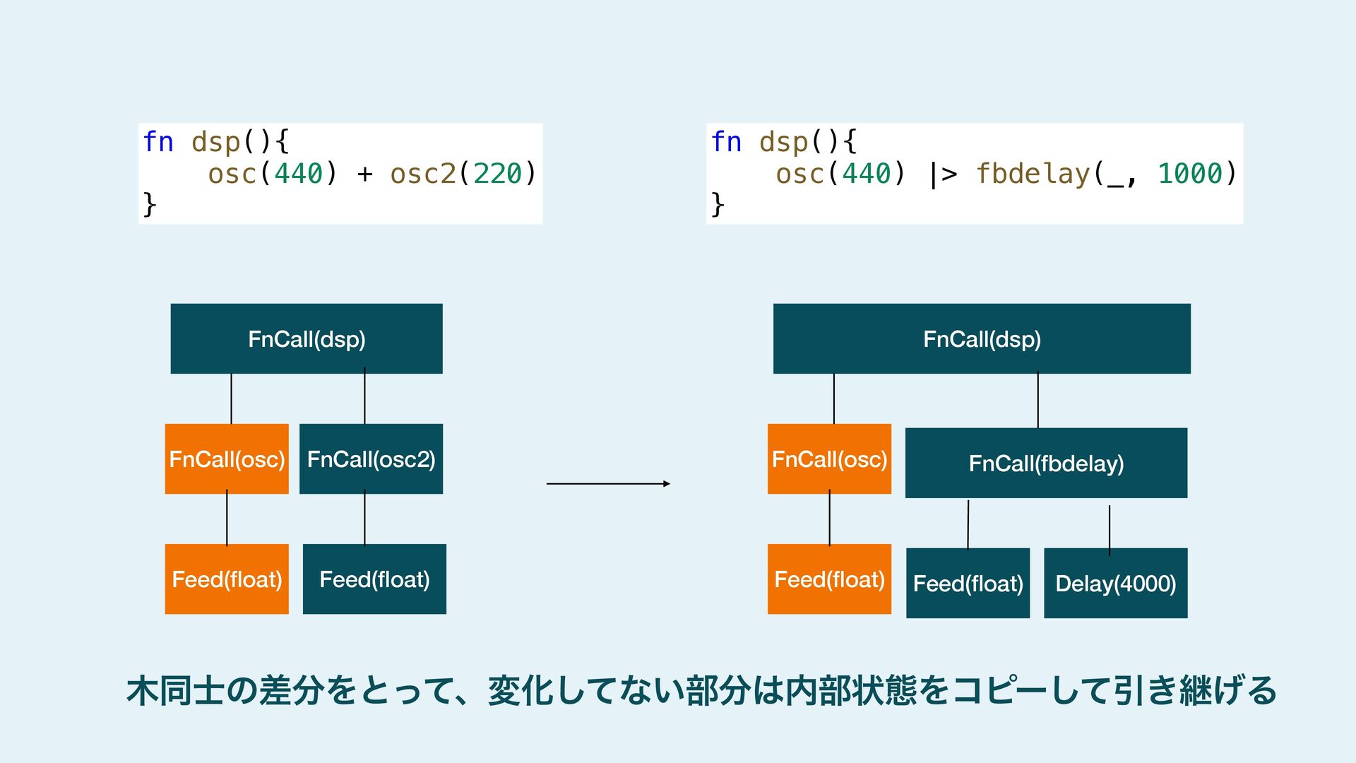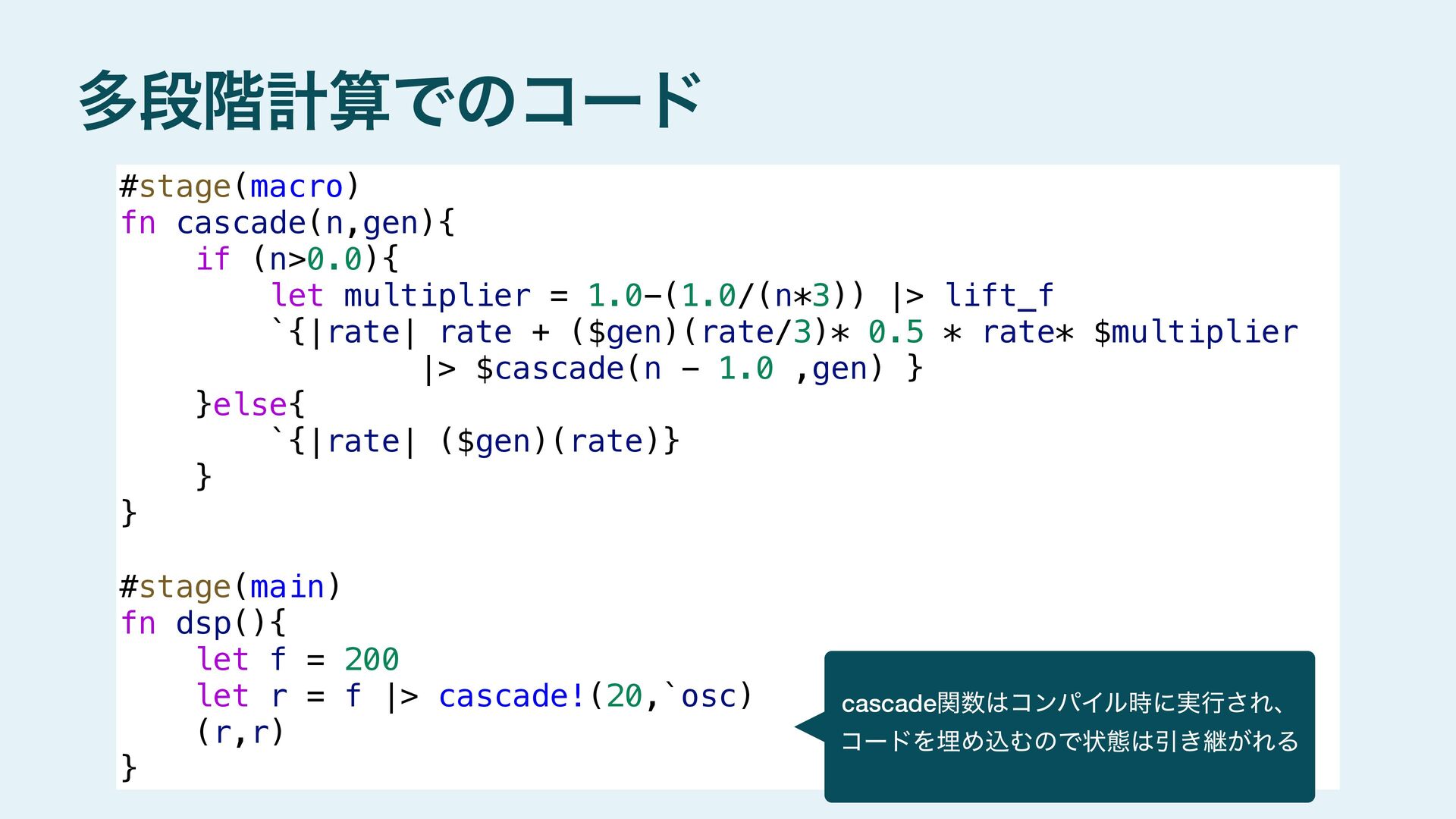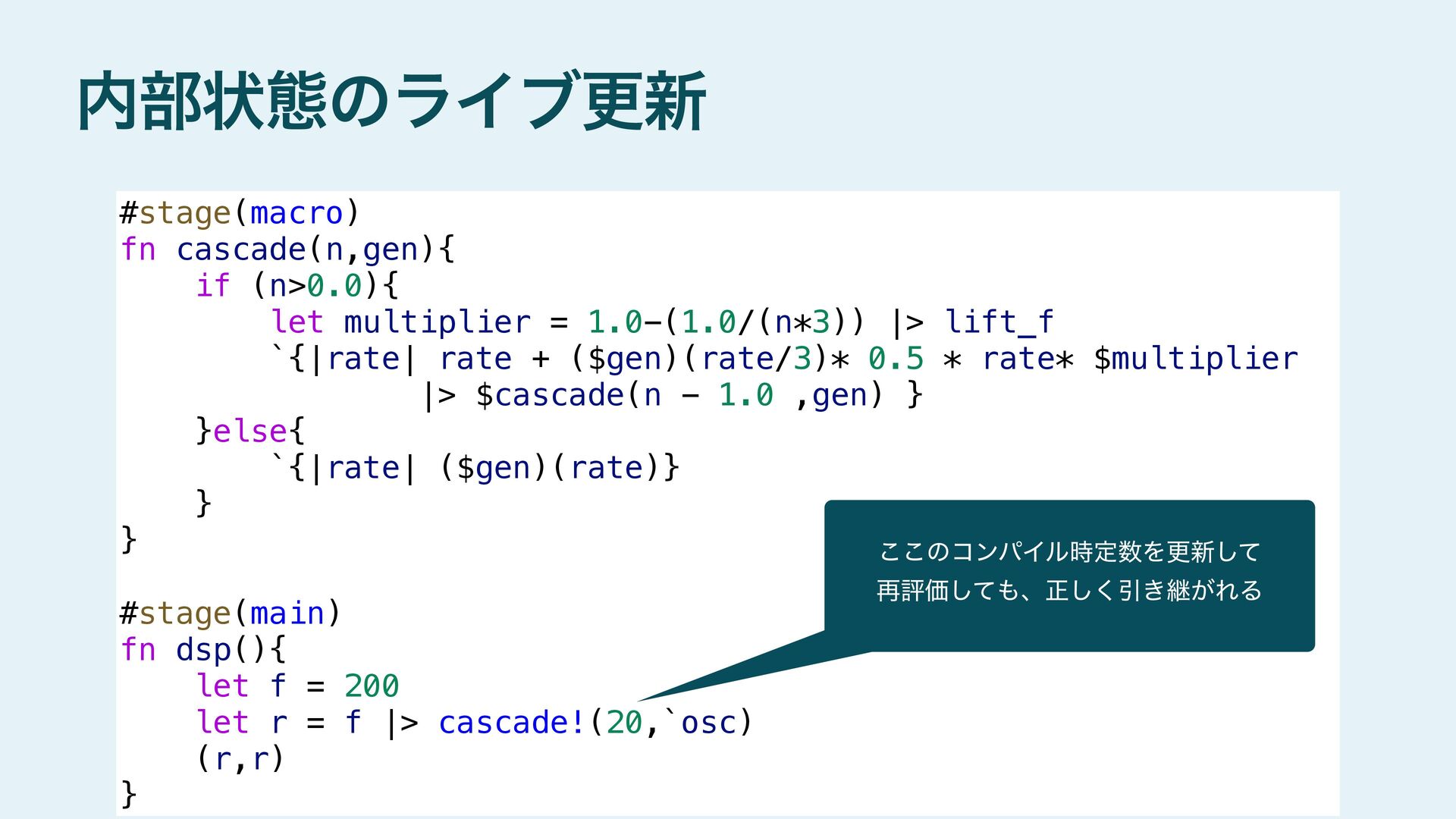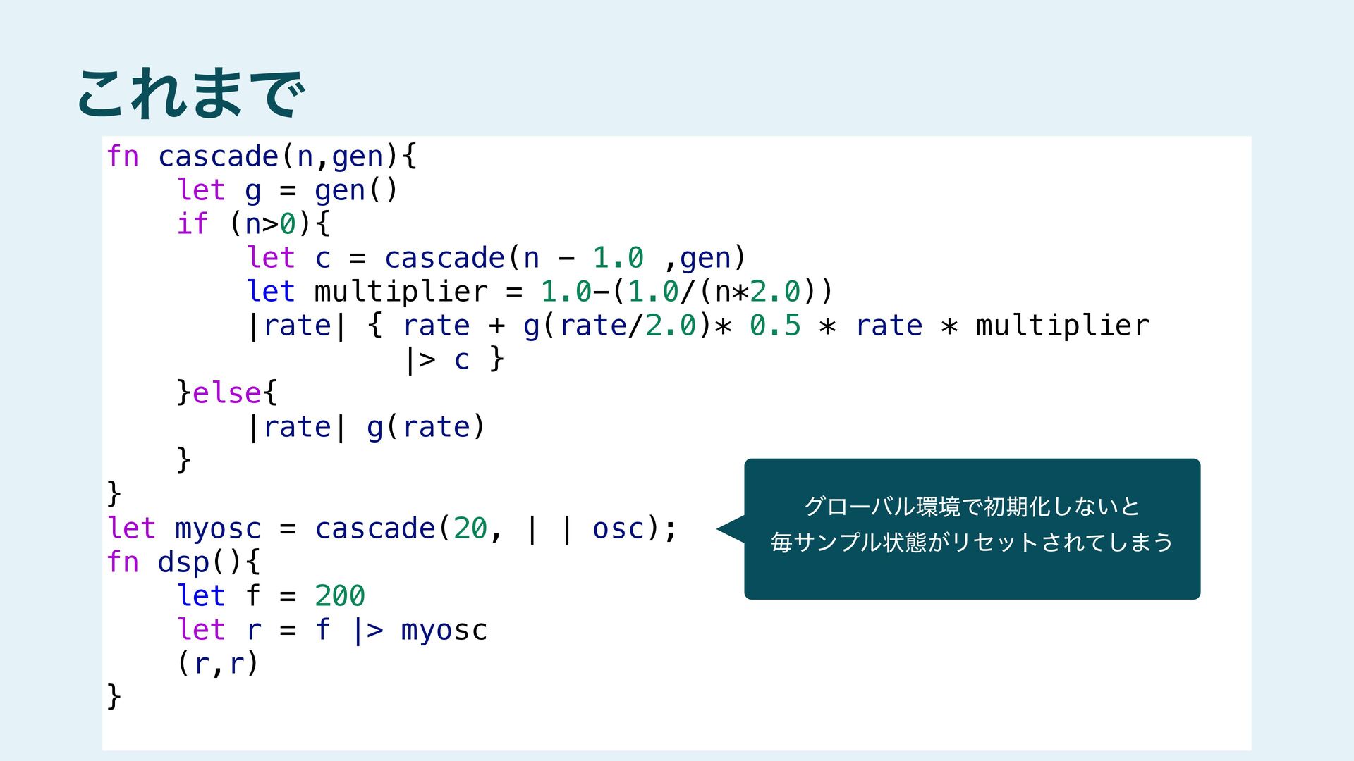c = cascade(n - 1.0 ,gen) let multiplier = 1.0-(1.0/(n*2.0)) |rate| { rate + g(rate/2.0)* 0.5 * rate * multiplier |> c } }else{ |rate| g(rate) } } let myosc = cascade(20, | | osc); fn dsp(){ let f = 200 let r = f |> myosc (r,r) } άϩʔόϧڥͰॳظԽ͠ͳ͍ͱ ຖαϯϓϧঢ়ଶ͕Ϧηοτ͞Εͯ͠·͏