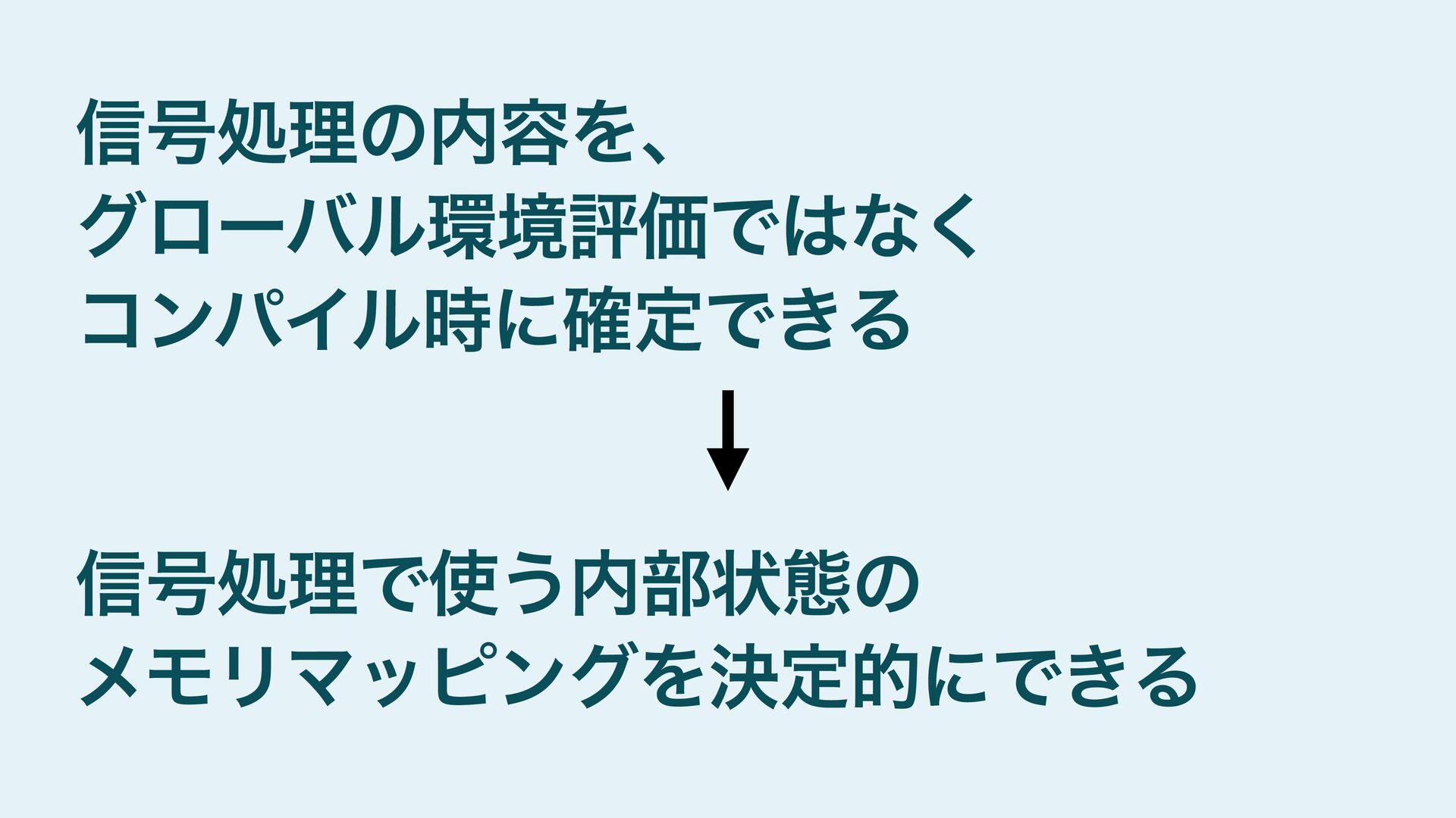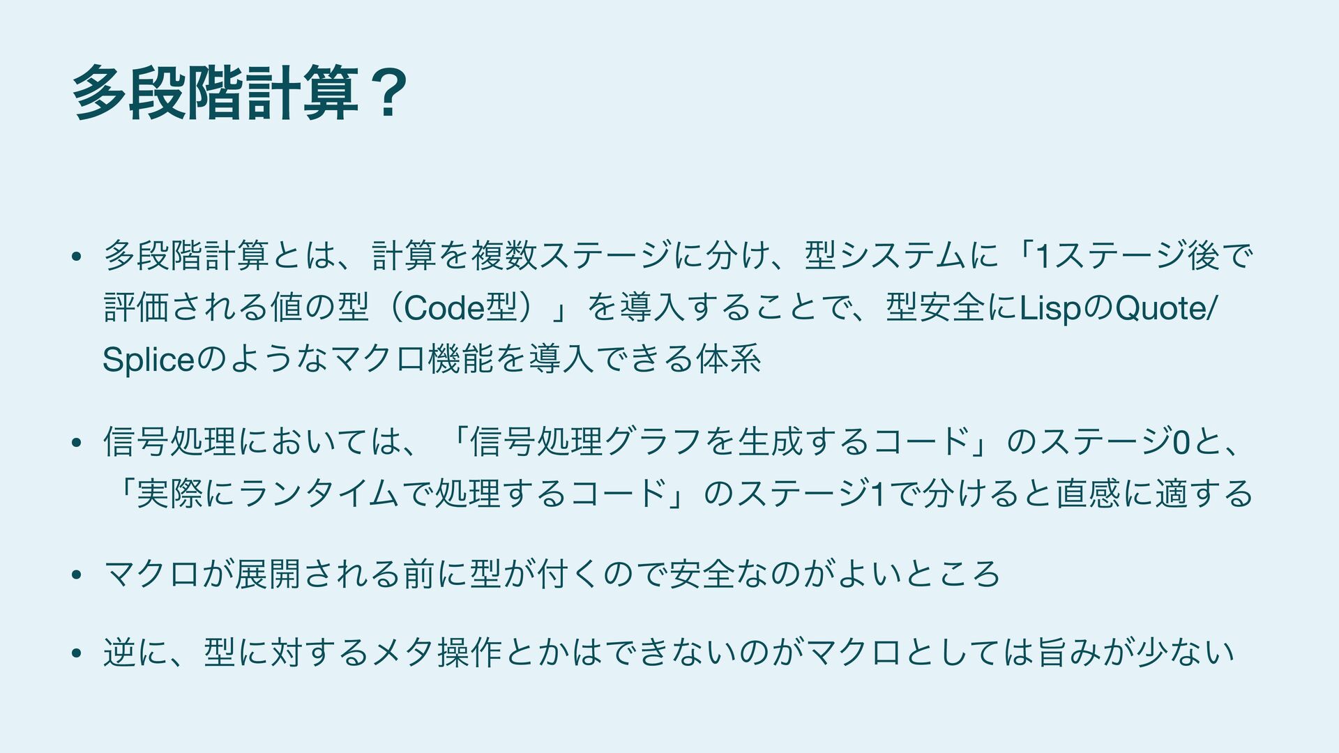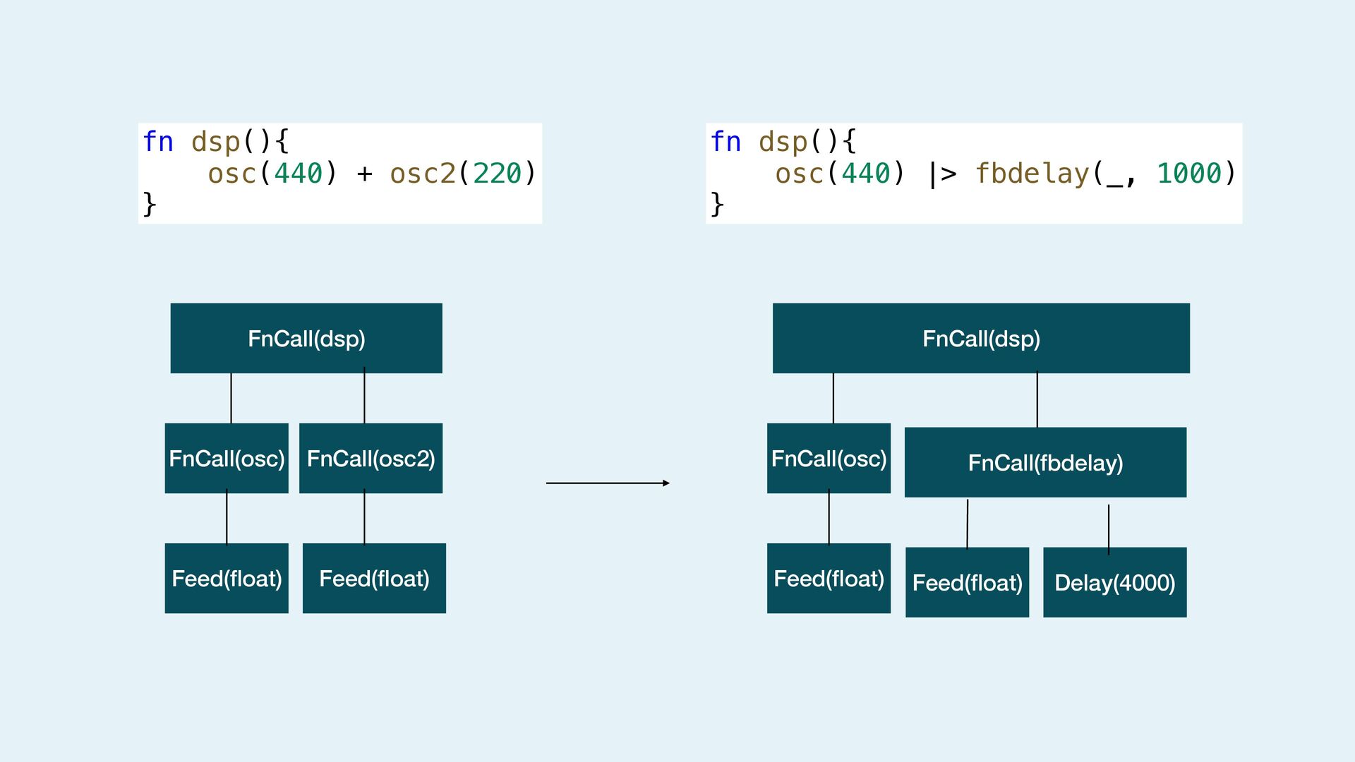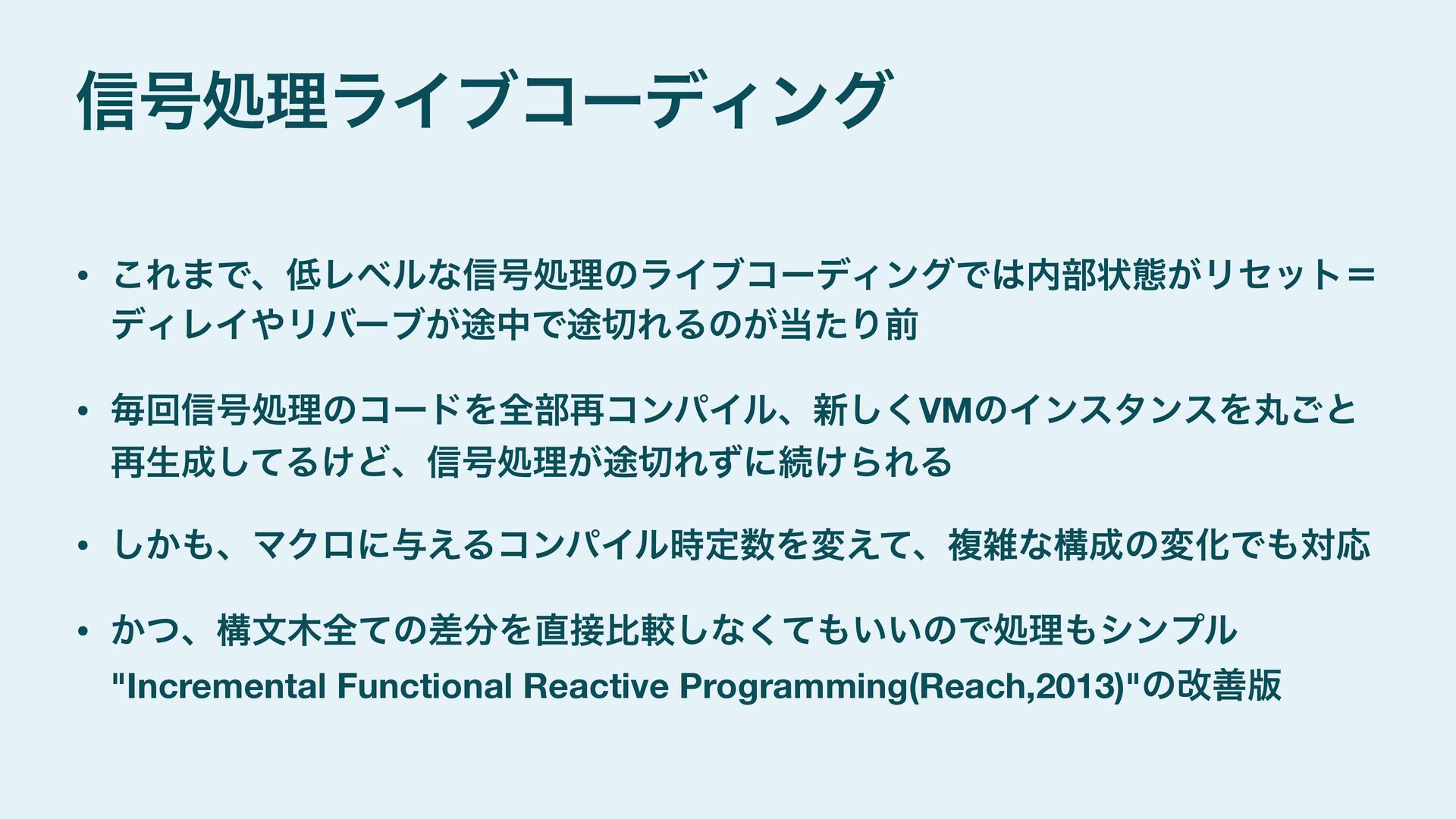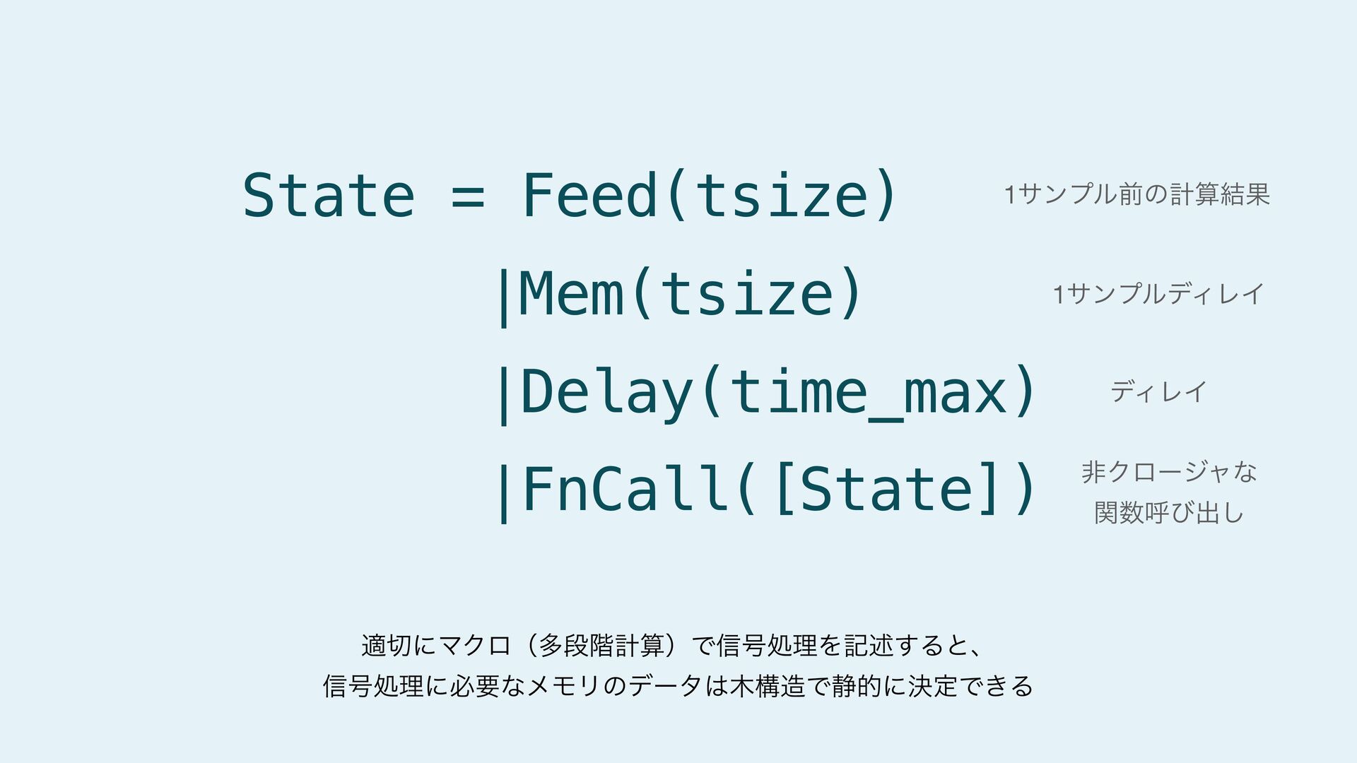 c = cascade(n - 1.0 ,gen) let multiplier = 1.0-(1.0/(n*2.0)) |rate| { rate + g(rate/2.0)* 0.5 * rate * multiplier |> c } }else{ |rate| g(rate) } } let myosc = cascade(20, | | osc); fn dsp(){ let f = 200 let r = f |> myosc (r,r) } άϩʔόϧڥͰॳظԽ͠ͳ͍ͱ ຖαϯϓϧঢ়ଶ͕Ϧηοτ͞Εͯ͠·͏