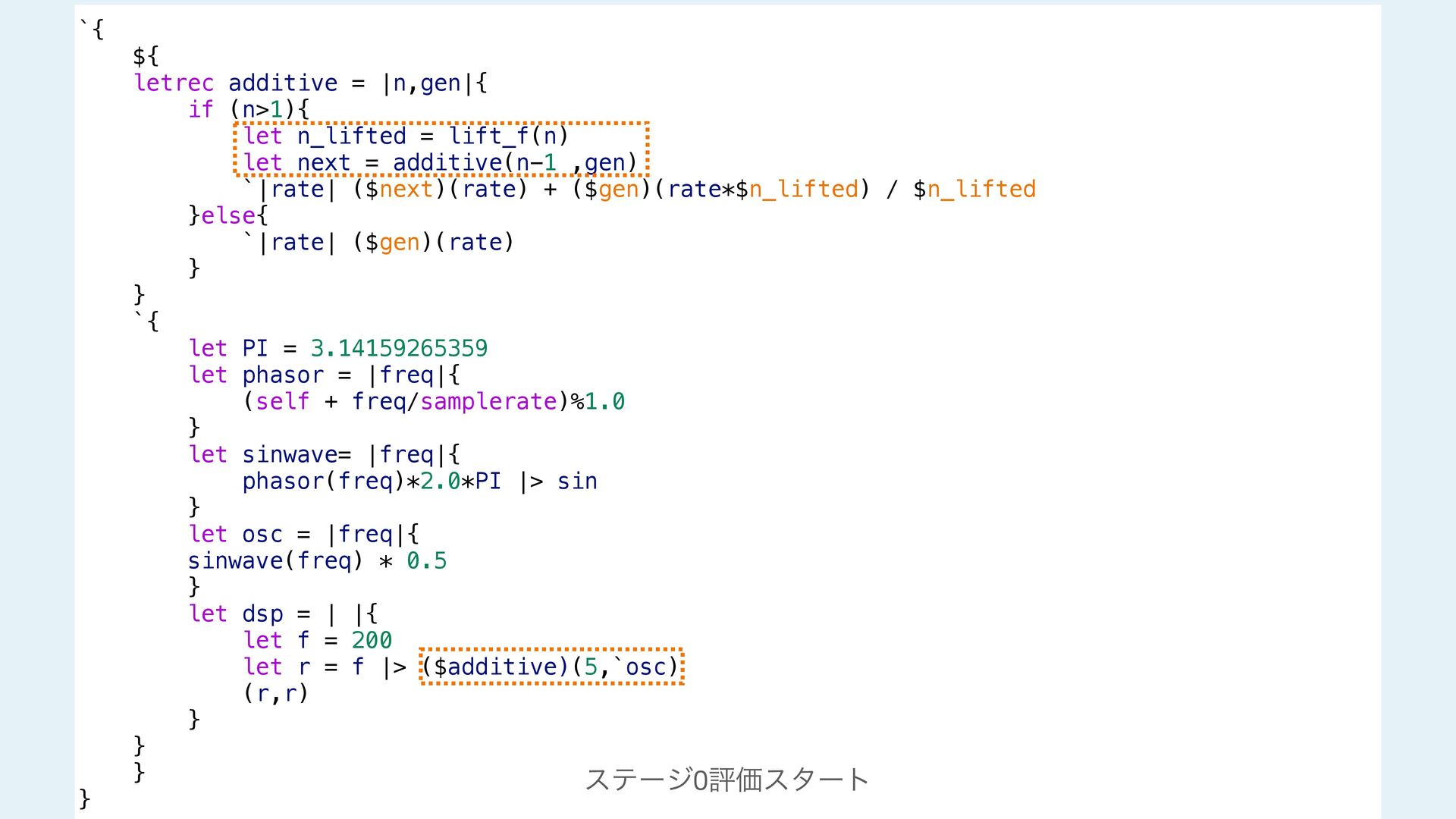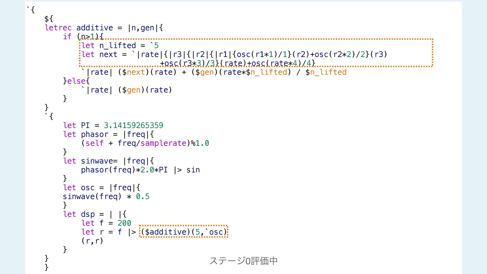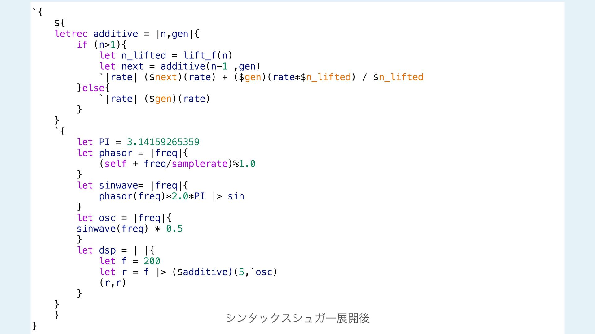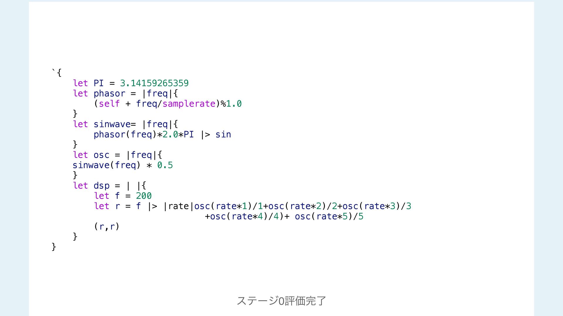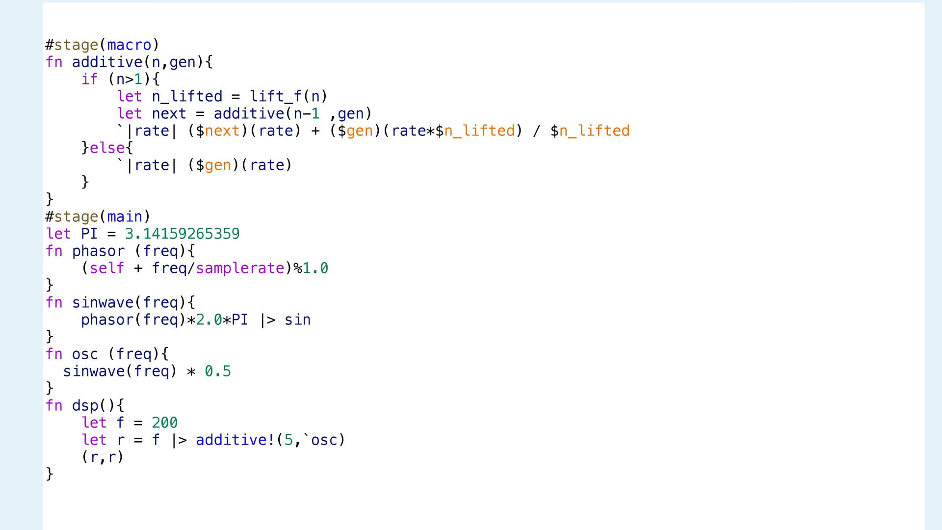 next = additive(n-1 ,gen) `|rate| ($next)(rate) + ($gen)(rate*$n_lifted) / $n_lifted }else{ `|rate| ($gen)(rate) } } #stage(main) let PI = 3.14159265359 fn phasor (freq){ (self + freq/samplerate)%1.0 } fn sinwave(freq){ phasor(freq)*2.0*PI |> sin } fn osc (freq){ sinwave(freq) * 0.5 } fn dsp(){ let f = 200 let r = f |> additive!(5,`osc) (r,r) } #stage(macro) fn additive(n,gen){ if (n>1){ let n_lifted = lift_f(n) let next = additive(n-1 ,gen) `|rate| ($next)(rate) + ($gen)(rate*$n_lifted) / $n_lifted }else{ `|rate| ($gen)(rate) } } #stage(main) let PI = 3.14159265359 fn phasor (freq){ (self + freq/samplerate)%1.0 } fn sinwave(freq){ phasor(freq)*2.0*PI |> sin } fn osc (freq){ sinwave(freq) * 0.5 } fn dsp(){ let f = 200 let r = f |> additive!(5,`osc) (r,r) }