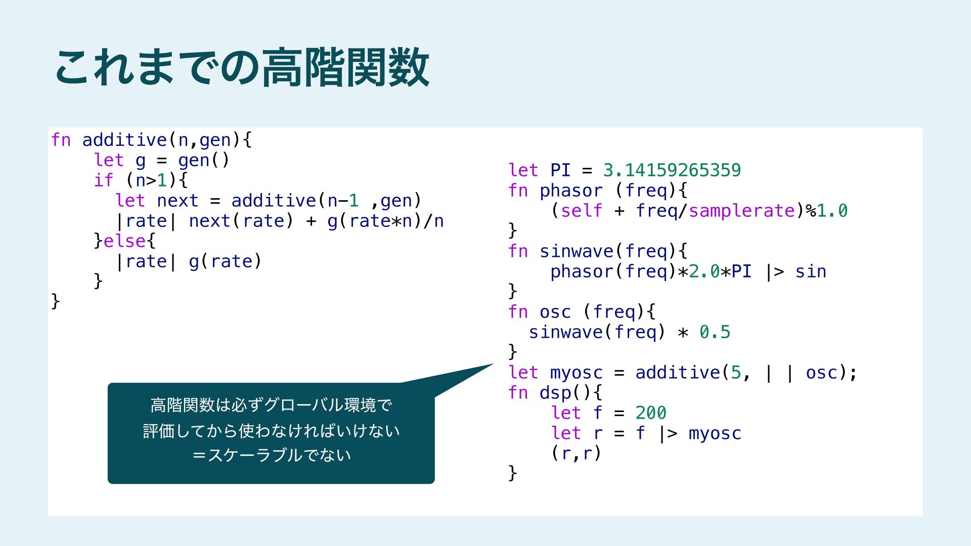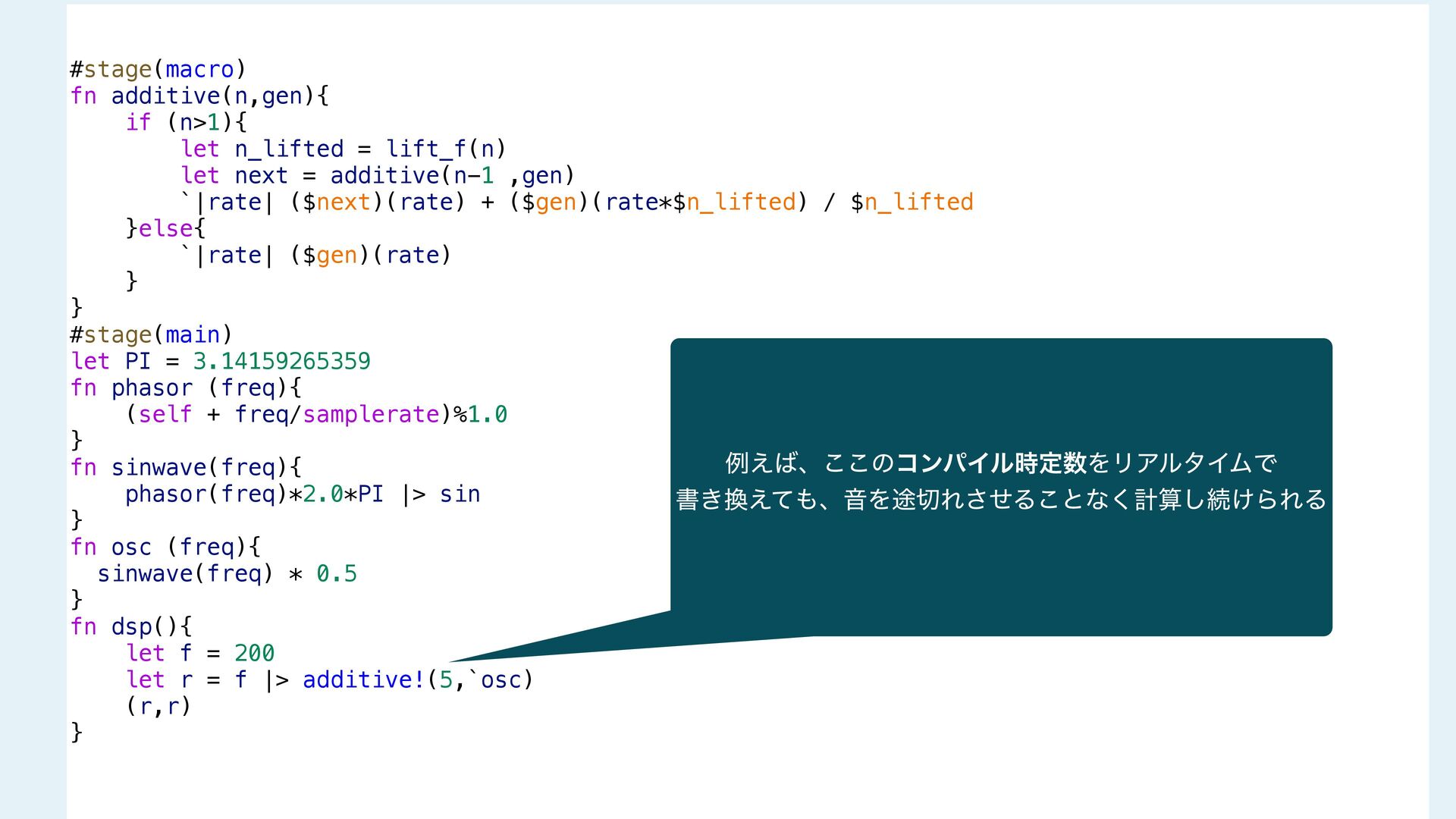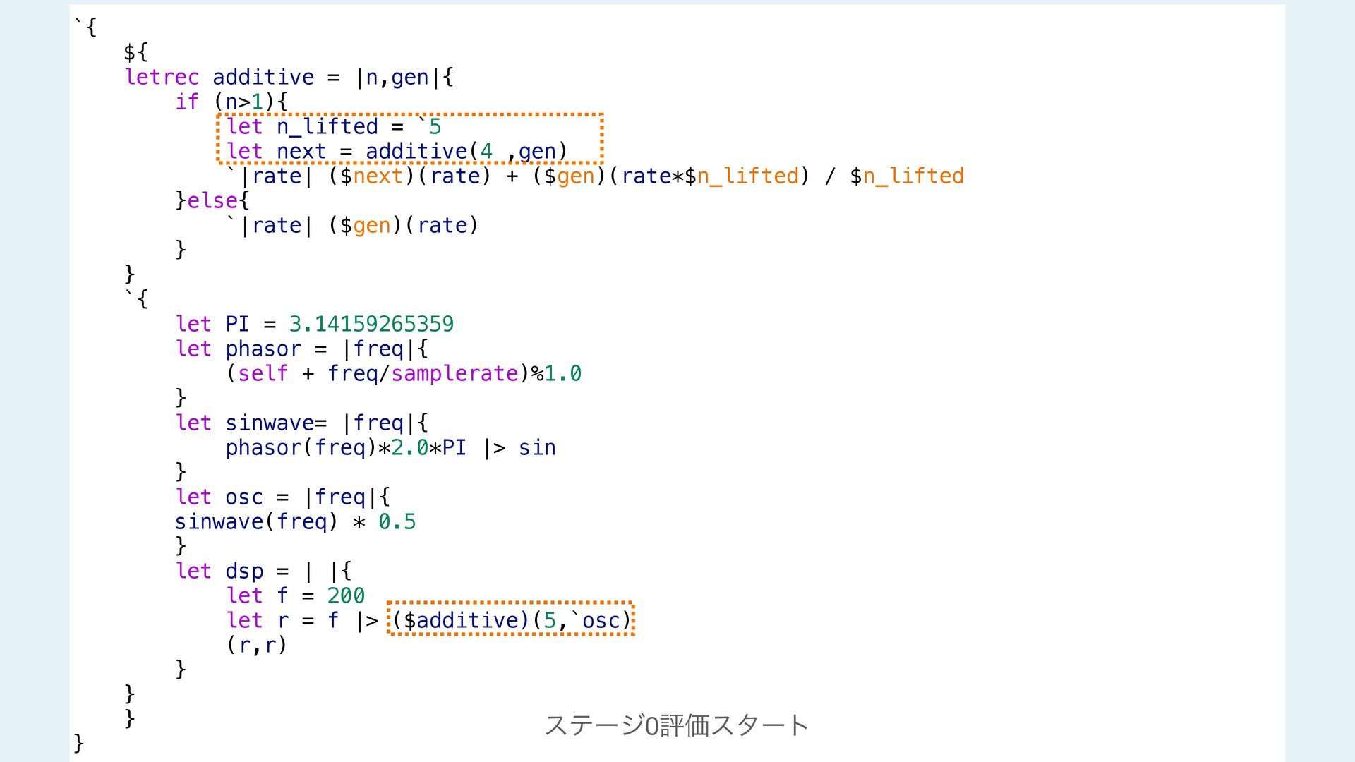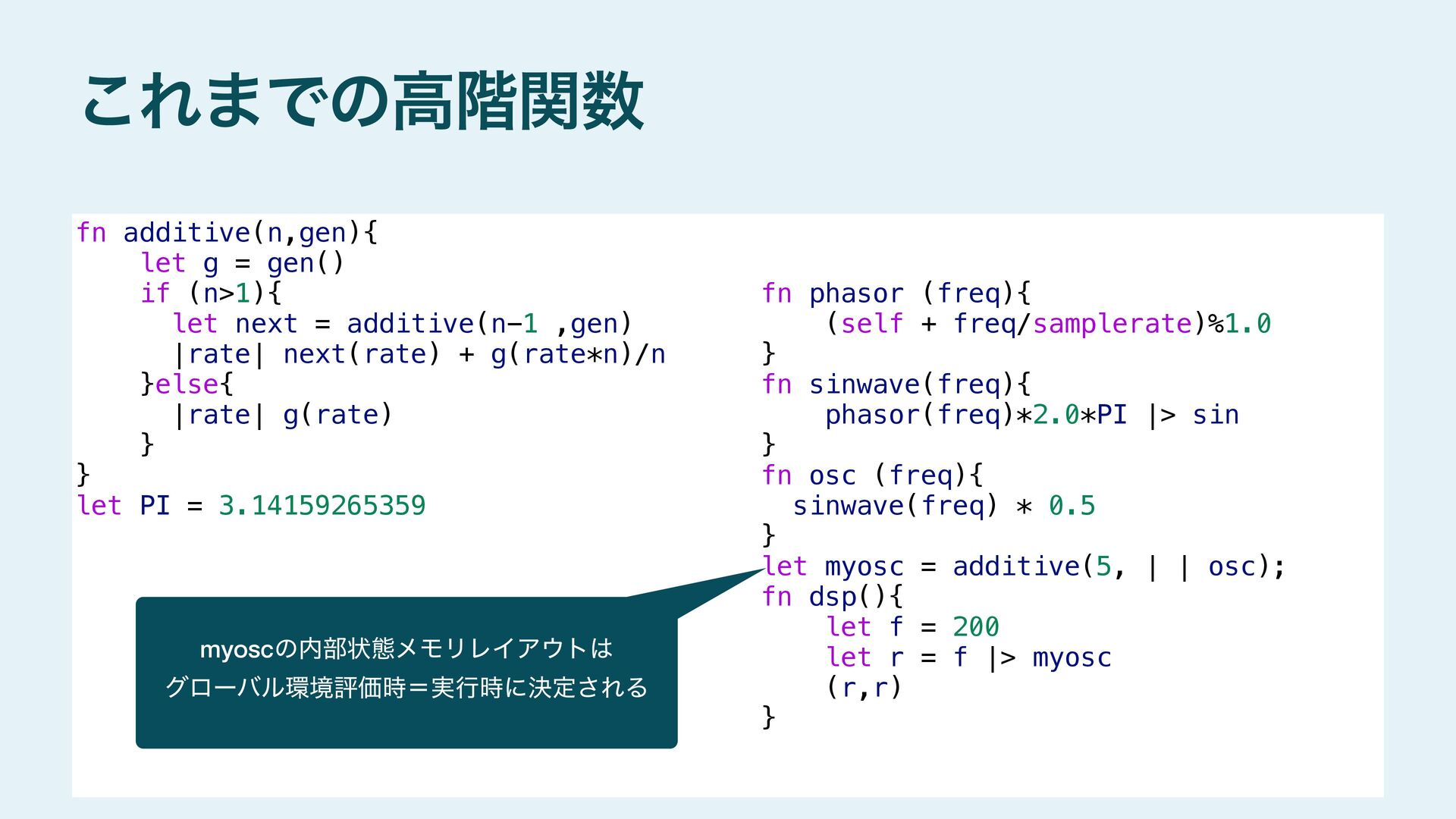 next = additive(n-1 ,gen) `|rate| ($next)(rate) + ($gen)(rate*$n_lifted) / $n_lifted }else{ `|rate| ($gen)(rate) } } #stage(main) let PI = 3.14159265359 fn phasor (freq){ (self + freq/samplerate)%1.0 } fn sinwave(freq){ phasor(freq)*2.0*PI |> sin } fn osc (freq){ sinwave(freq) * 0.5 } fn dsp(){ let f = 200 let r = f |> additive!(5,`osc) (r,r) } #stage(macro) fn additive(n,gen){ if (n>1){ let n_lifted = lift_f(n) let next = additive(n-1 ,gen) `|rate| ($next)(rate) + ($gen)(rate*$n_lifted) / $n_lifted }else{ `|rate| ($gen)(rate) } } #stage(main) let PI = 3.14159265359 fn phasor (freq){ (self + freq/samplerate)%1.0 } fn sinwave(freq){ phasor(freq)*2.0*PI |> sin } fn osc (freq){ sinwave(freq) * 0.5 } fn dsp(){ let f = 200 let r = f |> additive!(5,`osc) (r,r) }