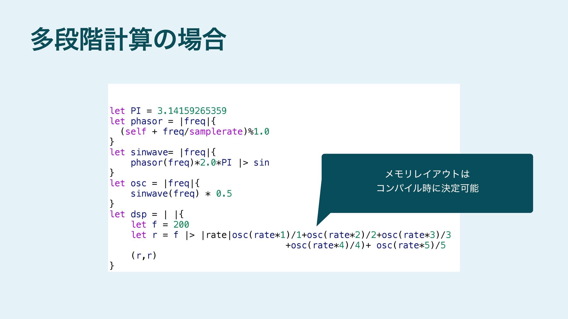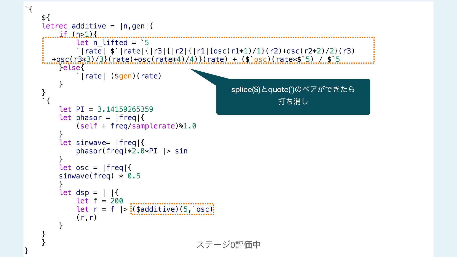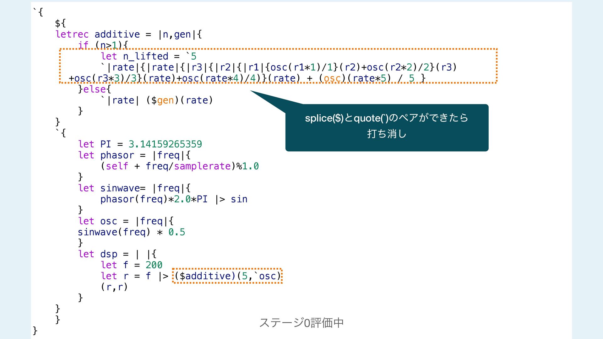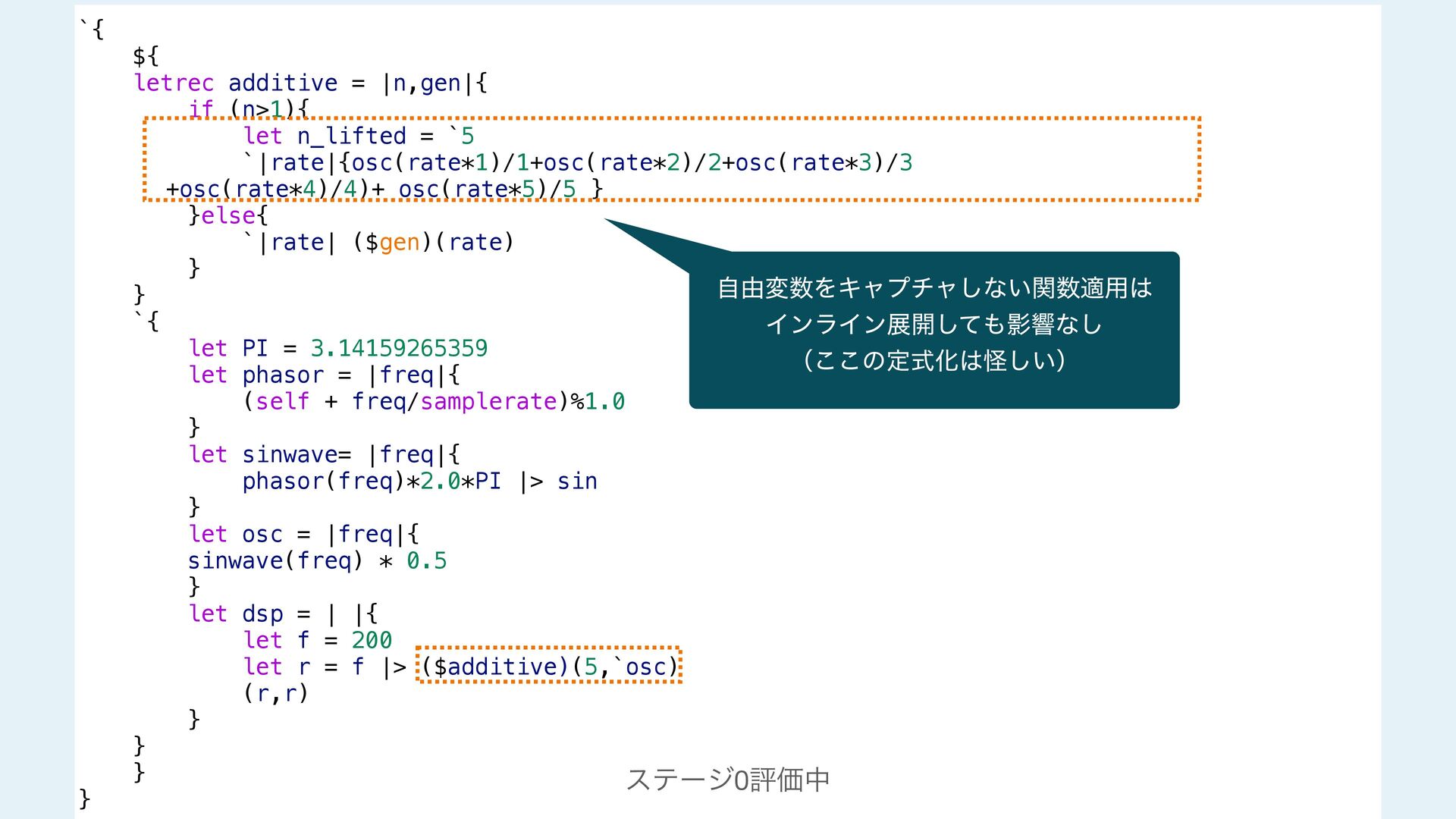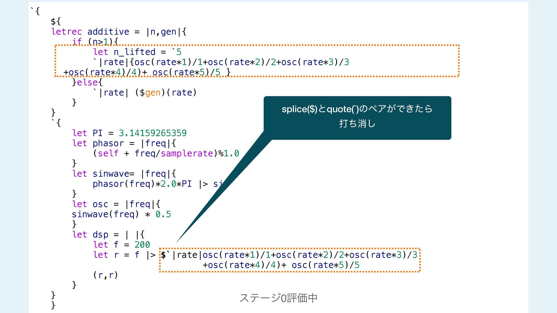 next = additive(n-1 ,gen) `|rate| ($next)(rate) + ($gen)(rate*$n_lifted) / $n_lifted }else{ `|rate| ($gen)(rate) } } #stage(main) let PI = 3.14159265359 fn phasor (freq){ (self + freq/samplerate)%1.0 } fn sinwave(freq){ phasor(freq)*2.0*PI |> sin } fn osc (freq){ sinwave(freq) * 0.5 } fn dsp(){ let f = 200 let r = f |> additive!(5,`osc) (r,r) } #stage(macro) fn additive(n,gen){ if (n>1){ let n_lifted = lift_f(n) let next = additive(n-1 ,gen) `|rate| ($next)(rate) + ($gen)(rate*$n_lifted) / $n_lifted }else{ `|rate| ($gen)(rate) } } #stage(main) let PI = 3.14159265359 fn phasor (freq){ (self + freq/samplerate)%1.0 } fn sinwave(freq){ phasor(freq)*2.0*PI |> sin } fn osc (freq){ sinwave(freq) * 0.5 } fn dsp(){ let f = 200 let r = f |> additive!(5,`osc) (r,r) }