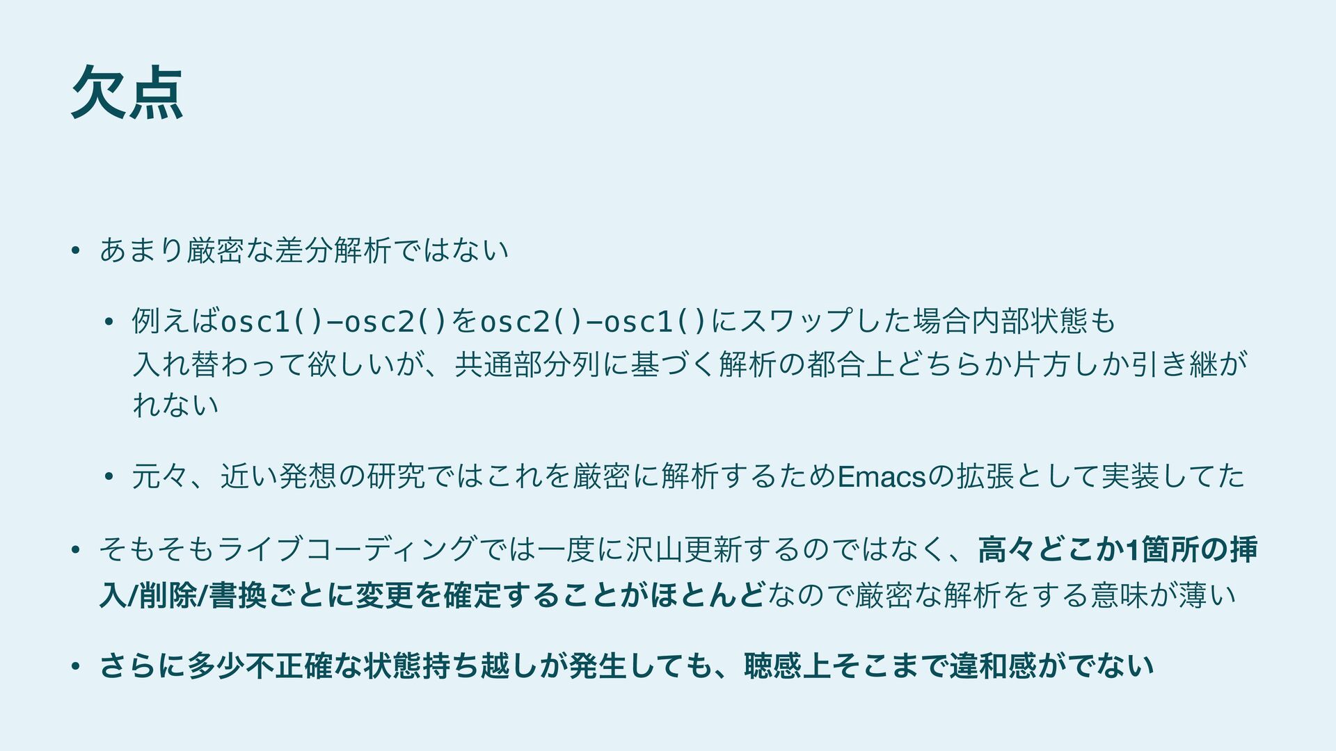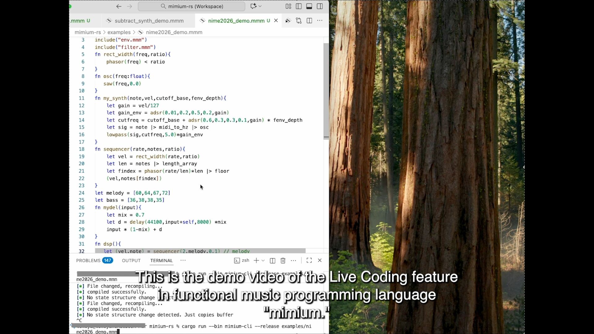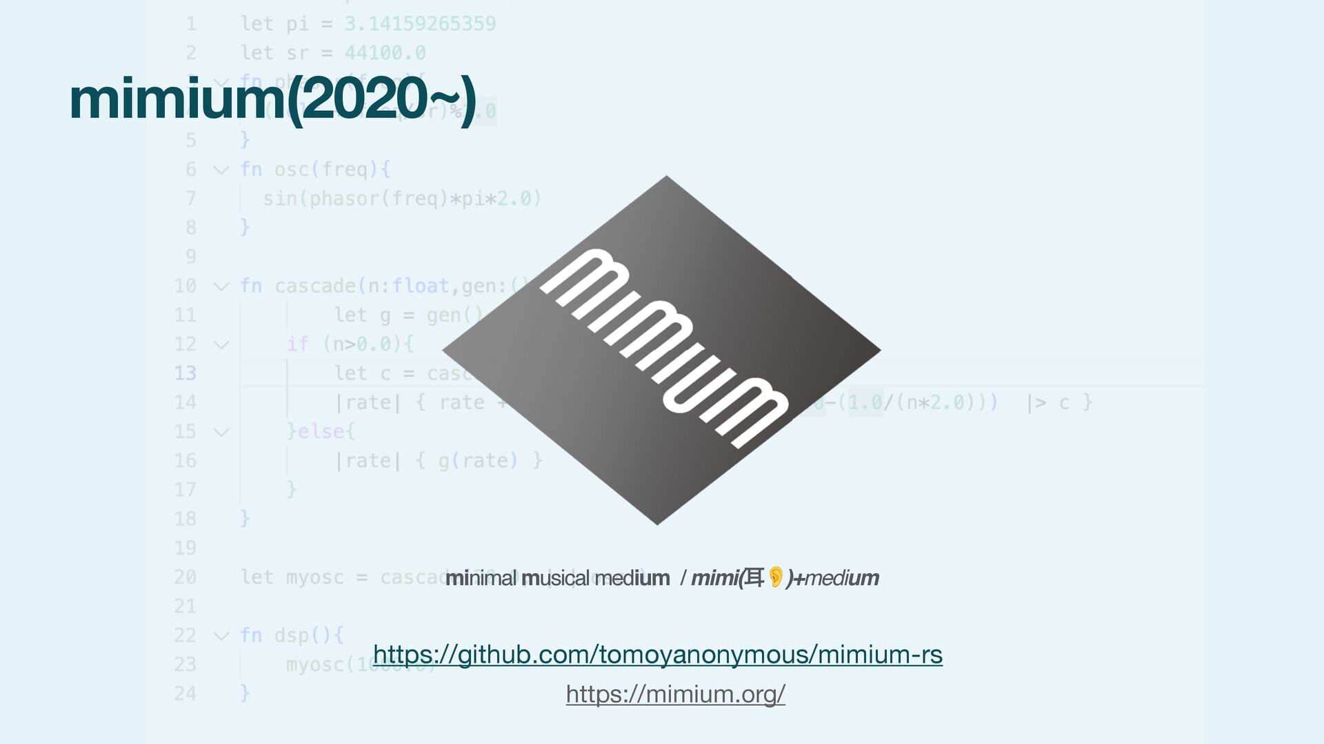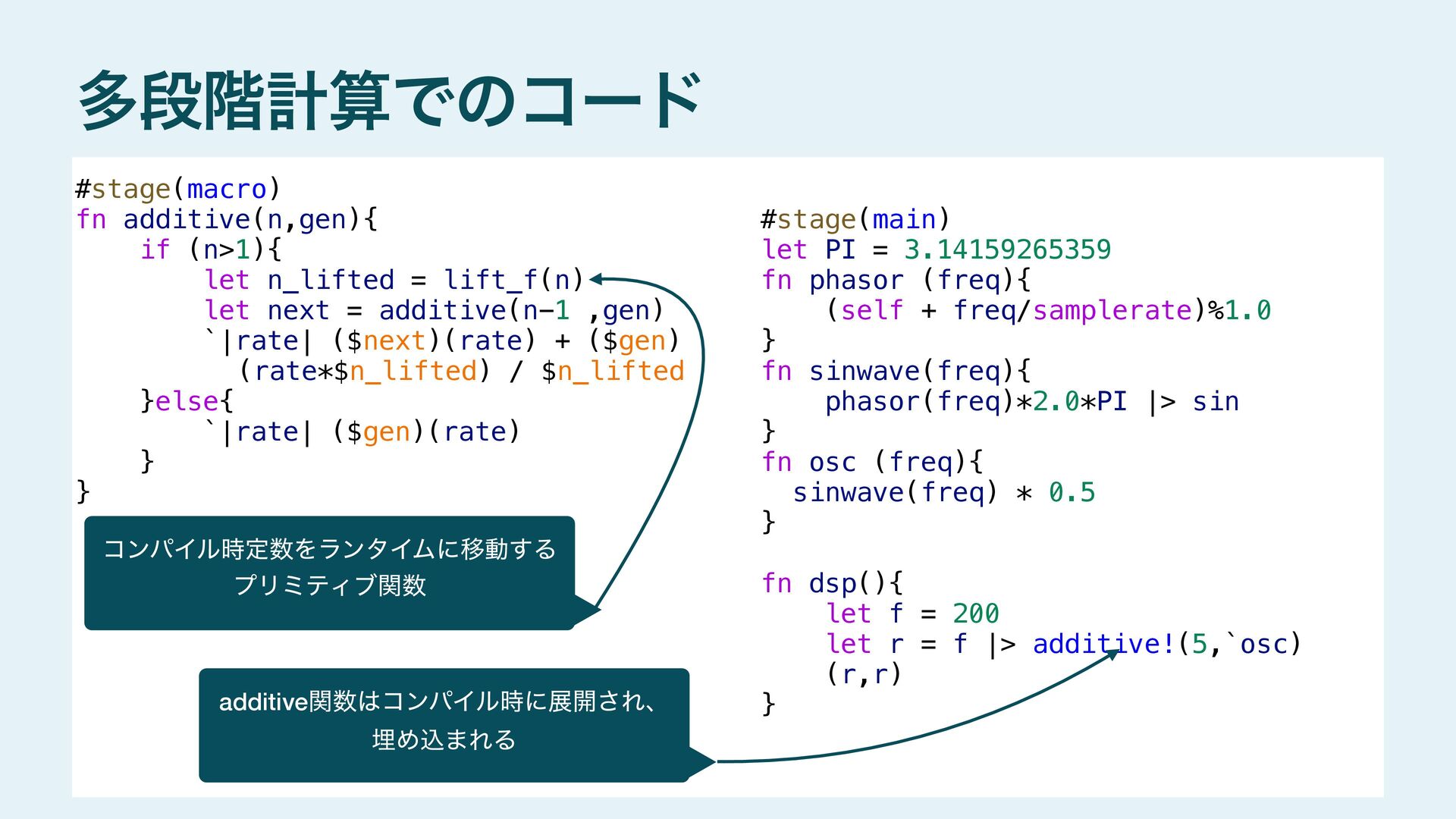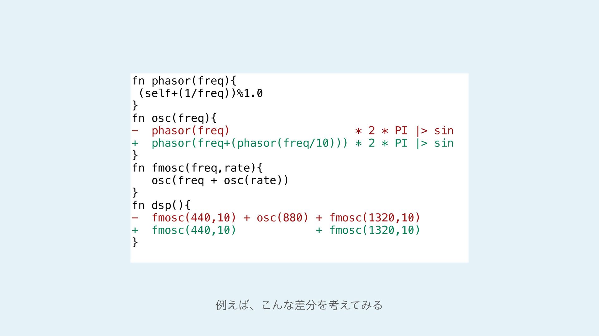 next = additive(n-1 ,gen) `|rate| ($next)(rate) + ($gen)(rate*$n_lifted) / $n_lifted }else{ `|rate| ($gen)(rate) } } #stage(main) let PI = 3.14159265359 fn phasor (freq){ (self + freq/samplerate)%1.0 } fn sinwave(freq){ phasor(freq)*2.0*PI |> sin } fn osc (freq){ sinwave(freq) * 0.5 } fn dsp(){ let f = 200 let r = f |> additive!(5,`osc) (r,r) } #stage(macro) fn additive(n,gen){ if (n>1){ let n_lifted = lift_f(n) let next = additive(n-1 ,gen) `|rate| ($next)(rate) + ($gen)(rate*$n_lifted) / $n_lifted }else{ `|rate| ($gen)(rate) } } #stage(main) let PI = 3.14159265359 fn phasor (freq){ (self + freq/samplerate)%1.0 } fn sinwave(freq){ phasor(freq)*2.0*PI |> sin } fn osc (freq){ sinwave(freq) * 0.5 } fn dsp(){ let f = 200 let r = f |> additive!(5,`osc) (r,r) }