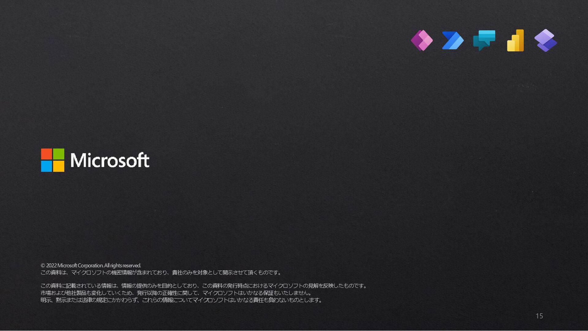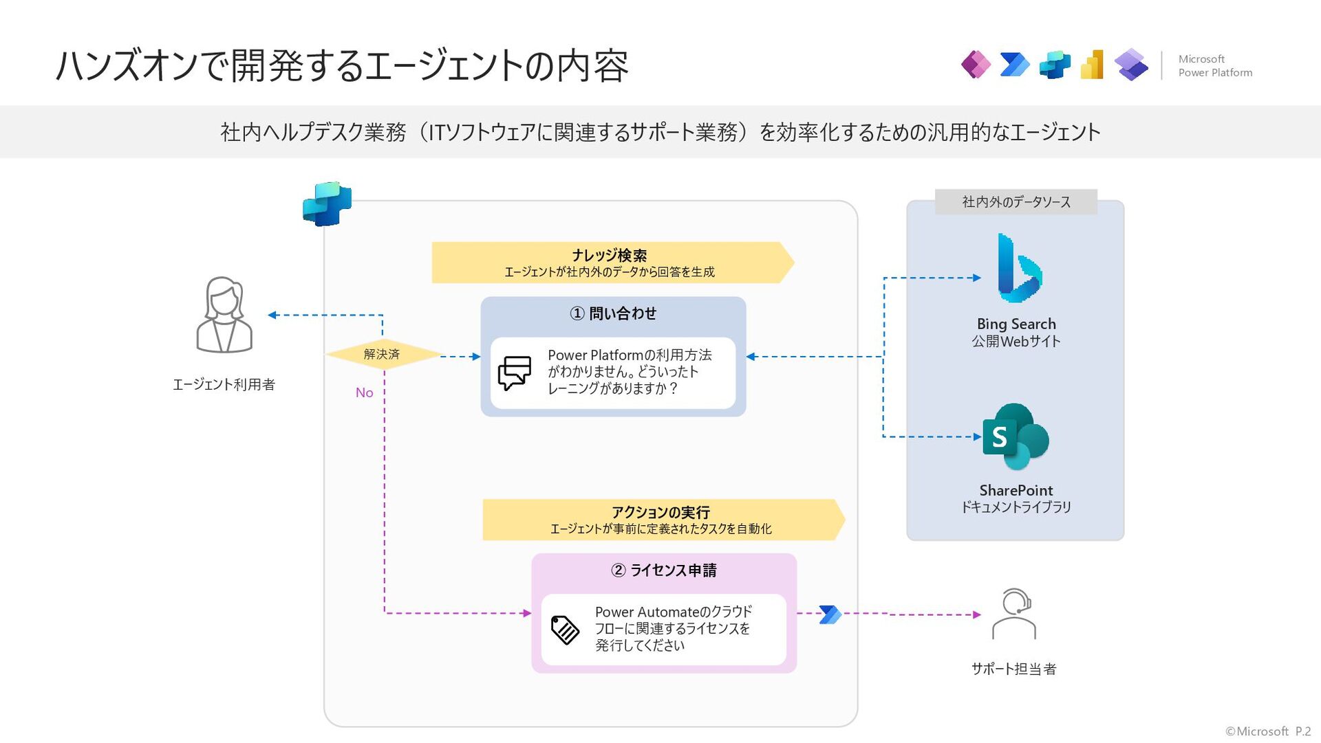 1. Microsoft Power Platform ハンズオンで開発するエージェントの内容 ©Microsoft P.2 エージェント利用者 ナレッジ検索 エージェントが社内外のデータから回答を生成 ①