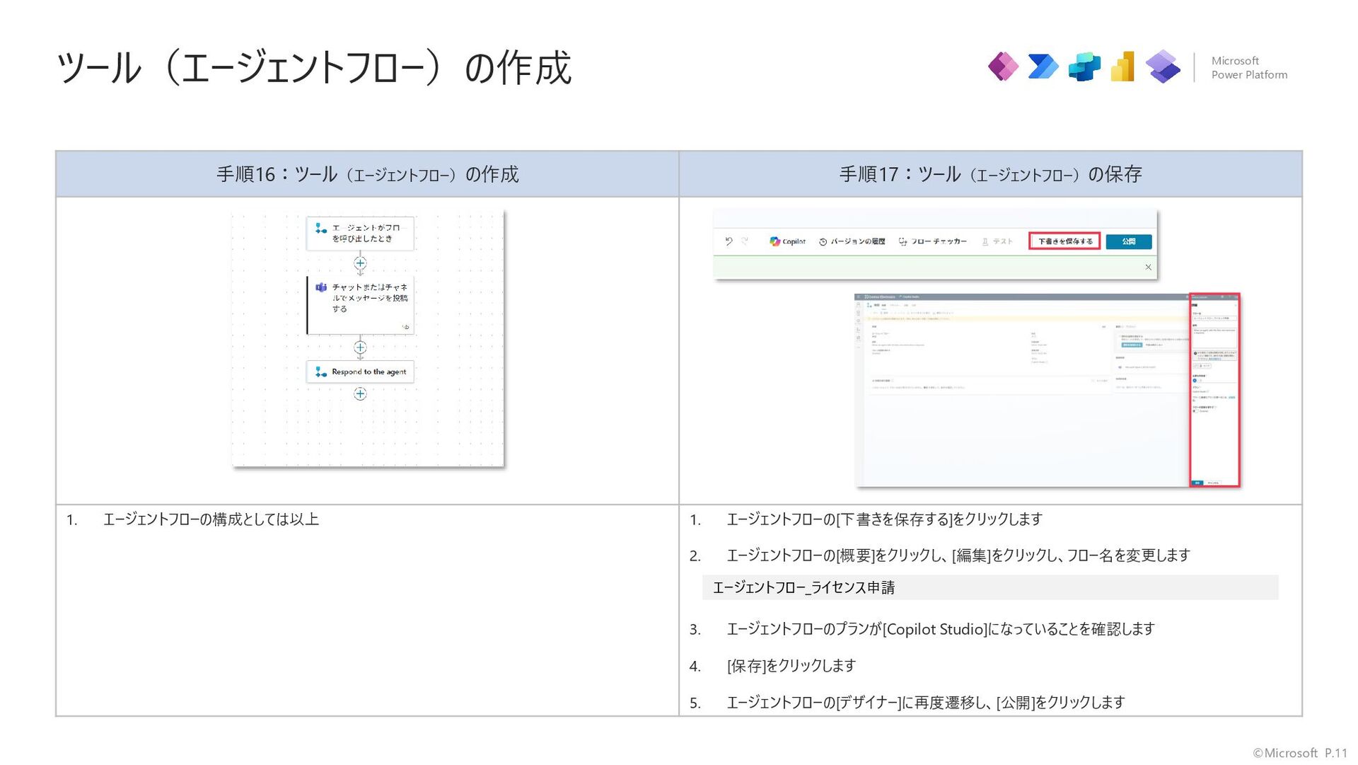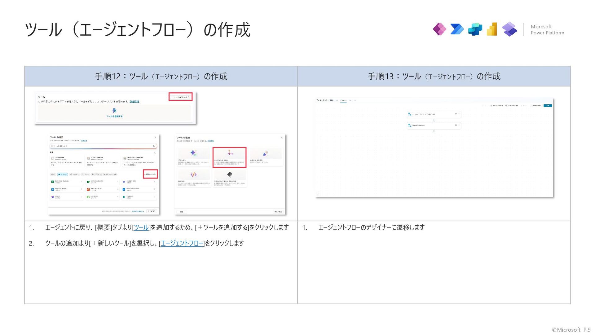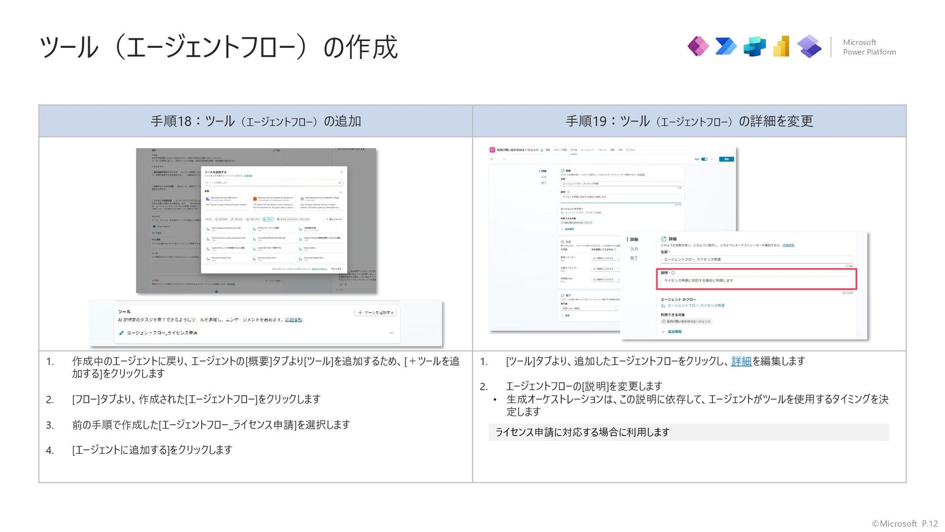 [フロー]タブより、作成された[エージェントフロー]をクリックします 3. 前の手順で作成した[エージェントフロー_ライセンス申請]を選択します 4. [エージェントに追加する]をクリックします 1. [ツール]タブより、追加したエージェントフローをクリックし、詳細を編集します 2. エージェントフローの[説明]を変更します • 生成オーケストレーションは、この説明に依存して、エージェントがツールを使用するタイミングを決 定します ©Microsoft P.12 ライセンス申請に対応する場合に利用します