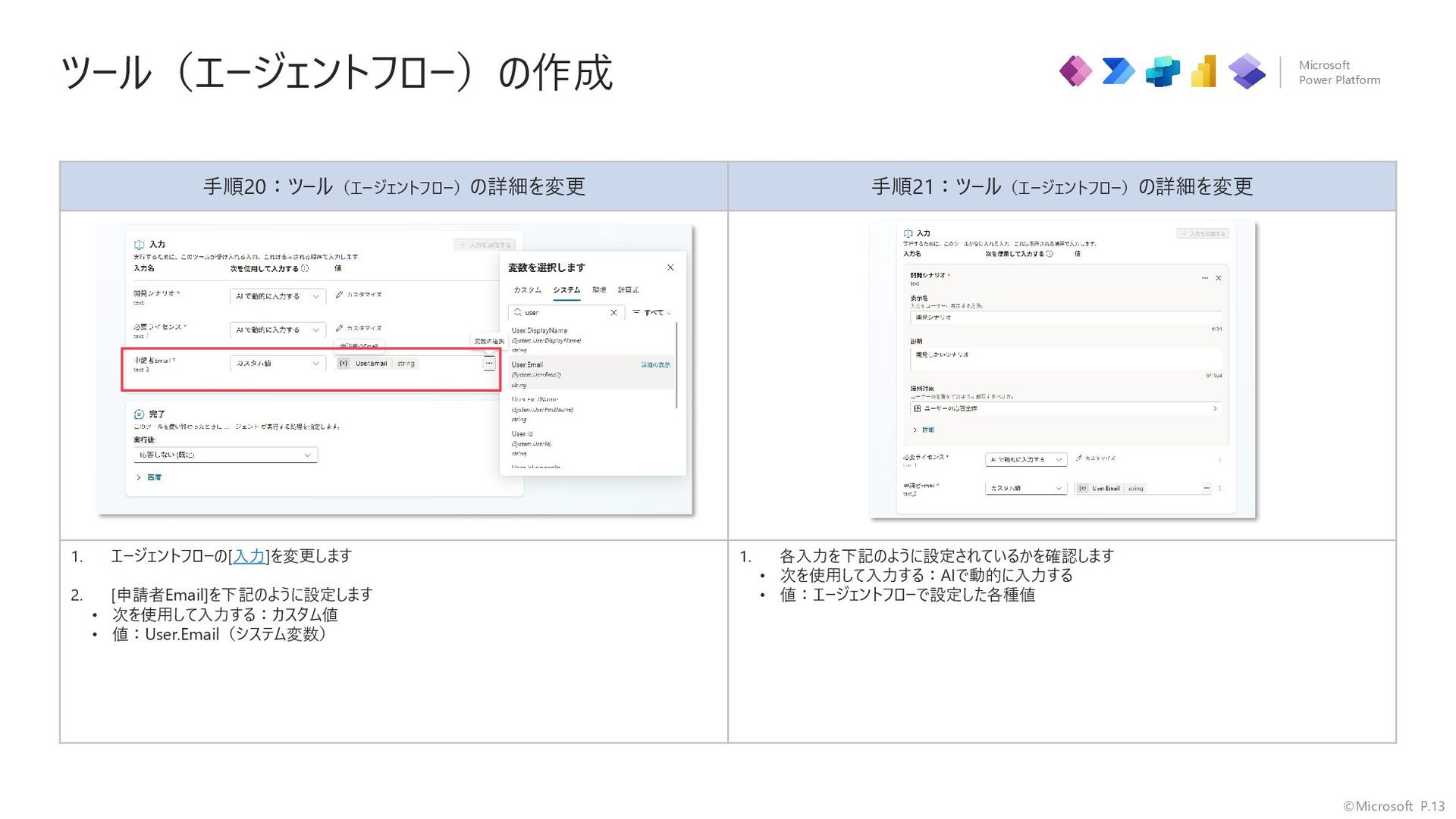 • 次を使用して入力する:カスタム値 • 値:User.Email(システム変数) 1. 各入力を下記のように設定されているかを確認します • 次を使用して入力する:AIで動的に入力する • 値:エージェントフローで設定した各種値 ©Microsoft P.13
