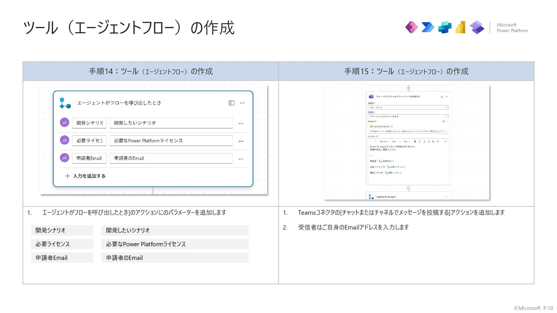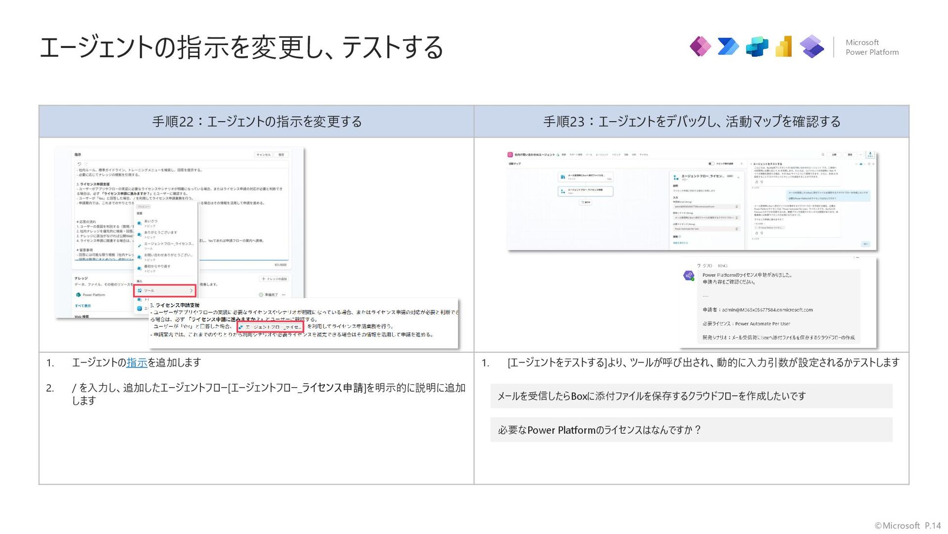 を入力し、追加したエージェントフロー[エージェントフロー_ライセンス申請]を明示的に説明に追加 します 1. [エージェントをテストする]より、ツールが呼び出され、動的に入力引数が設定されるかテストします ©Microsoft P.14 メールを受信したらBoxに添付ファイルを保存するクラウドフローを作成したいです 必要なPower Platformのライセンスはなんですか?
