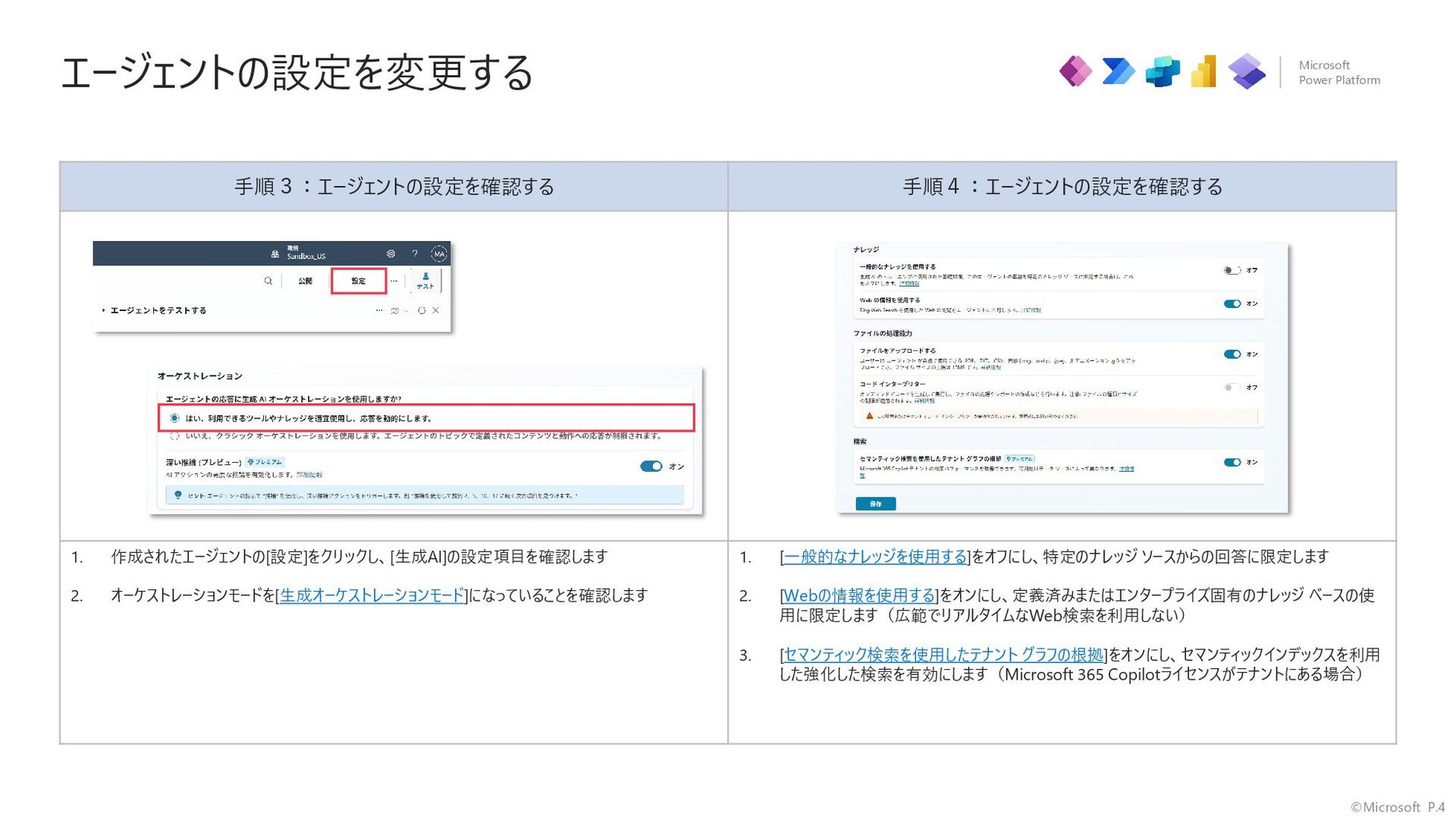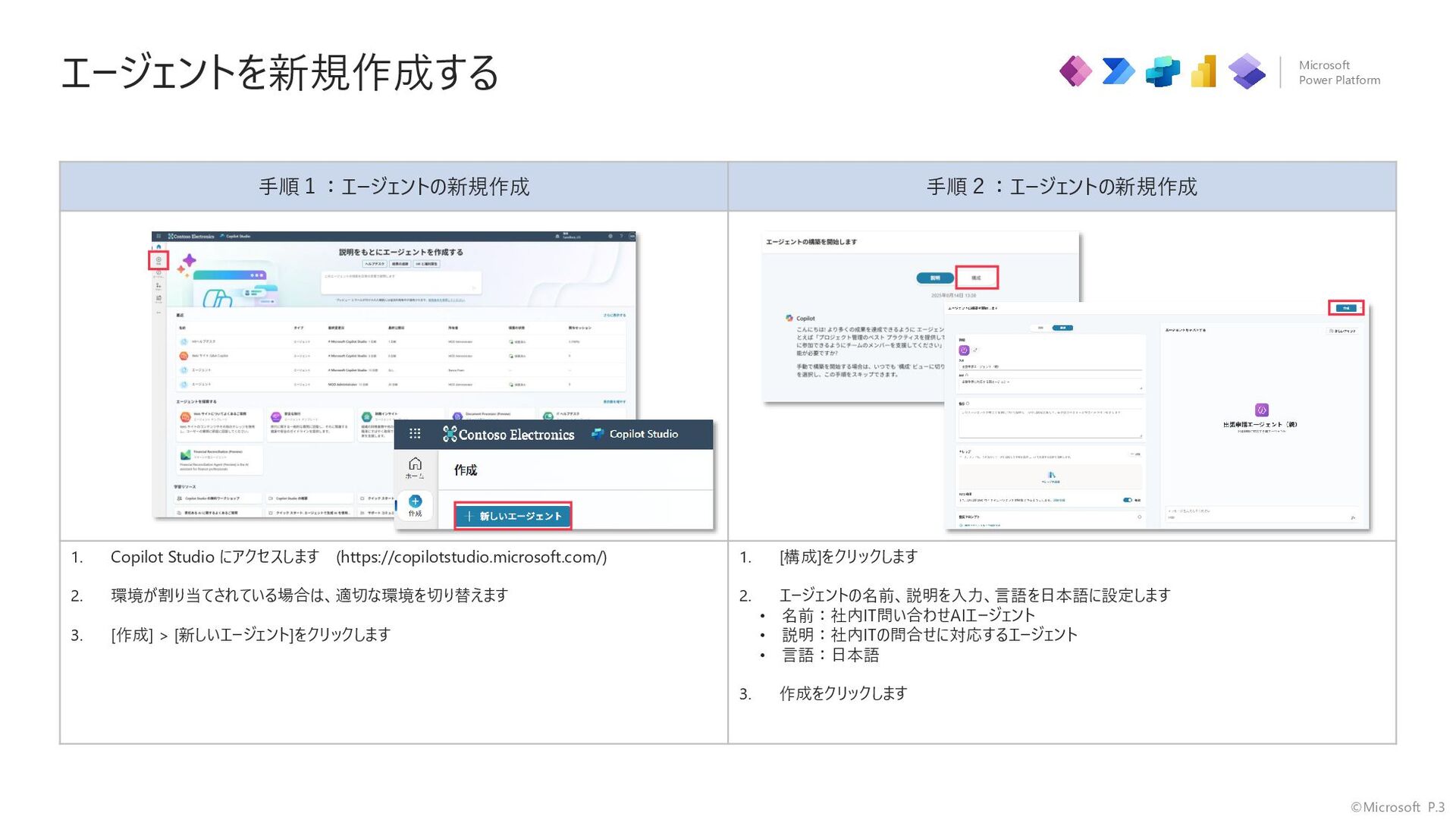 (https://copilotstudio.microsoft.com/) 2. 環境が割り当てされている場合は、適切な環境を切り替えます 3. [作成] > [新しいエージェント]をクリックします 1. [構成]をクリックします 2. エージェントの名前、説明を入力、言語を日本語に設定します • 名前:社内IT問い合わせAIエージェント • 説明:社内ITの問合せに対応するエージェント • 言語:日本語 3. 作成をクリックします ©Microsoft P.3
