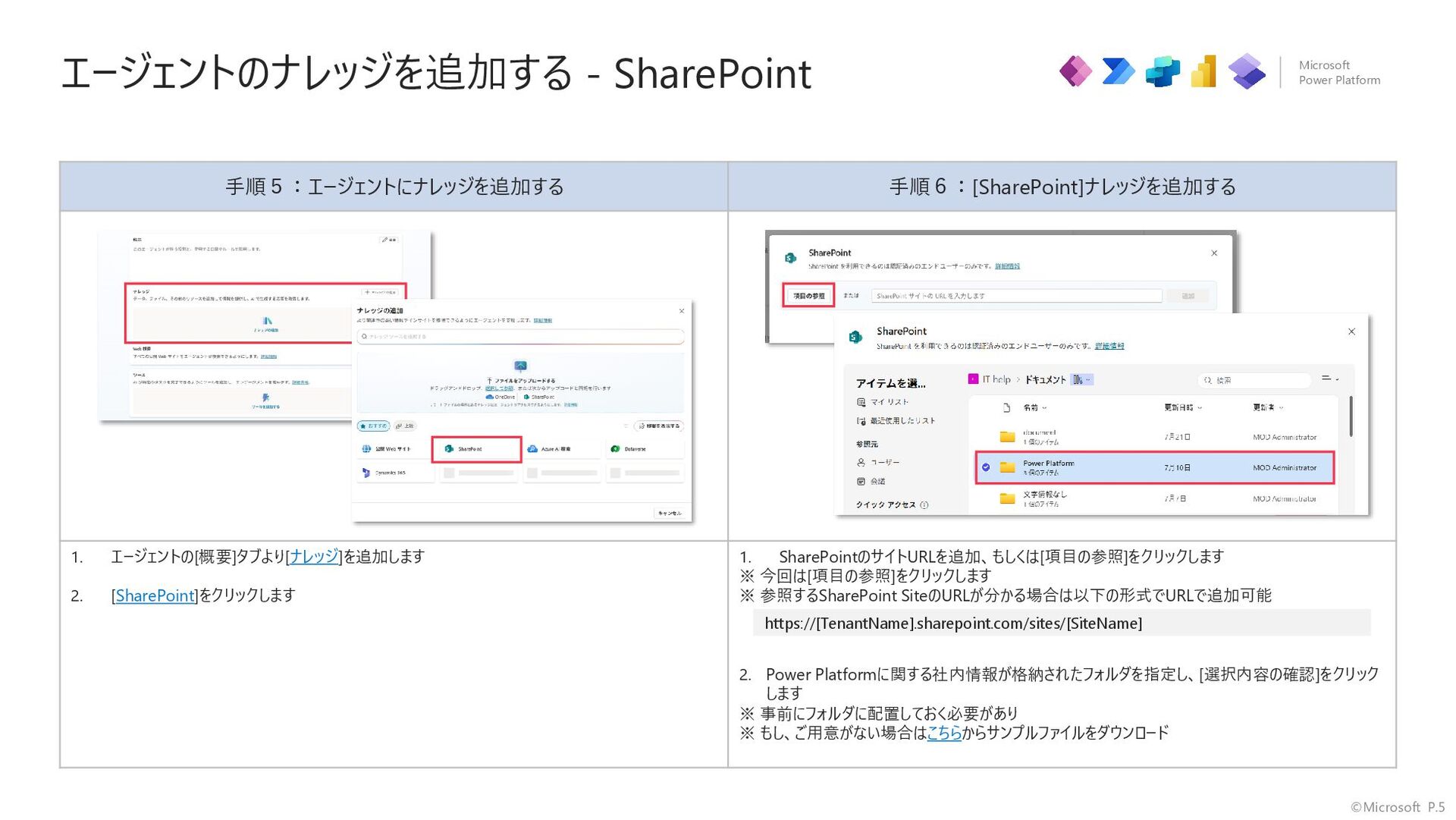 2. [SharePoint]をクリックします 1. SharePointのサイトURLを追加、もしくは[項目の参照]をクリックします ※ 今回は[項目の参照]をクリックします ※ 参照するSharePoint SiteのURLが分かる場合は以下の形式でURLで追加可能 2. Power Platformに関する社内情報が格納されたフォルダを指定し、[選択内容の確認]をクリック します ※ 事前にフォルダに配置しておく必要があり ※ もし、ご用意がない場合はこちらからサンプルファイルをダウンロード ©Microsoft P.5 https://[TenantName].sharepoint.com/sites/[SiteName]