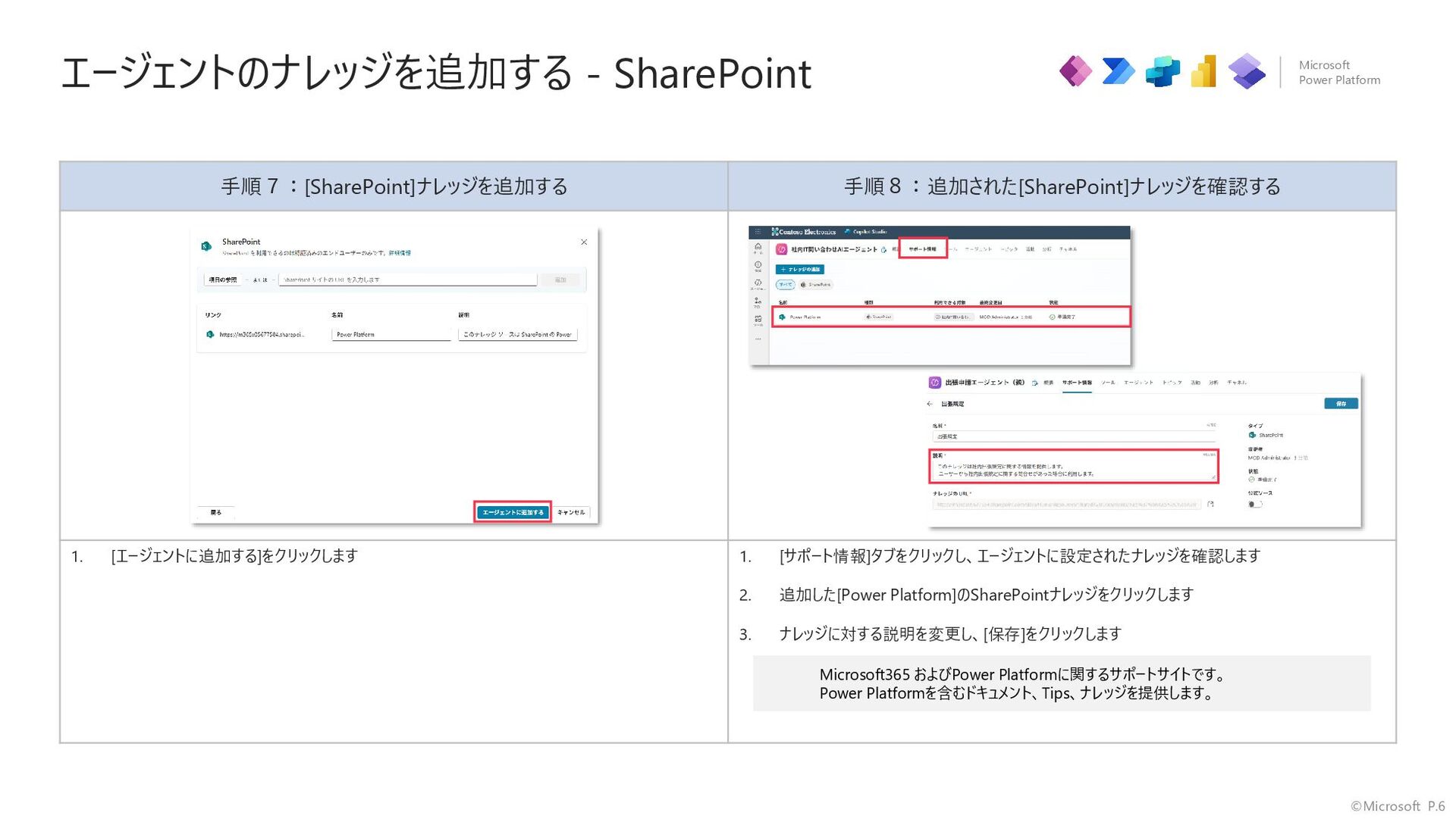 1. [サポート情報]タブをクリックし、エージェントに設定されたナレッジを確認します 2. 追加した[Power Platform]のSharePointナレッジをクリックします 3. ナレッジに対する説明を変更し、[保存]をクリックします ©Microsoft P.6 Microsoft365 およびPower Platformに関するサポートサイトです。 Power Platformを含むドキュメント、Tips、ナレッジを提供します。