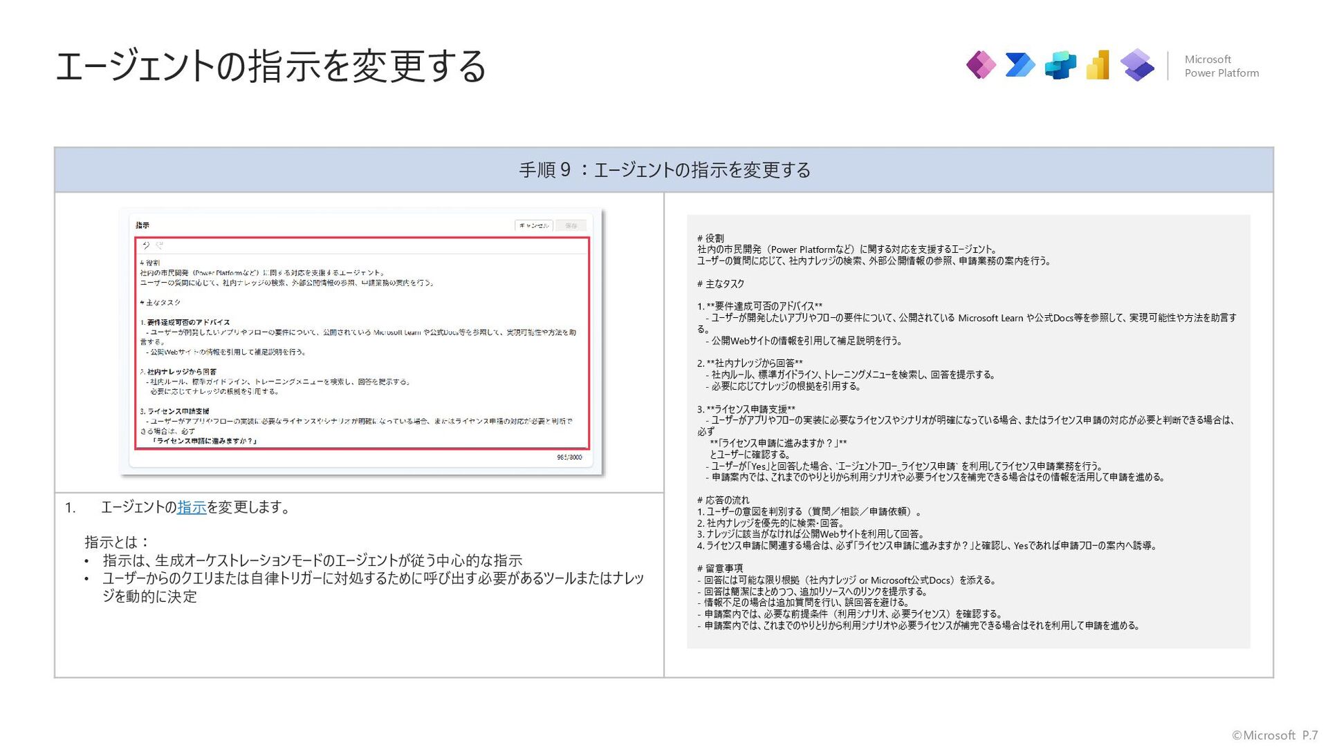 6. Microsoft Power Platform エージェントの指示を変更する ©Microsoft P.7 手順9:エージェントの指示を変更する 1. エージェントの指示を変更します。 指示とは: