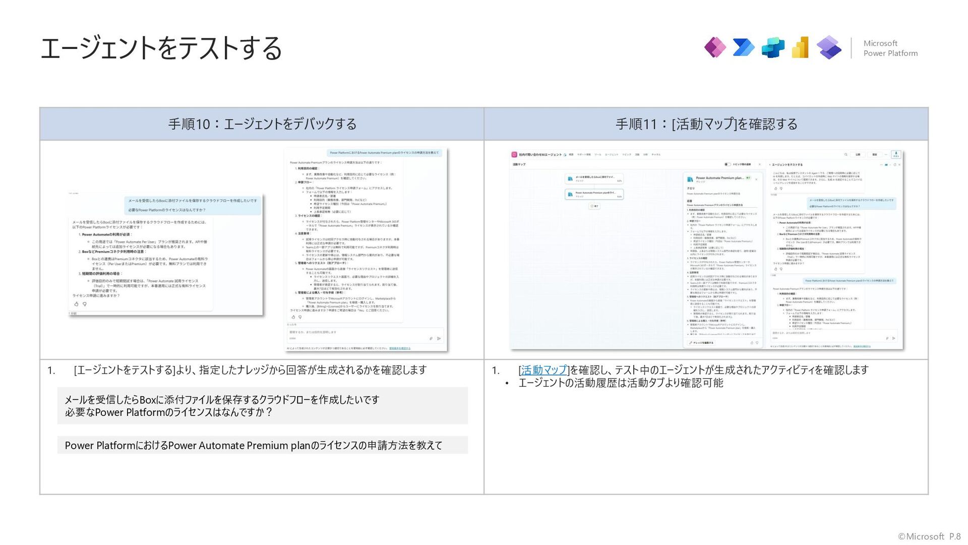 • エージェントの活動履歴は活動タブより確認可能 Power PlatformにおけるPower Automate Premium planのライセンスの申請方法を教えて ©Microsoft P.8 メールを受信したらBoxに添付ファイルを保存するクラウドフローを作成したいです 必要なPower Platformのライセンスはなんですか?