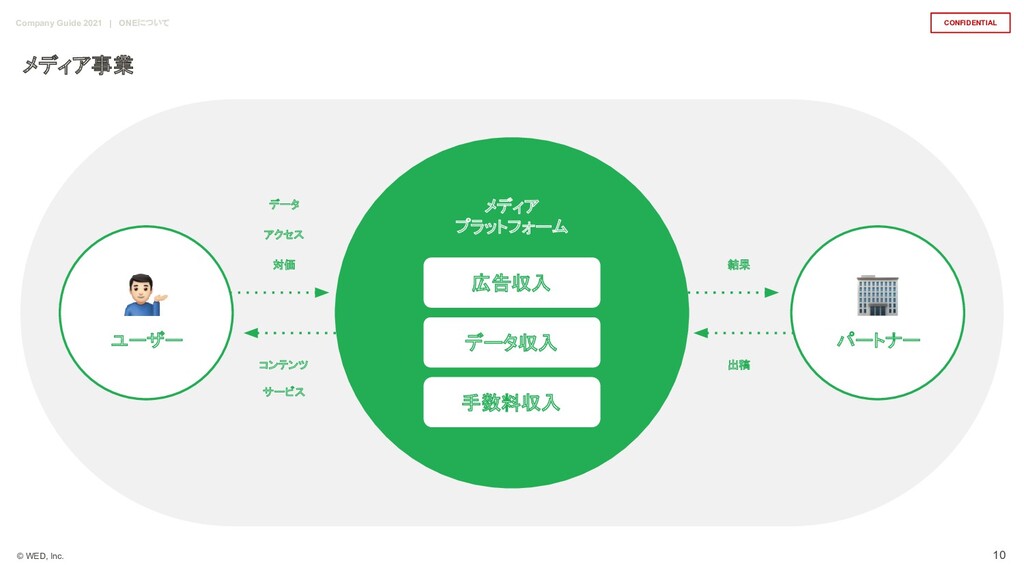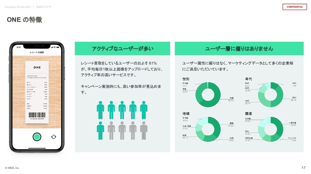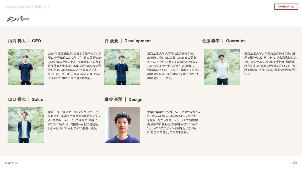 15歳以下の部で 最優秀賞を受賞。 2016年に現・WED株式会 社を創業。2018年にレシート買取アプリ 「ONE」をリリースし、同年 Forbes 30 Under 30 Asia 2018に二部門選出される。 山内 奏人 | CEO 東京工業大学大学院で MOTを修了後、 2015年エウレカに入社。 Couplesの開発 チームリーダーを経て、 Pairsのスクラムマ スターとしてサービスを牽引。 2018年に WEDにジョインし、レシート買取アプリ ONE の開発を担当。現在は Zeroを中心にWED の開発をリードする。 丹 俊貴 | Development 東京工業大学大学院で MOTを修了後、新 卒で現PwCコンサルティング合同会社に入 社し、コンサルタントとして会計・ IT・物流業 務を支援。2018年にWEDにジョインし、会 計や財務を担当しつつ、営業や開発なども 行う。 佐原 恭平 | Operation 東証一部上場のマーケティング・リサーチ 会社にて、最年少で営業部長に就任しプレ イングマネージャーとして活躍。 2018年に WEDにジョインし、現在 SalesとCSを統括 しながら、BizDevとしてWEDを引っ張る。 山口 喬志 | Sales 亀谷 長翔 | Design 大学在学中にインターンとしてエウレカに入 社。Pairs及びCouplesのメインデザイナー を担当しながらマネージャーとして組織開 発や教育に携わる。 2020年WEDにジョイ ンし、WEDのデザイン全般を担いながら、 ONEの事業部として事業を牽引。 29 Company Guide 2021 | 組織について メンバー
