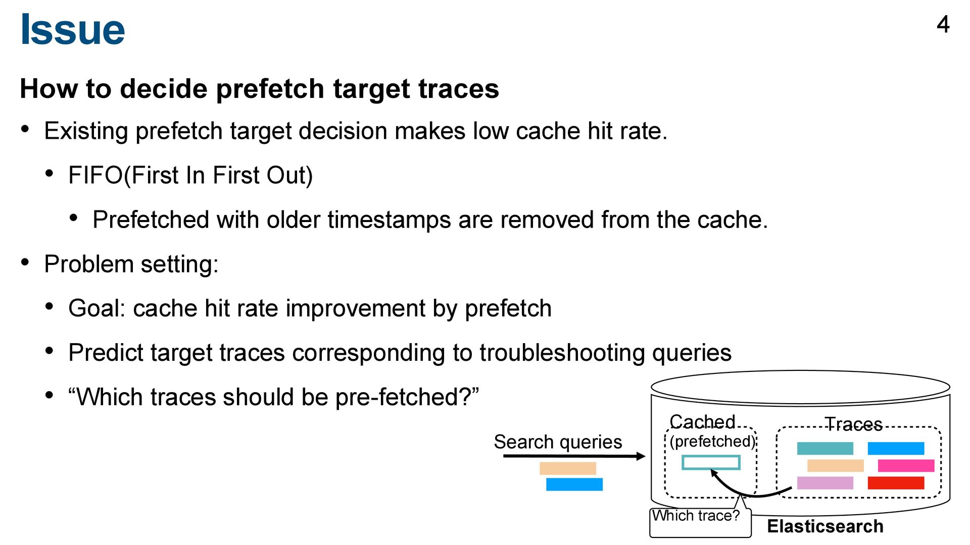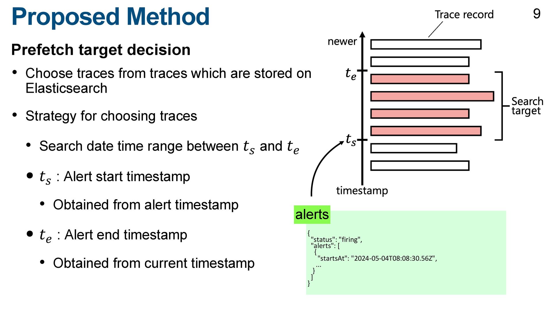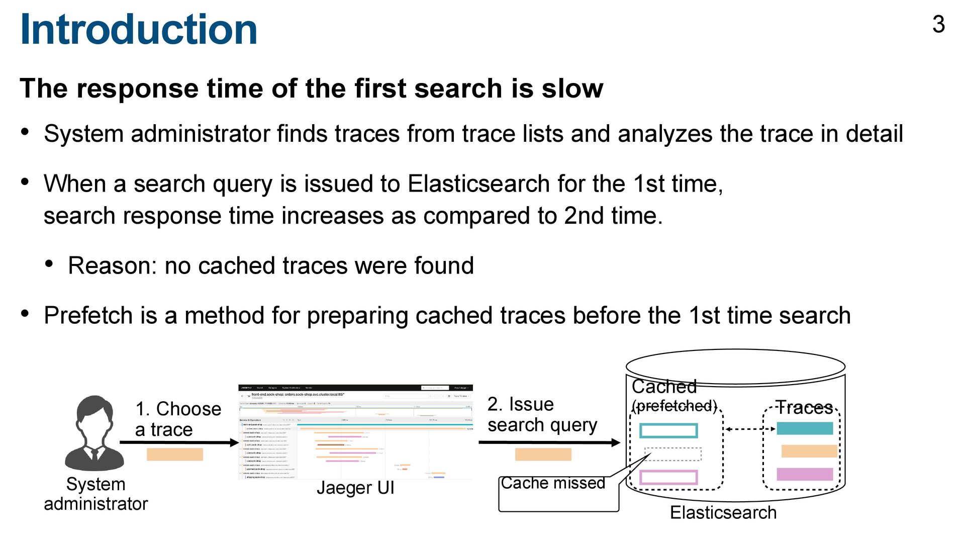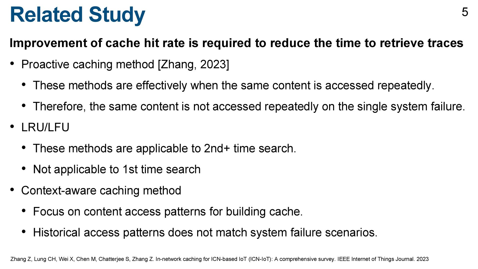 reduce the time to retrieve traces • Proactive caching method [Zhang, 2023] • These methods are effectively when the same content is accessed repeatedly. • Therefore, the same content is not accessed repeatedly on the single system failure. • LRU/LFU • These methods are applicable to 2nd+ time search. • Not applicable to 1st time search • Context-aware caching method • Focus on content access patterns for building cache. • Historical access patterns does not match system failure scenarios. Zhang Z, Lung CH, Wei X, Chen M, Chatterjee S, Zhang Z. In-network caching for ICN-based IoT (ICN-IoT): A comprehensive survey. IEEE Internet of Things Journal. 2023 5