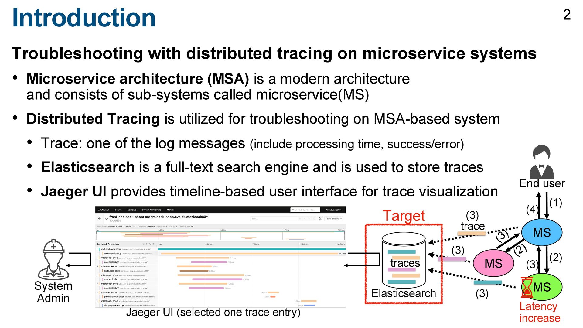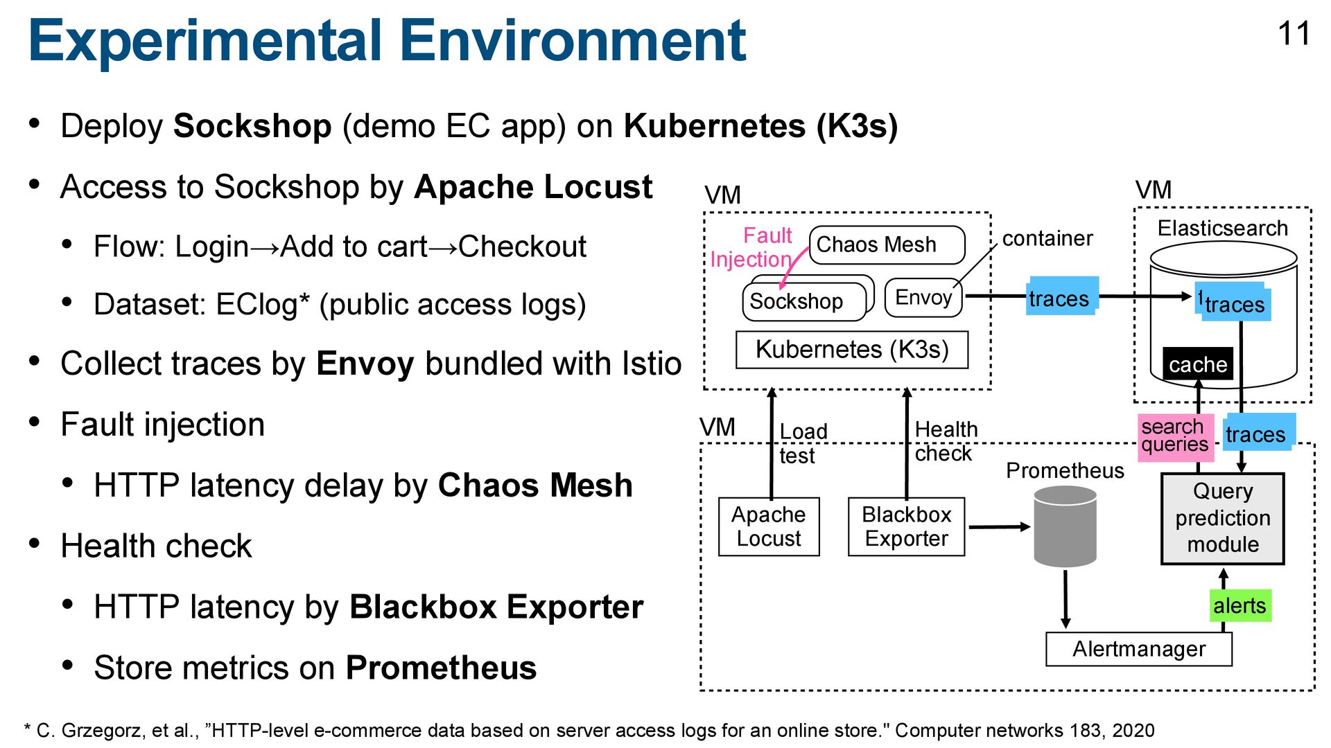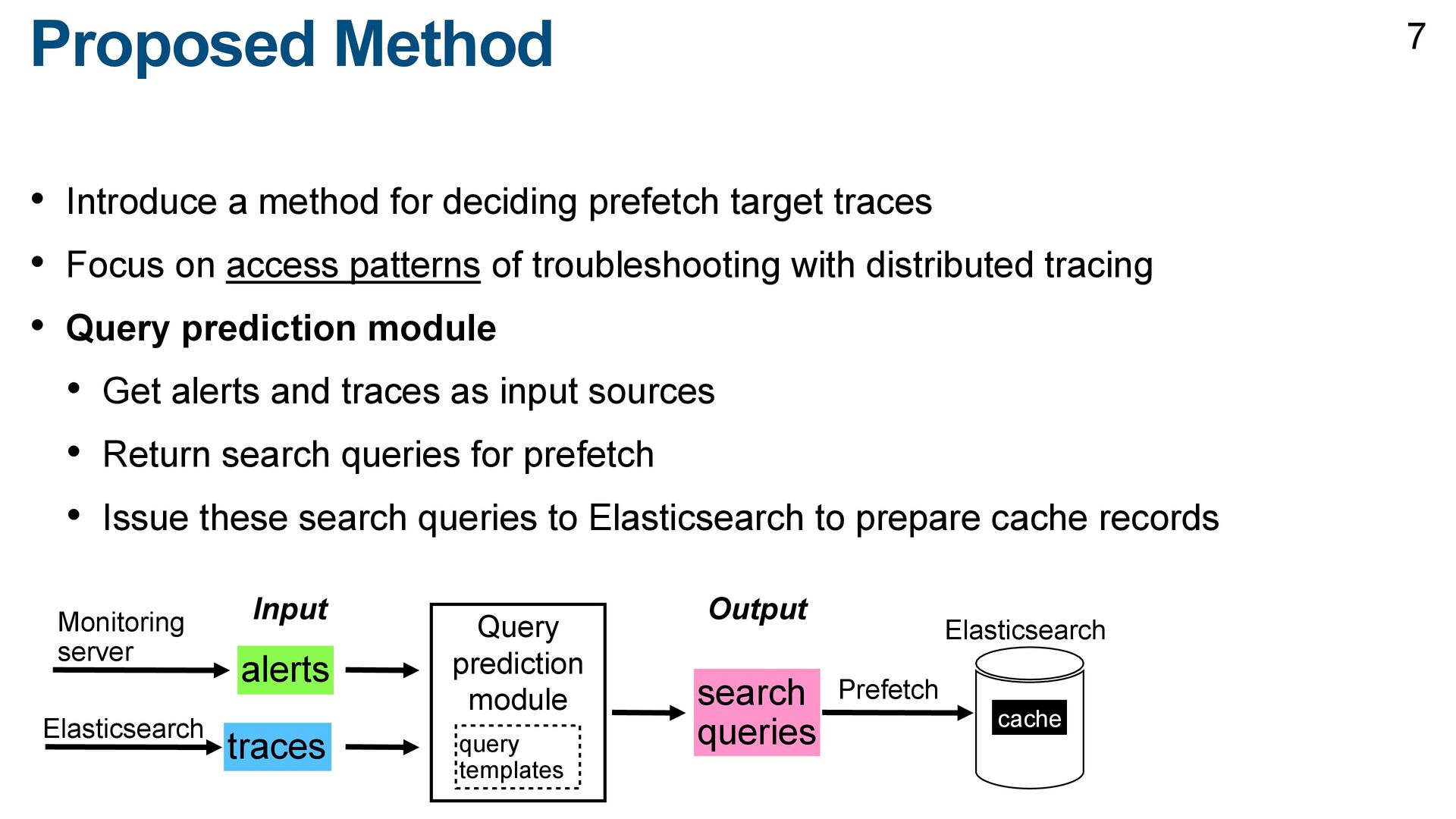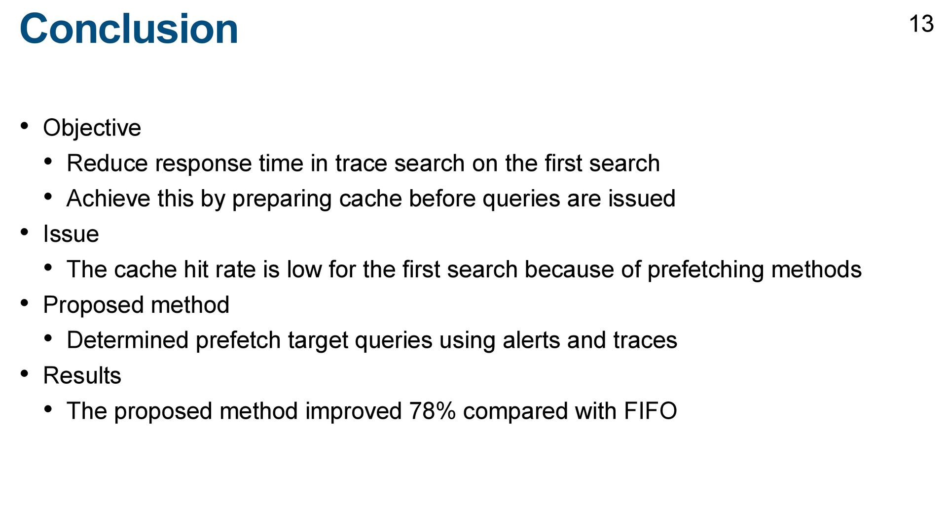 reduce the time to retrieve traces • Proactive caching method [Zhang, 2023] • These methods are effectively when the same content is accessed repeatedly. • Therefore, the same content is not accessed repeatedly on the single system failure. • LRU/LFU • These methods are applicable to 2nd+ time search. • Not applicable to 1st time search • Context-aware caching method • Focus on content access patterns for building cache. • Historical access patterns does not match system failure scenarios. Zhang Z, Lung CH, Wei X, Chen M, Chatterjee S, Zhang Z. In-network caching for ICN-based IoT (ICN-IoT): A comprehensive survey. IEEE Internet of Things Journal. 2023 5