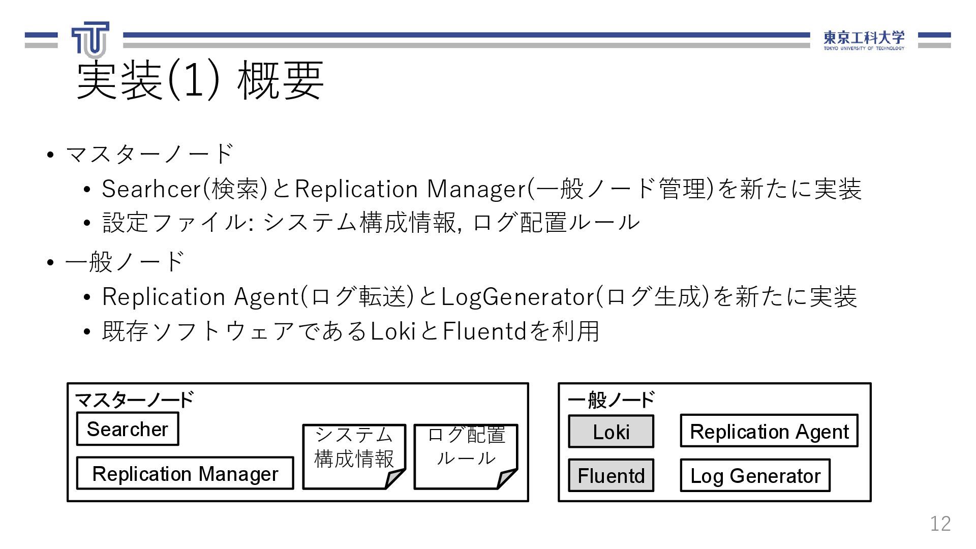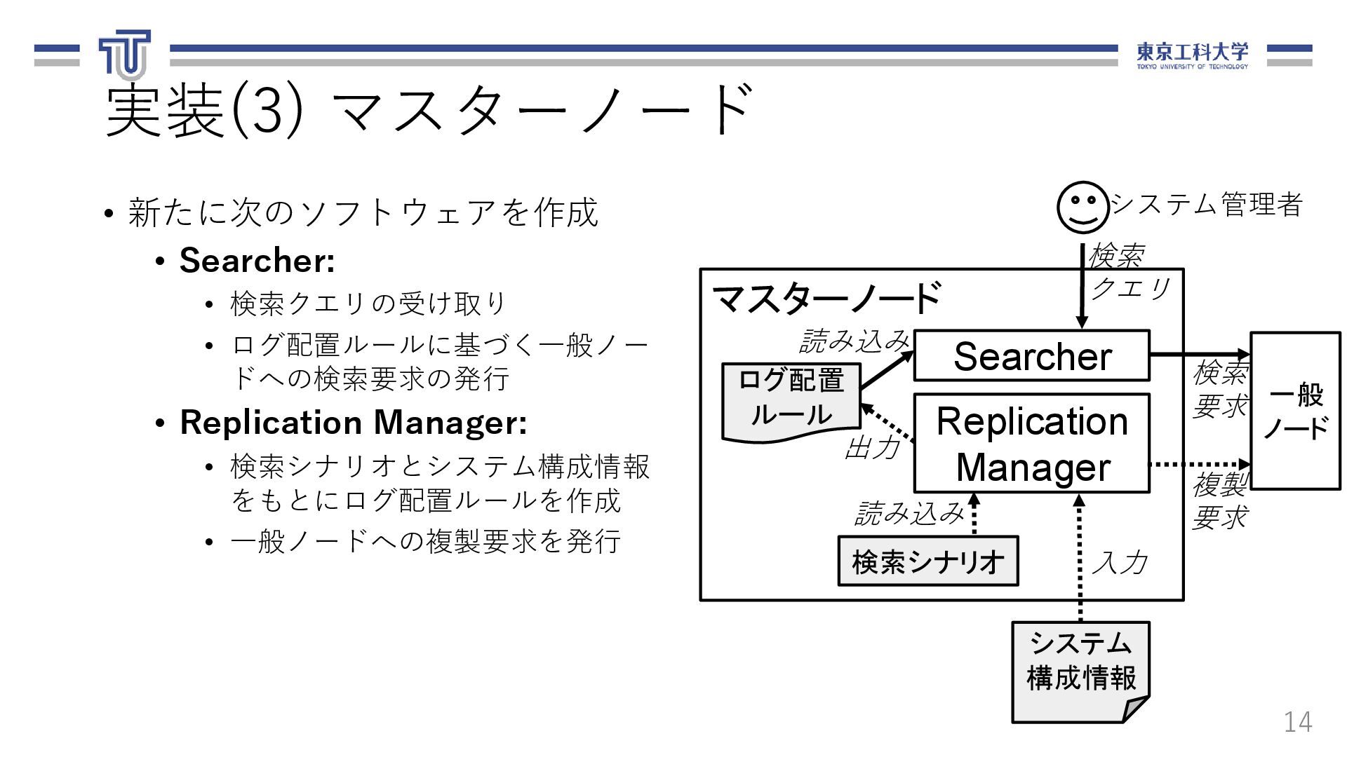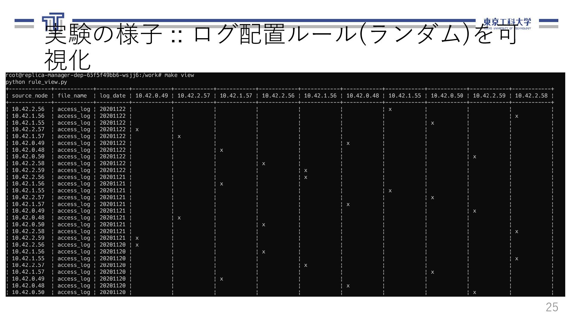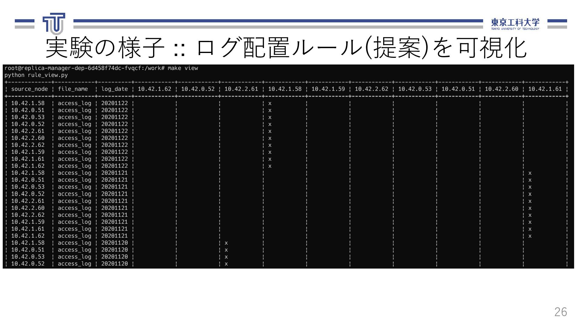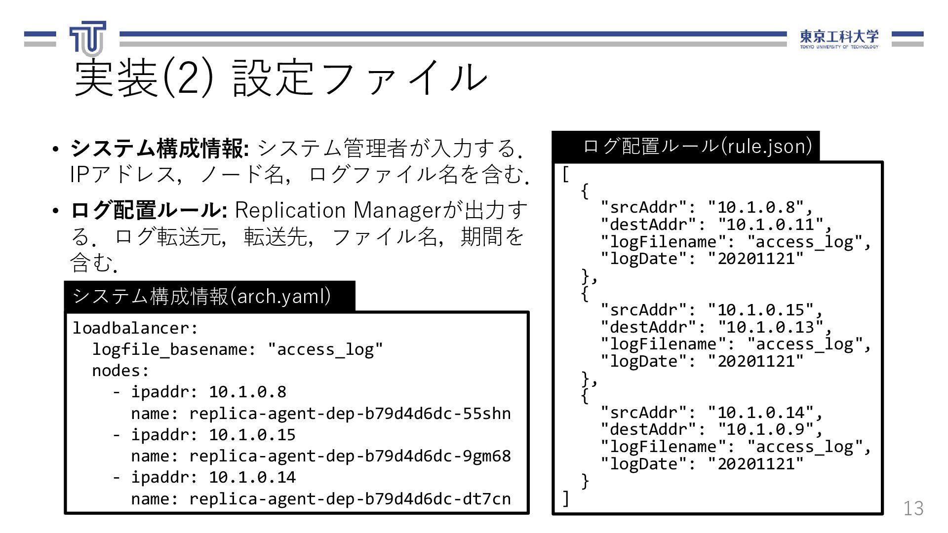 る.ログ転送元,転送先,ファイル名,期間を 含む. 13 loadbalancer: logfile_basename: "access_log" nodes: - ipaddr: 10.1.0.8 name: replica-agent-dep-b79d4d6dc-55shn - ipaddr: 10.1.0.15 name: replica-agent-dep-b79d4d6dc-9gm68 - ipaddr: 10.1.0.14 name: replica-agent-dep-b79d4d6dc-dt7cn システム構成情報(arch.yaml) [ { "srcAddr": "10.1.0.8", "destAddr": "10.1.0.11", "logFilename": "access_log", "logDate": "20201121" }, { "srcAddr": "10.1.0.15", "destAddr": "10.1.0.13", "logFilename": "access_log", "logDate": "20201121" }, { "srcAddr": "10.1.0.14", "destAddr": "10.1.0.9", "logFilename": "access_log", "logDate": "20201121" } ] ログ配置ルール(rule.json)