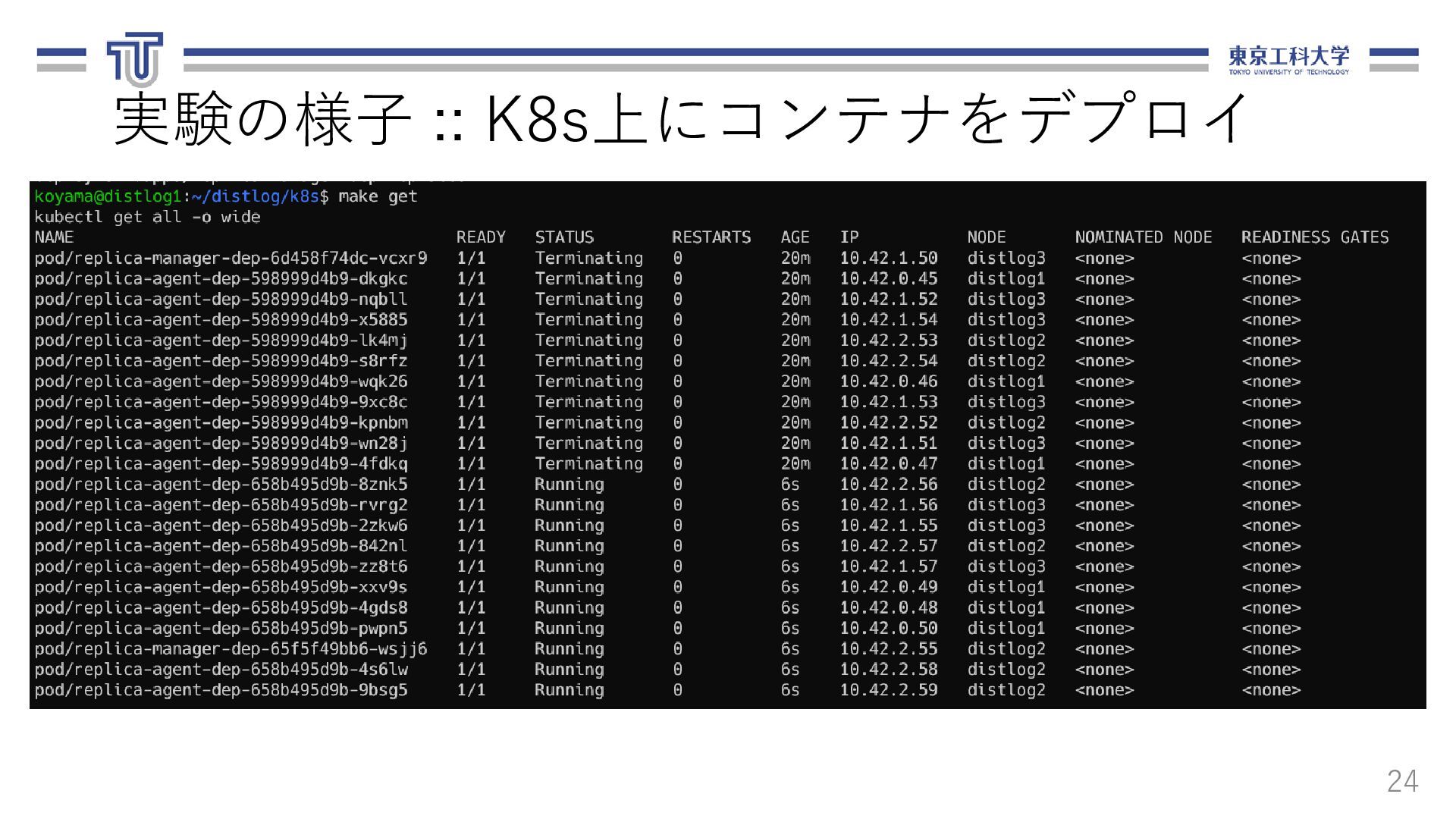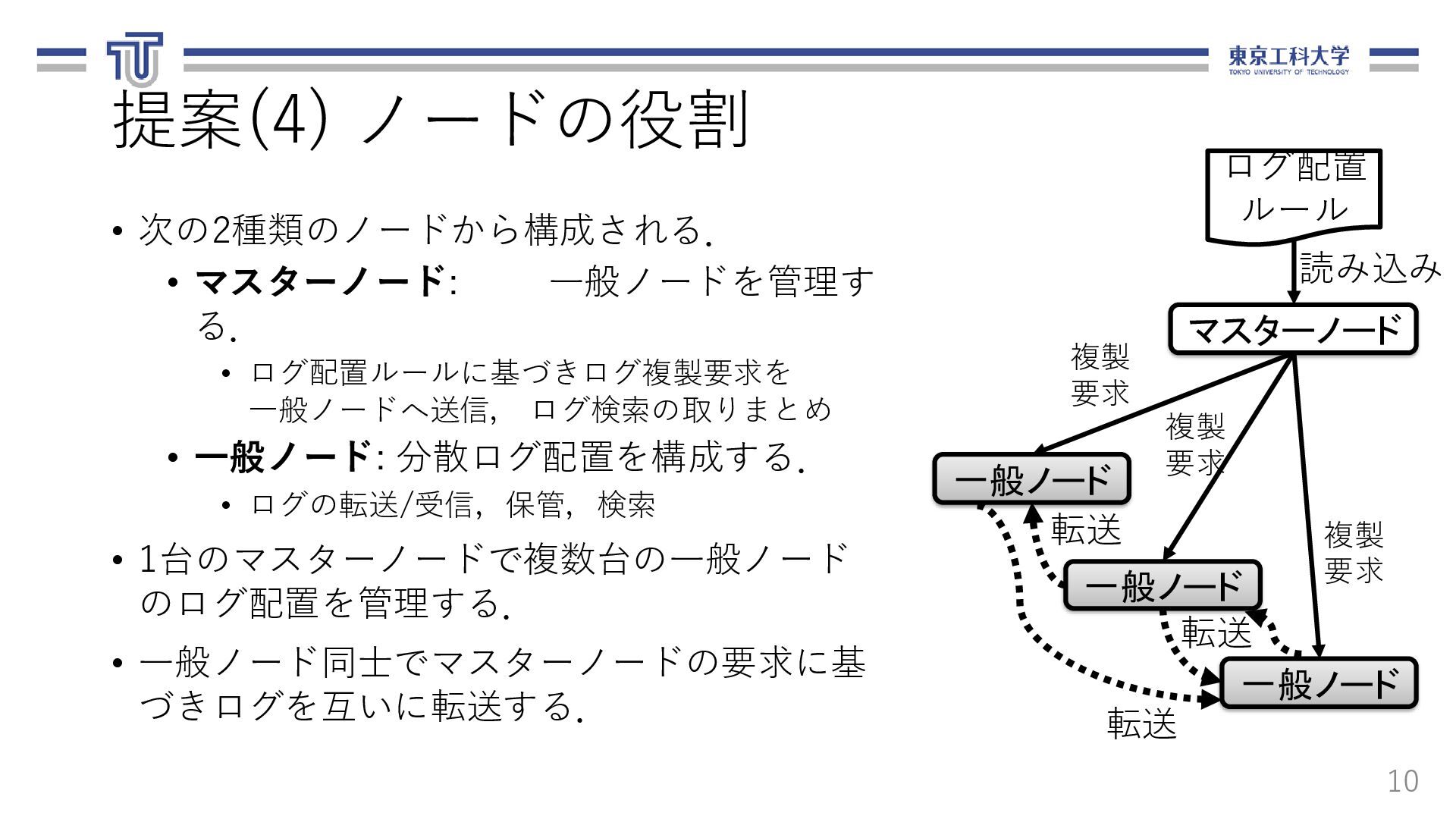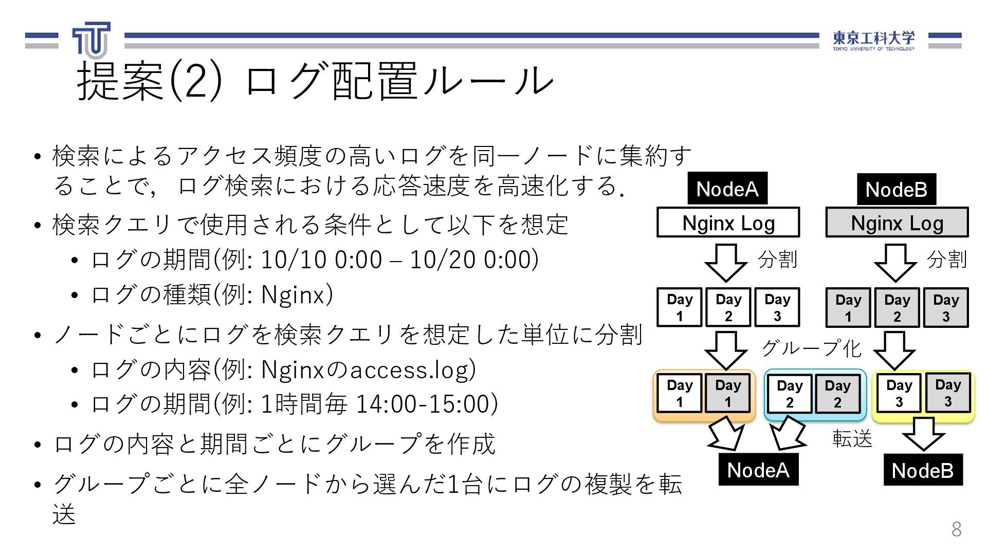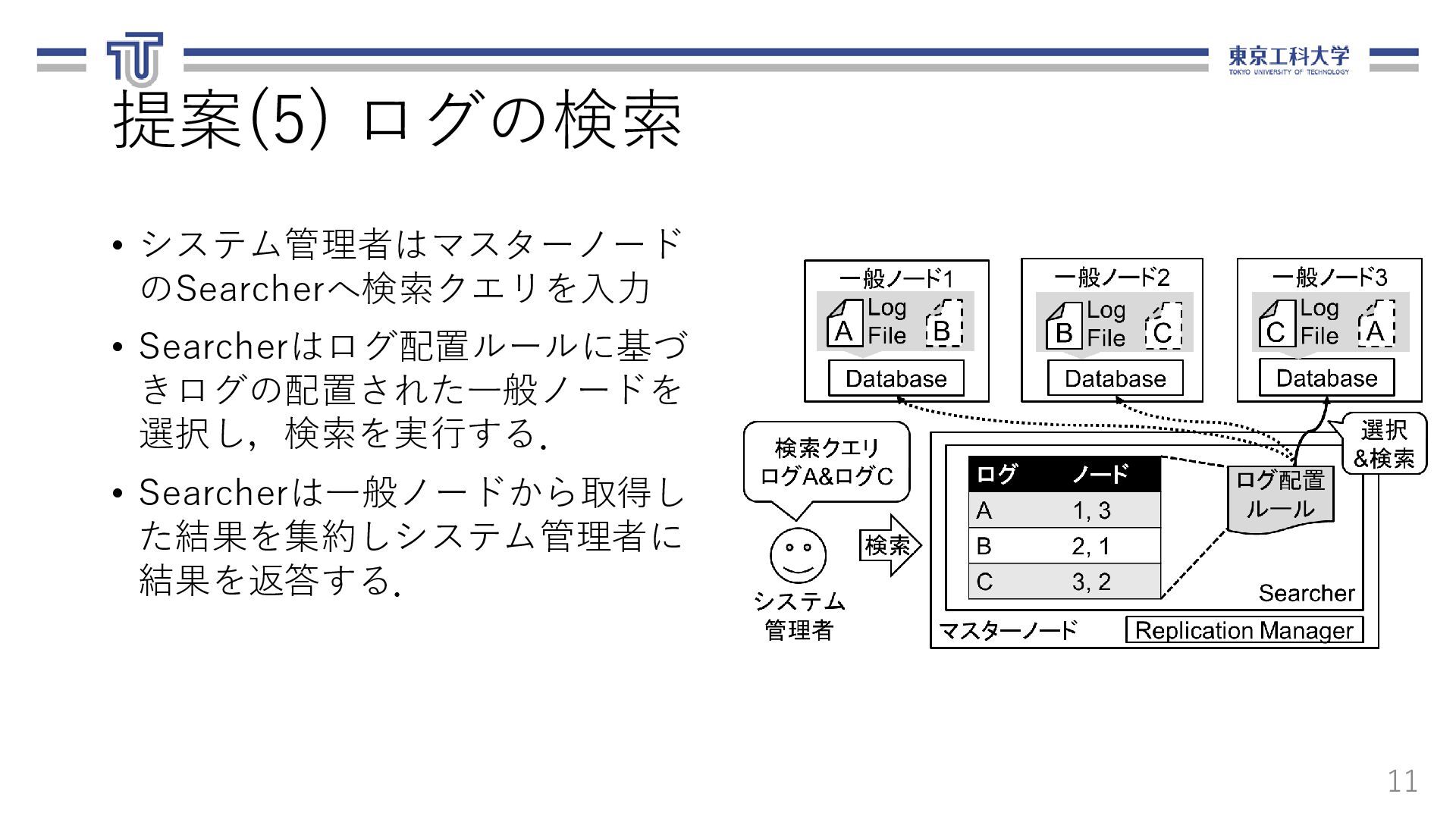 る.ログ転送元,転送先,ファイル名,期間を 含む. 13 loadbalancer: logfile_basename: "access_log" nodes: - ipaddr: 10.1.0.8 name: replica-agent-dep-b79d4d6dc-55shn - ipaddr: 10.1.0.15 name: replica-agent-dep-b79d4d6dc-9gm68 - ipaddr: 10.1.0.14 name: replica-agent-dep-b79d4d6dc-dt7cn システム構成情報(arch.yaml) [ { "srcAddr": "10.1.0.8", "destAddr": "10.1.0.11", "logFilename": "access_log", "logDate": "20201121" }, { "srcAddr": "10.1.0.15", "destAddr": "10.1.0.13", "logFilename": "access_log", "logDate": "20201121" }, { "srcAddr": "10.1.0.14", "destAddr": "10.1.0.9", "logFilename": "access_log", "logDate": "20201121" } ] ログ配置ルール(rule.json)