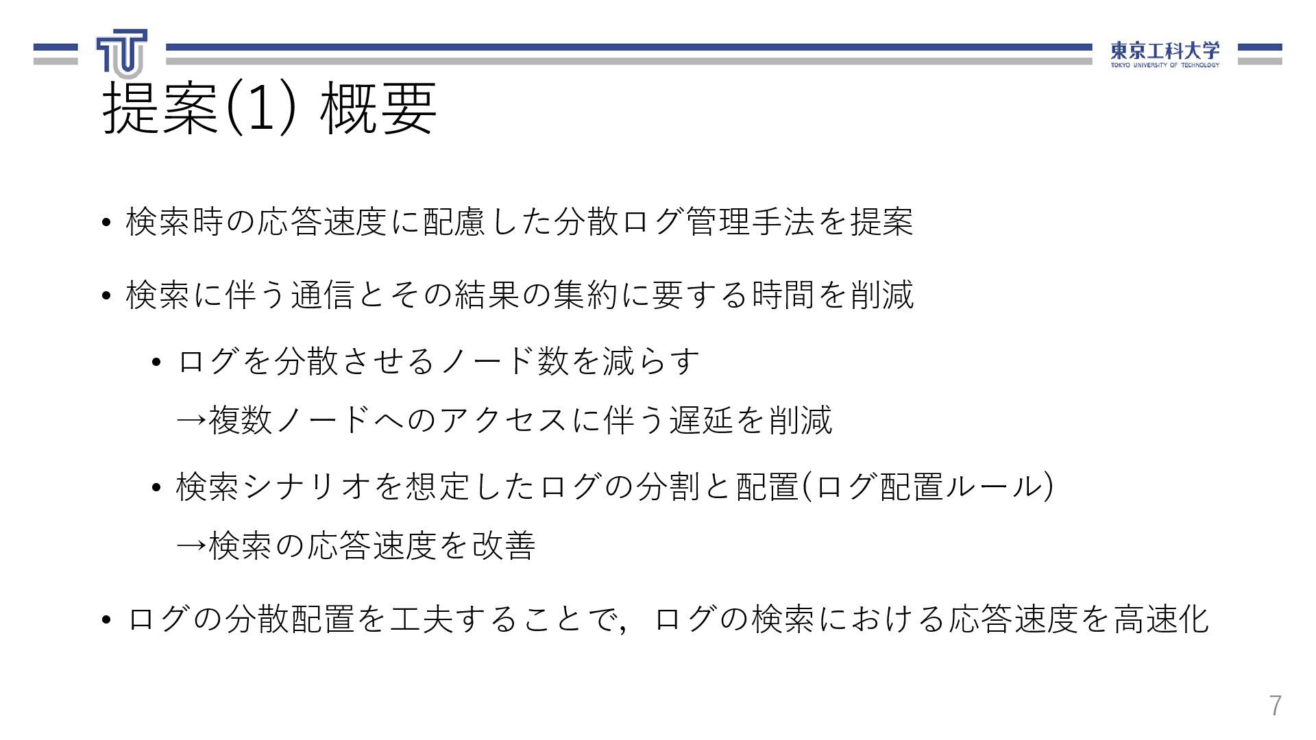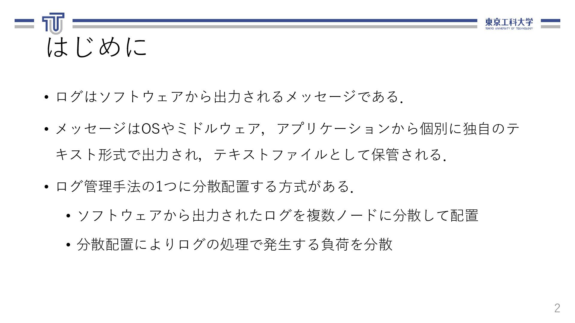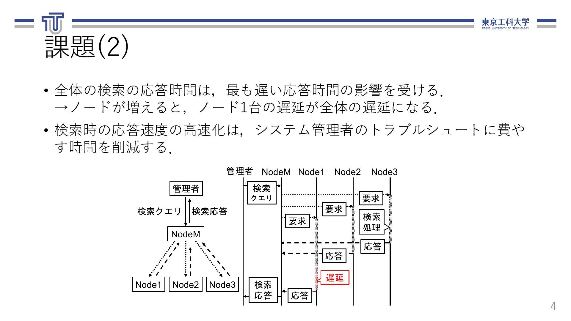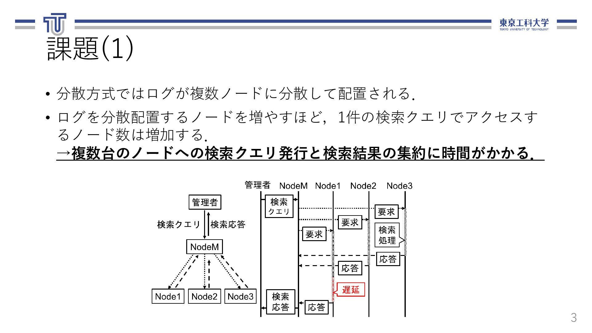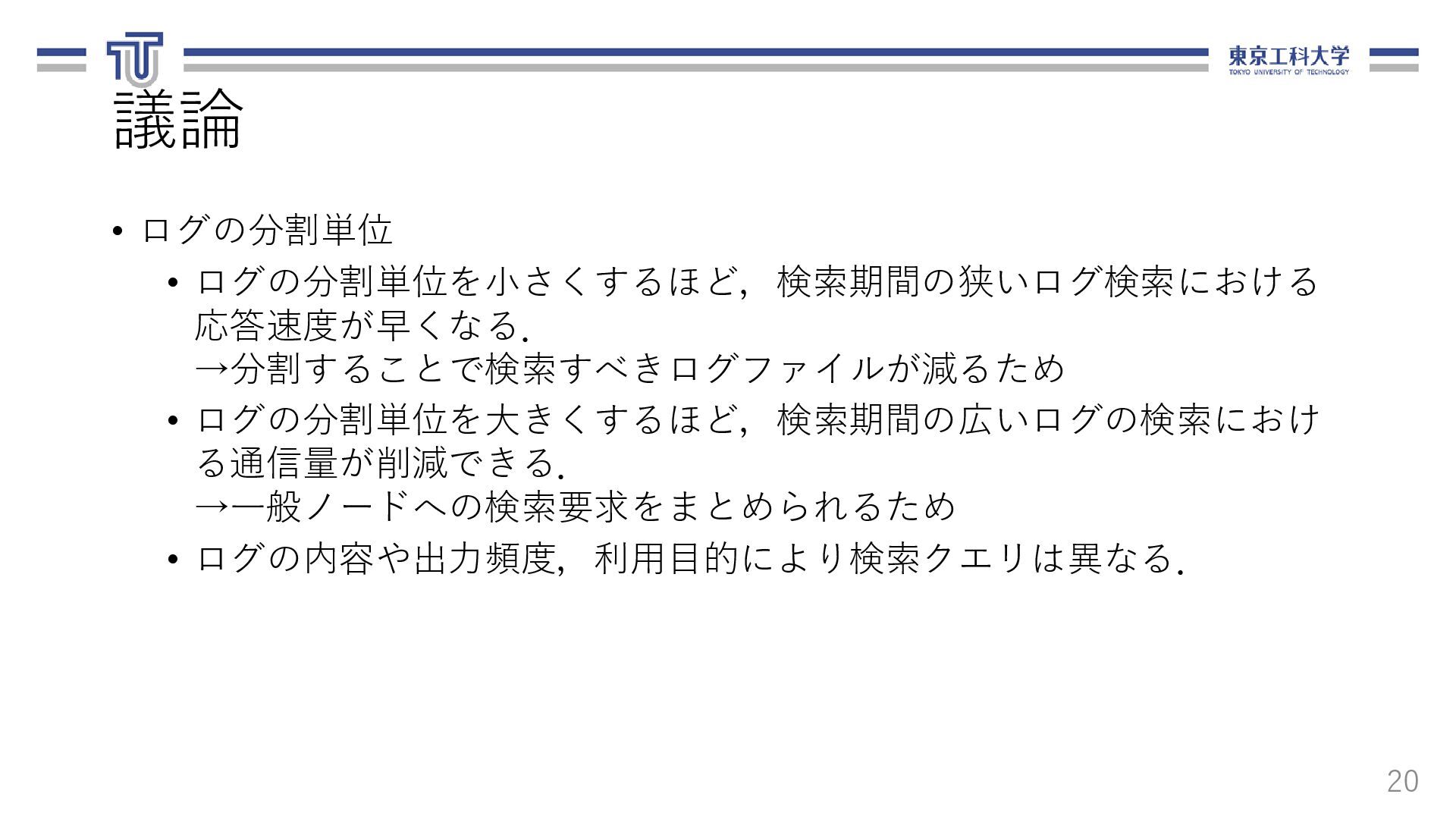 る.ログ転送元,転送先,ファイル名,期間を 含む. 13 loadbalancer: logfile_basename: "access_log" nodes: - ipaddr: 10.1.0.8 name: replica-agent-dep-b79d4d6dc-55shn - ipaddr: 10.1.0.15 name: replica-agent-dep-b79d4d6dc-9gm68 - ipaddr: 10.1.0.14 name: replica-agent-dep-b79d4d6dc-dt7cn システム構成情報(arch.yaml) [ { "srcAddr": "10.1.0.8", "destAddr": "10.1.0.11", "logFilename": "access_log", "logDate": "20201121" }, { "srcAddr": "10.1.0.15", "destAddr": "10.1.0.13", "logFilename": "access_log", "logDate": "20201121" }, { "srcAddr": "10.1.0.14", "destAddr": "10.1.0.9", "logFilename": "access_log", "logDate": "20201121" } ] ログ配置ルール(rule.json)