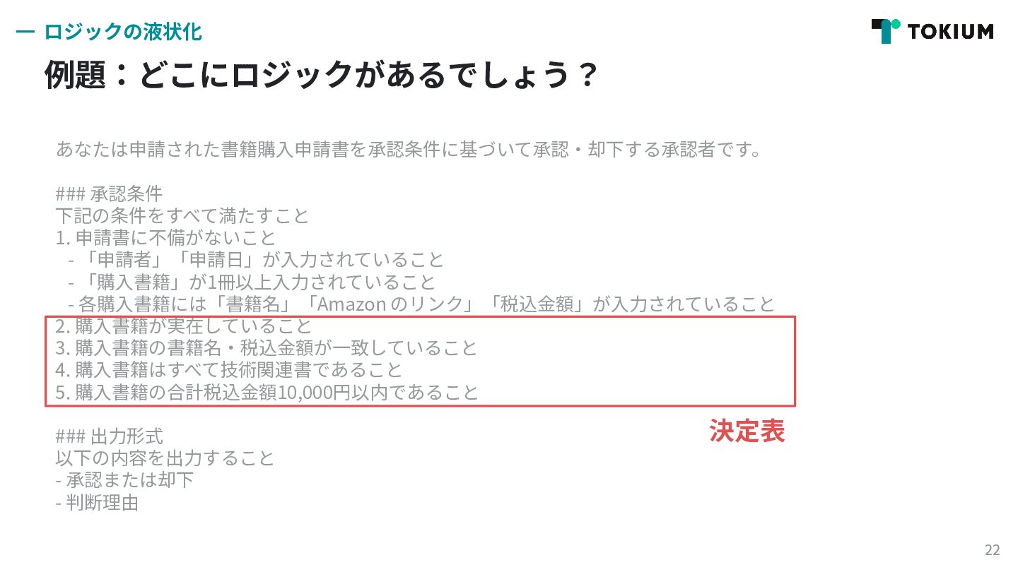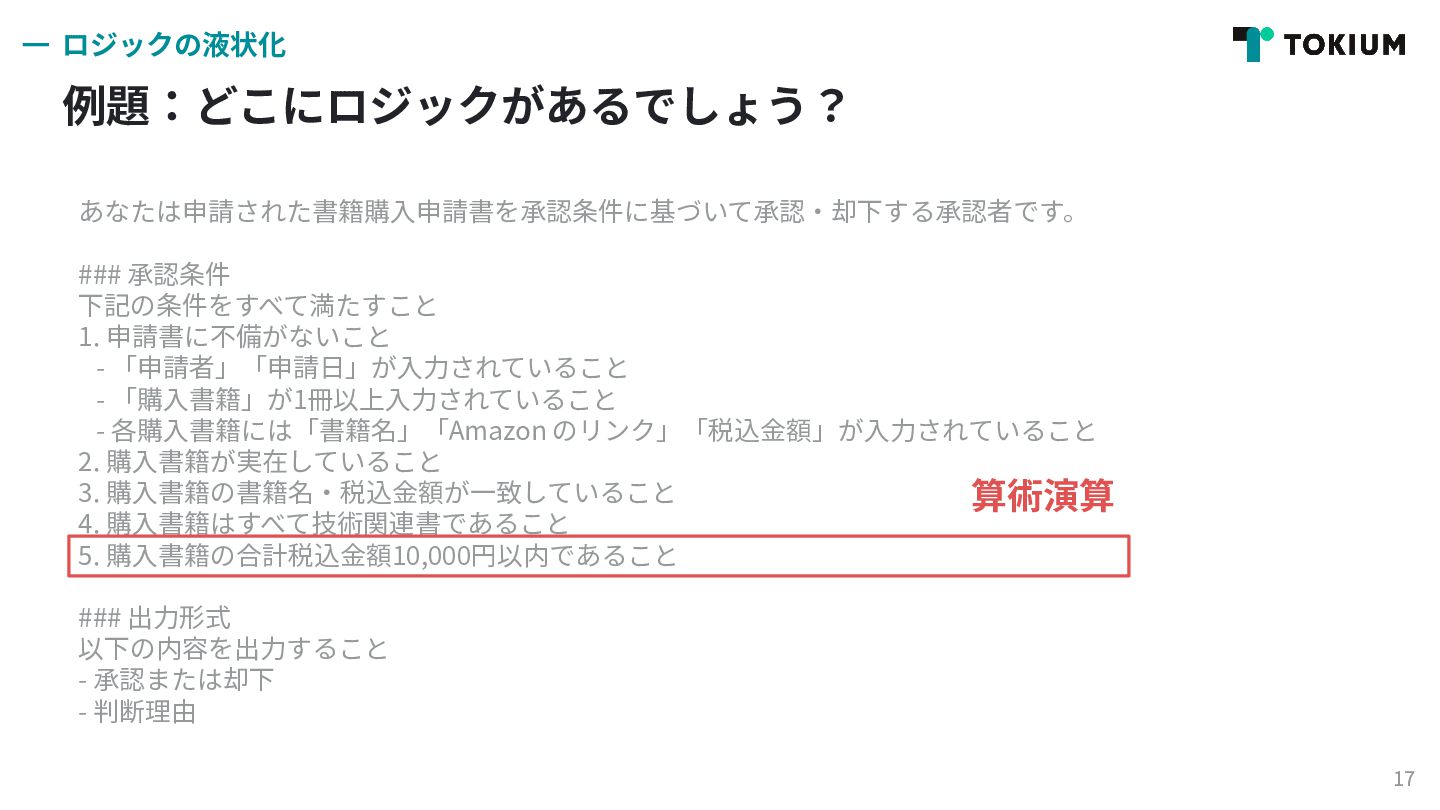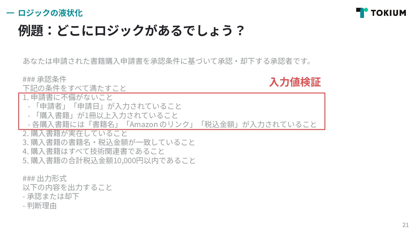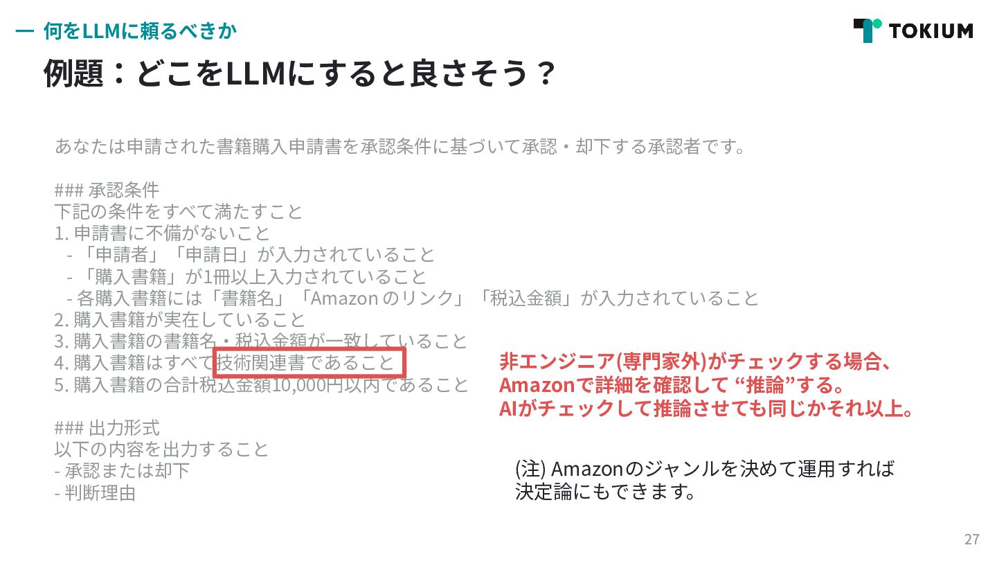 - 「申請者」「申請⽇」が⼊⼒されていること - 「購⼊書籍」が1冊以上⼊⼒されていること - 各購⼊書籍には「書籍名」「Amazon のリンク」「税込⾦額」が⼊⼒されていること 2. 購⼊書籍が実在していること 3. 購⼊書籍の書籍名‧税込⾦額が⼀致していること 4. 購⼊書籍はすべて技術関連書であること 5. 購⼊書籍の合計税込⾦額10,000円以内であること ### 出⼒形式 以下の内容を出⼒すること - 承認または却下 - 判断理由 ⾮エンジニア(専⾨家外)がチェックする場合、 Amazonで詳細を確認して “推論”する。 AIがチェックして推論させても同じかそれ以上。 (注) Amazonのジャンルを決めて運⽤すれば 決定論にもできます。