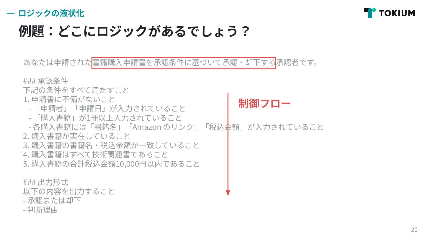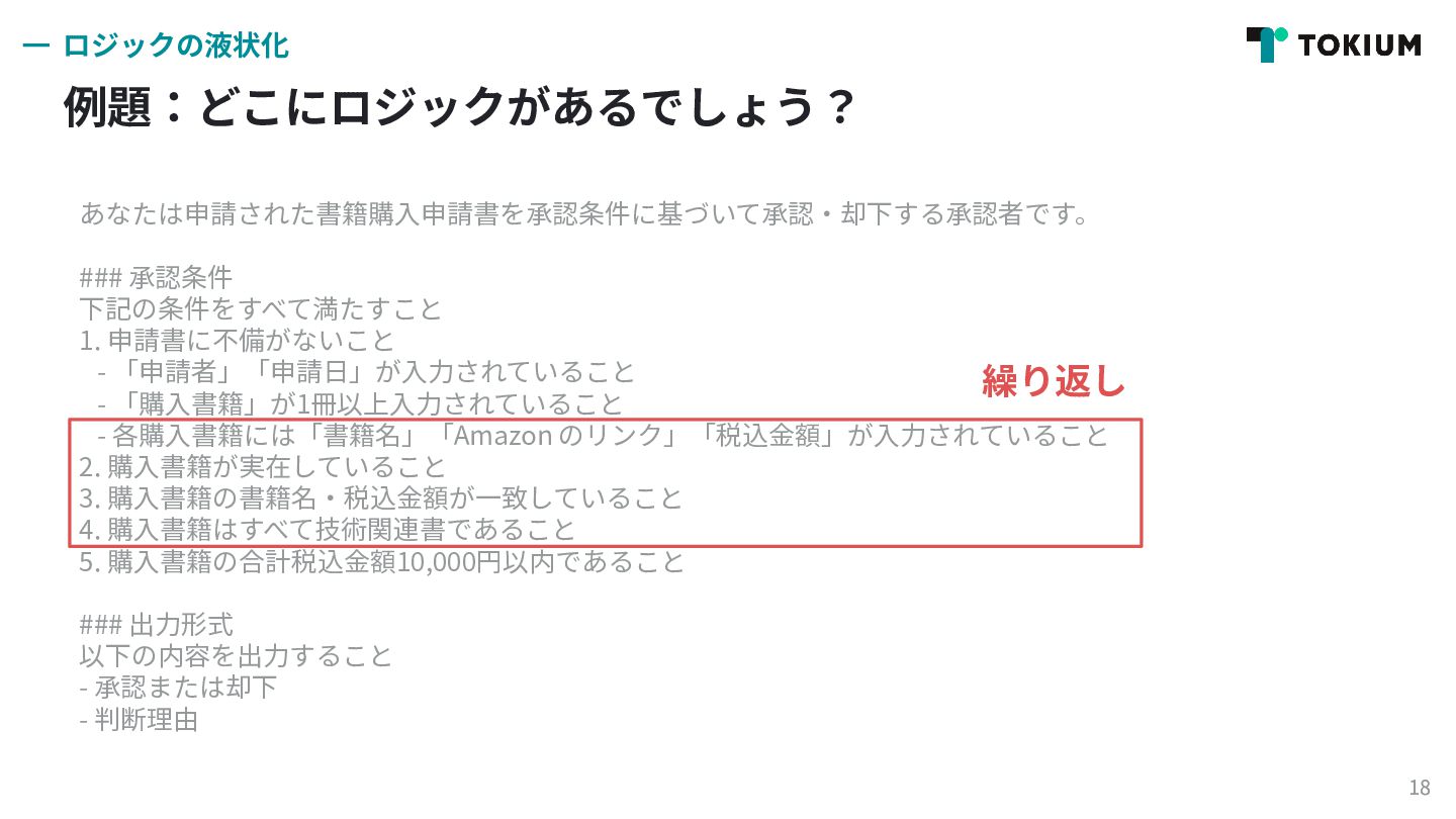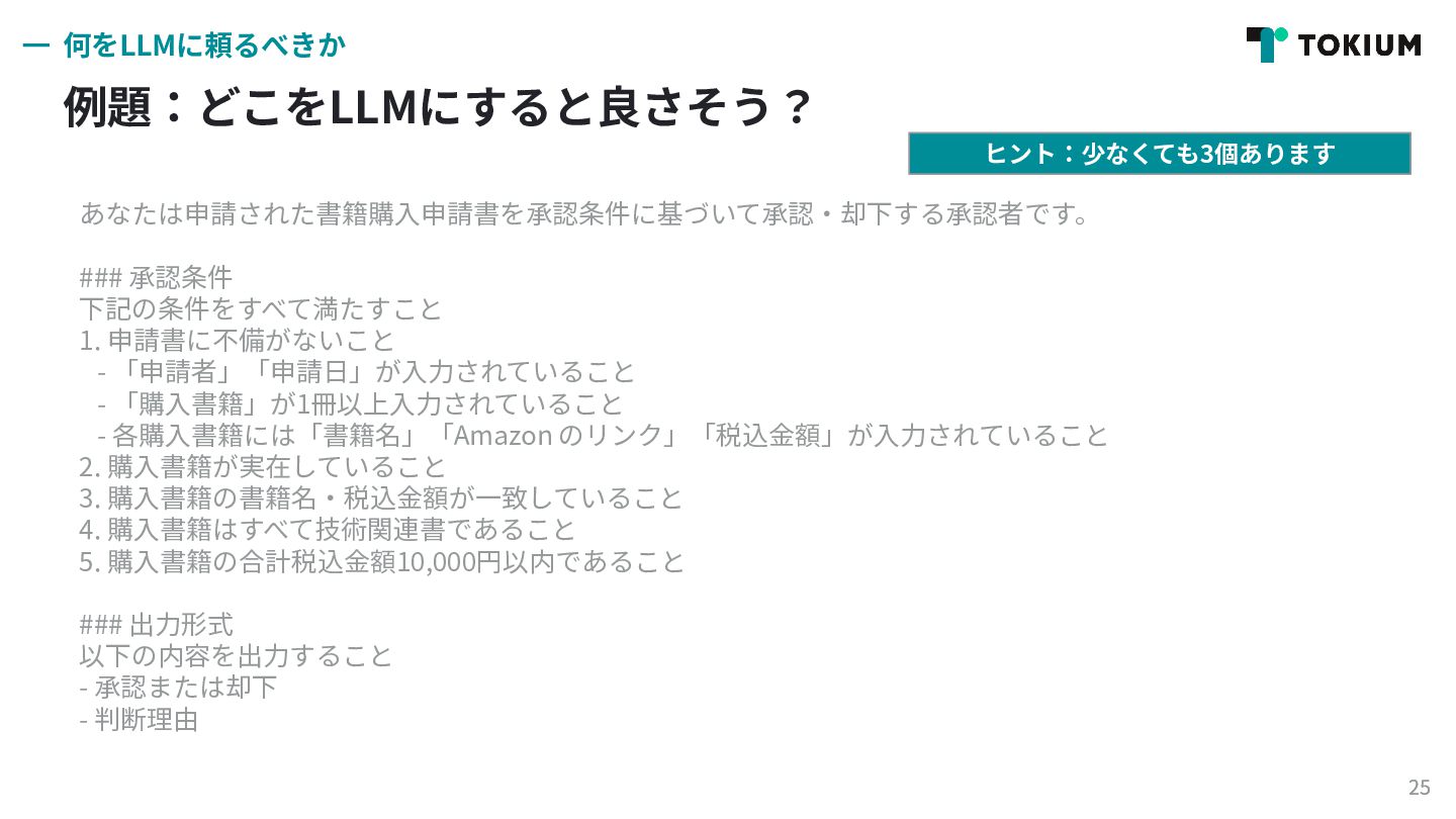 - 「申請者」「申請⽇」が⼊⼒されていること - 「購⼊書籍」が1冊以上⼊⼒されていること - 各購⼊書籍には「書籍名」「Amazon のリンク」「税込⾦額」が⼊⼒されていること 2. 購⼊書籍が実在していること 3. 購⼊書籍の書籍名‧税込⾦額が⼀致していること 4. 購⼊書籍はすべて技術関連書であること 5. 購⼊書籍の合計税込⾦額10,000円以内であること ### 出⼒形式 以下の内容を出⼒すること - 承認または却下 - 判断理由 ⾮エンジニア(専⾨家外)がチェックする場合、 Amazonで詳細を確認して “推論”する。 AIがチェックして推論させても同じかそれ以上。 (注) Amazonのジャンルを決めて運⽤すれば 決定論にもできます。