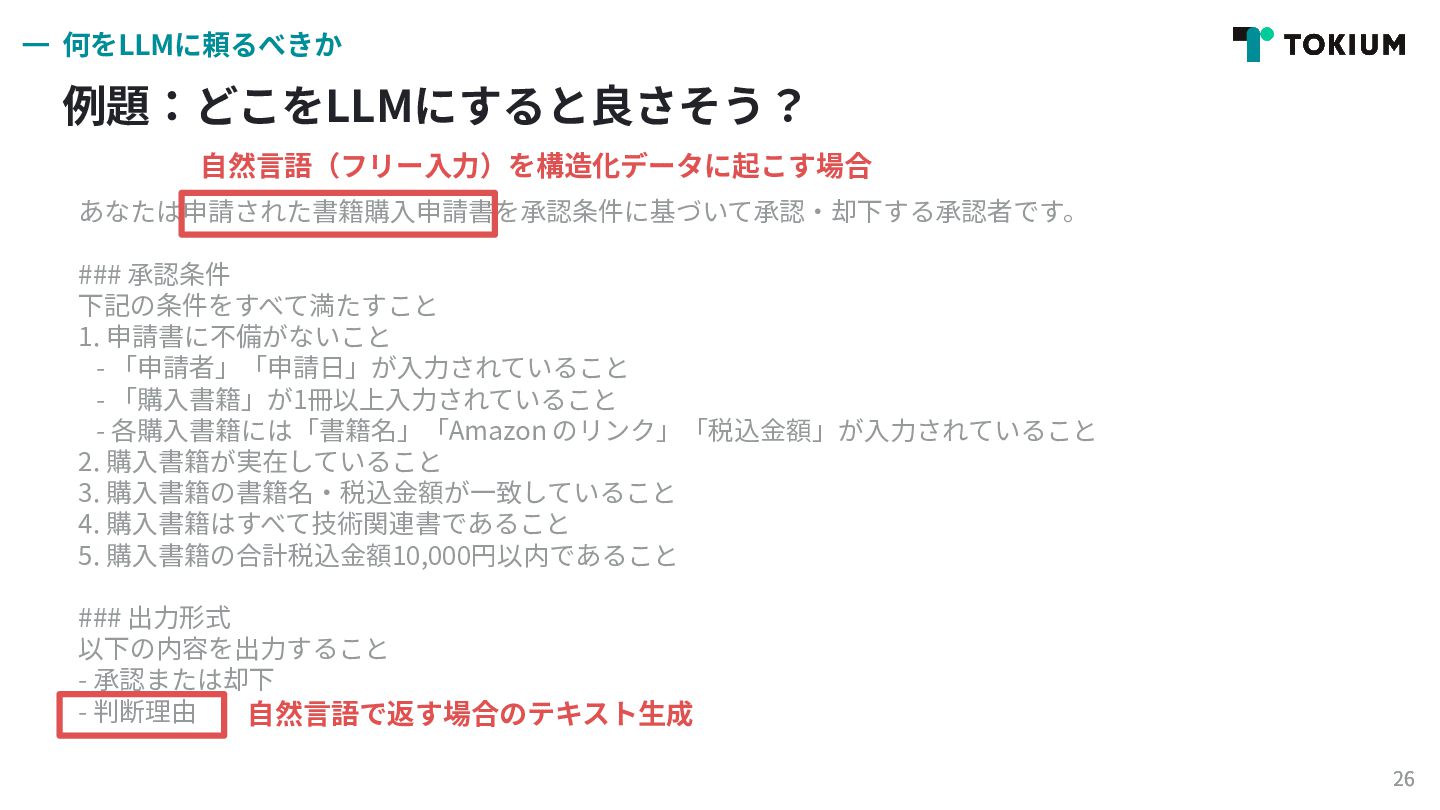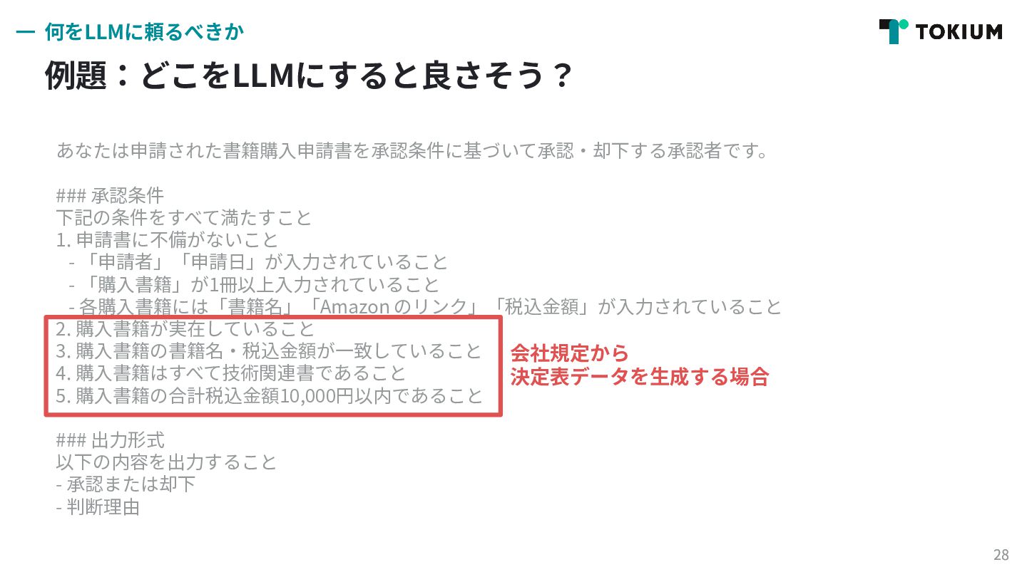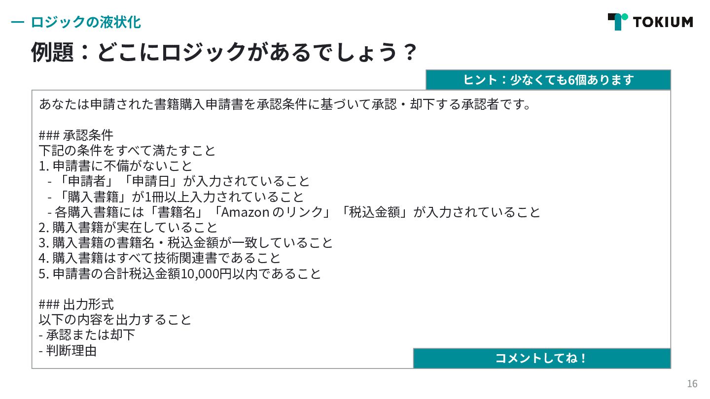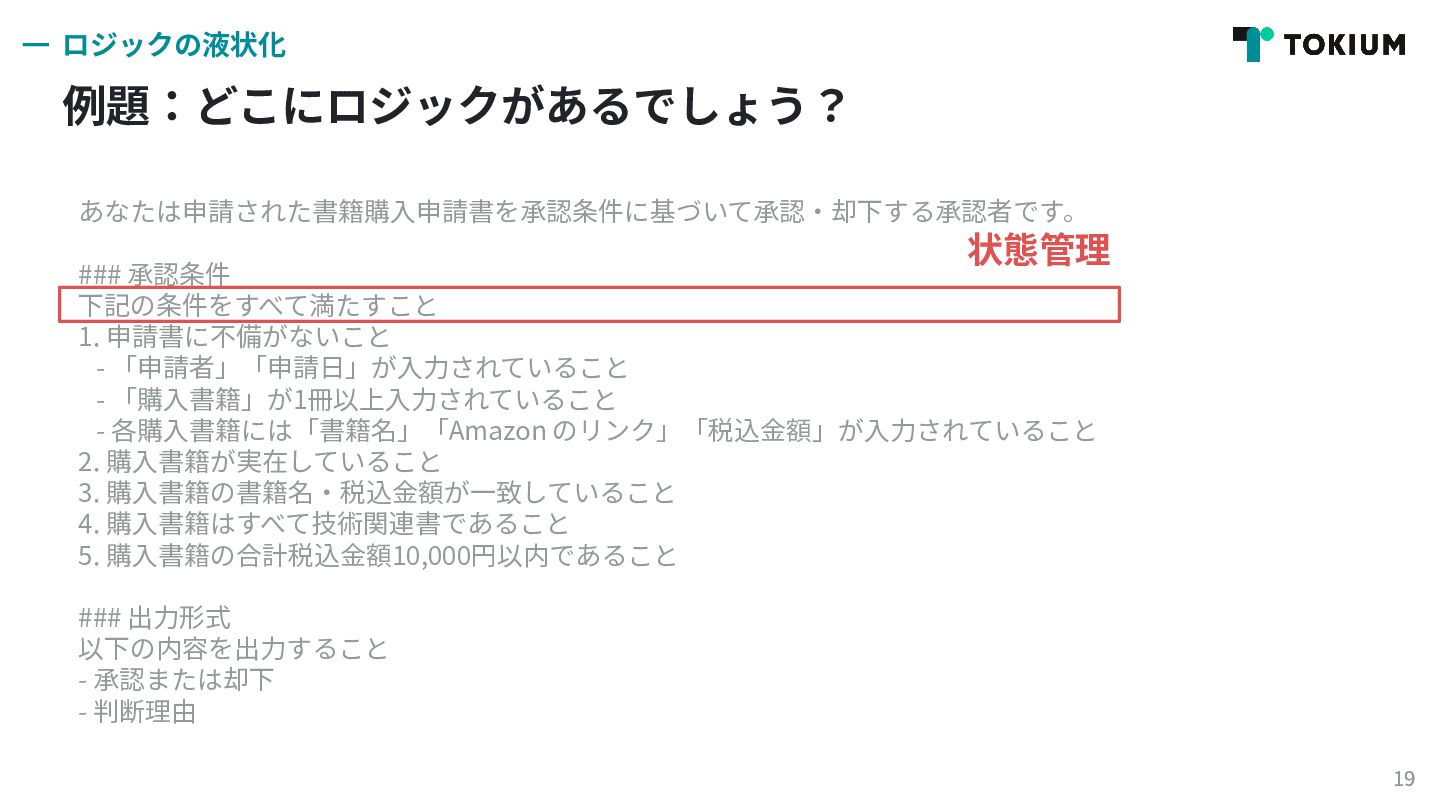 - 「申請者」「申請⽇」が⼊⼒されていること - 「購⼊書籍」が1冊以上⼊⼒されていること - 各購⼊書籍には「書籍名」「Amazon のリンク」「税込⾦額」が⼊⼒されていること 2. 購⼊書籍が実在していること 3. 購⼊書籍の書籍名‧税込⾦額が⼀致していること 4. 購⼊書籍はすべて技術関連書であること 5. 購⼊書籍の合計税込⾦額10,000円以内であること ### 出⼒形式 以下の内容を出⼒すること - 承認または却下 - 判断理由 ⾮エンジニア(専⾨家外)がチェックする場合、 Amazonで詳細を確認して “推論”する。 AIがチェックして推論させても同じかそれ以上。 (注) Amazonのジャンルを決めて運⽤すれば 決定論にもできます。