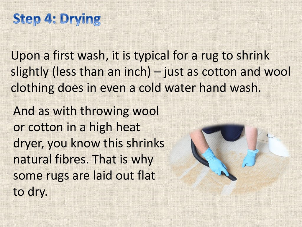 to shrink slightly (less than an inch) – just as cotton and wool clothing does in even a cold water hand wash. And as with throwing wool or cotton in a high heat dryer, you know this shrinks natural fibres. That is why some rugs are laid out flat to dry.