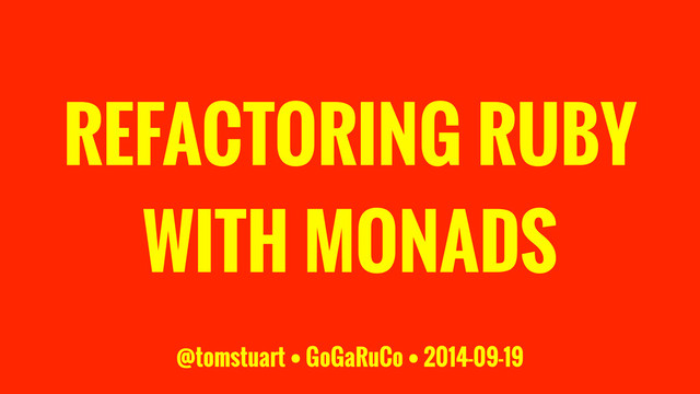 Given at eurucamp 2014 (http://2014.eurucamp.org/), BaRuCo 2014 (http://lanyrd.com/2014/baruco/) and GoGaRuCo 2014 (http://lanyrd.com/2014/gogaruco/). The accompanying code is at https://github.com/tomstuart/monads, and an article version is available at https://tomstu.art/refactoring-ruby-with-monads.