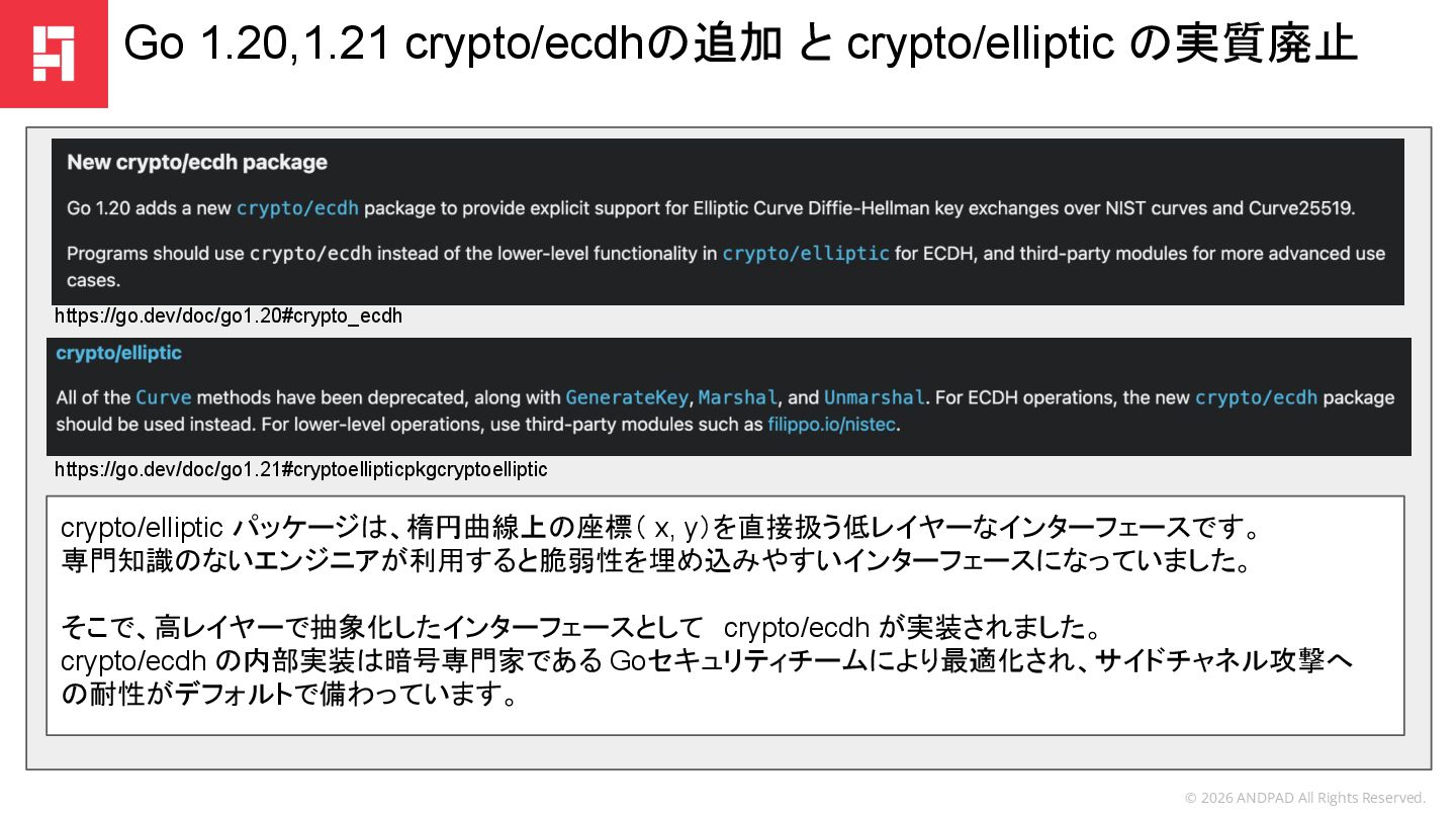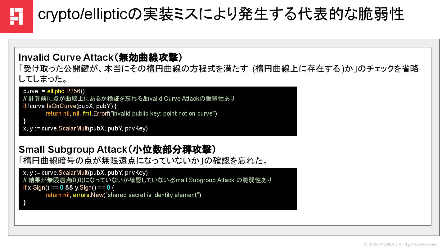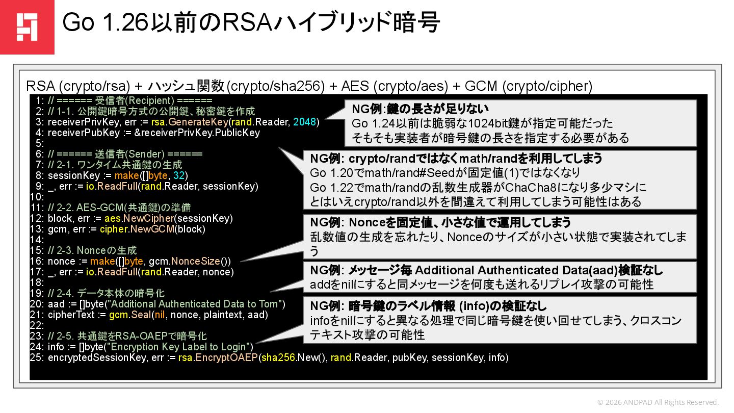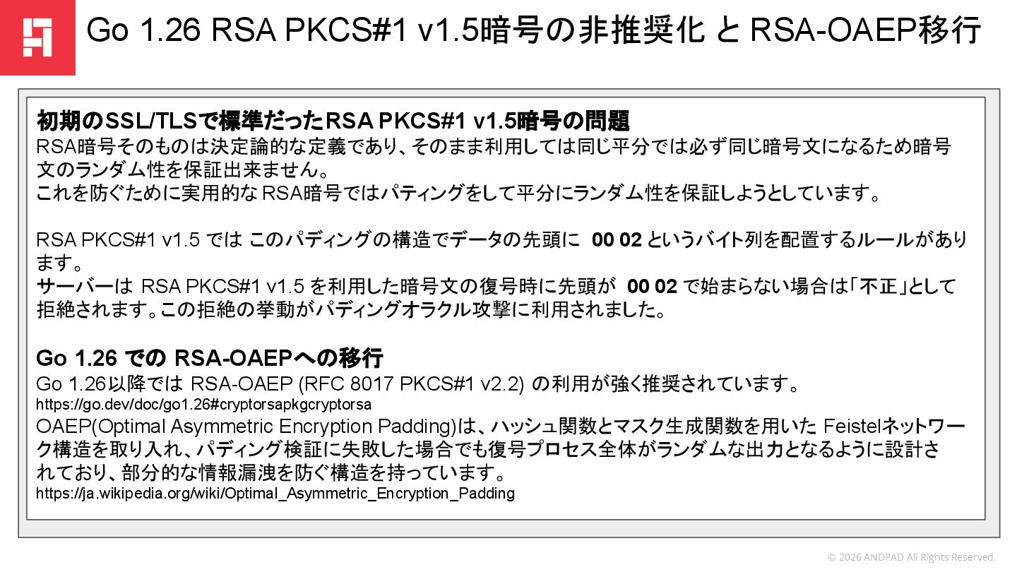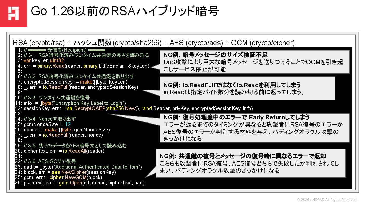 + AES (crypto/aes) + GCM (crypto/cipher) Go 1.26以前のRSAハイブリッド暗号 1: // ====== 受信者(Recipient) ====== 2: // 3-1. RSA暗号化済みワンタイム共通鍵の長さを読み取る 3: var keyLen uint32 4: err := binary.Read(reader, binary.LittleEndian, &keyLen) 5: 6: // 3-2. RSA暗号化済みワンタイム共通鍵を取り出す 7: encryptedSessionKey := make([]byte, keyLen) 8: _, err := io.ReadFull(reader, encryptedSessionKey) 9: 10: // 3-3. ワンタイム共通鍵を復号 11: info := []byte("Encryption Key Label to Login") 12: sessionKey, err := rsa.DecryptOAEP(sha256.New(), rand.Reader, privKey, encryptedSessionKey, info) 13: 14: // 3-4. Nonceを取り出す 15: gcmNonceSize := 12 16: nonce := make([]byte, gcmNonceSize) 17: _, err := io.ReadFull(reader, nonce) 18: 19: // 3-5. 残りのデータをAES暗号文として読み込む 20: cipherText, err := io.ReadAll(reader) 21: 22: // 3-6. AES-GCMで復号 23: aad := []byte("Additional Authenticated Data to Tom") 24: block, err := aes.NewCipher(sessionKey) 25: gcm, err := cipher.NewGCM(block) 26: plaintext, err := gcm.Open(nil, nonce, cipherText, aad) NG例: 共通鍵の復号とメッセージの復号時に異なるエラーで返却 こちらも攻撃者にRSA復号、AES復号どちらで失敗したか判別されてし まい、パディングオラクル攻撃のきっかけになる NG例: 暗号メッセージのサイズ検証不足 DoS攻撃により巨大な暗号メッセージを送りつけることでOOMを引き起 こしサービス停止が可能 NG例: 復号処理途中のエラーで Early Returnしてしまう エラーが返るまでのタイミングが異なると攻撃者にRSA復号のエラーか AES復号のエラーか判別する材料を与え、パディングオラクル攻撃の きっかけになる NG例: io.ReadFullではなくio.Readを利用してしまう io.Readは指定バイト数分を読み切る前に返ってしまう。