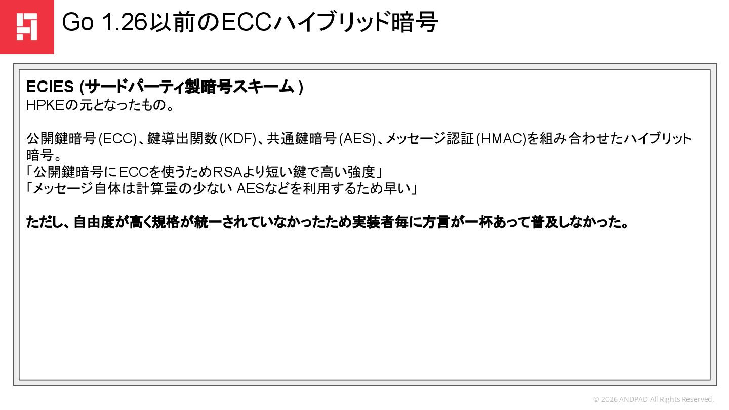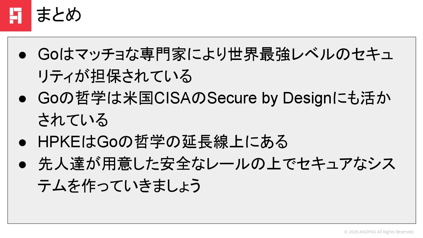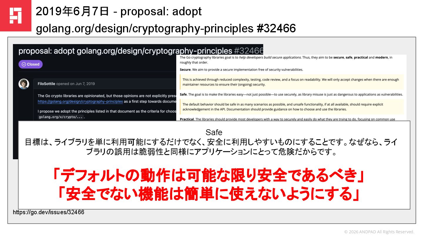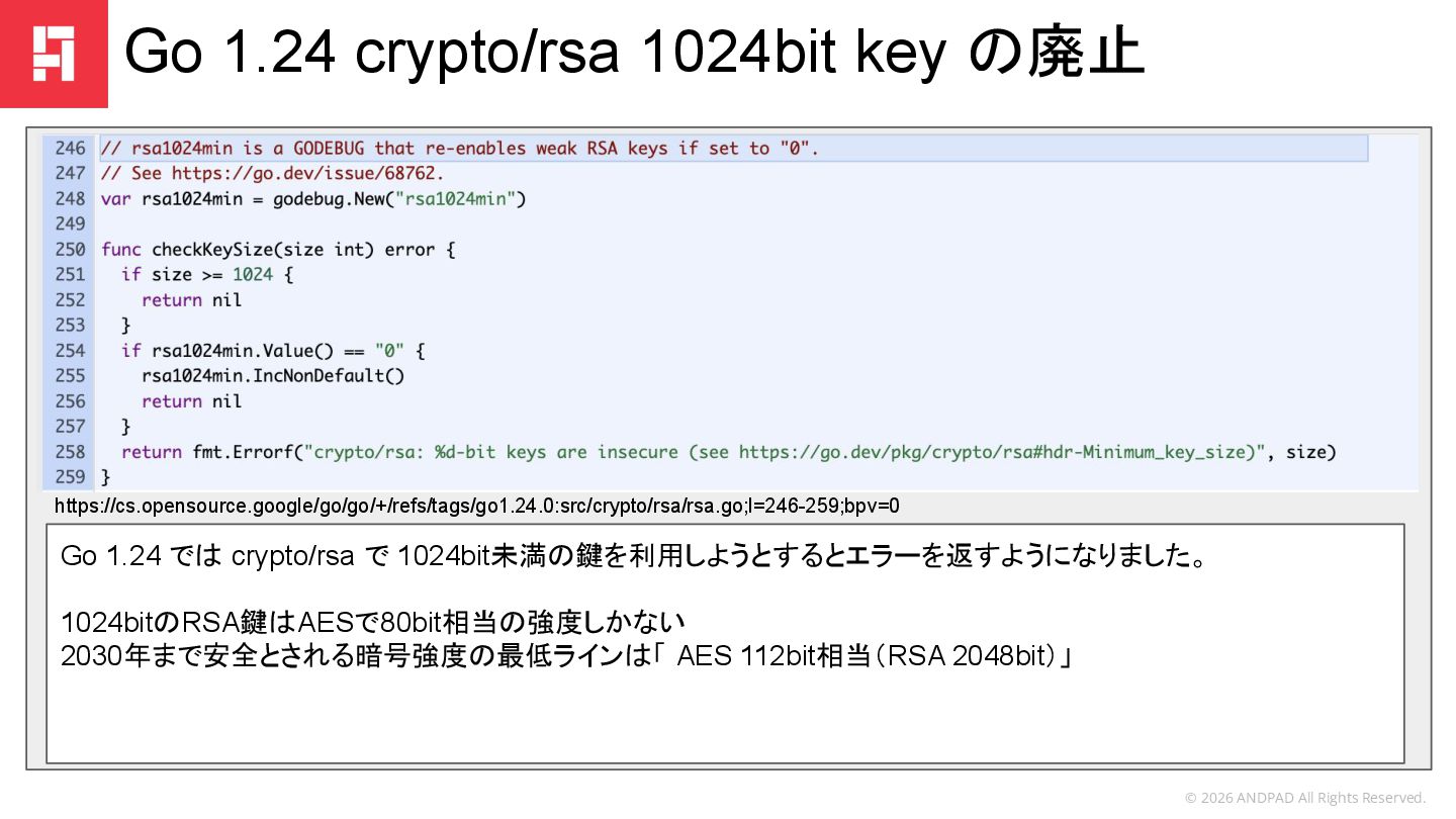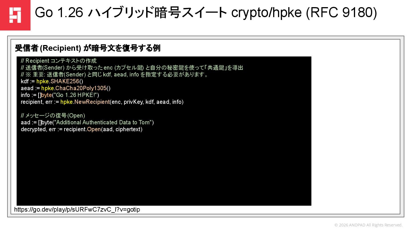 + AES (crypto/aes) + GCM (crypto/cipher) Go 1.26以前のRSAハイブリッド暗号 1: // ====== 受信者(Recipient) ====== 2: // 3-1. RSA暗号化済みワンタイム共通鍵の長さを読み取る 3: var keyLen uint32 4: err := binary.Read(reader, binary.LittleEndian, &keyLen) 5: 6: // 3-2. RSA暗号化済みワンタイム共通鍵を取り出す 7: encryptedSessionKey := make([]byte, keyLen) 8: _, err := io.ReadFull(reader, encryptedSessionKey) 9: 10: // 3-3. ワンタイム共通鍵を復号 11: info := []byte("Encryption Key Label to Login") 12: sessionKey, err := rsa.DecryptOAEP(sha256.New(), rand.Reader, privKey, encryptedSessionKey, info) 13: 14: // 3-4. Nonceを取り出す 15: gcmNonceSize := 12 16: nonce := make([]byte, gcmNonceSize) 17: _, err := io.ReadFull(reader, nonce) 18: 19: // 3-5. 残りのデータをAES暗号文として読み込む 20: cipherText, err := io.ReadAll(reader) 21: 22: // 3-6. AES-GCMで復号 23: aad := []byte("Additional Authenticated Data to Tom") 24: block, err := aes.NewCipher(sessionKey) 25: gcm, err := cipher.NewGCM(block) 26: plaintext, err := gcm.Open(nil, nonce, cipherText, aad) NG例: 共通鍵の復号とメッセージの復号時に異なるエラーで返却 こちらも攻撃者にRSA復号、AES復号どちらで失敗したか判別されてし まい、パディングオラクル攻撃のきっかけになる NG例: 暗号メッセージのサイズ検証不足 DoS攻撃により巨大な暗号メッセージを送りつけることでOOMを引き起 こしサービス停止が可能 NG例: 復号処理途中のエラーで Early Returnしてしまう エラーが返るまでのタイミングが異なると攻撃者にRSA復号のエラーか AES復号のエラーか判別する材料を与え、パディングオラクル攻撃の きっかけになる NG例: io.ReadFullではなくio.Readを利用してしまう io.Readは指定バイト数分を読み切る前に返ってしまう。