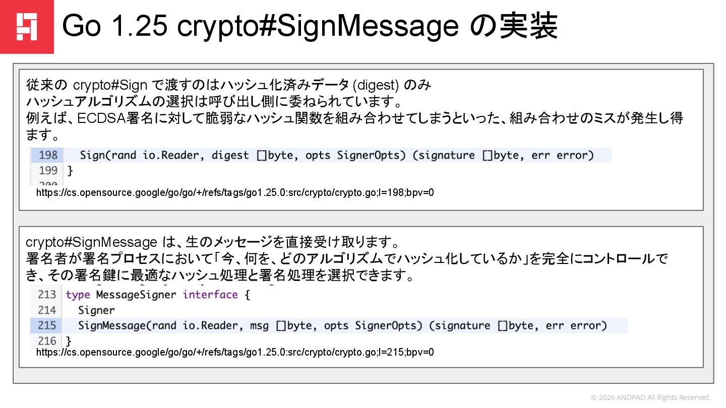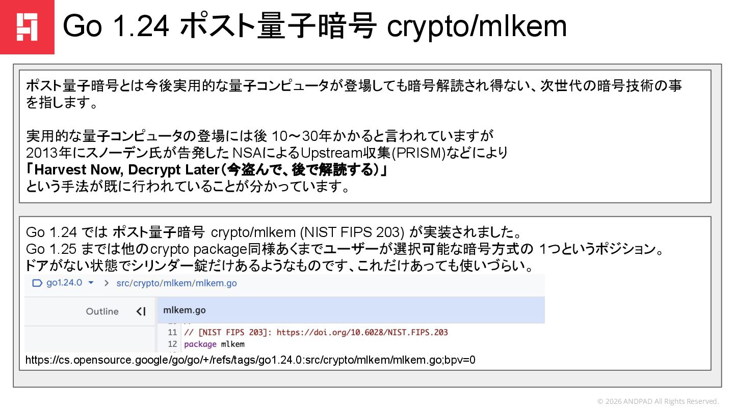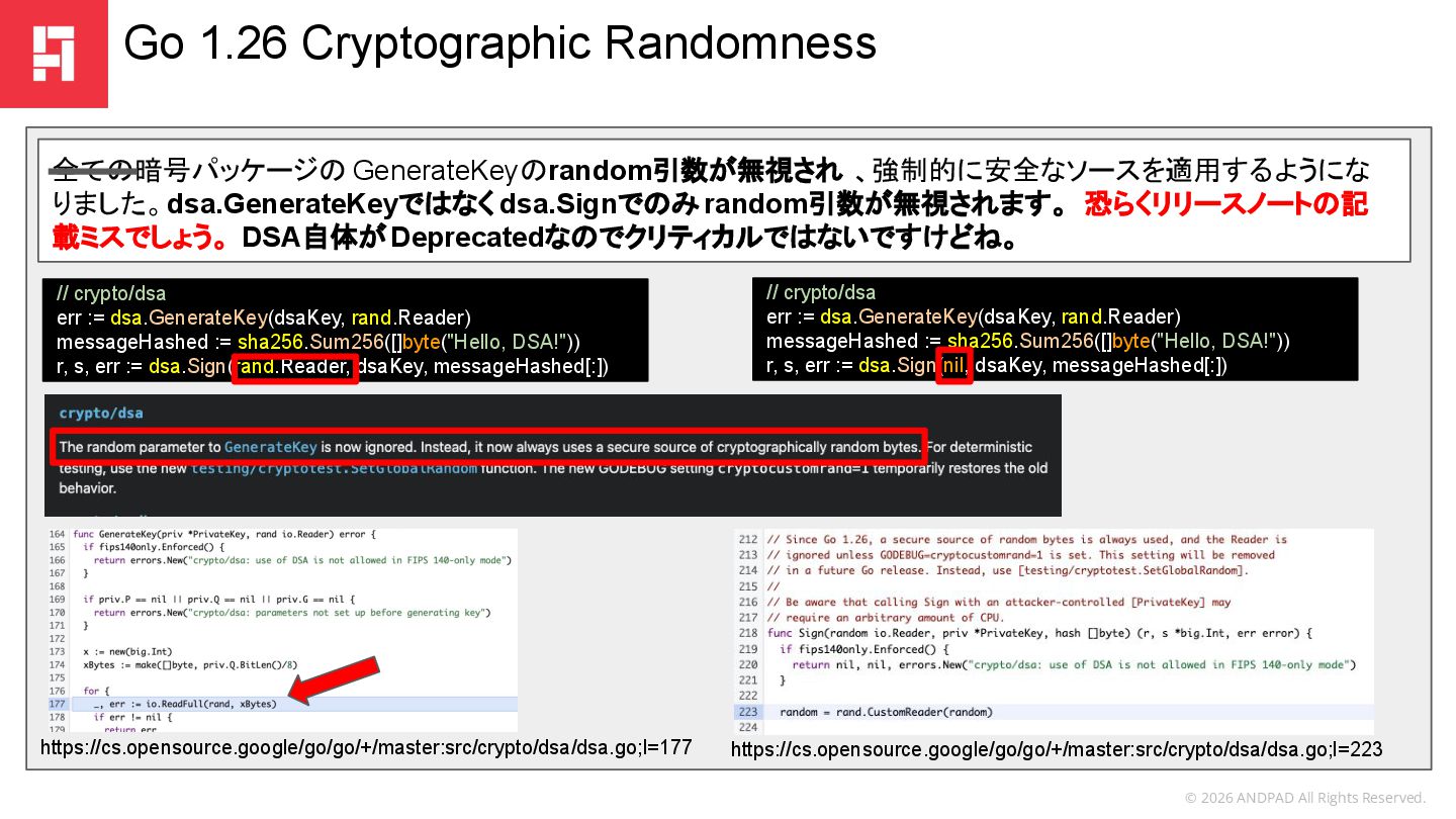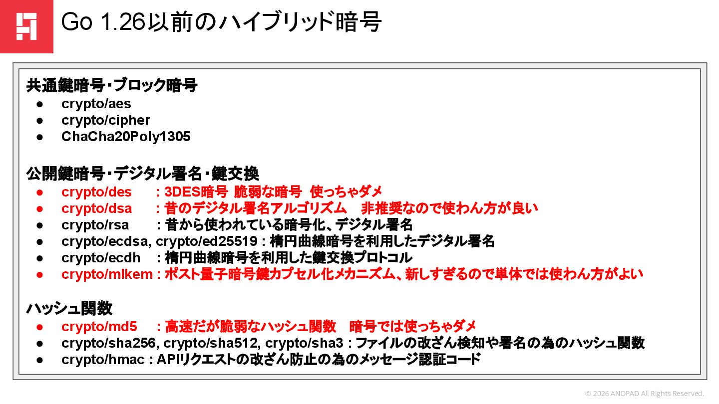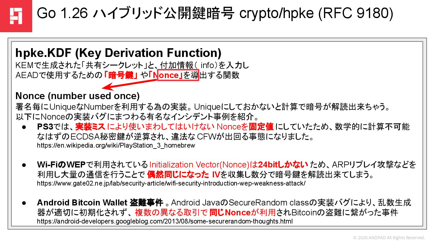 + AES (crypto/aes) + GCM (crypto/cipher) Go 1.26以前のRSAハイブリッド暗号 1: // ====== 受信者(Recipient) ====== 2: // 3-1. RSA暗号化済みワンタイム共通鍵の長さを読み取る 3: var keyLen uint32 4: err := binary.Read(reader, binary.LittleEndian, &keyLen) 5: 6: // 3-2. RSA暗号化済みワンタイム共通鍵を取り出す 7: encryptedSessionKey := make([]byte, keyLen) 8: _, err := io.ReadFull(reader, encryptedSessionKey) 9: 10: // 3-3. ワンタイム共通鍵を復号 11: info := []byte("Encryption Key Label to Login") 12: sessionKey, err := rsa.DecryptOAEP(sha256.New(), rand.Reader, privKey, encryptedSessionKey, info) 13: 14: // 3-4. Nonceを取り出す 15: gcmNonceSize := 12 16: nonce := make([]byte, gcmNonceSize) 17: _, err := io.ReadFull(reader, nonce) 18: 19: // 3-5. 残りのデータをAES暗号文として読み込む 20: cipherText, err := io.ReadAll(reader) 21: 22: // 3-6. AES-GCMで復号 23: aad := []byte("Additional Authenticated Data to Tom") 24: block, err := aes.NewCipher(sessionKey) 25: gcm, err := cipher.NewGCM(block) 26: plaintext, err := gcm.Open(nil, nonce, cipherText, aad) NG例: 共通鍵の復号とメッセージの復号時に異なるエラーで返却 こちらも攻撃者にRSA復号、AES復号どちらで失敗したか判別されてし まい、パディングオラクル攻撃のきっかけになる NG例: 暗号メッセージのサイズ検証不足 DoS攻撃により巨大な暗号メッセージを送りつけることでOOMを引き起 こしサービス停止が可能 NG例: 復号処理途中のエラーで Early Returnしてしまう エラーが返るまでのタイミングが異なると攻撃者にRSA復号のエラーか AES復号のエラーか判別する材料を与え、パディングオラクル攻撃の きっかけになる NG例: io.ReadFullではなくio.Readを利用してしまう io.Readは指定バイト数分を読み切る前に返ってしまう。