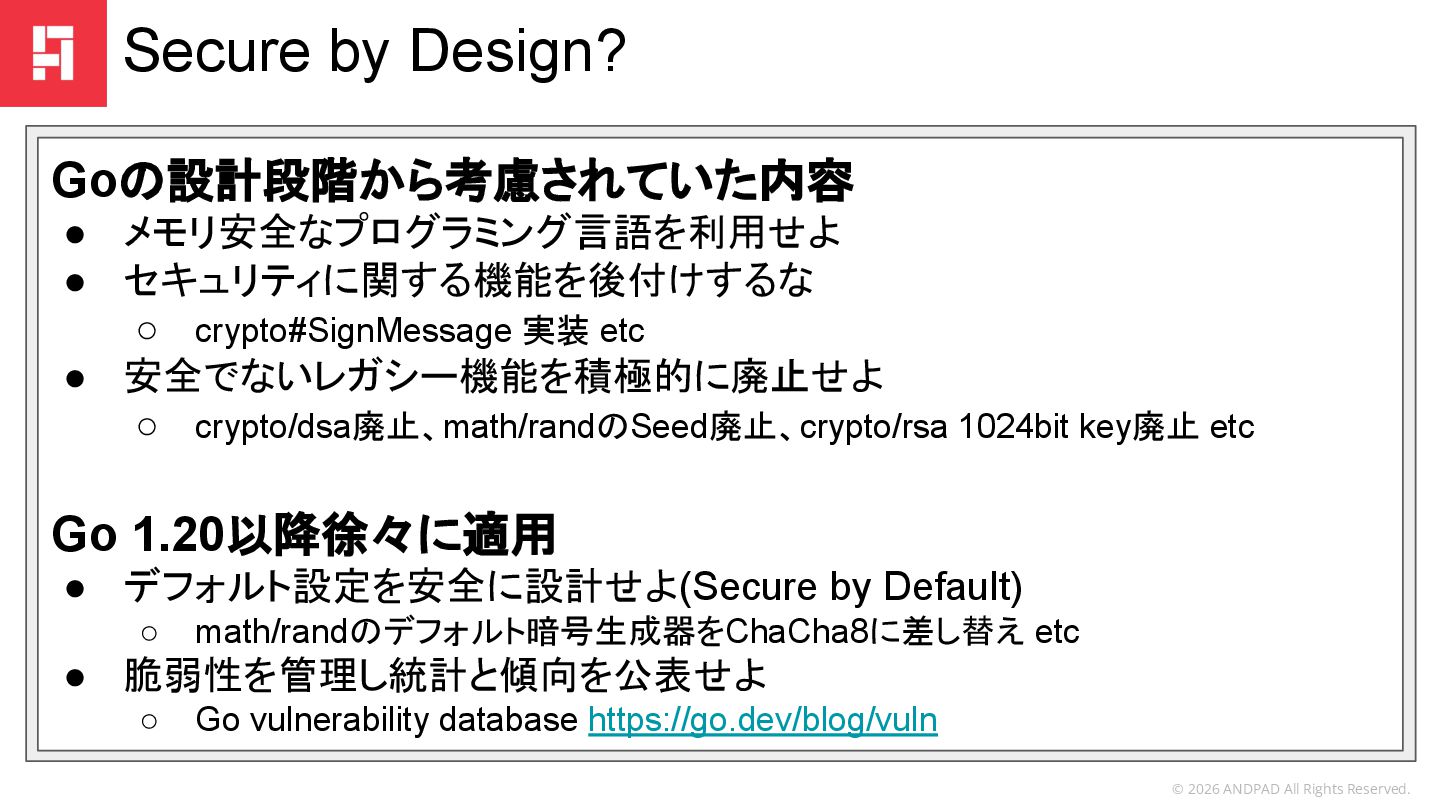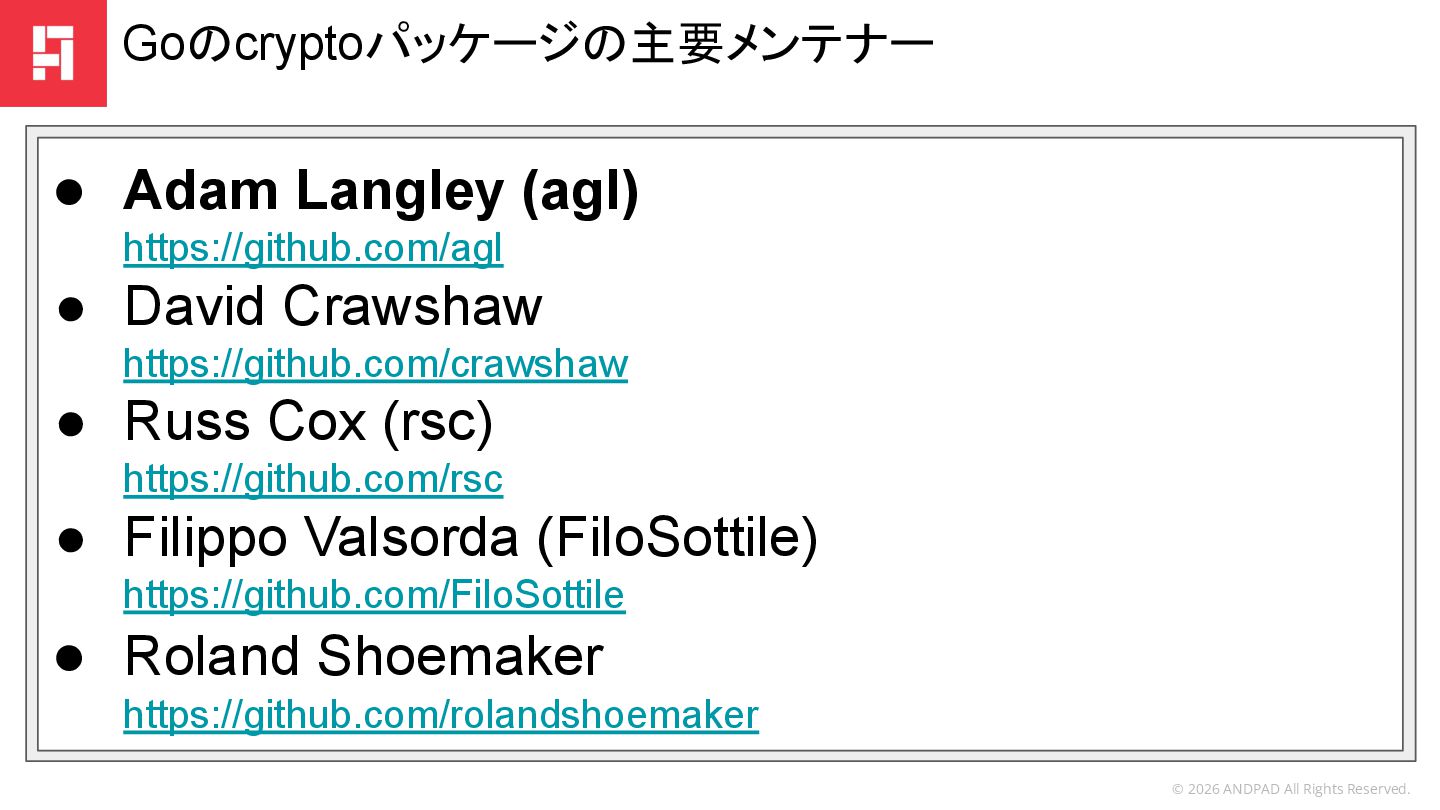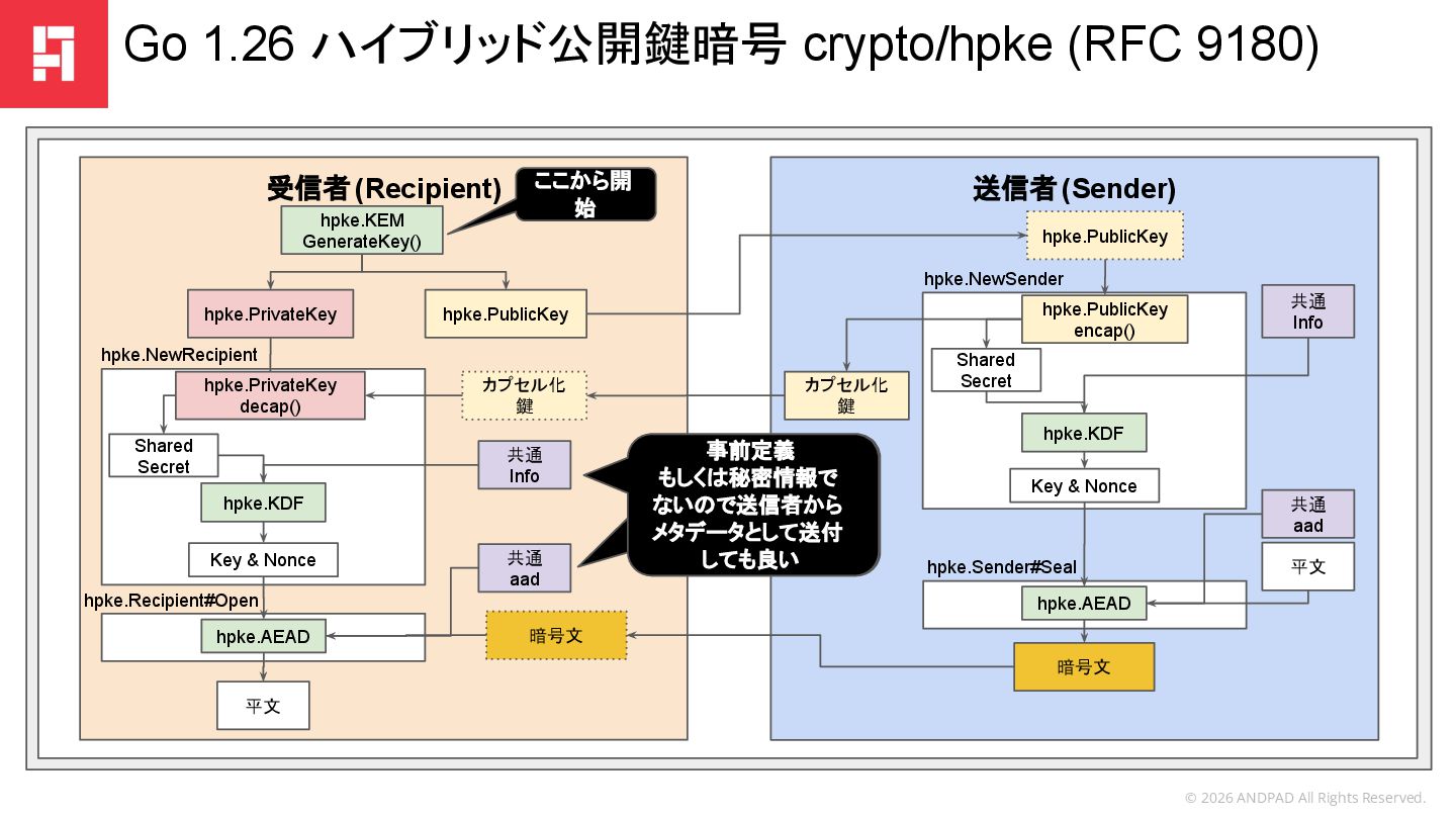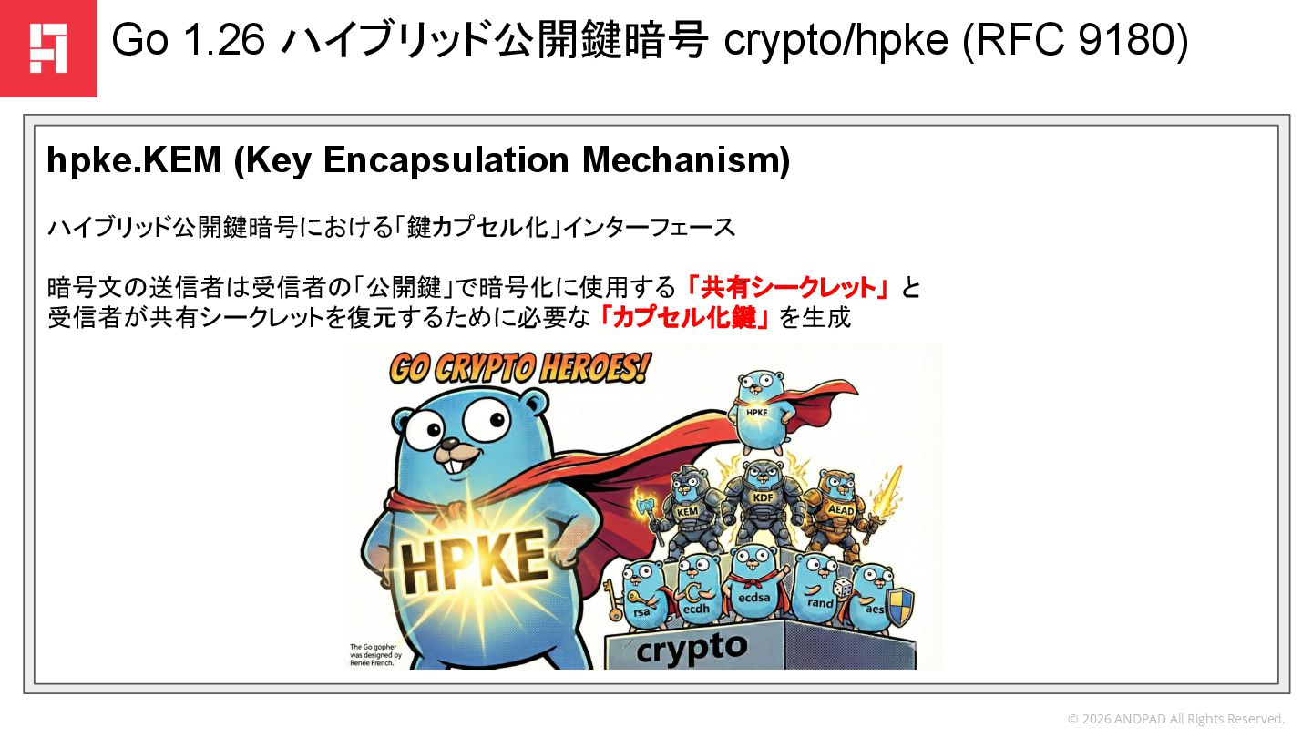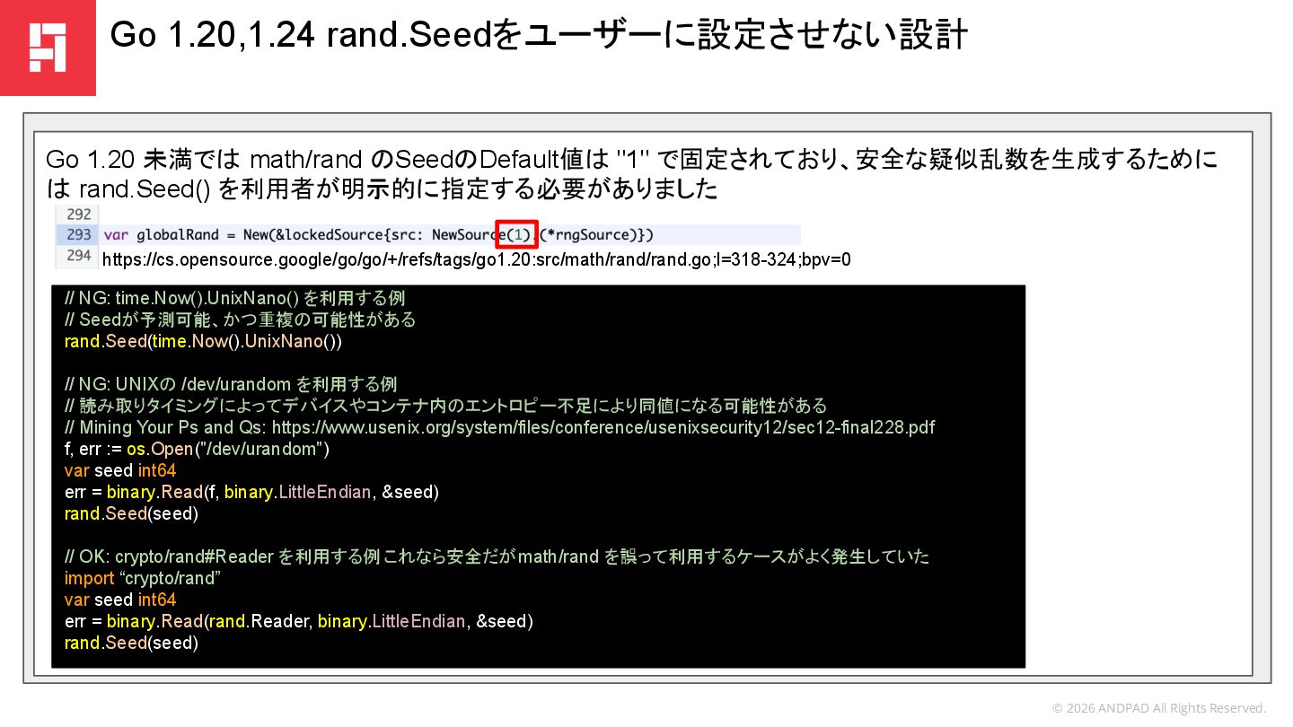 + AES (crypto/aes) + GCM (crypto/cipher) Go 1.26以前のRSAハイブリッド暗号 1: // ====== 受信者(Recipient) ====== 2: // 3-1. RSA暗号化済みワンタイム共通鍵の長さを読み取る 3: var keyLen uint32 4: err := binary.Read(reader, binary.LittleEndian, &keyLen) 5: 6: // 3-2. RSA暗号化済みワンタイム共通鍵を取り出す 7: encryptedSessionKey := make([]byte, keyLen) 8: _, err := io.ReadFull(reader, encryptedSessionKey) 9: 10: // 3-3. ワンタイム共通鍵を復号 11: info := []byte("Encryption Key Label to Login") 12: sessionKey, err := rsa.DecryptOAEP(sha256.New(), rand.Reader, privKey, encryptedSessionKey, info) 13: 14: // 3-4. Nonceを取り出す 15: gcmNonceSize := 12 16: nonce := make([]byte, gcmNonceSize) 17: _, err := io.ReadFull(reader, nonce) 18: 19: // 3-5. 残りのデータをAES暗号文として読み込む 20: cipherText, err := io.ReadAll(reader) 21: 22: // 3-6. AES-GCMで復号 23: aad := []byte("Additional Authenticated Data to Tom") 24: block, err := aes.NewCipher(sessionKey) 25: gcm, err := cipher.NewGCM(block) 26: plaintext, err := gcm.Open(nil, nonce, cipherText, aad) NG例: 共通鍵の復号とメッセージの復号時に異なるエラーで返却 こちらも攻撃者にRSA復号、AES復号どちらで失敗したか判別されてし まい、パディングオラクル攻撃のきっかけになる NG例: 暗号メッセージのサイズ検証不足 DoS攻撃により巨大な暗号メッセージを送りつけることでOOMを引き起 こしサービス停止が可能 NG例: 復号処理途中のエラーで Early Returnしてしまう エラーが返るまでのタイミングが異なると攻撃者にRSA復号のエラーか AES復号のエラーか判別する材料を与え、パディングオラクル攻撃の きっかけになる NG例: io.ReadFullではなくio.Readを利用してしまう io.Readは指定バイト数分を読み切る前に返ってしまう。
