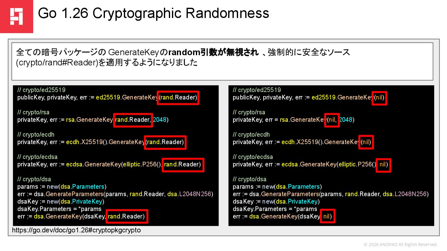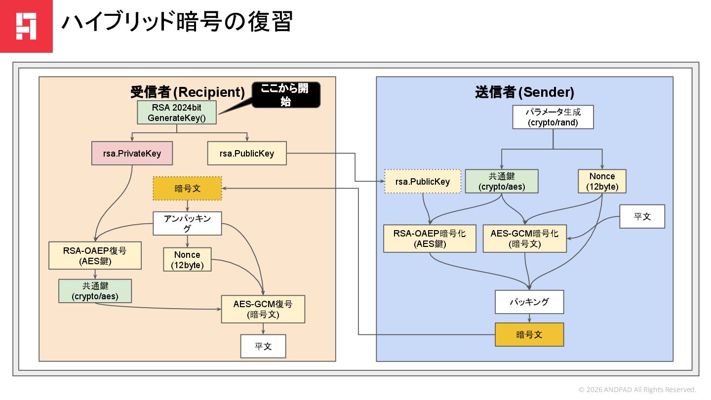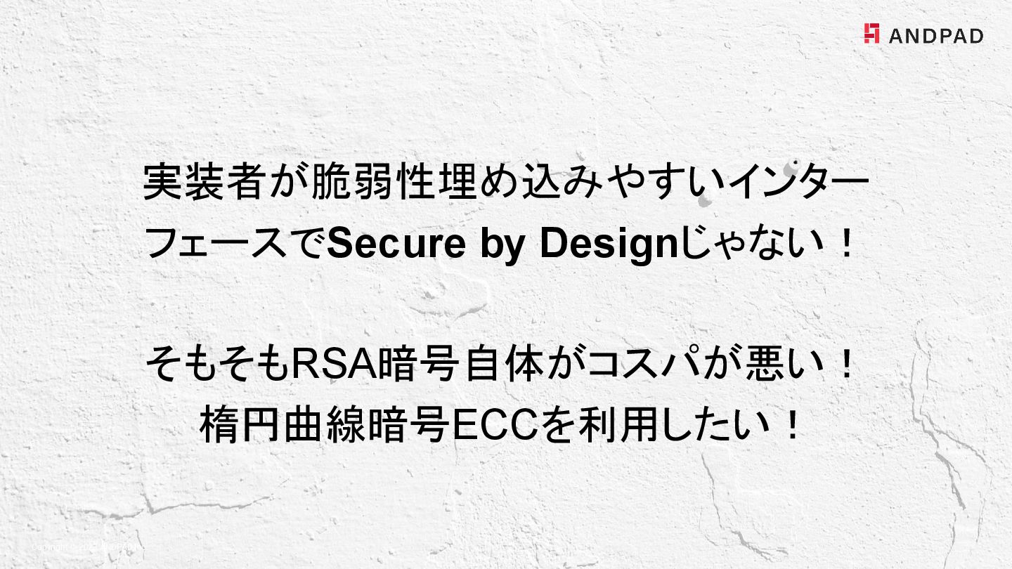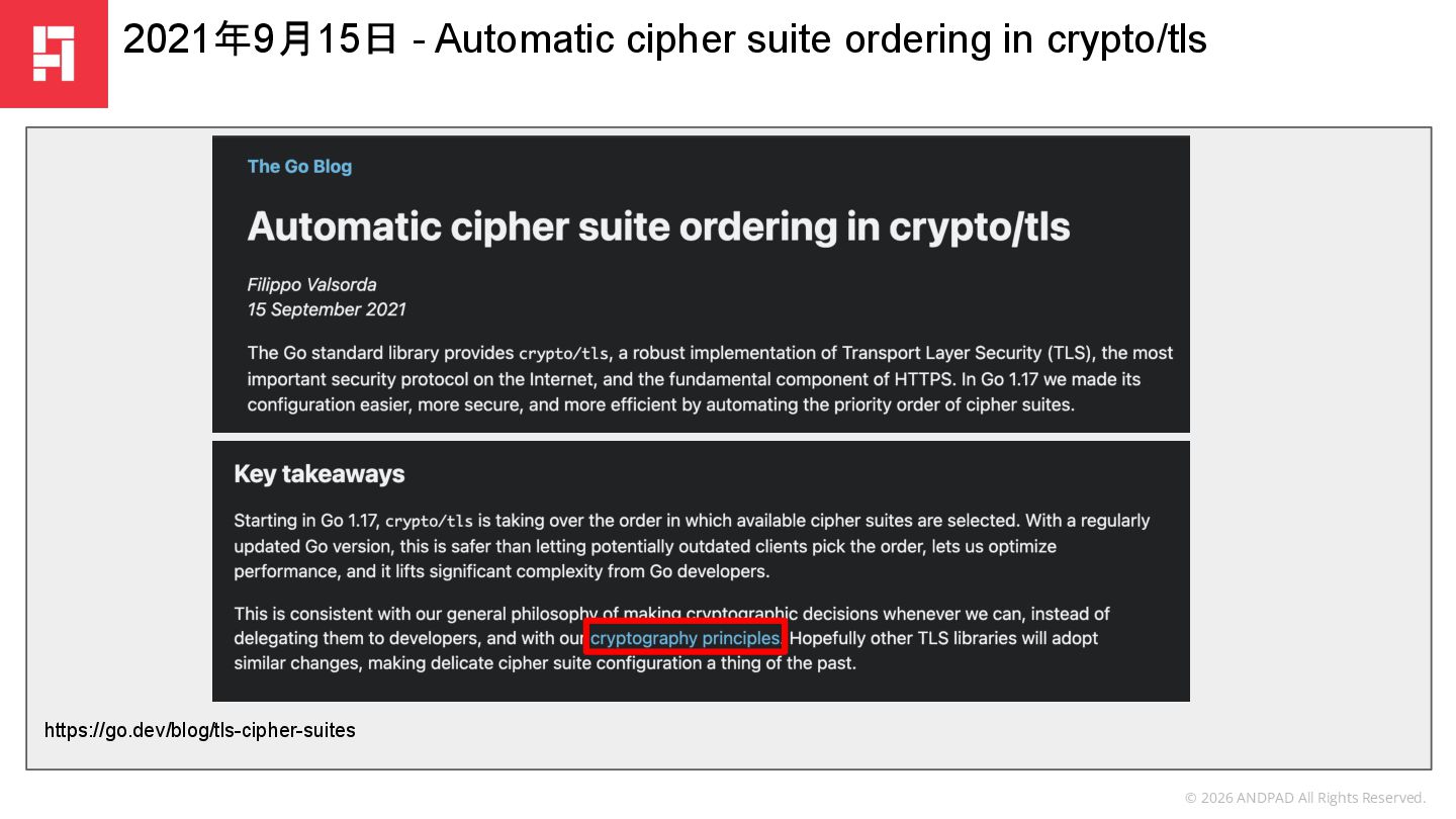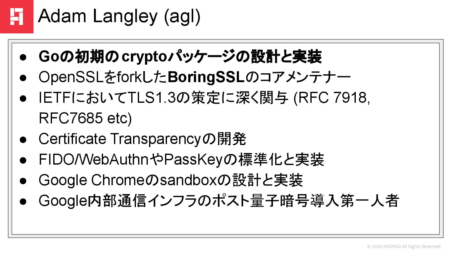 + AES (crypto/aes) + GCM (crypto/cipher) Go 1.26以前のRSAハイブリッド暗号 1: // ====== 受信者(Recipient) ====== 2: // 3-1. RSA暗号化済みワンタイム共通鍵の長さを読み取る 3: var keyLen uint32 4: err := binary.Read(reader, binary.LittleEndian, &keyLen) 5: 6: // 3-2. RSA暗号化済みワンタイム共通鍵を取り出す 7: encryptedSessionKey := make([]byte, keyLen) 8: _, err := io.ReadFull(reader, encryptedSessionKey) 9: 10: // 3-3. ワンタイム共通鍵を復号 11: info := []byte("Encryption Key Label to Login") 12: sessionKey, err := rsa.DecryptOAEP(sha256.New(), rand.Reader, privKey, encryptedSessionKey, info) 13: 14: // 3-4. Nonceを取り出す 15: gcmNonceSize := 12 16: nonce := make([]byte, gcmNonceSize) 17: _, err := io.ReadFull(reader, nonce) 18: 19: // 3-5. 残りのデータをAES暗号文として読み込む 20: cipherText, err := io.ReadAll(reader) 21: 22: // 3-6. AES-GCMで復号 23: aad := []byte("Additional Authenticated Data to Tom") 24: block, err := aes.NewCipher(sessionKey) 25: gcm, err := cipher.NewGCM(block) 26: plaintext, err := gcm.Open(nil, nonce, cipherText, aad) NG例: 共通鍵の復号とメッセージの復号時に異なるエラーで返却 こちらも攻撃者にRSA復号、AES復号どちらで失敗したか判別されてし まい、パディングオラクル攻撃のきっかけになる NG例: 暗号メッセージのサイズ検証不足 DoS攻撃により巨大な暗号メッセージを送りつけることでOOMを引き起 こしサービス停止が可能 NG例: 復号処理途中のエラーで Early Returnしてしまう エラーが返るまでのタイミングが異なると攻撃者にRSA復号のエラーか AES復号のエラーか判別する材料を与え、パディングオラクル攻撃の きっかけになる NG例: io.ReadFullではなくio.Readを利用してしまう io.Readは指定バイト数分を読み切る前に返ってしまう。