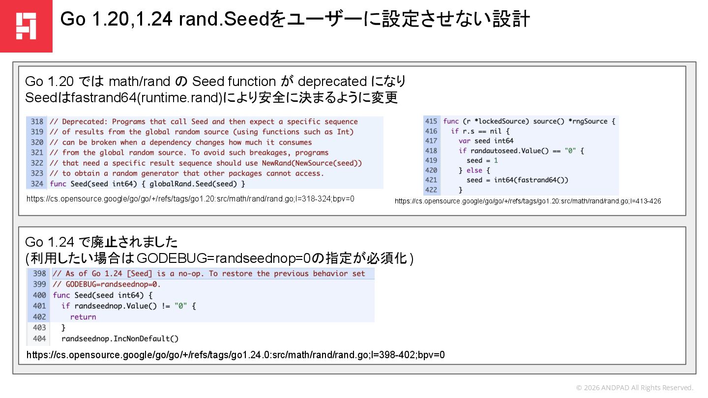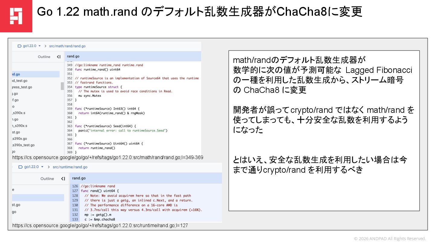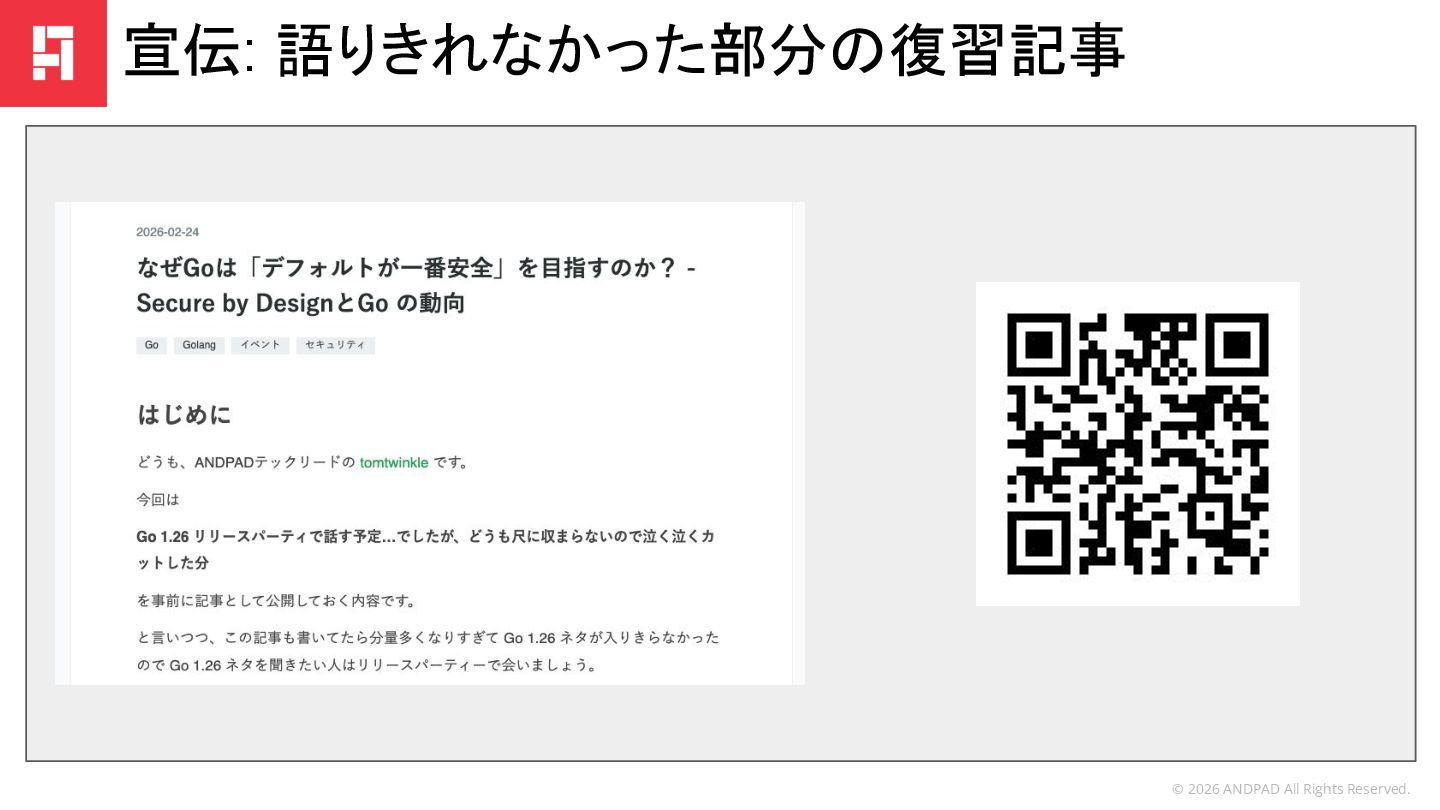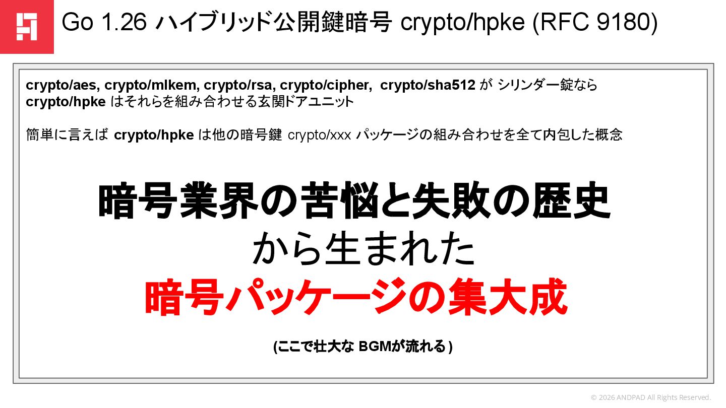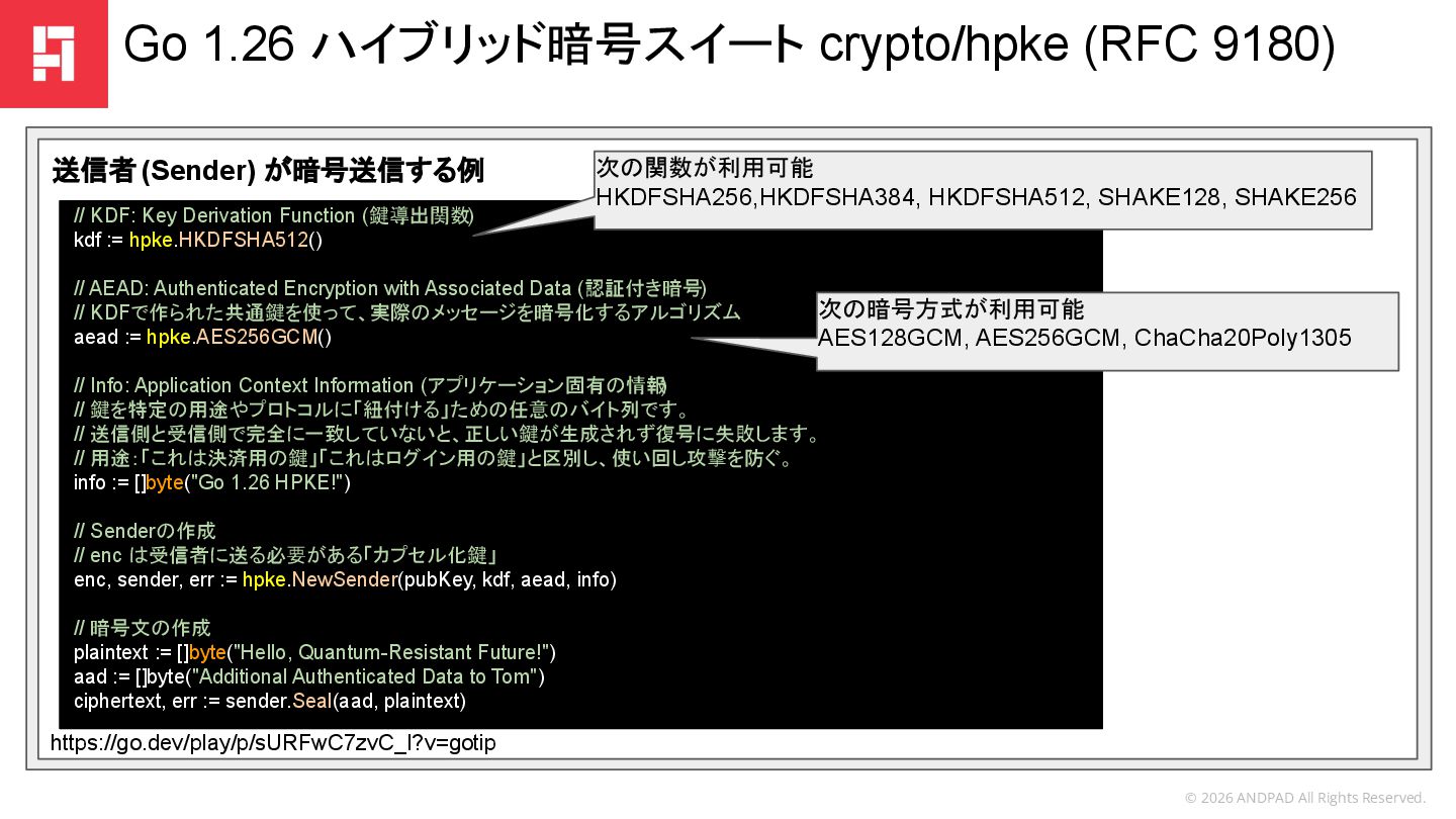 + AES (crypto/aes) + GCM (crypto/cipher) Go 1.26以前のRSAハイブリッド暗号 1: // ====== 受信者(Recipient) ====== 2: // 3-1. RSA暗号化済みワンタイム共通鍵の長さを読み取る 3: var keyLen uint32 4: err := binary.Read(reader, binary.LittleEndian, &keyLen) 5: 6: // 3-2. RSA暗号化済みワンタイム共通鍵を取り出す 7: encryptedSessionKey := make([]byte, keyLen) 8: _, err := io.ReadFull(reader, encryptedSessionKey) 9: 10: // 3-3. ワンタイム共通鍵を復号 11: info := []byte("Encryption Key Label to Login") 12: sessionKey, err := rsa.DecryptOAEP(sha256.New(), rand.Reader, privKey, encryptedSessionKey, info) 13: 14: // 3-4. Nonceを取り出す 15: gcmNonceSize := 12 16: nonce := make([]byte, gcmNonceSize) 17: _, err := io.ReadFull(reader, nonce) 18: 19: // 3-5. 残りのデータをAES暗号文として読み込む 20: cipherText, err := io.ReadAll(reader) 21: 22: // 3-6. AES-GCMで復号 23: aad := []byte("Additional Authenticated Data to Tom") 24: block, err := aes.NewCipher(sessionKey) 25: gcm, err := cipher.NewGCM(block) 26: plaintext, err := gcm.Open(nil, nonce, cipherText, aad) NG例: 共通鍵の復号とメッセージの復号時に異なるエラーで返却 こちらも攻撃者にRSA復号、AES復号どちらで失敗したか判別されてし まい、パディングオラクル攻撃のきっかけになる NG例: 暗号メッセージのサイズ検証不足 DoS攻撃により巨大な暗号メッセージを送りつけることでOOMを引き起 こしサービス停止が可能 NG例: 復号処理途中のエラーで Early Returnしてしまう エラーが返るまでのタイミングが異なると攻撃者にRSA復号のエラーか AES復号のエラーか判別する材料を与え、パディングオラクル攻撃の きっかけになる NG例: io.ReadFullではなくio.Readを利用してしまう io.Readは指定バイト数分を読み切る前に返ってしまう。