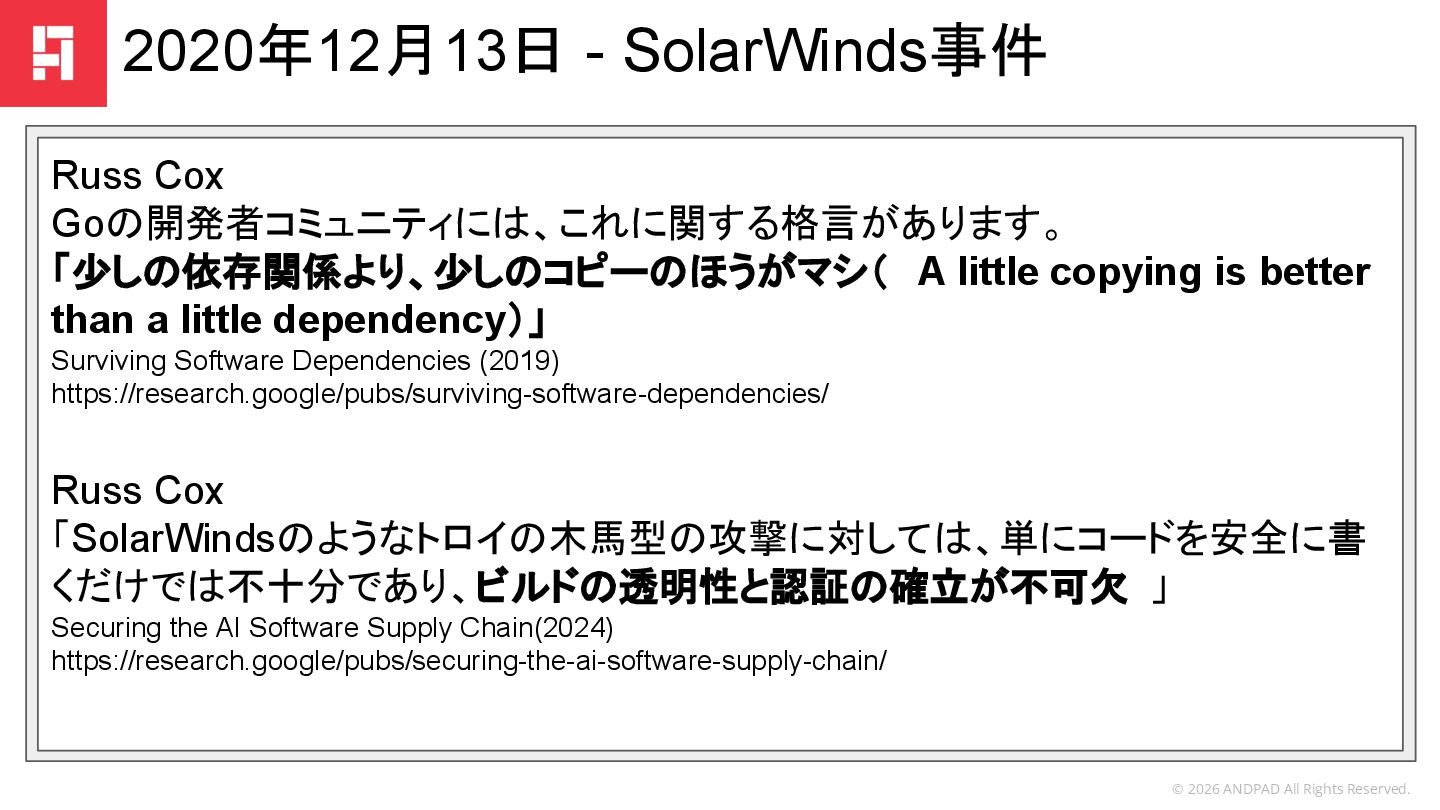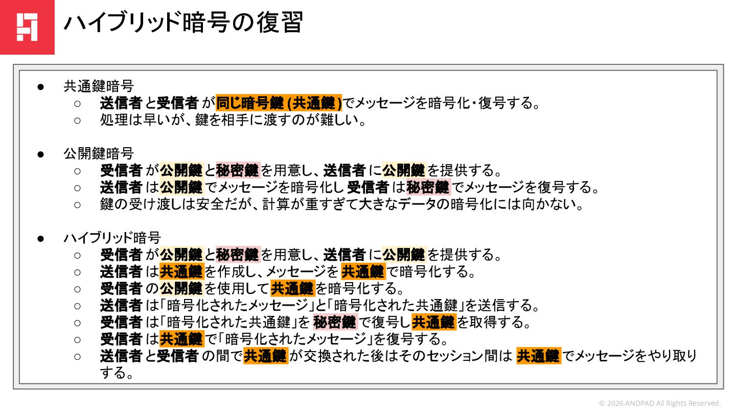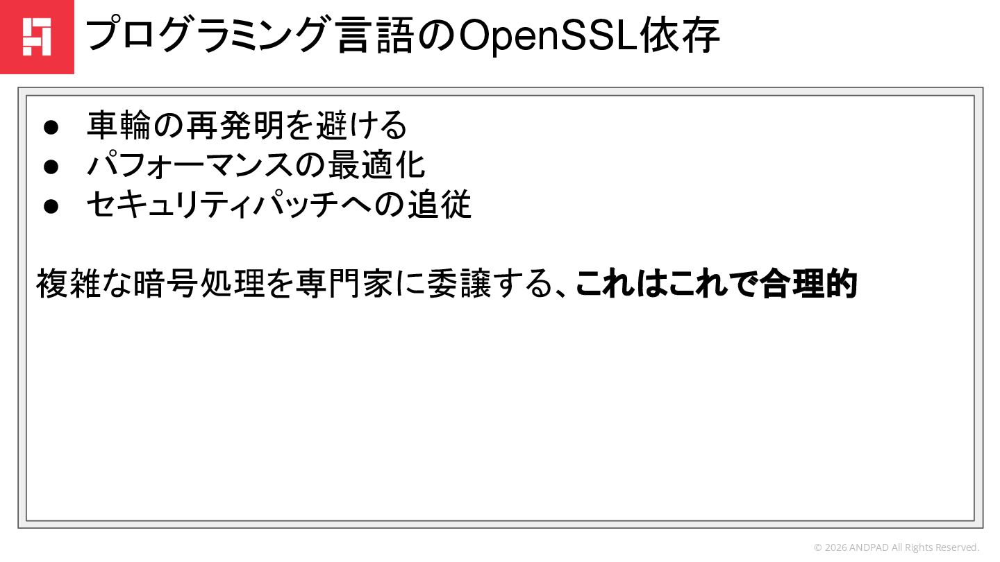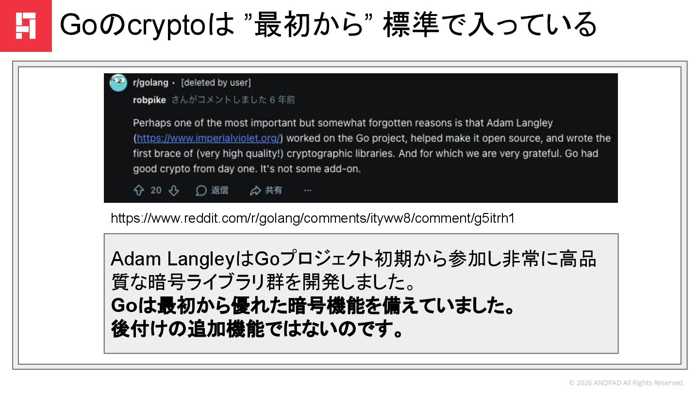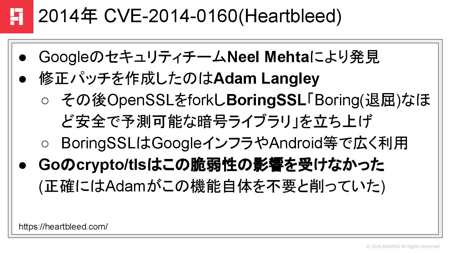 + AES (crypto/aes) + GCM (crypto/cipher) Go 1.26以前のRSAハイブリッド暗号 1: // ====== 受信者(Recipient) ====== 2: // 3-1. RSA暗号化済みワンタイム共通鍵の長さを読み取る 3: var keyLen uint32 4: err := binary.Read(reader, binary.LittleEndian, &keyLen) 5: 6: // 3-2. RSA暗号化済みワンタイム共通鍵を取り出す 7: encryptedSessionKey := make([]byte, keyLen) 8: _, err := io.ReadFull(reader, encryptedSessionKey) 9: 10: // 3-3. ワンタイム共通鍵を復号 11: info := []byte("Encryption Key Label to Login") 12: sessionKey, err := rsa.DecryptOAEP(sha256.New(), rand.Reader, privKey, encryptedSessionKey, info) 13: 14: // 3-4. Nonceを取り出す 15: gcmNonceSize := 12 16: nonce := make([]byte, gcmNonceSize) 17: _, err := io.ReadFull(reader, nonce) 18: 19: // 3-5. 残りのデータをAES暗号文として読み込む 20: cipherText, err := io.ReadAll(reader) 21: 22: // 3-6. AES-GCMで復号 23: aad := []byte("Additional Authenticated Data to Tom") 24: block, err := aes.NewCipher(sessionKey) 25: gcm, err := cipher.NewGCM(block) 26: plaintext, err := gcm.Open(nil, nonce, cipherText, aad) NG例: 共通鍵の復号とメッセージの復号時に異なるエラーで返却 こちらも攻撃者にRSA復号、AES復号どちらで失敗したか判別されてし まい、パディングオラクル攻撃のきっかけになる NG例: 暗号メッセージのサイズ検証不足 DoS攻撃により巨大な暗号メッセージを送りつけることでOOMを引き起 こしサービス停止が可能 NG例: 復号処理途中のエラーで Early Returnしてしまう エラーが返るまでのタイミングが異なると攻撃者にRSA復号のエラーか AES復号のエラーか判別する材料を与え、パディングオラクル攻撃の きっかけになる NG例: io.ReadFullではなくio.Readを利用してしまう io.Readは指定バイト数分を読み切る前に返ってしまう。