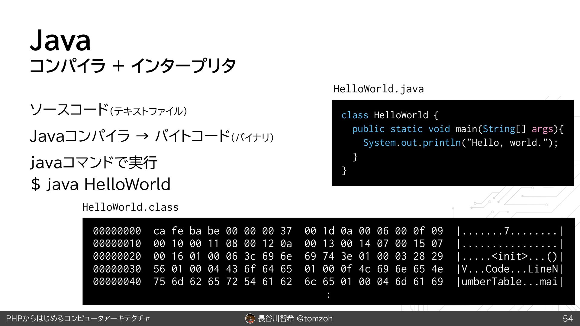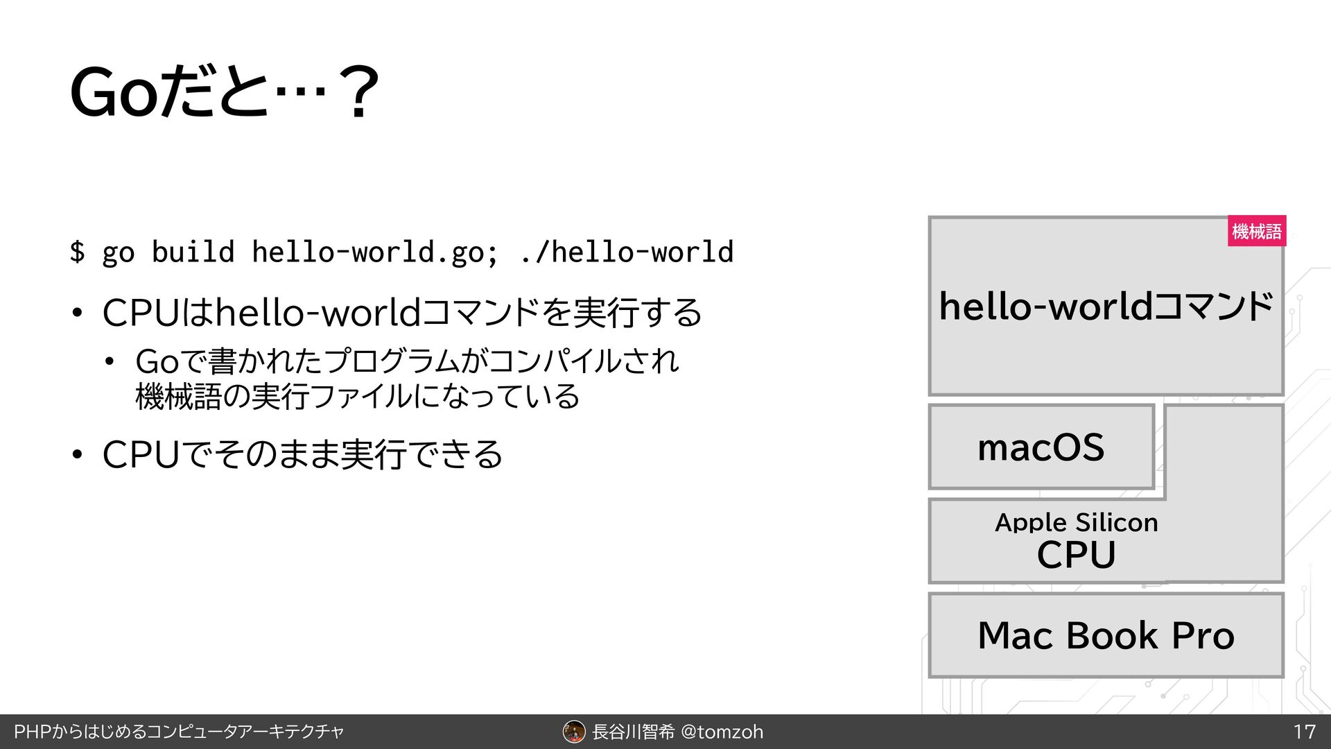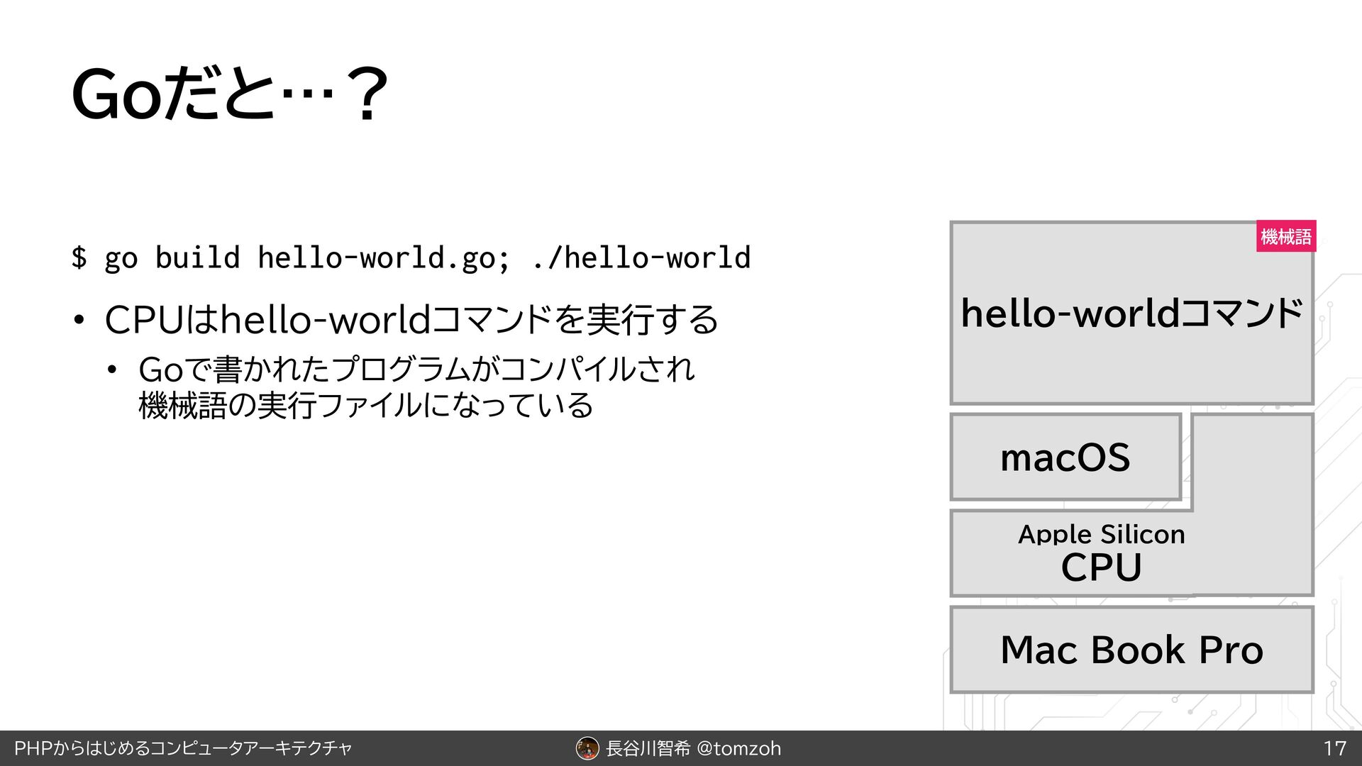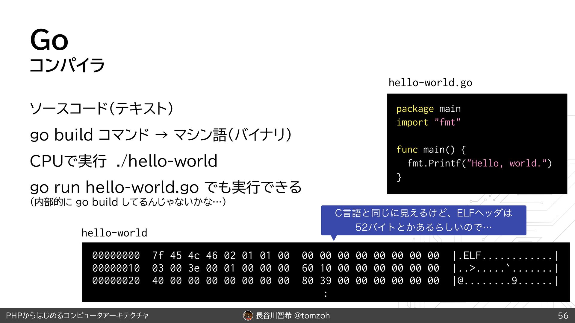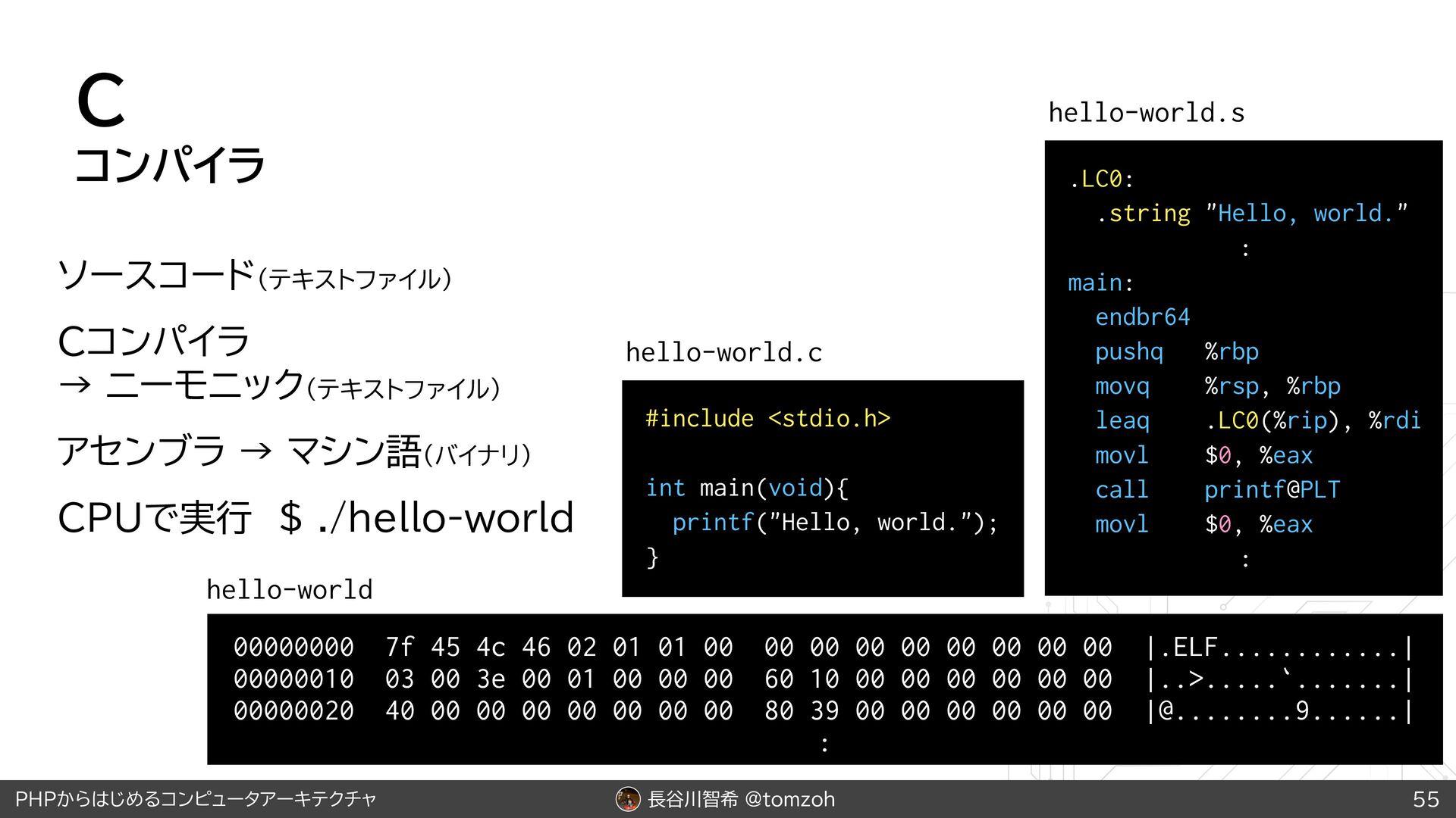 → マシン語(バイナリ) CPUで実行 $ ./hello-world 55 #include <stdio.h> int main(void){ printf("Hello, world."); } hello-world.c .LC0: .string "Hello, world." : main: endbr64 pushq %rbp movq %rsp, %rbp leaq .LC0(%rip), %rdi movl $0, %eax call printf@PLT movl $0, %eax : hello-world.s 00000000 7f 45 4c 46 02 01 01 00 00 00 00 00 00 00 00 00 |.ELF............| 00000010 03 00 3e 00 01 00 00 00 60 10 00 00 00 00 00 00 |..>.....`.......| 00000020 40 00 00 00 00 00 00 00 80 39 00 00 00 00 00 00 |@........9......| : hello-world