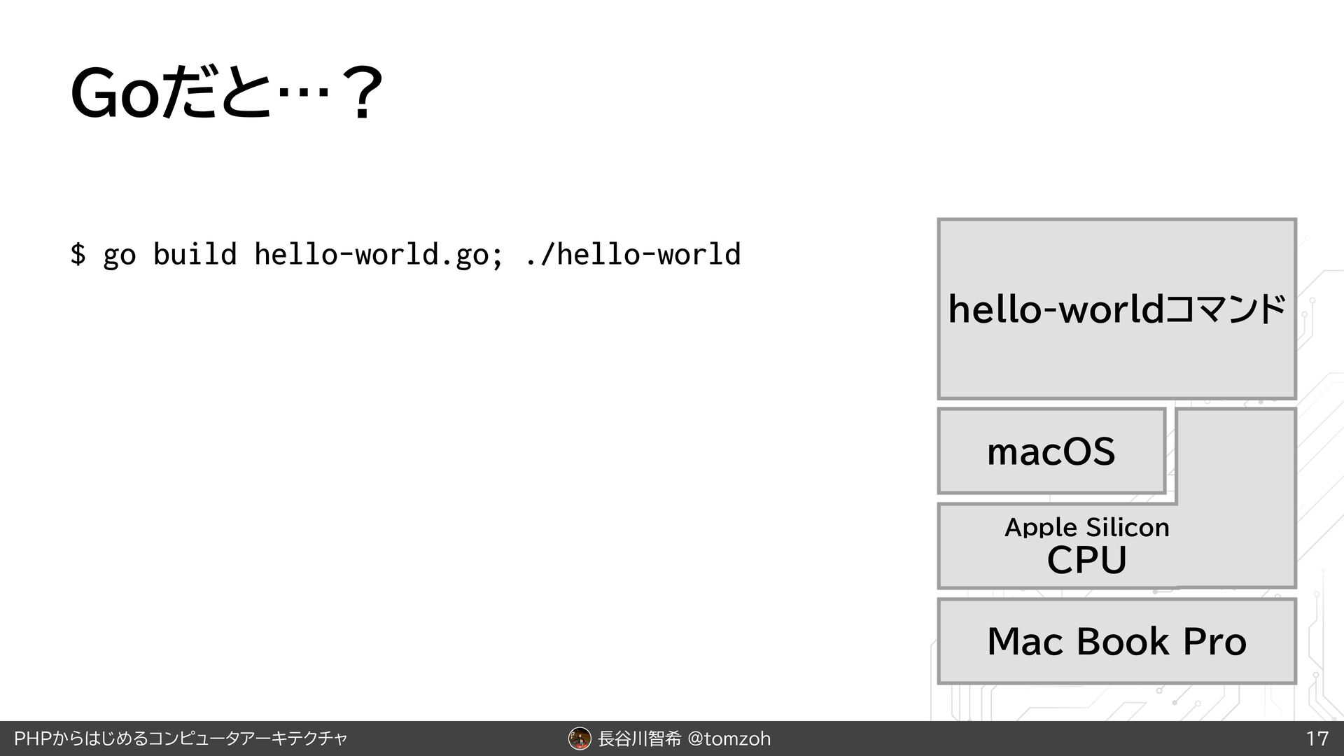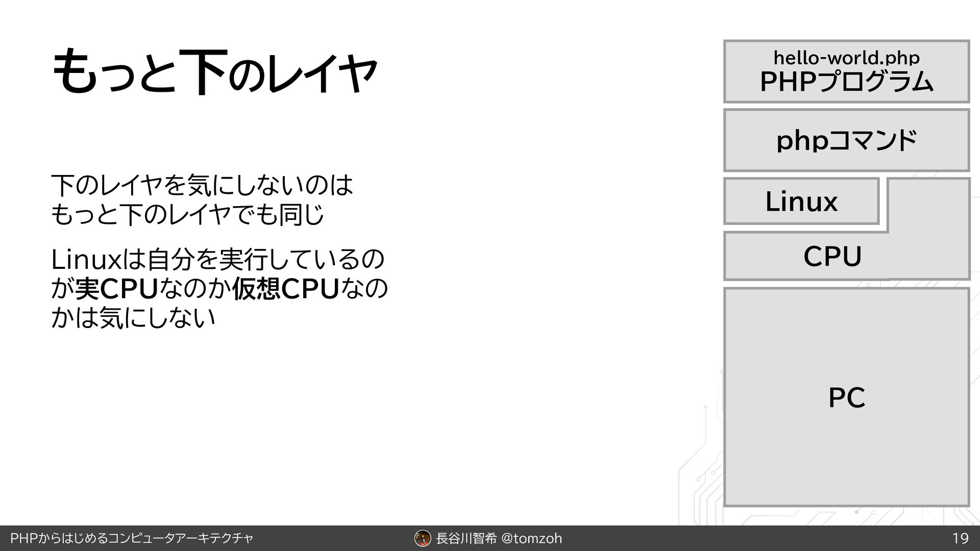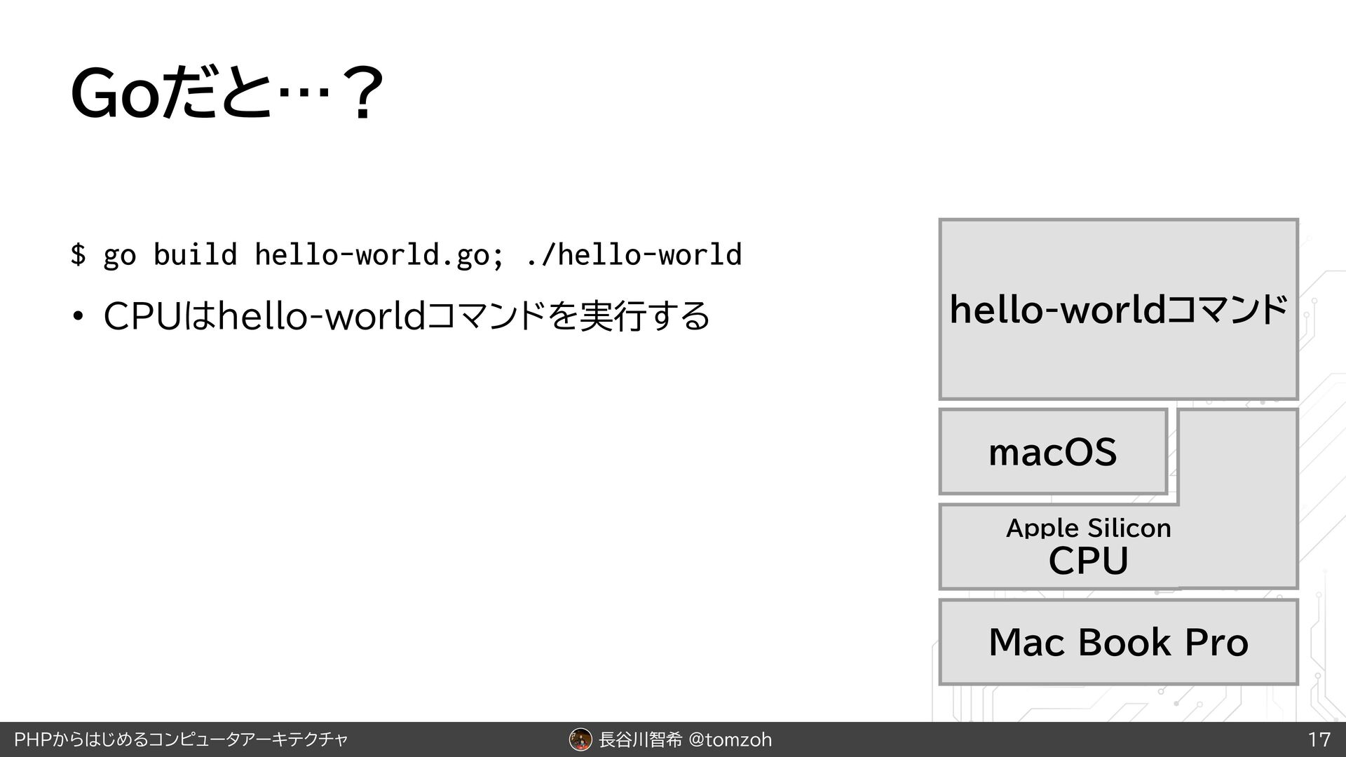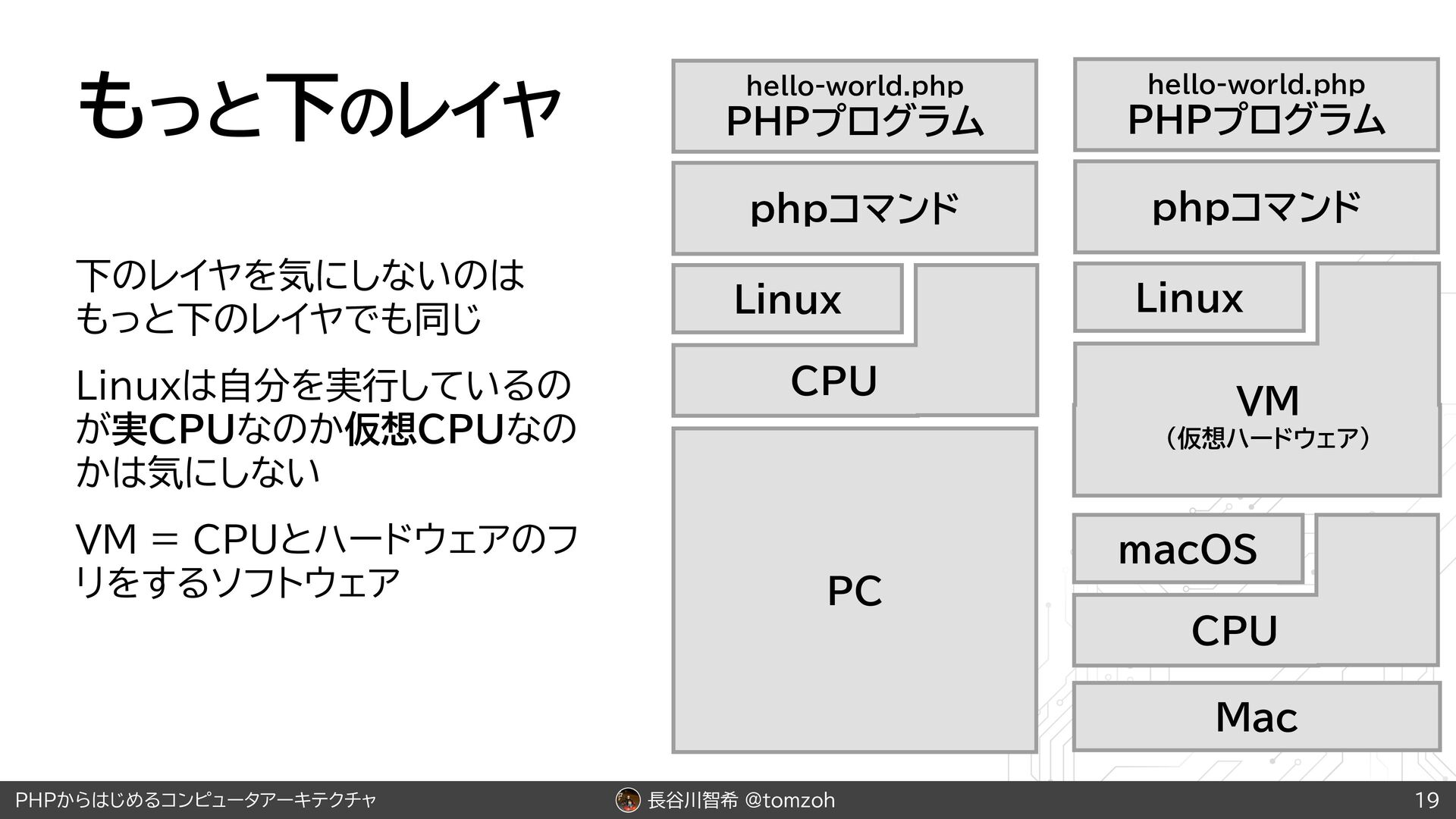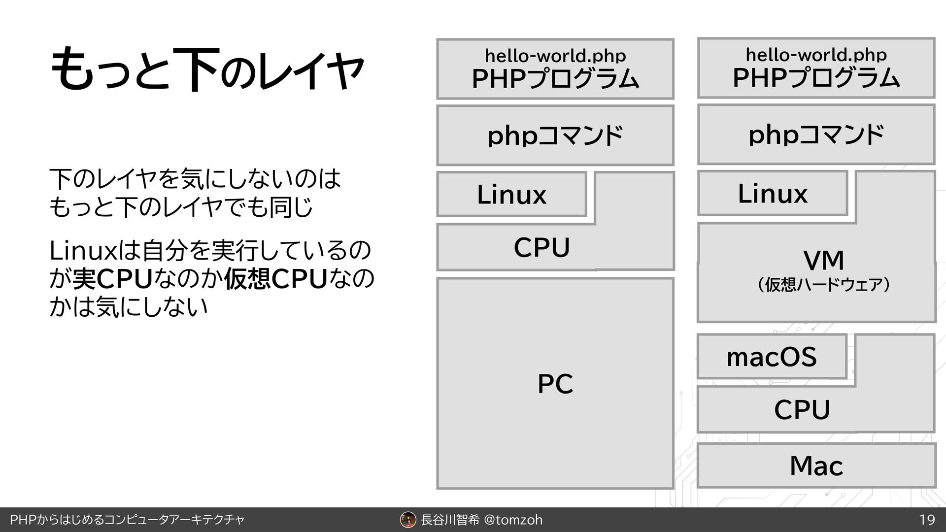 → マシン語(バイナリ) CPUで実行 $ ./hello-world 55 #include <stdio.h> int main(void){ printf("Hello, world."); } hello-world.c .LC0: .string "Hello, world." : main: endbr64 pushq %rbp movq %rsp, %rbp leaq .LC0(%rip), %rdi movl $0, %eax call printf@PLT movl $0, %eax : hello-world.s 00000000 7f 45 4c 46 02 01 01 00 00 00 00 00 00 00 00 00 |.ELF............| 00000010 03 00 3e 00 01 00 00 00 60 10 00 00 00 00 00 00 |..>.....`.......| 00000020 40 00 00 00 00 00 00 00 80 39 00 00 00 00 00 00 |@........9......| : hello-world
