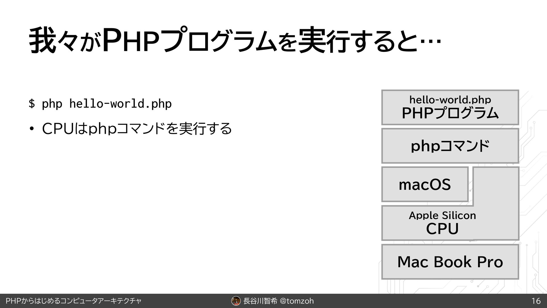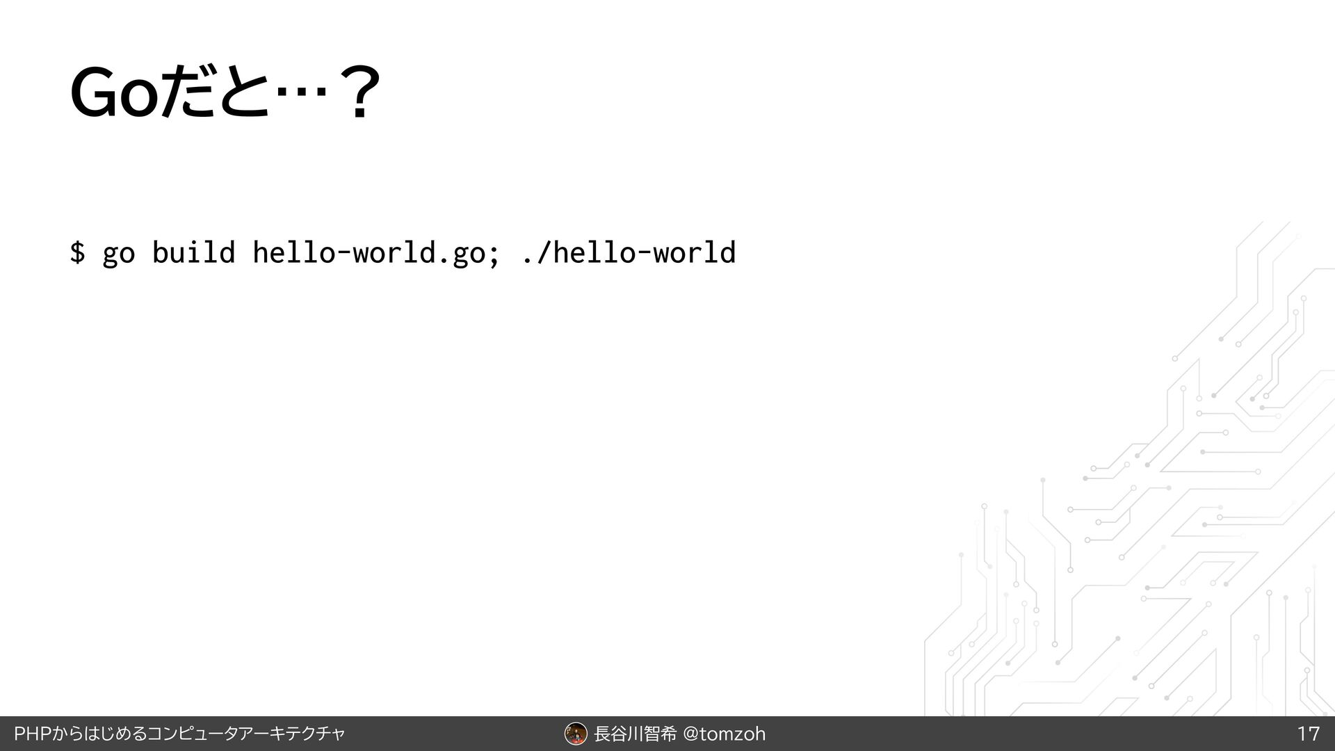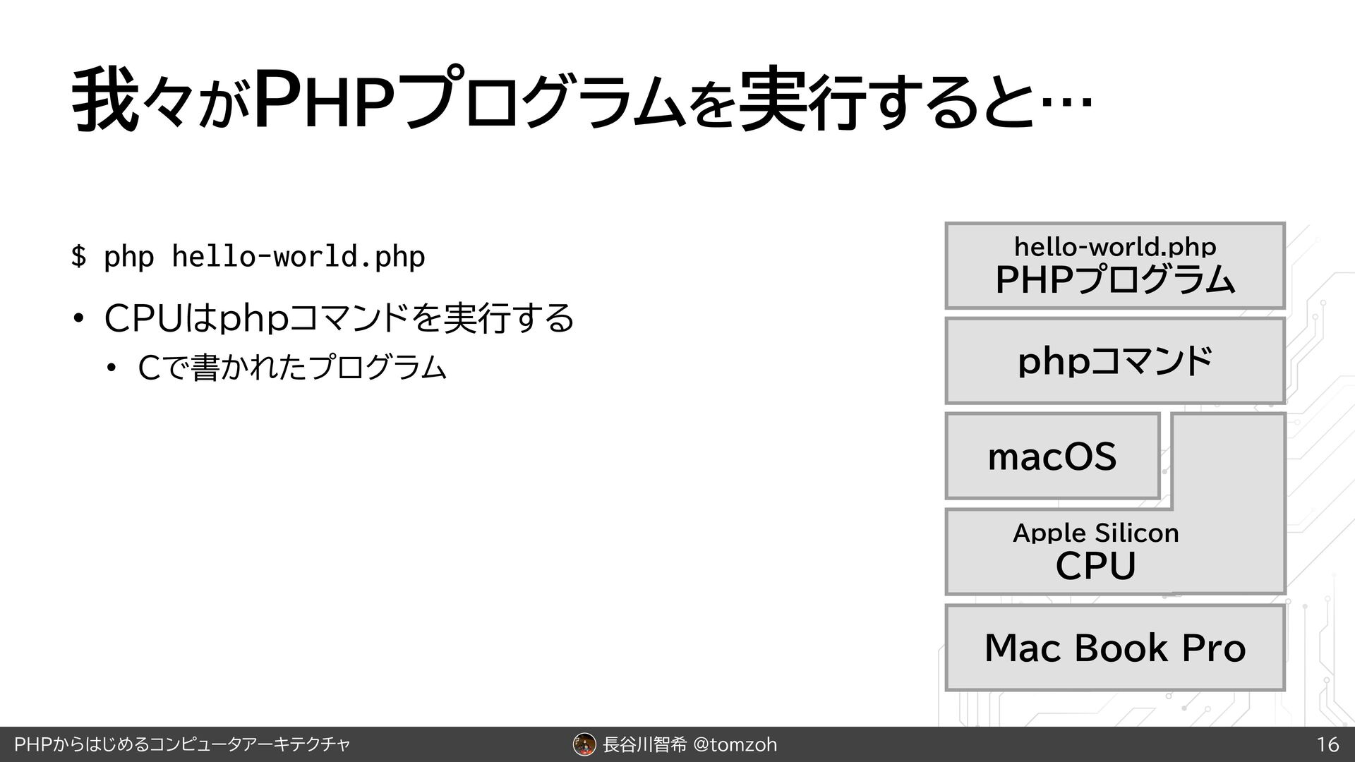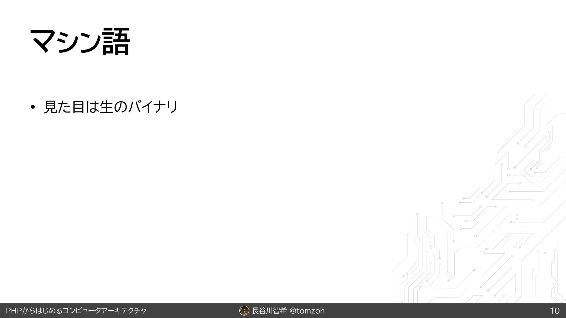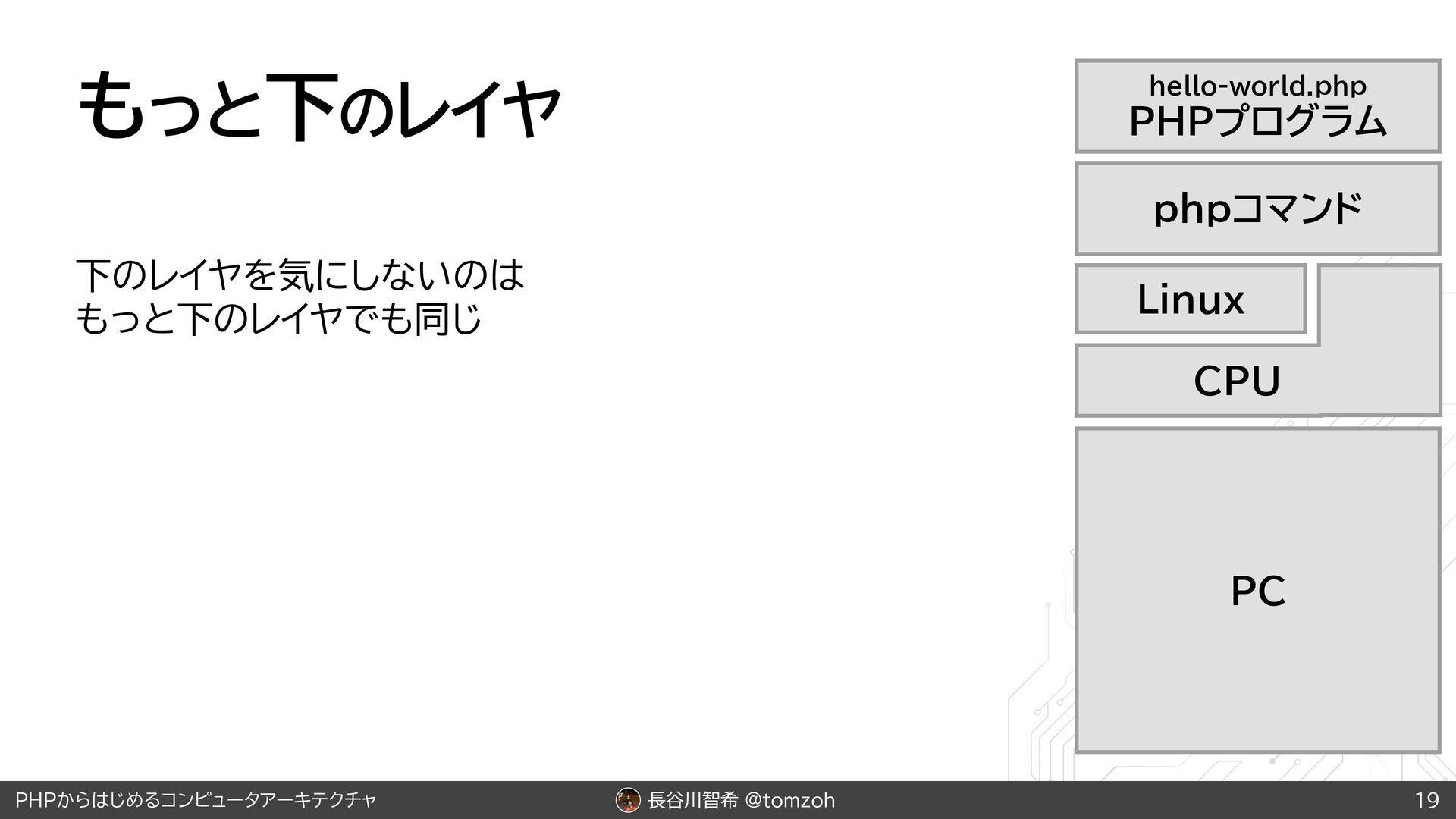 → マシン語(バイナリ) CPUで実行 $ ./hello-world 55 #include <stdio.h> int main(void){ printf("Hello, world."); } hello-world.c .LC0: .string "Hello, world." : main: endbr64 pushq %rbp movq %rsp, %rbp leaq .LC0(%rip), %rdi movl $0, %eax call printf@PLT movl $0, %eax : hello-world.s 00000000 7f 45 4c 46 02 01 01 00 00 00 00 00 00 00 00 00 |.ELF............| 00000010 03 00 3e 00 01 00 00 00 60 10 00 00 00 00 00 00 |..>.....`.......| 00000020 40 00 00 00 00 00 00 00 80 39 00 00 00 00 00 00 |@........9......| : hello-world