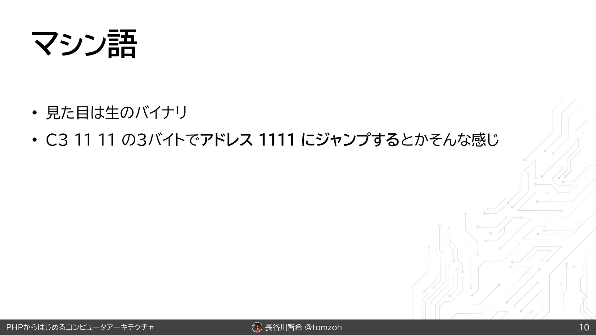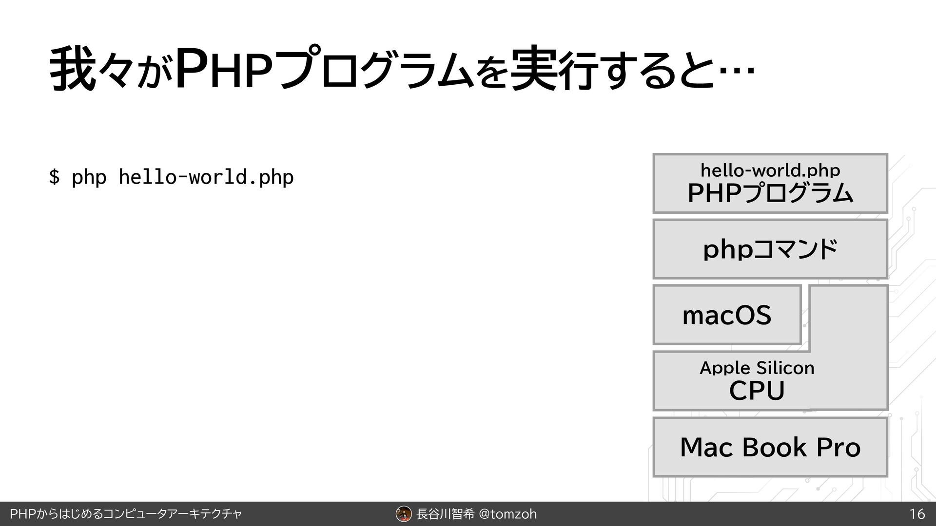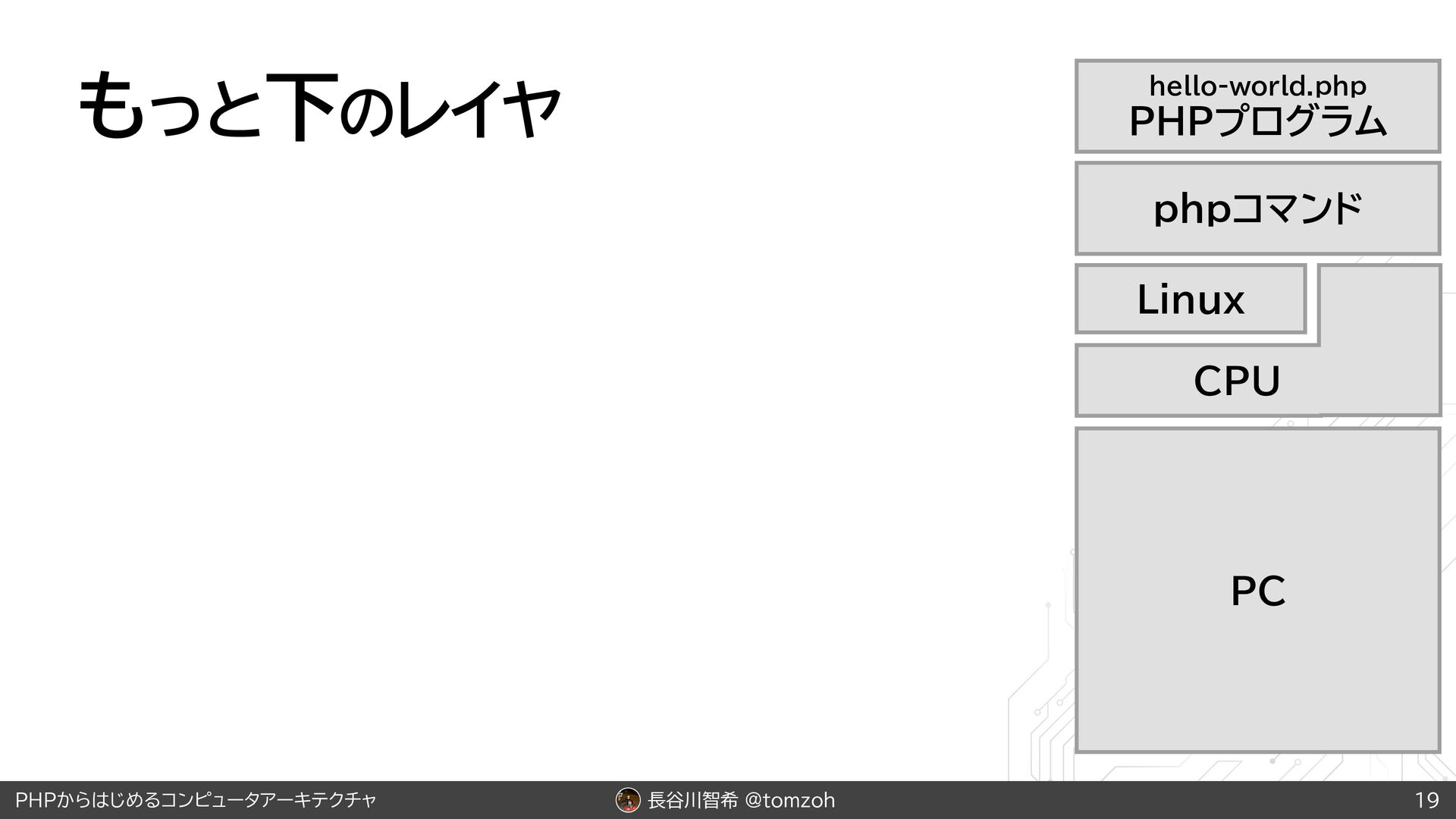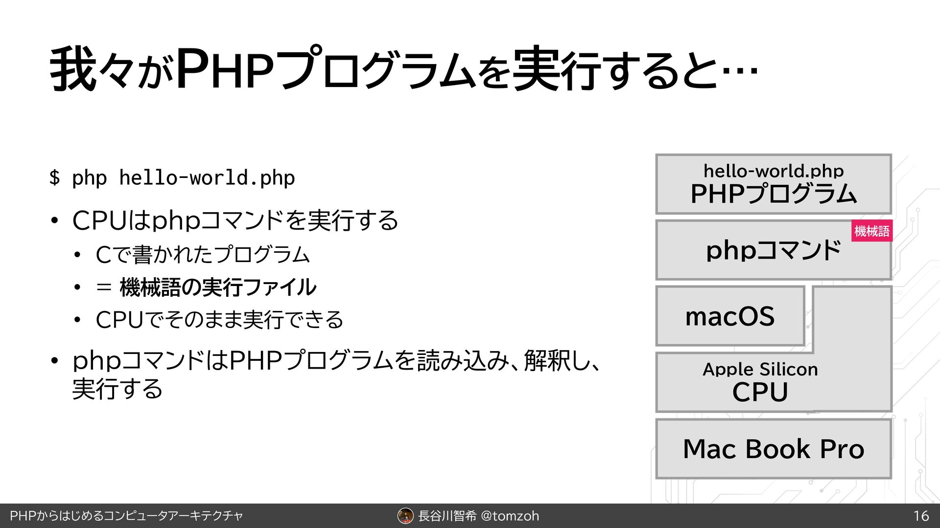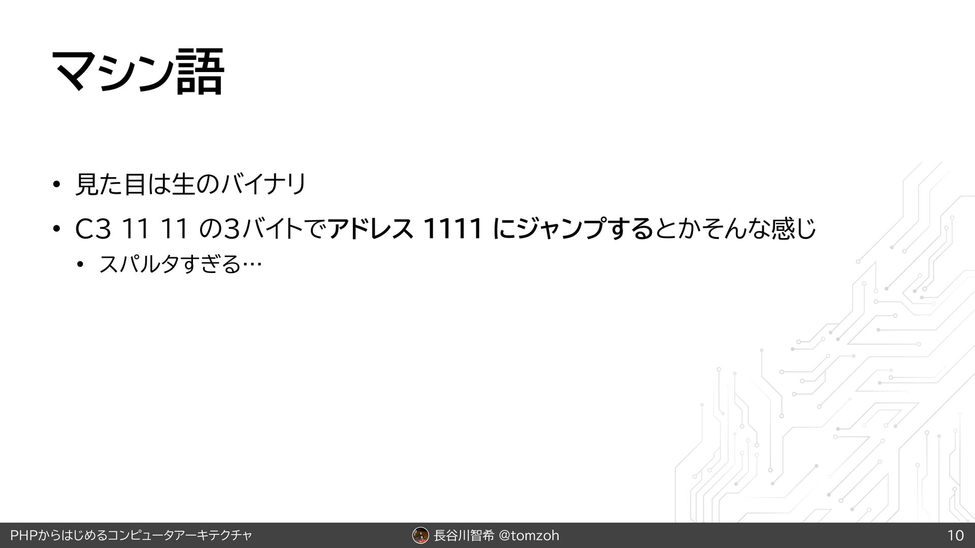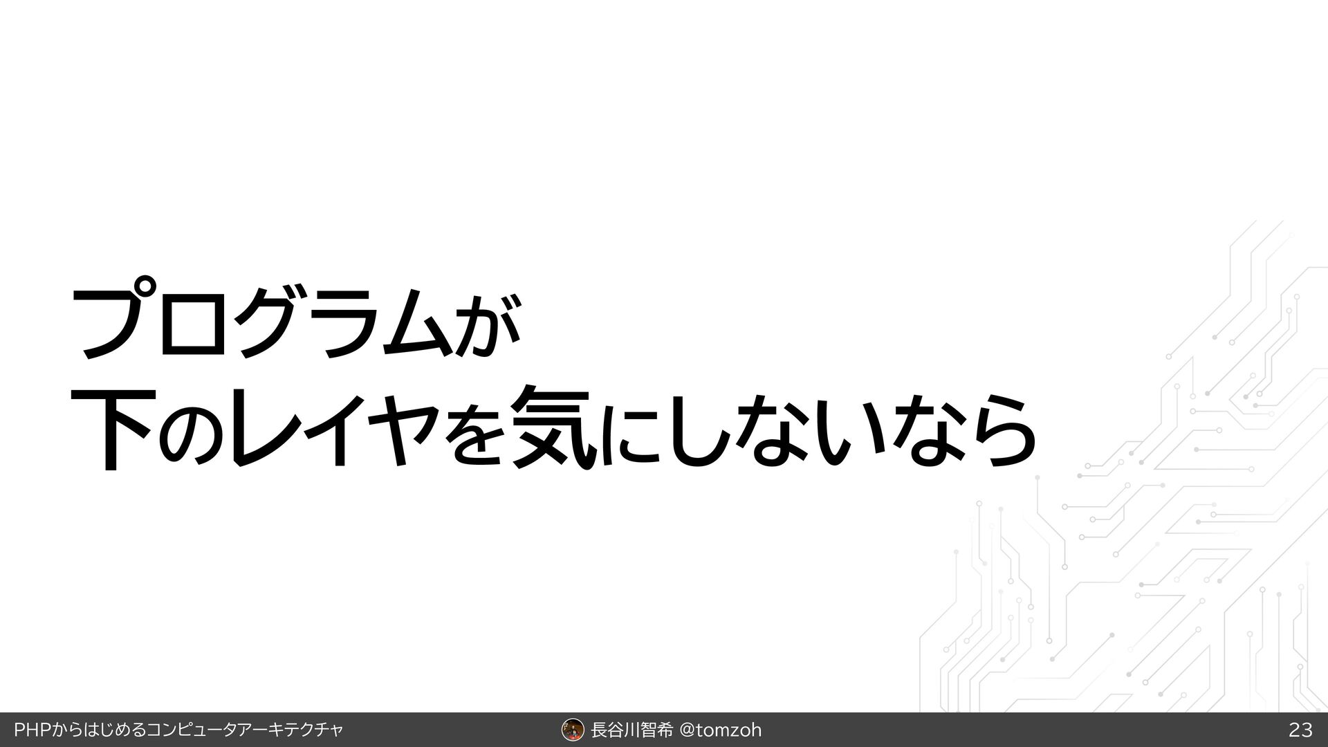 → マシン語(バイナリ) CPUで実行 $ ./hello-world 55 #include <stdio.h> int main(void){ printf("Hello, world."); } hello-world.c .LC0: .string "Hello, world." : main: endbr64 pushq %rbp movq %rsp, %rbp leaq .LC0(%rip), %rdi movl $0, %eax call printf@PLT movl $0, %eax : hello-world.s 00000000 7f 45 4c 46 02 01 01 00 00 00 00 00 00 00 00 00 |.ELF............| 00000010 03 00 3e 00 01 00 00 00 60 10 00 00 00 00 00 00 |..>.....`.......| 00000020 40 00 00 00 00 00 00 00 80 39 00 00 00 00 00 00 |@........9......| : hello-world
