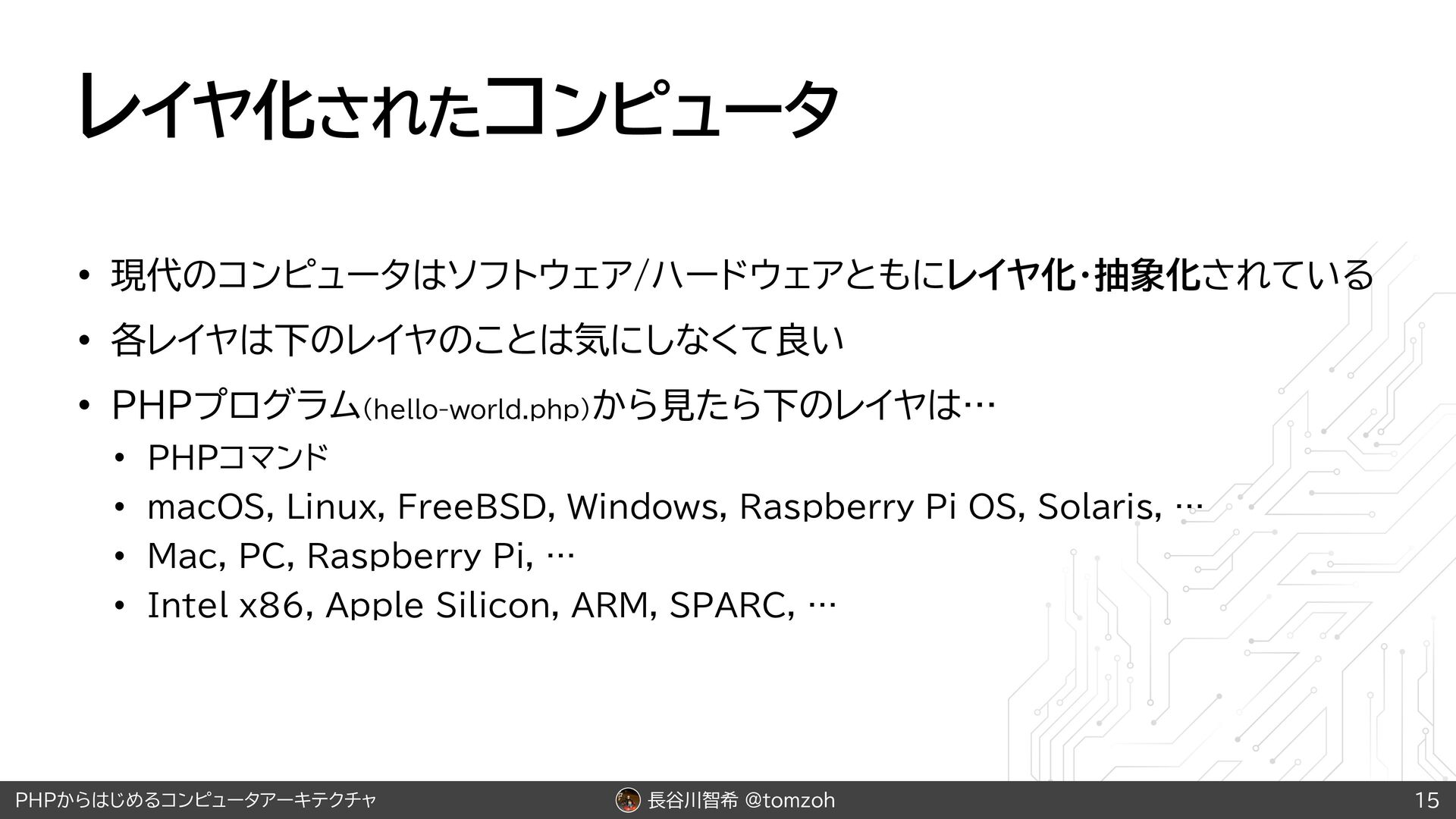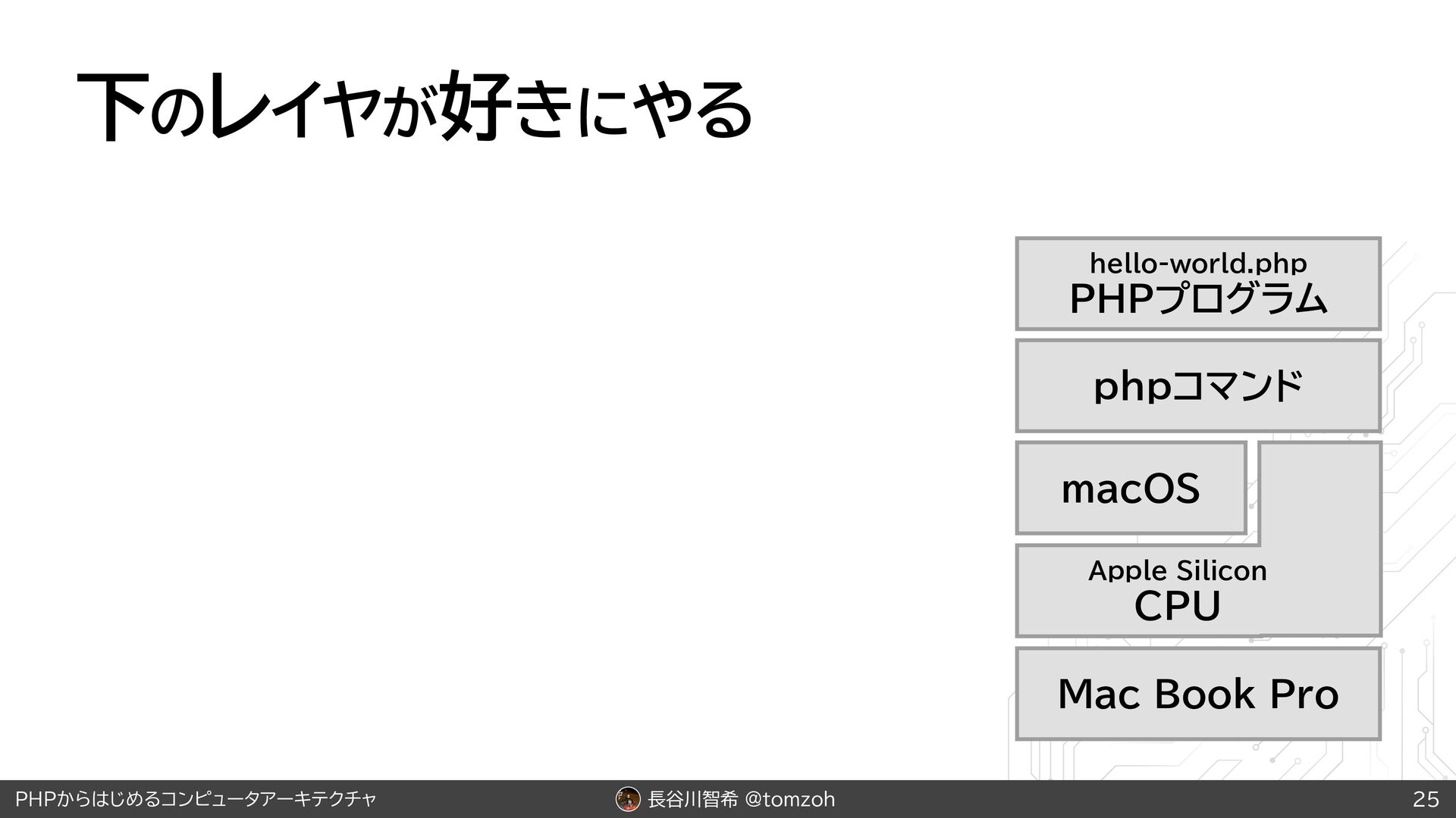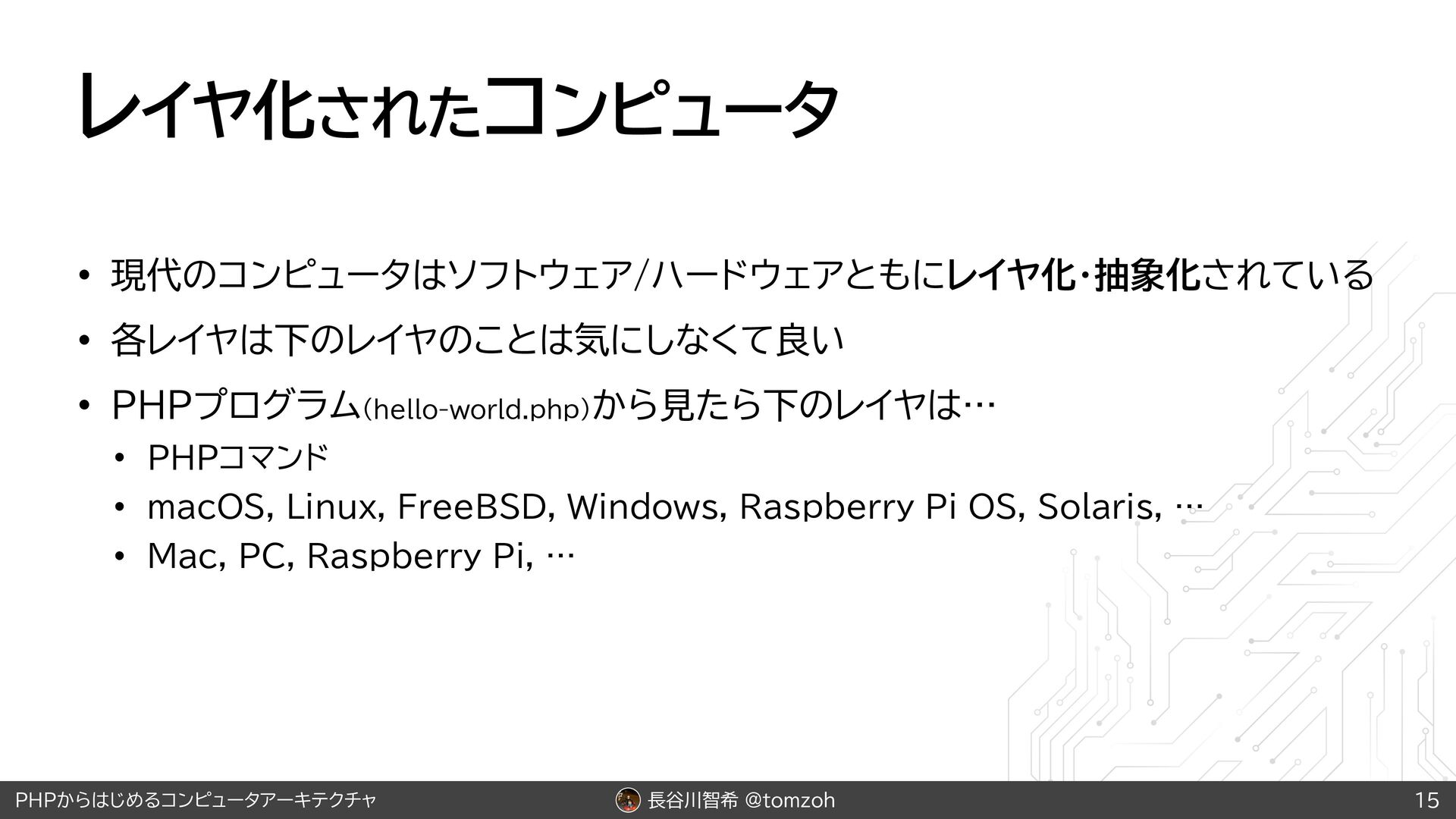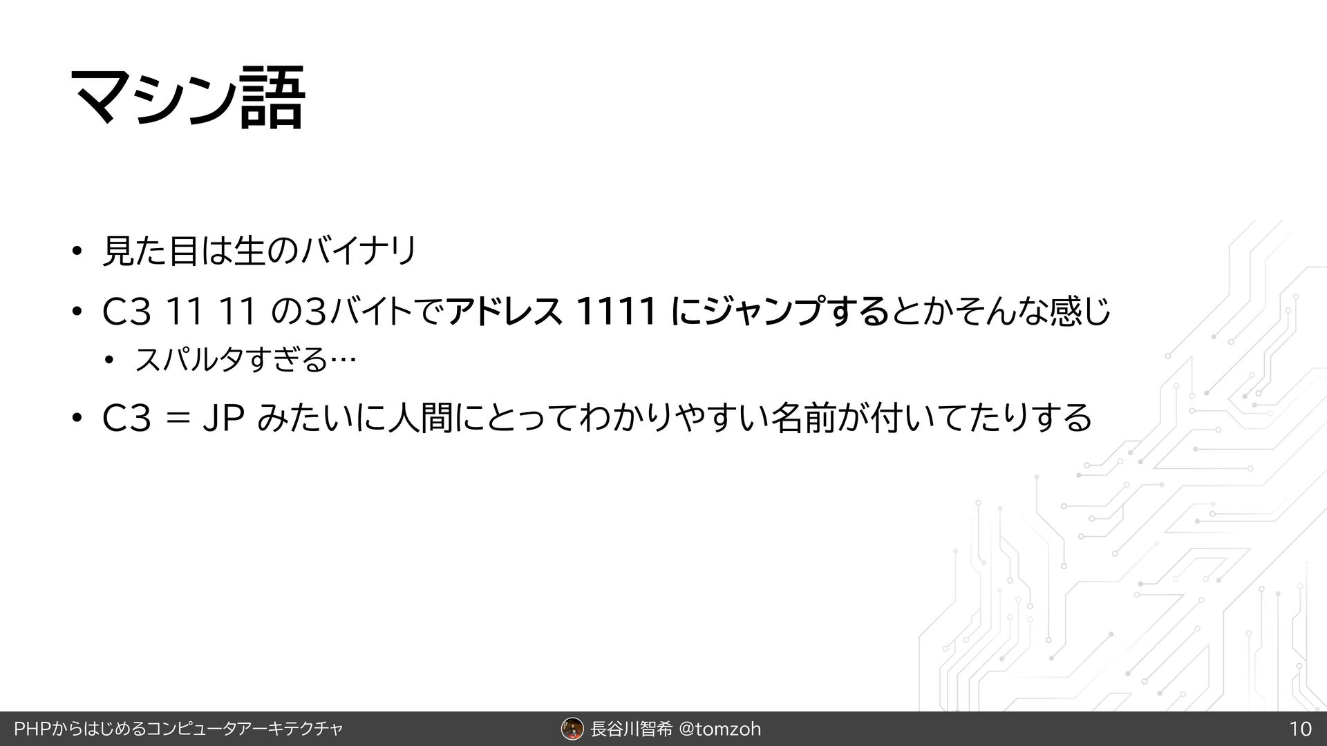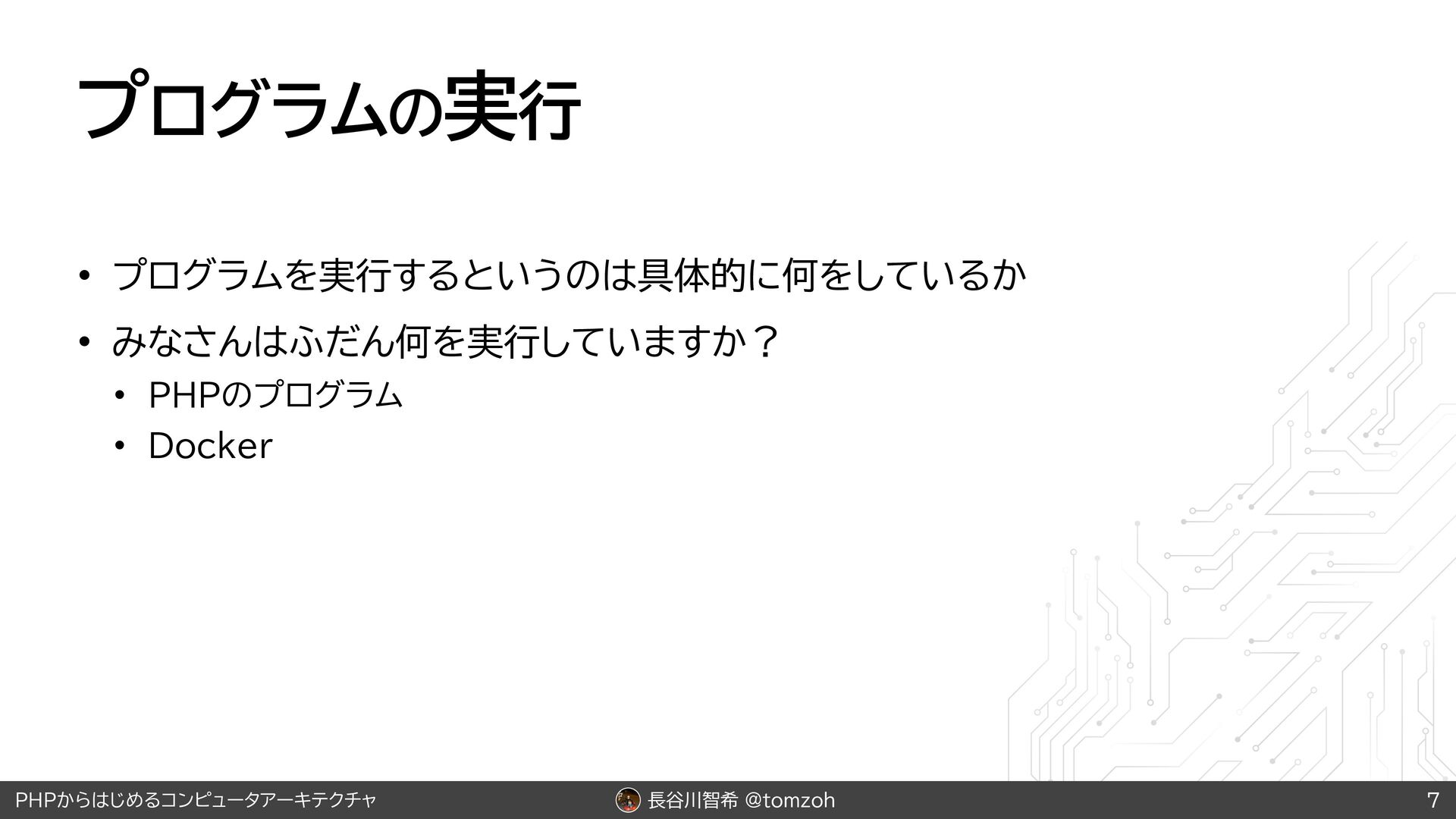 → マシン語(バイナリ) CPUで実行 $ ./hello-world 55 #include <stdio.h> int main(void){ printf("Hello, world."); } hello-world.c .LC0: .string "Hello, world." : main: endbr64 pushq %rbp movq %rsp, %rbp leaq .LC0(%rip), %rdi movl $0, %eax call printf@PLT movl $0, %eax : hello-world.s 00000000 7f 45 4c 46 02 01 01 00 00 00 00 00 00 00 00 00 |.ELF............| 00000010 03 00 3e 00 01 00 00 00 60 10 00 00 00 00 00 00 |..>.....`.......| 00000020 40 00 00 00 00 00 00 00 80 39 00 00 00 00 00 00 |@........9......| : hello-world