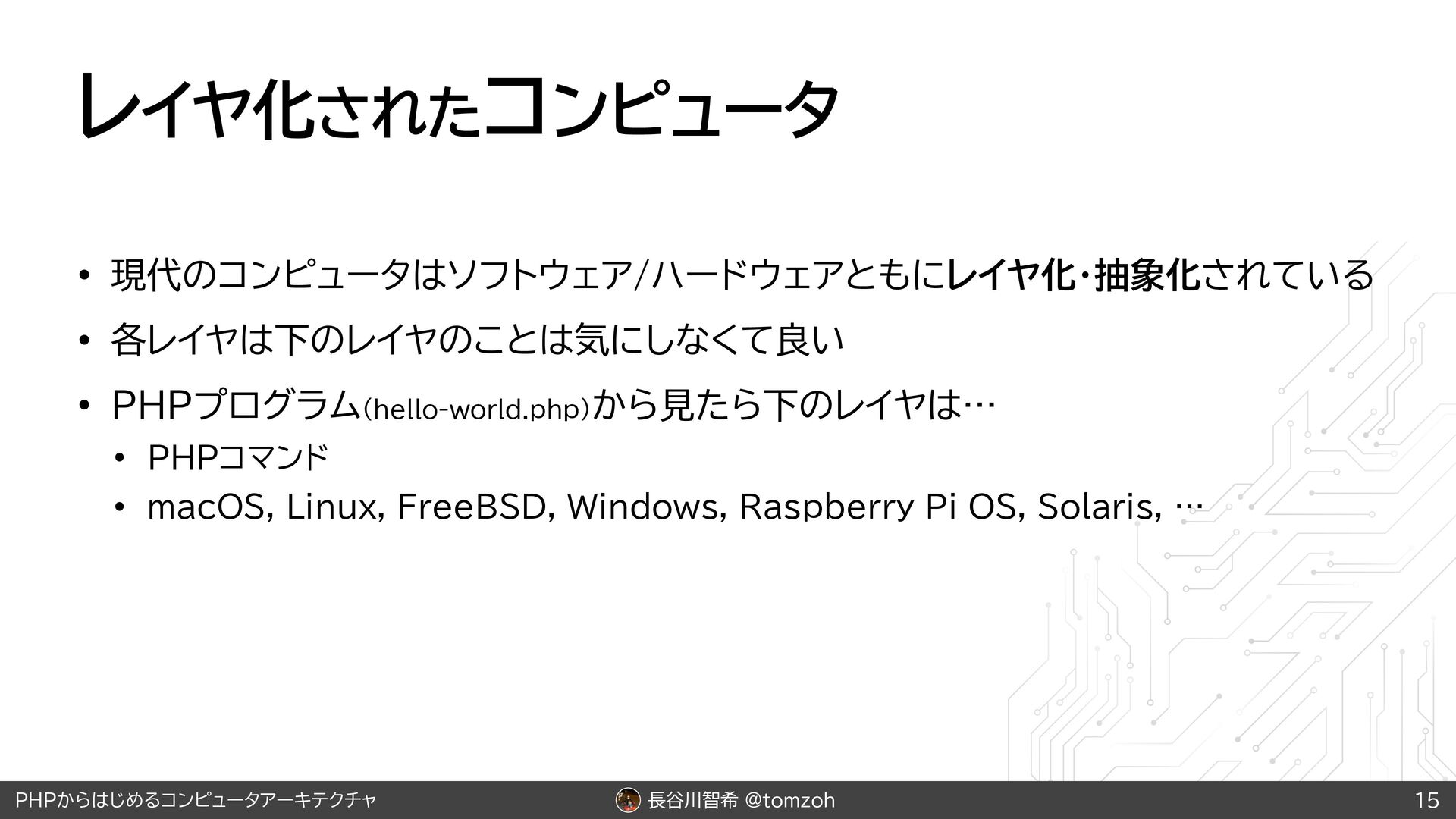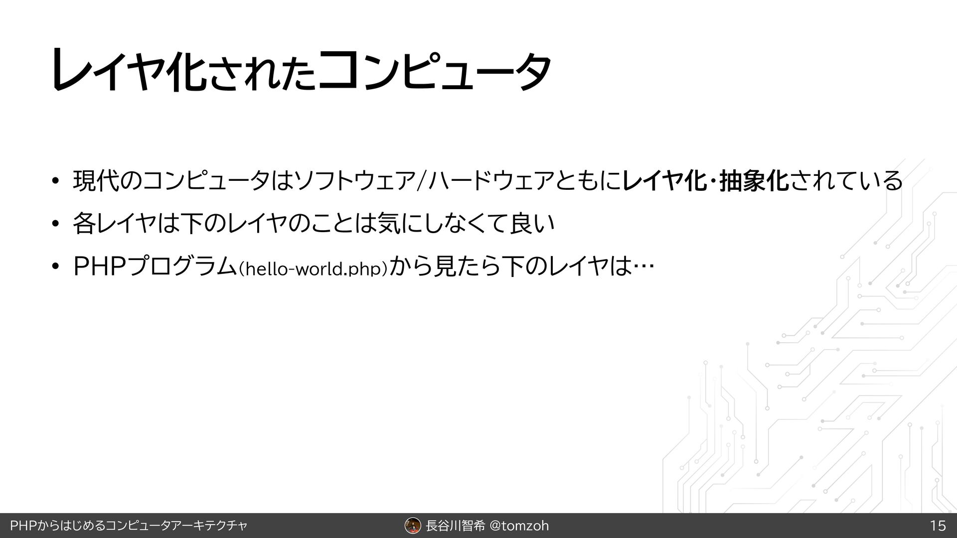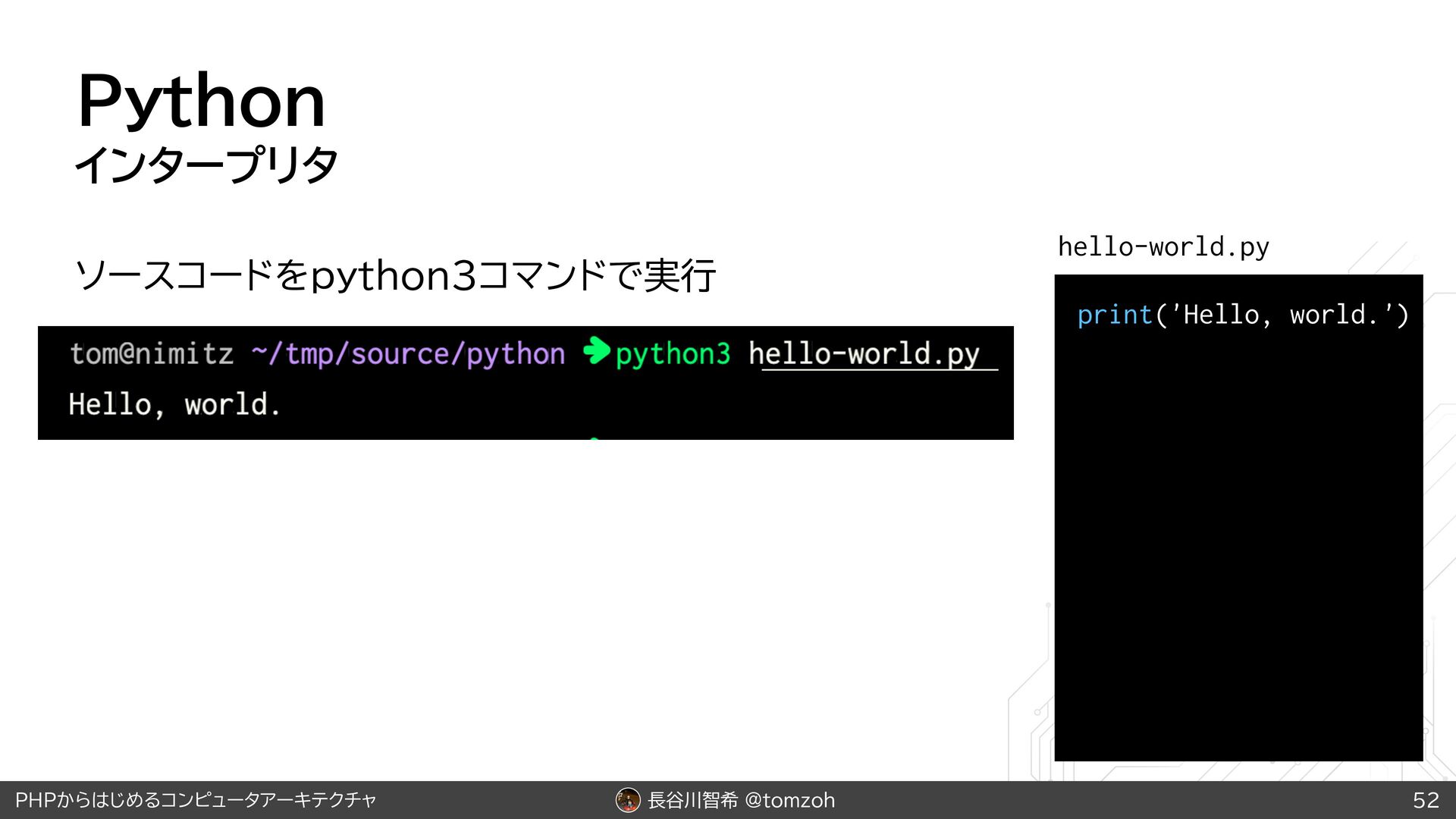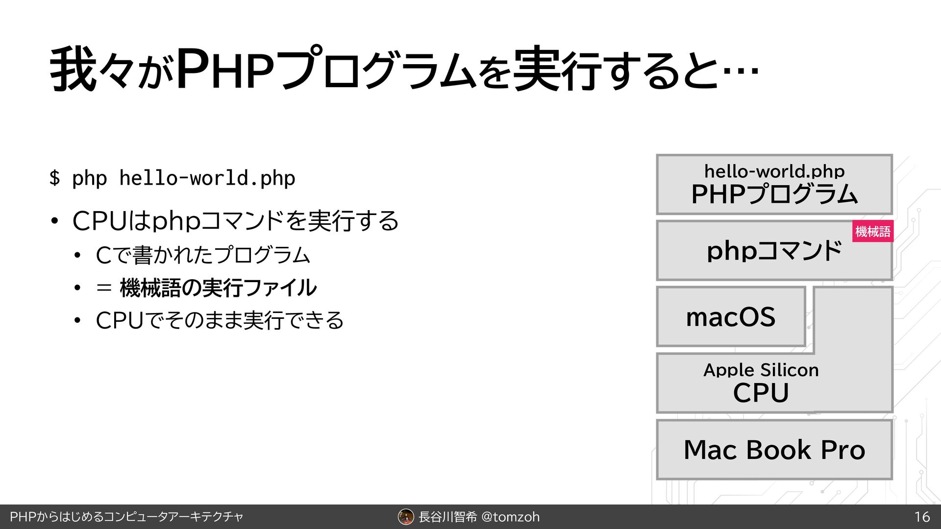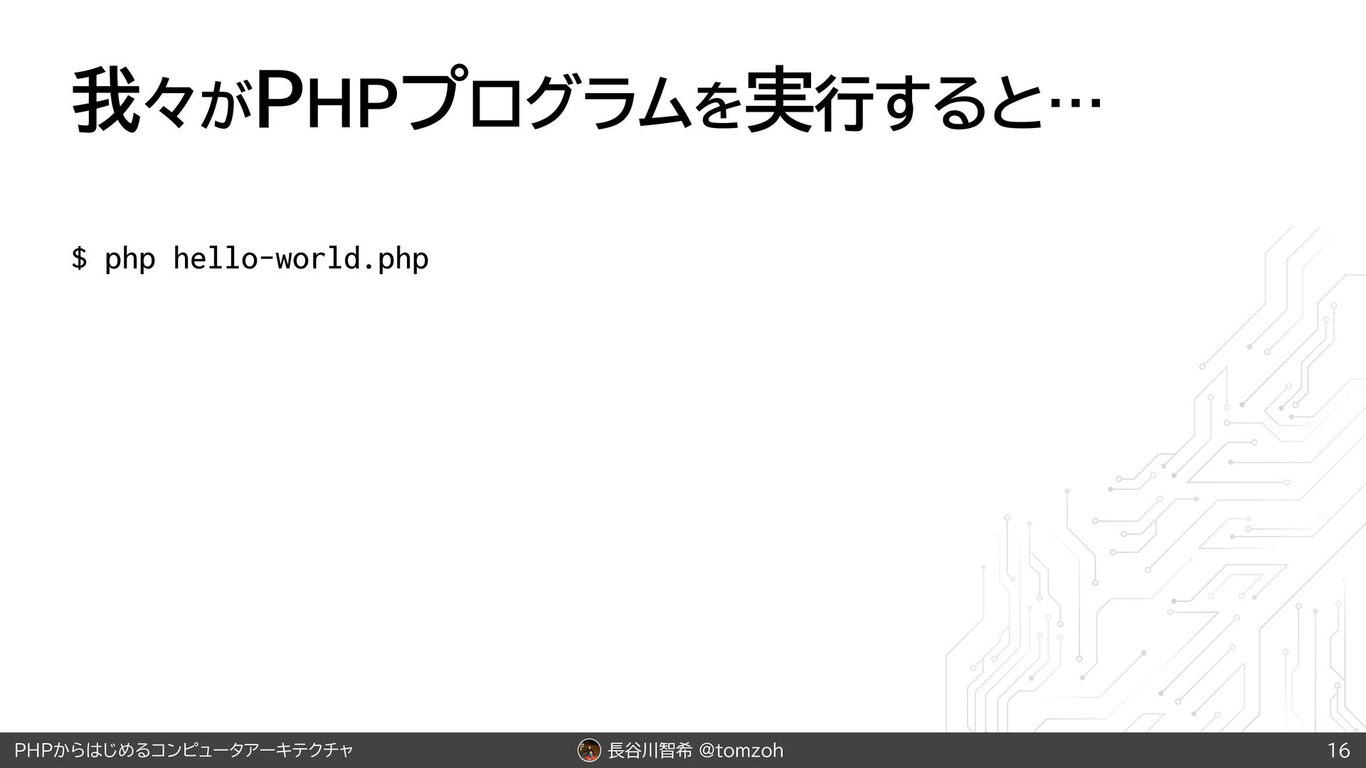 → マシン語(バイナリ) CPUで実行 $ ./hello-world 55 #include <stdio.h> int main(void){ printf("Hello, world."); } hello-world.c .LC0: .string "Hello, world." : main: endbr64 pushq %rbp movq %rsp, %rbp leaq .LC0(%rip), %rdi movl $0, %eax call printf@PLT movl $0, %eax : hello-world.s 00000000 7f 45 4c 46 02 01 01 00 00 00 00 00 00 00 00 00 |.ELF............| 00000010 03 00 3e 00 01 00 00 00 60 10 00 00 00 00 00 00 |..>.....`.......| 00000020 40 00 00 00 00 00 00 00 80 39 00 00 00 00 00 00 |@........9......| : hello-world
