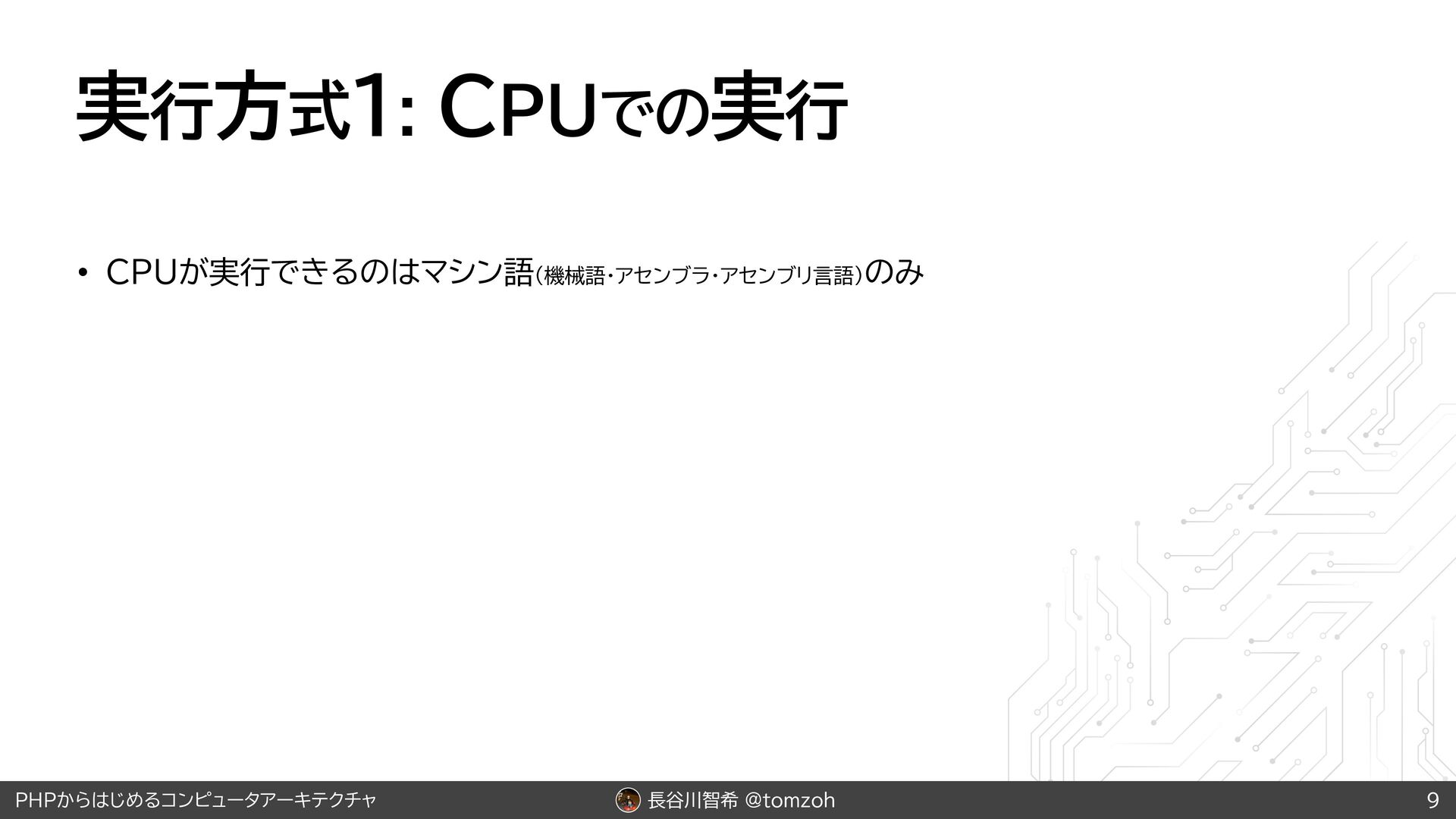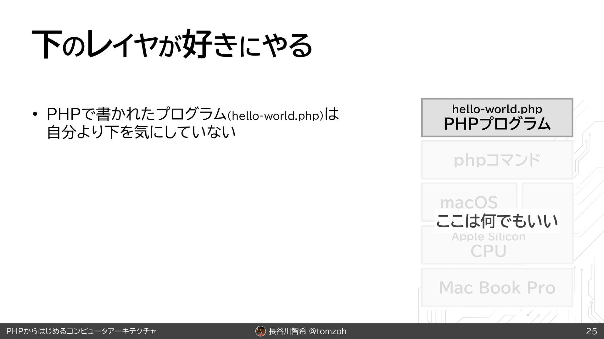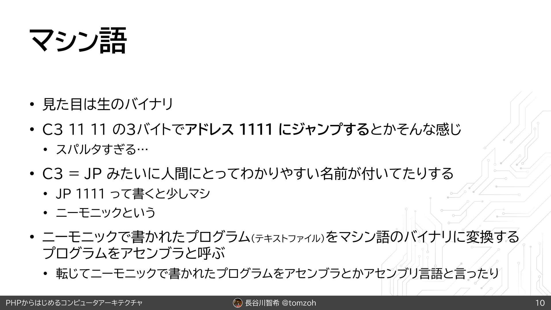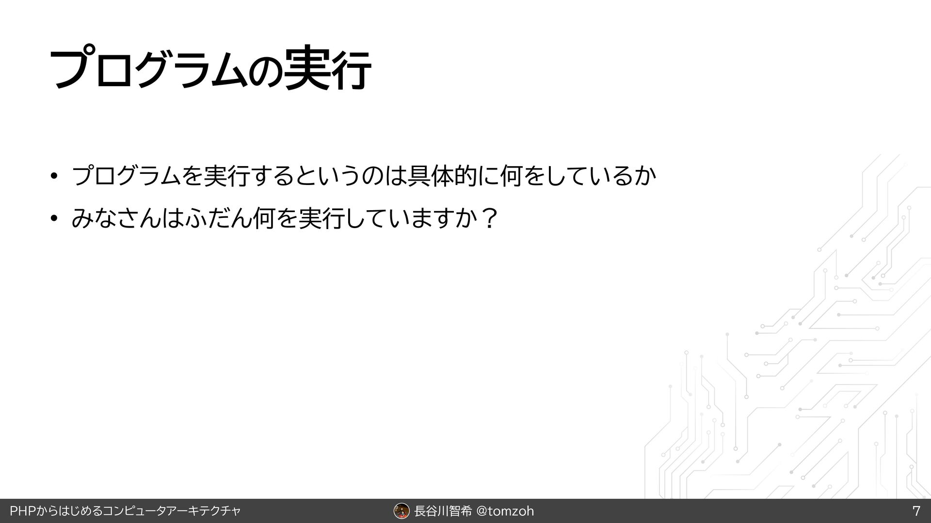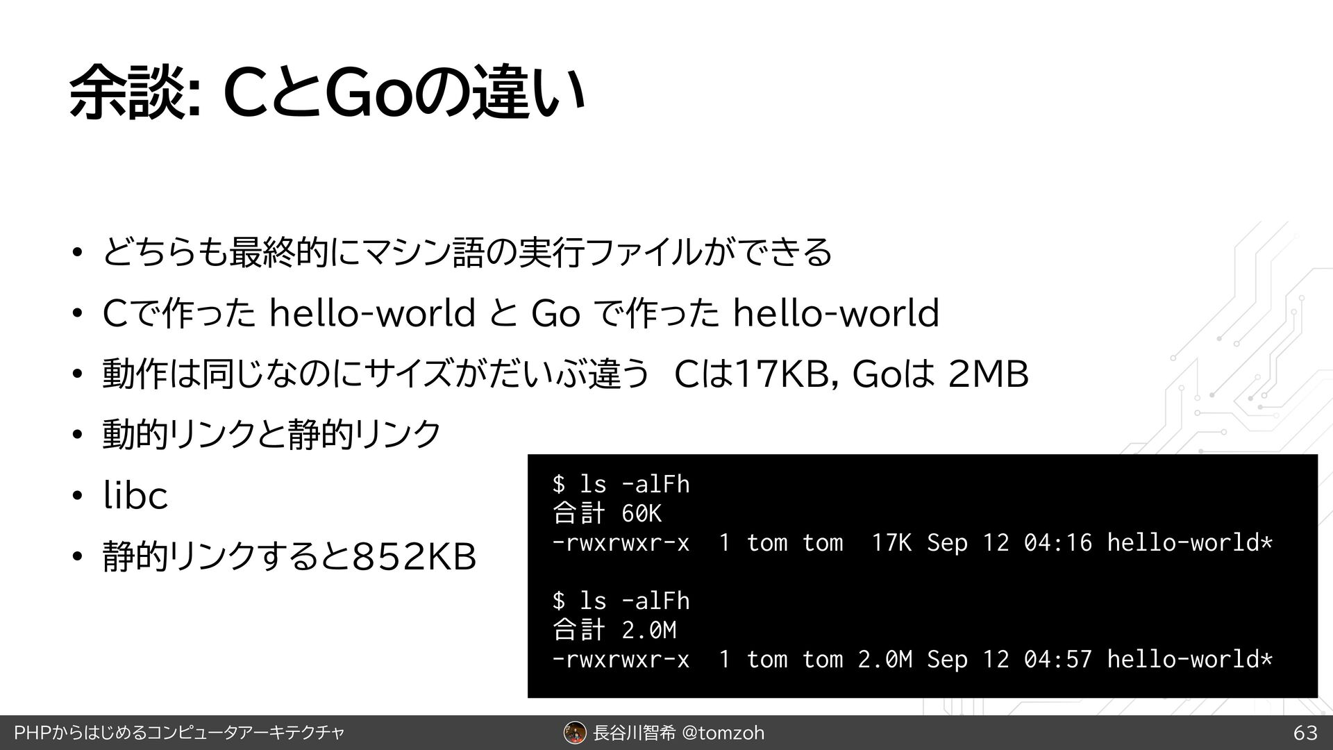 → マシン語(バイナリ) CPUで実行 $ ./hello-world 55 #include <stdio.h> int main(void){ printf("Hello, world."); } hello-world.c .LC0: .string "Hello, world." : main: endbr64 pushq %rbp movq %rsp, %rbp leaq .LC0(%rip), %rdi movl $0, %eax call printf@PLT movl $0, %eax : hello-world.s 00000000 7f 45 4c 46 02 01 01 00 00 00 00 00 00 00 00 00 |.ELF............| 00000010 03 00 3e 00 01 00 00 00 60 10 00 00 00 00 00 00 |..>.....`.......| 00000020 40 00 00 00 00 00 00 00 80 39 00 00 00 00 00 00 |@........9......| : hello-world