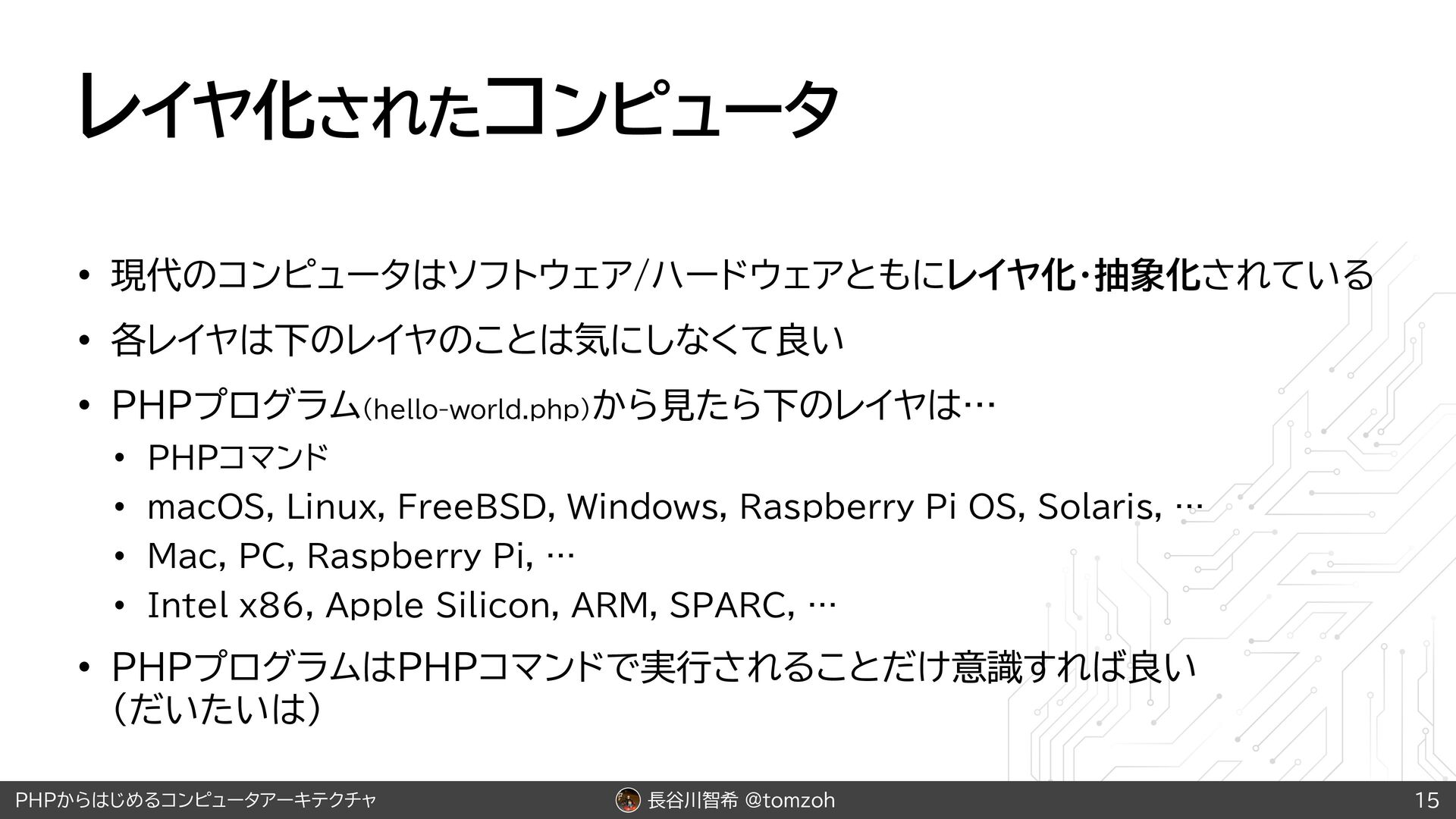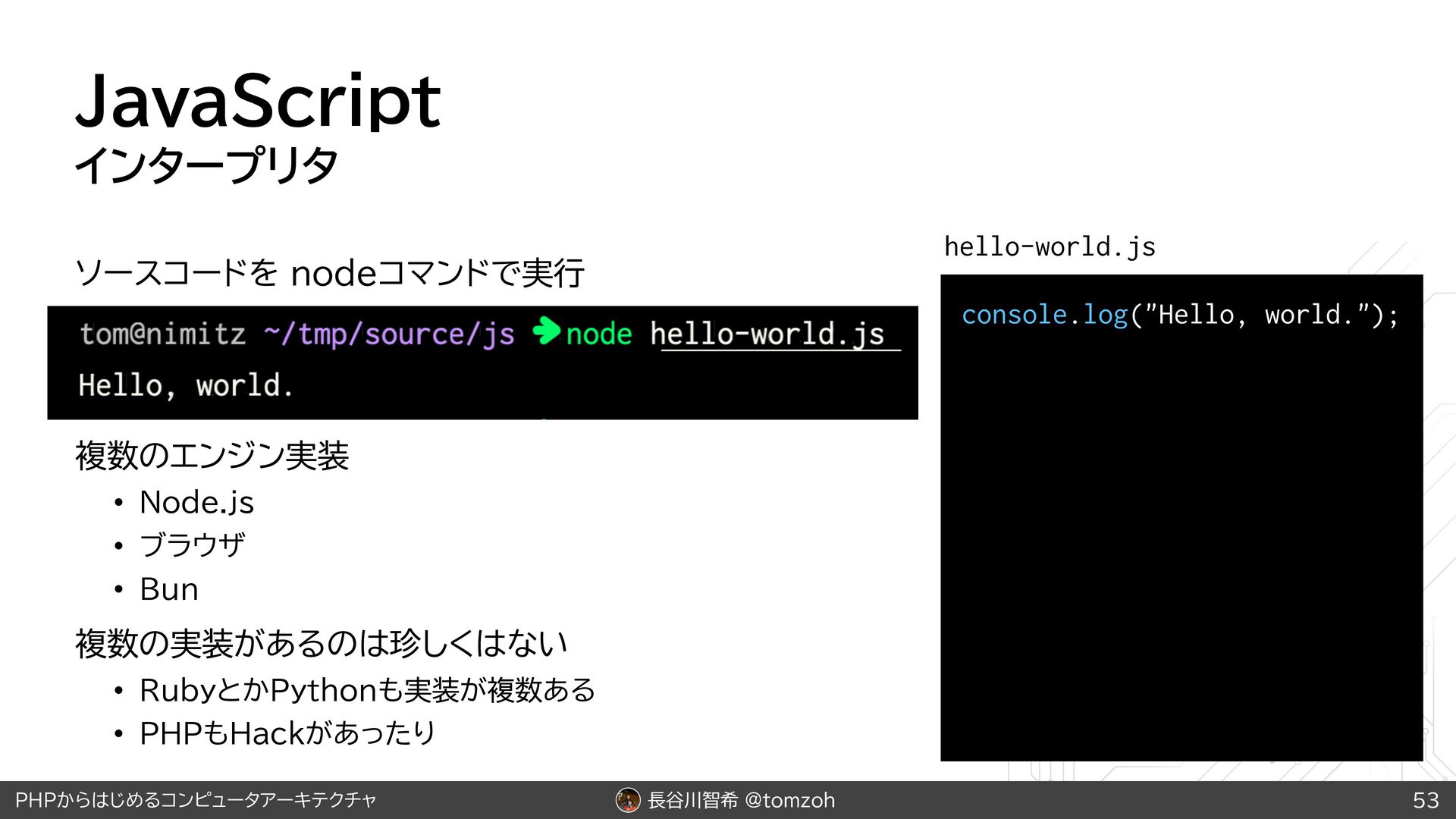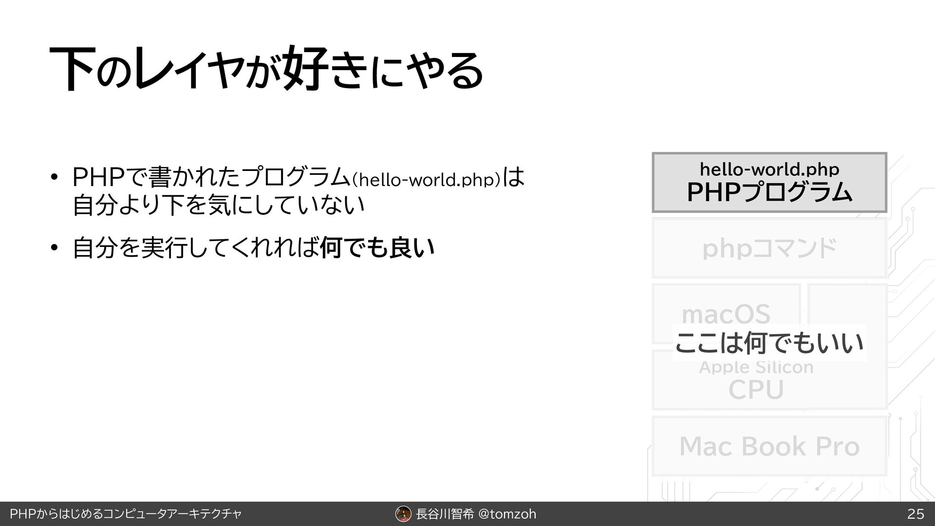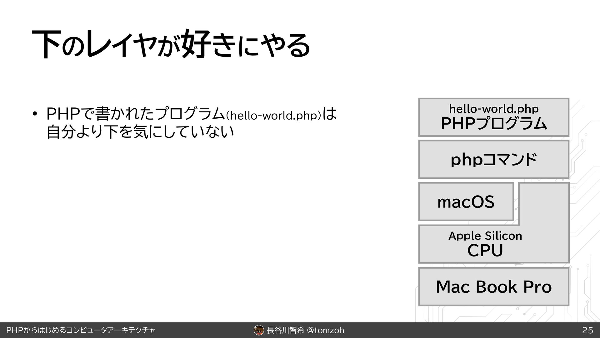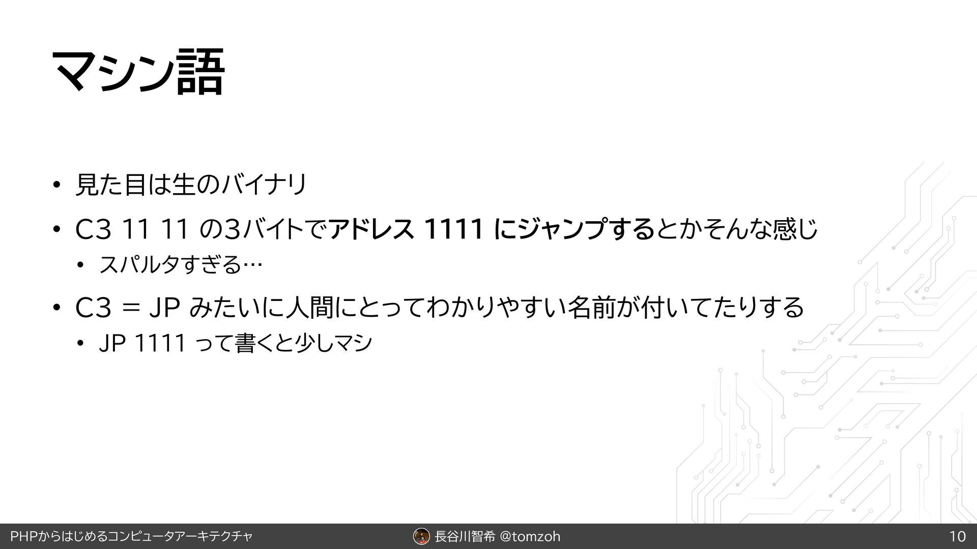 → マシン語(バイナリ) CPUで実行 $ ./hello-world 55 #include <stdio.h> int main(void){ printf("Hello, world."); } hello-world.c .LC0: .string "Hello, world." : main: endbr64 pushq %rbp movq %rsp, %rbp leaq .LC0(%rip), %rdi movl $0, %eax call printf@PLT movl $0, %eax : hello-world.s 00000000 7f 45 4c 46 02 01 01 00 00 00 00 00 00 00 00 00 |.ELF............| 00000010 03 00 3e 00 01 00 00 00 60 10 00 00 00 00 00 00 |..>.....`.......| 00000020 40 00 00 00 00 00 00 00 80 39 00 00 00 00 00 00 |@........9......| : hello-world