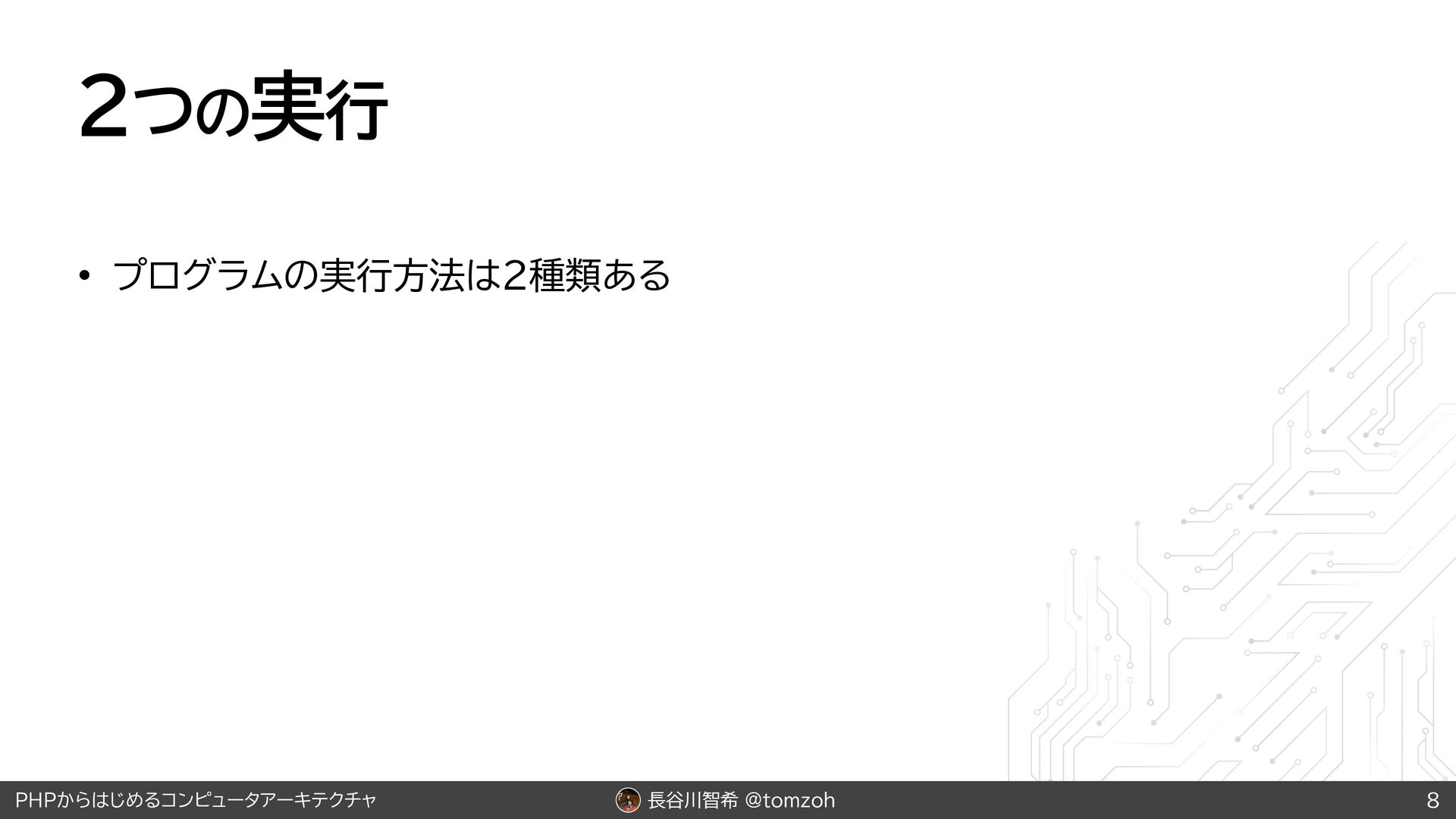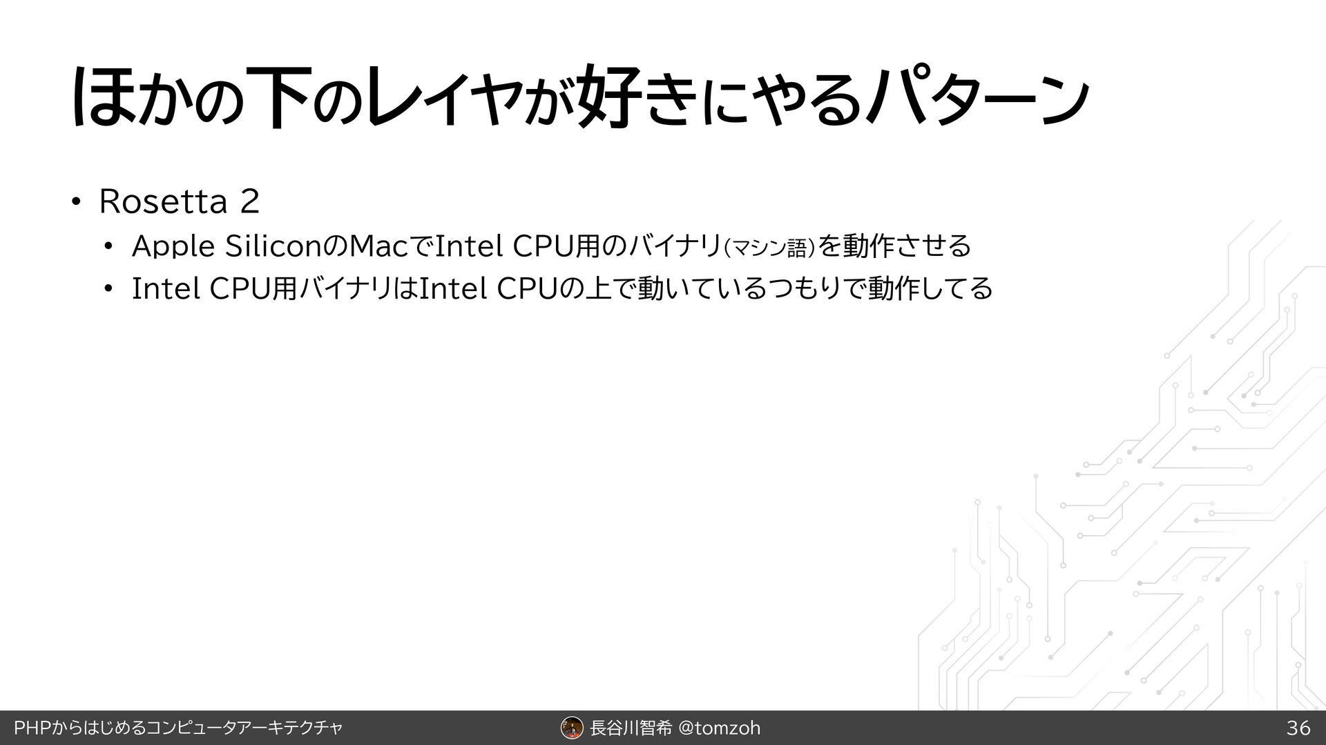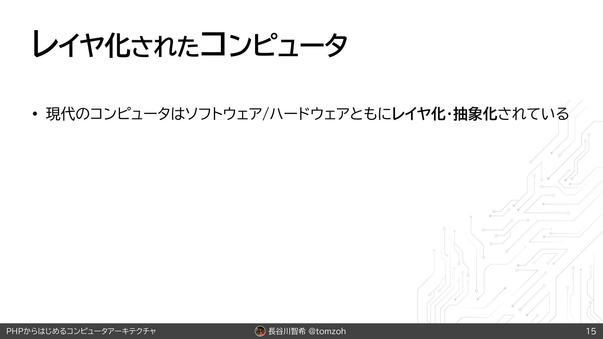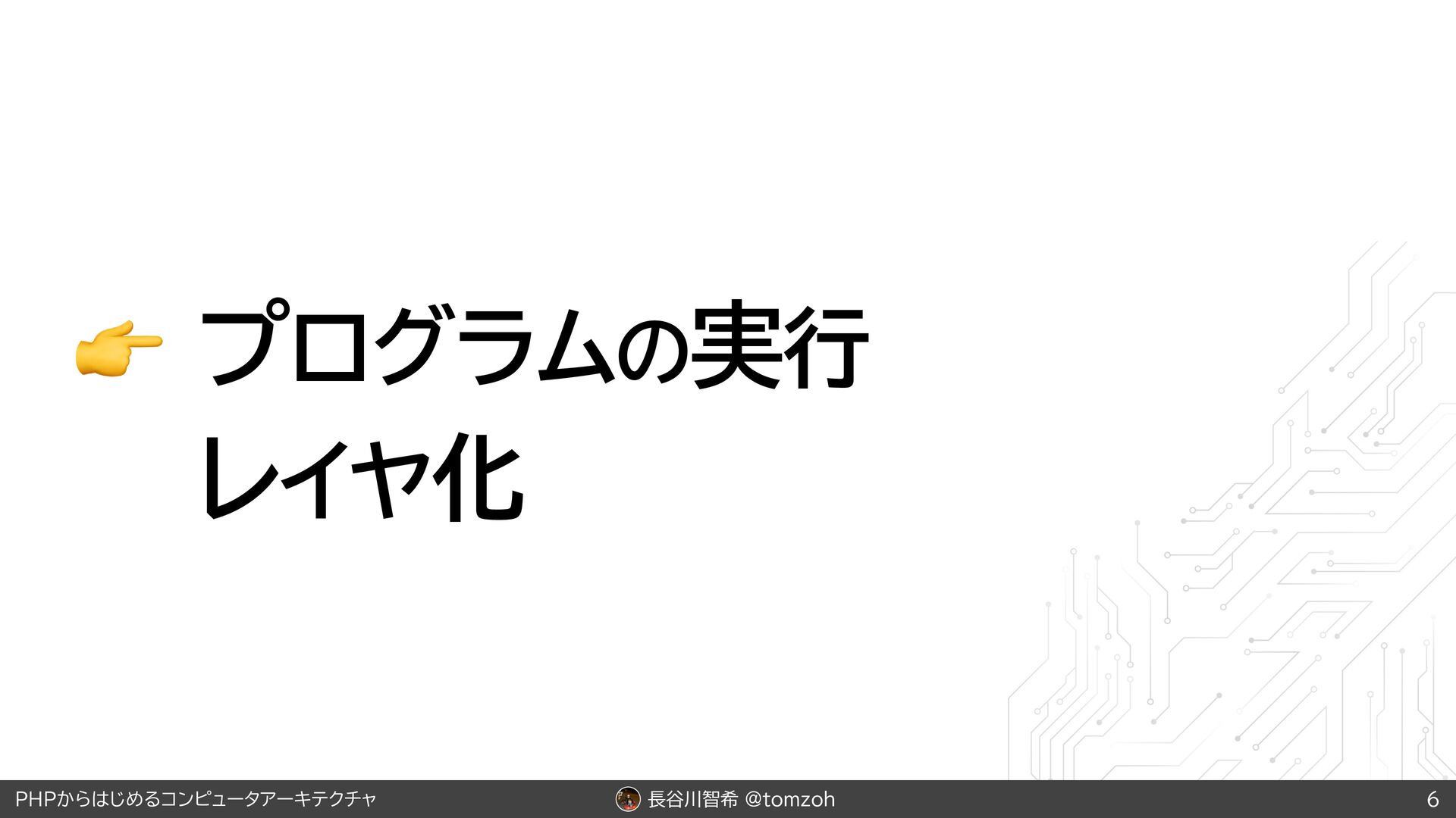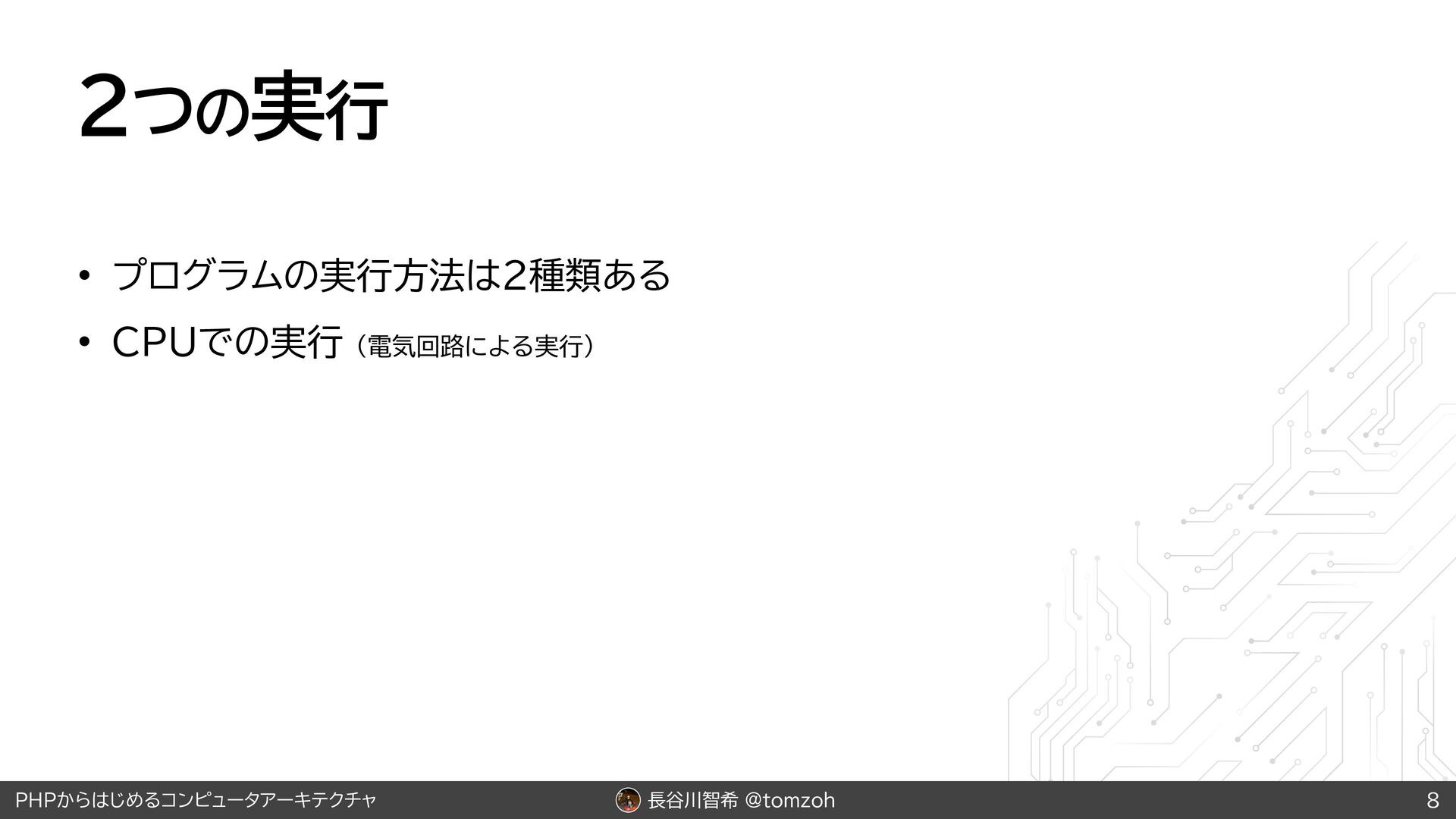 → マシン語(バイナリ) CPUで実行 $ ./hello-world 55 #include <stdio.h> int main(void){ printf("Hello, world."); } hello-world.c .LC0: .string "Hello, world." : main: endbr64 pushq %rbp movq %rsp, %rbp leaq .LC0(%rip), %rdi movl $0, %eax call printf@PLT movl $0, %eax : hello-world.s 00000000 7f 45 4c 46 02 01 01 00 00 00 00 00 00 00 00 00 |.ELF............| 00000010 03 00 3e 00 01 00 00 00 60 10 00 00 00 00 00 00 |..>.....`.......| 00000020 40 00 00 00 00 00 00 00 80 39 00 00 00 00 00 00 |@........9......| : hello-world