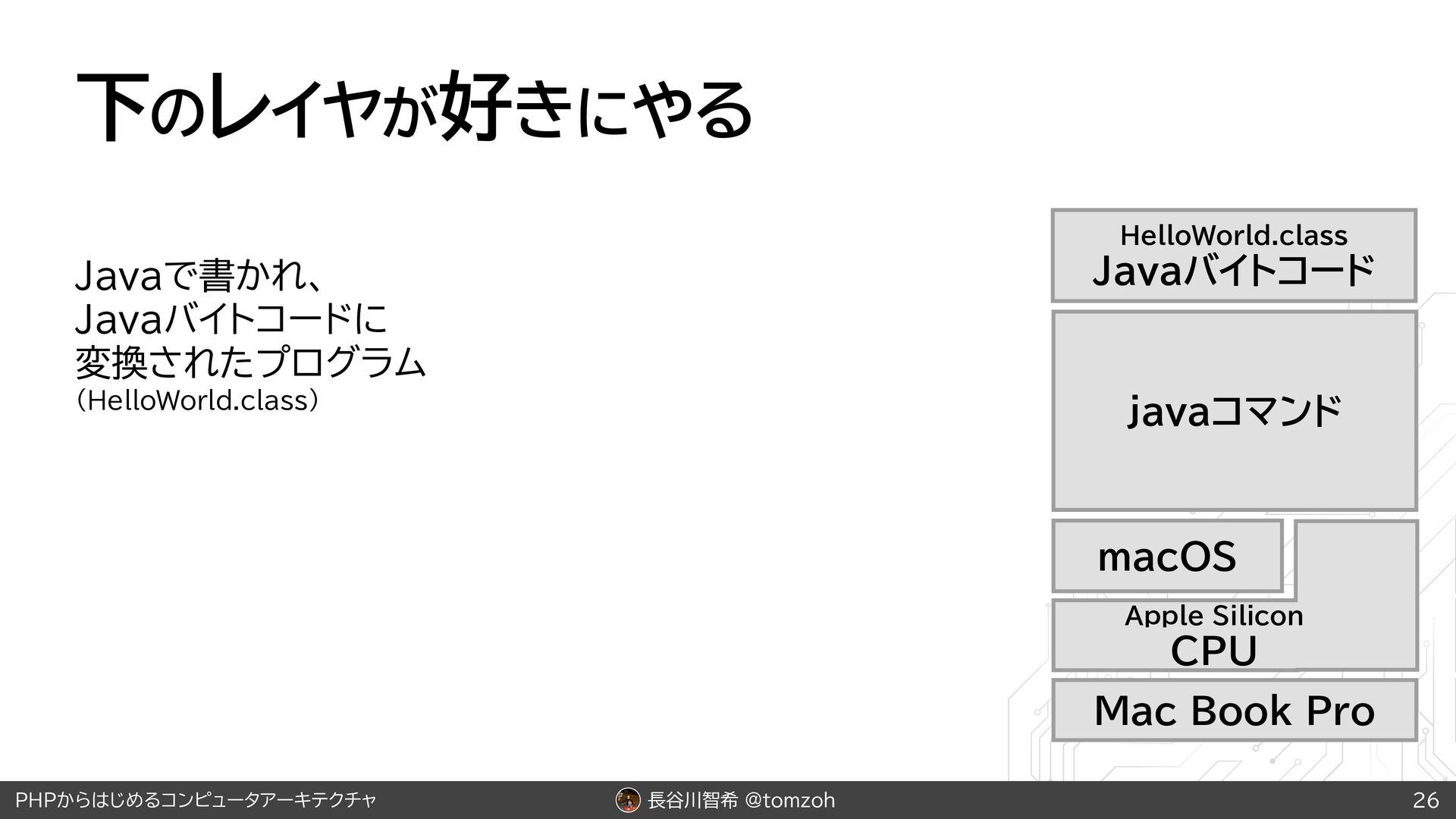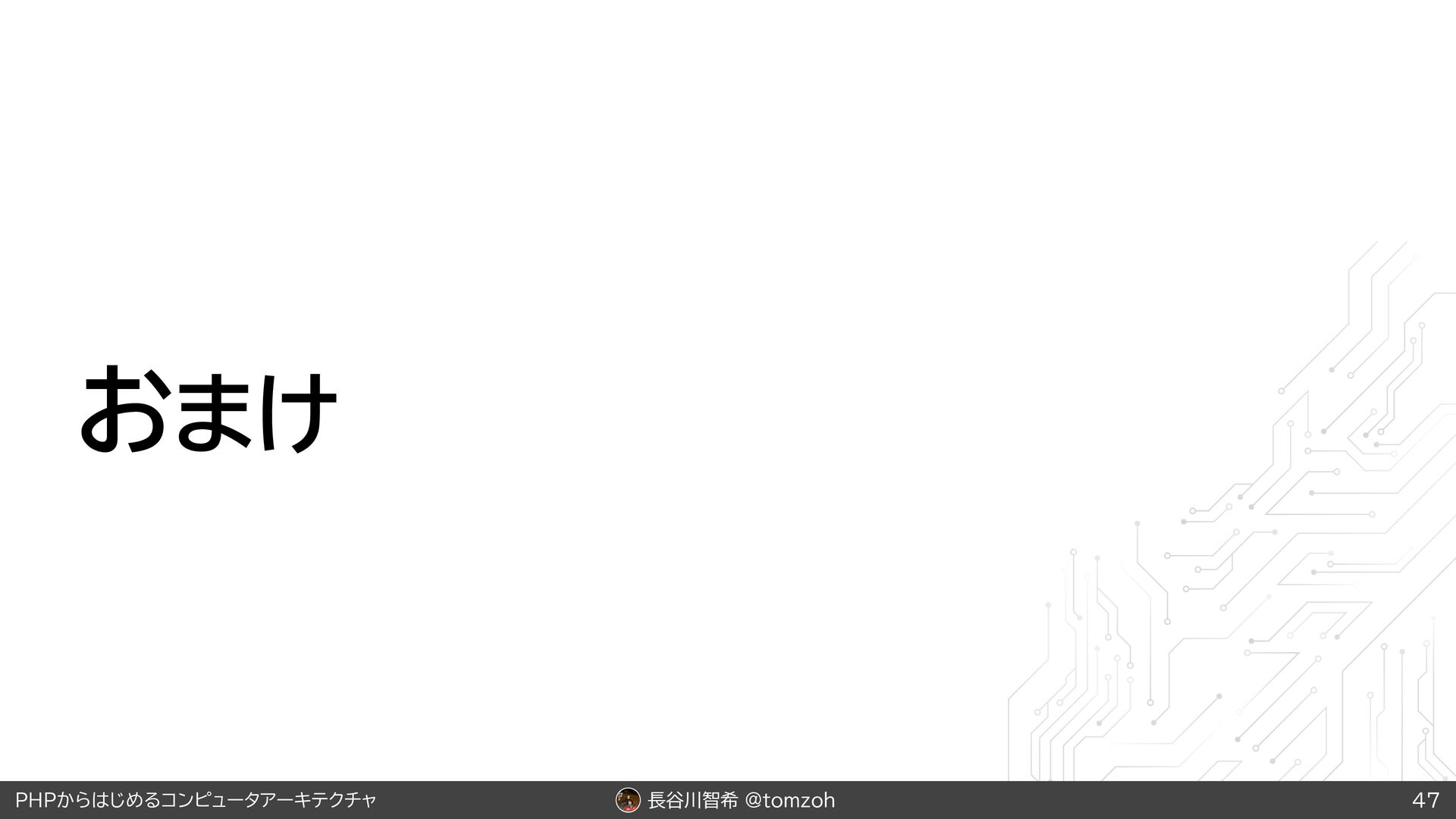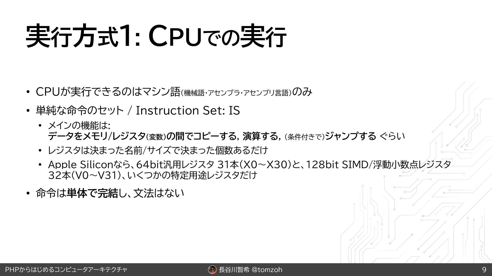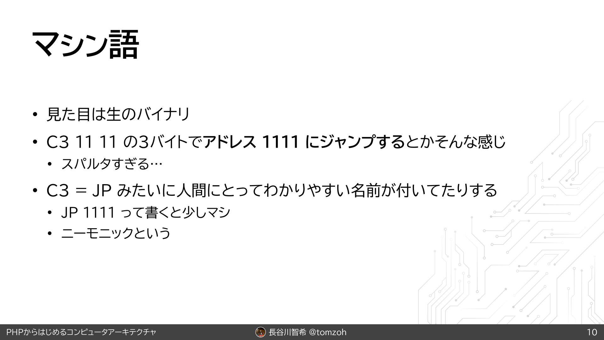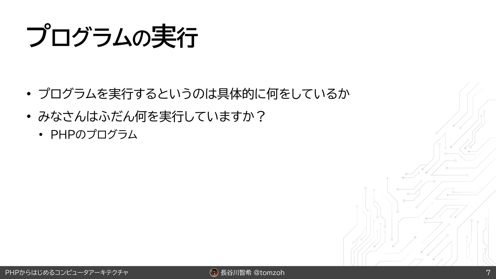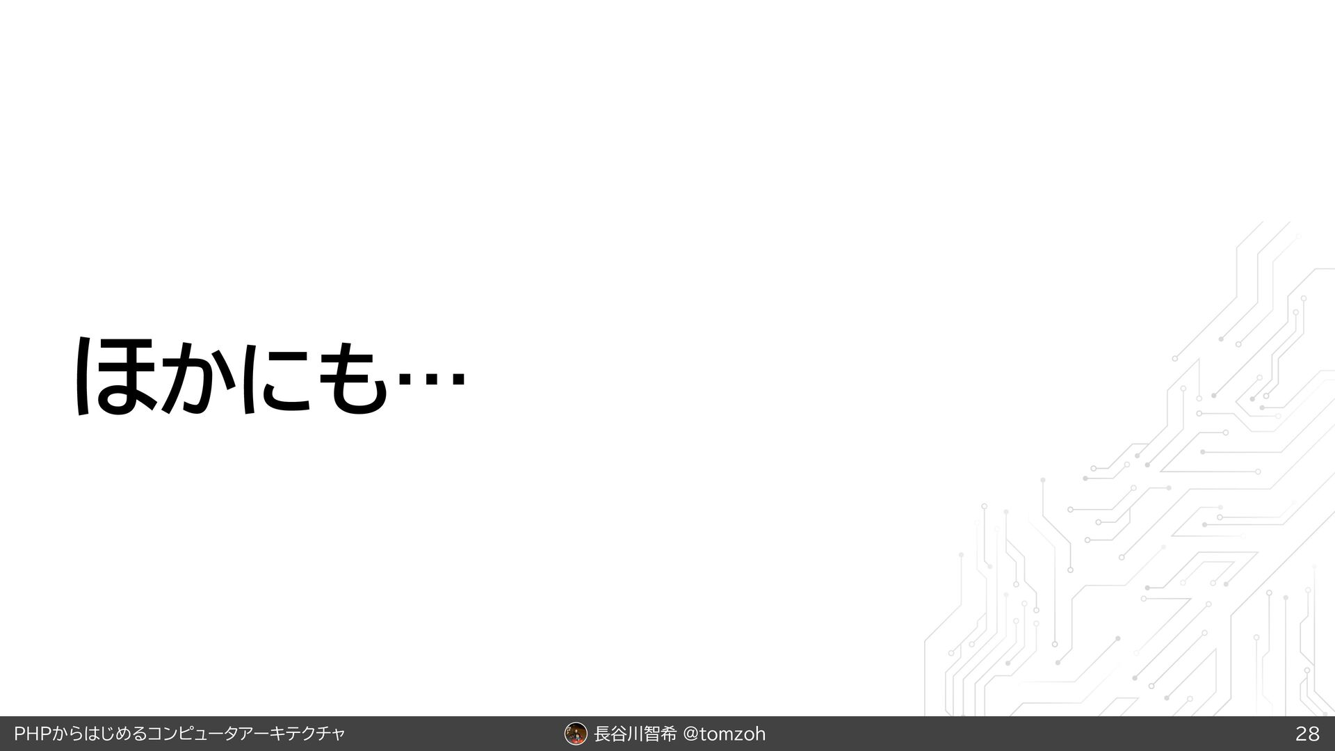 → マシン語(バイナリ) CPUで実行 $ ./hello-world 55 #include <stdio.h> int main(void){ printf("Hello, world."); } hello-world.c .LC0: .string "Hello, world." : main: endbr64 pushq %rbp movq %rsp, %rbp leaq .LC0(%rip), %rdi movl $0, %eax call printf@PLT movl $0, %eax : hello-world.s 00000000 7f 45 4c 46 02 01 01 00 00 00 00 00 00 00 00 00 |.ELF............| 00000010 03 00 3e 00 01 00 00 00 60 10 00 00 00 00 00 00 |..>.....`.......| 00000020 40 00 00 00 00 00 00 00 80 39 00 00 00 00 00 00 |@........9......| : hello-world