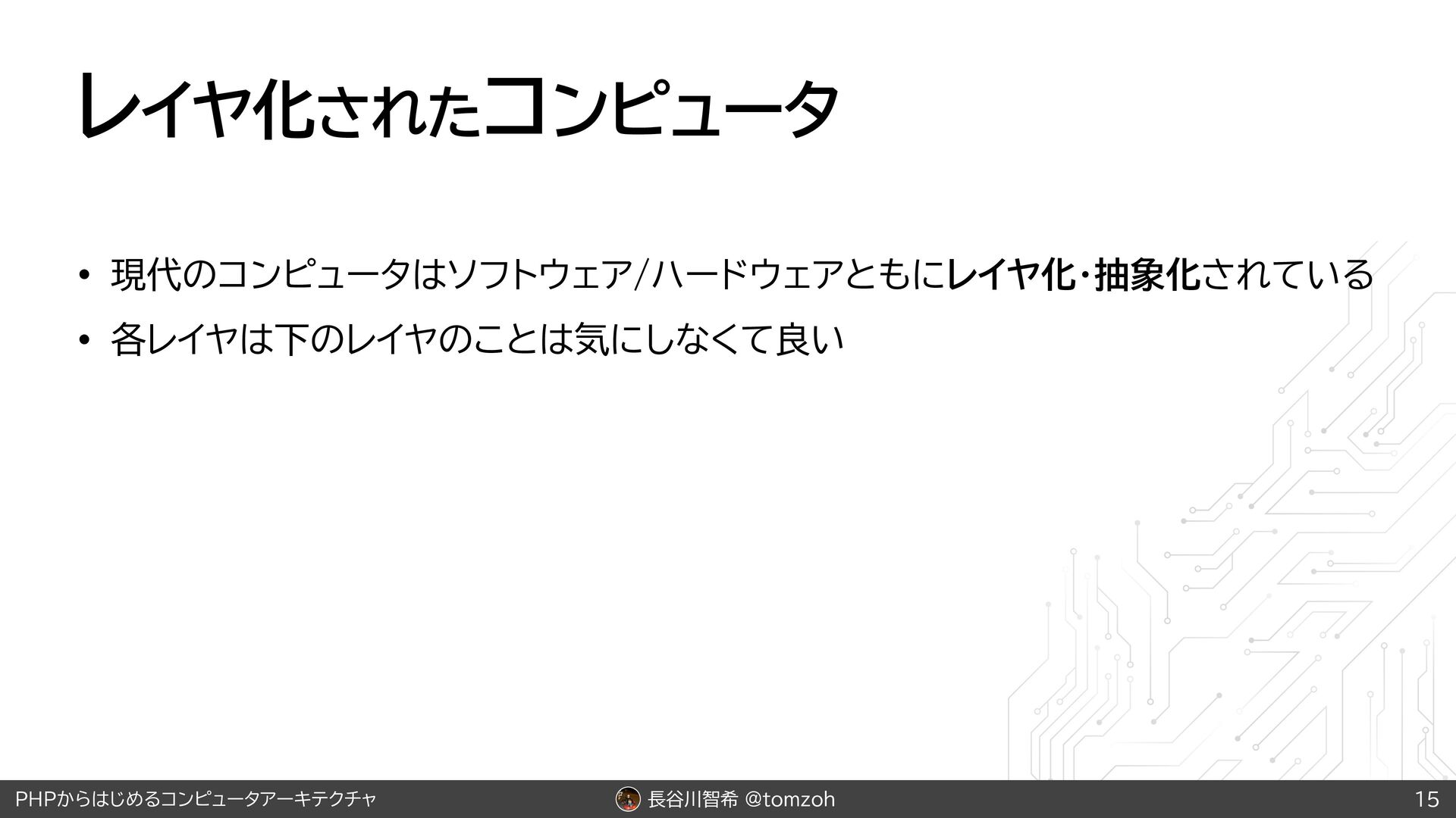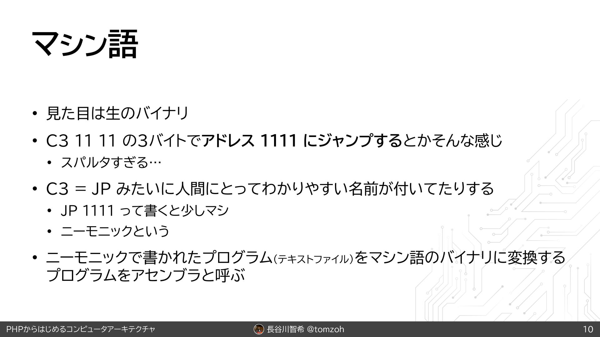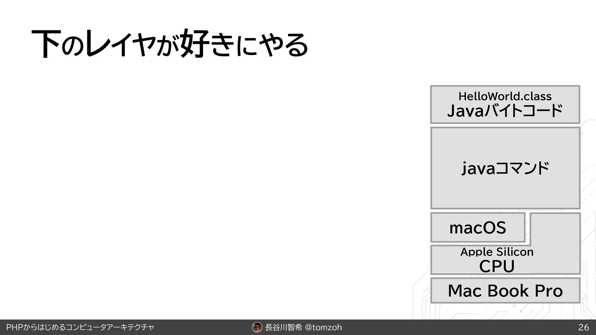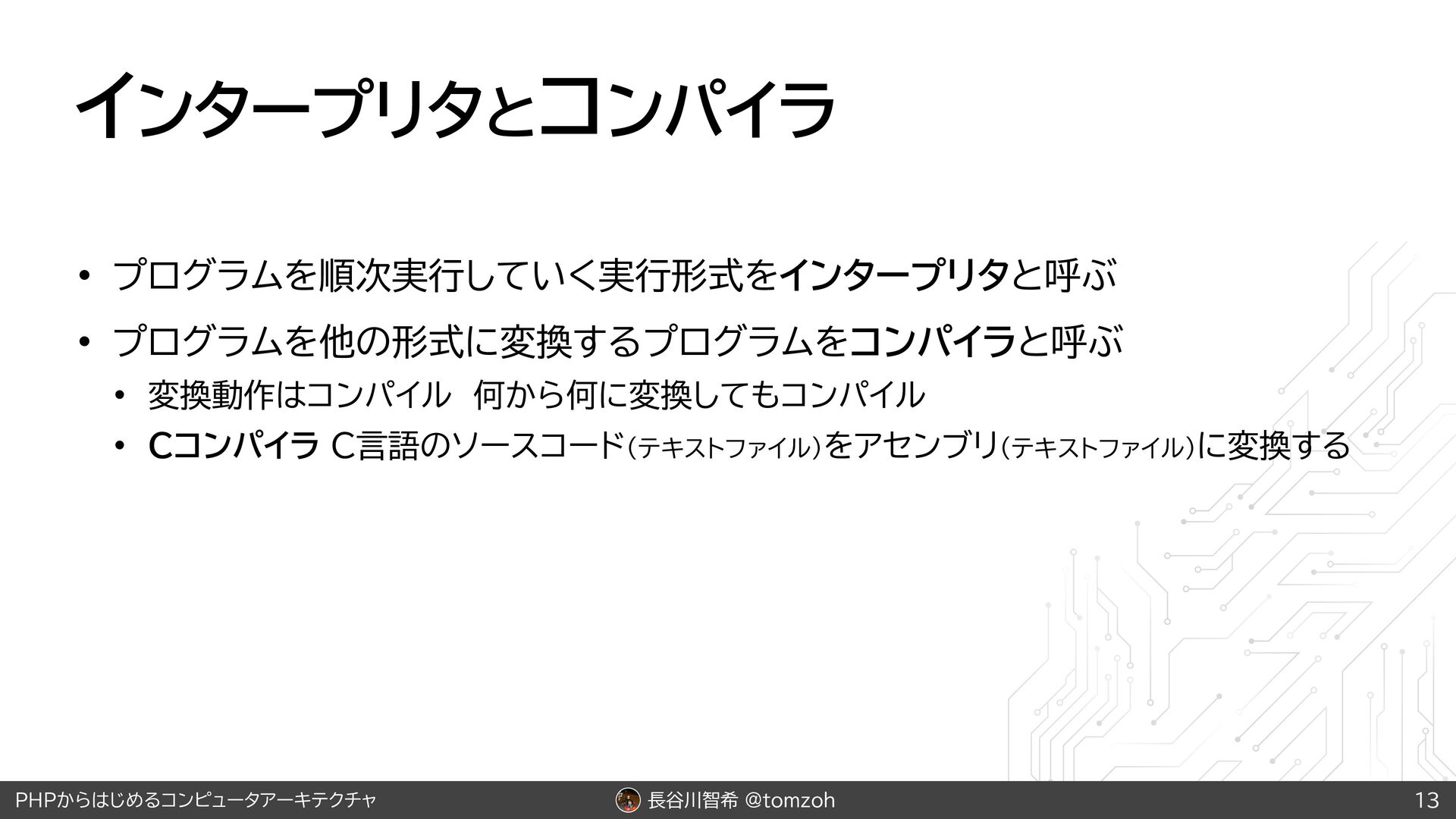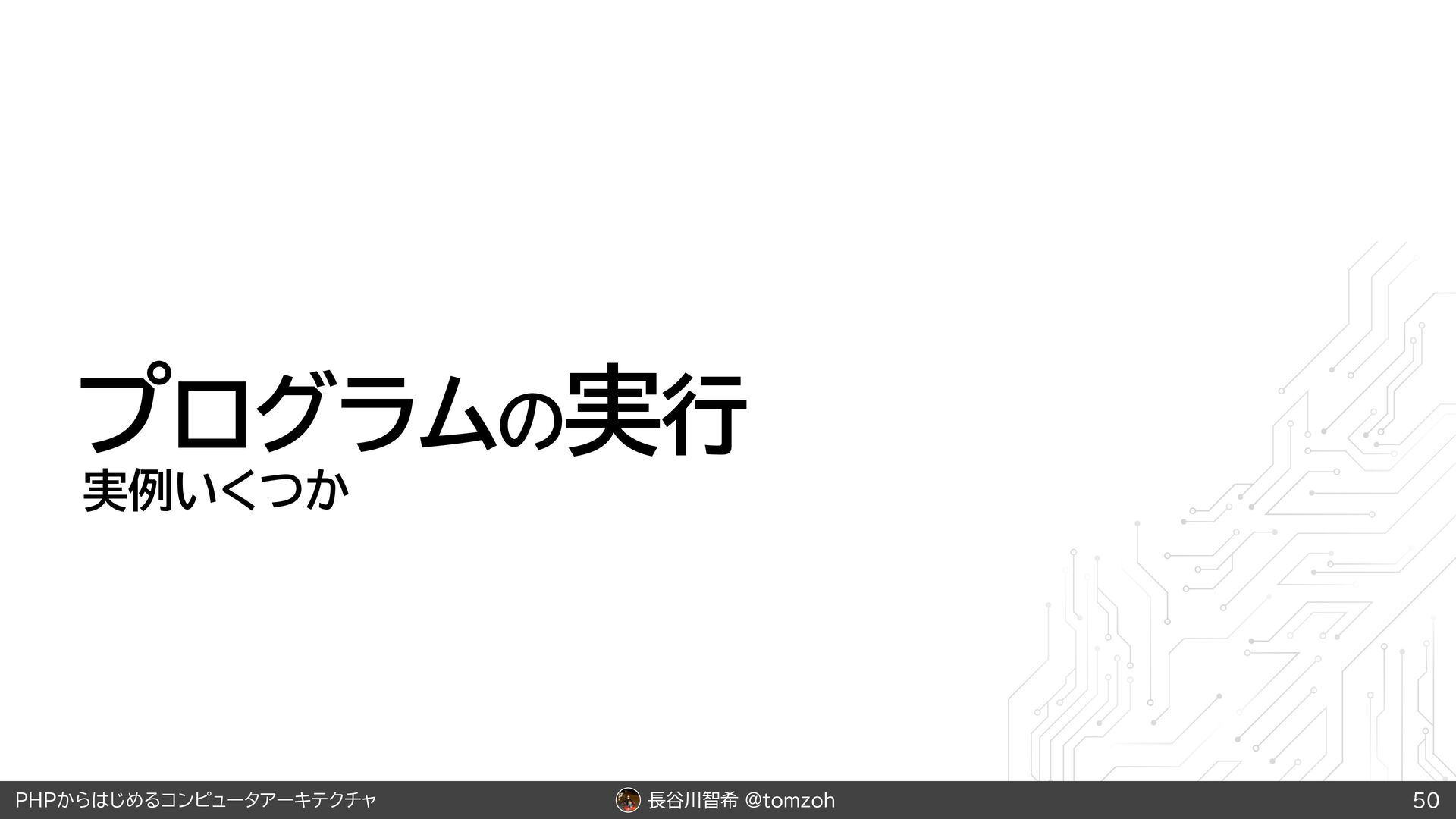 → マシン語(バイナリ) CPUで実行 $ ./hello-world 55 #include <stdio.h> int main(void){ printf("Hello, world."); } hello-world.c .LC0: .string "Hello, world." : main: endbr64 pushq %rbp movq %rsp, %rbp leaq .LC0(%rip), %rdi movl $0, %eax call printf@PLT movl $0, %eax : hello-world.s 00000000 7f 45 4c 46 02 01 01 00 00 00 00 00 00 00 00 00 |.ELF............| 00000010 03 00 3e 00 01 00 00 00 60 10 00 00 00 00 00 00 |..>.....`.......| 00000020 40 00 00 00 00 00 00 00 80 39 00 00 00 00 00 00 |@........9......| : hello-world