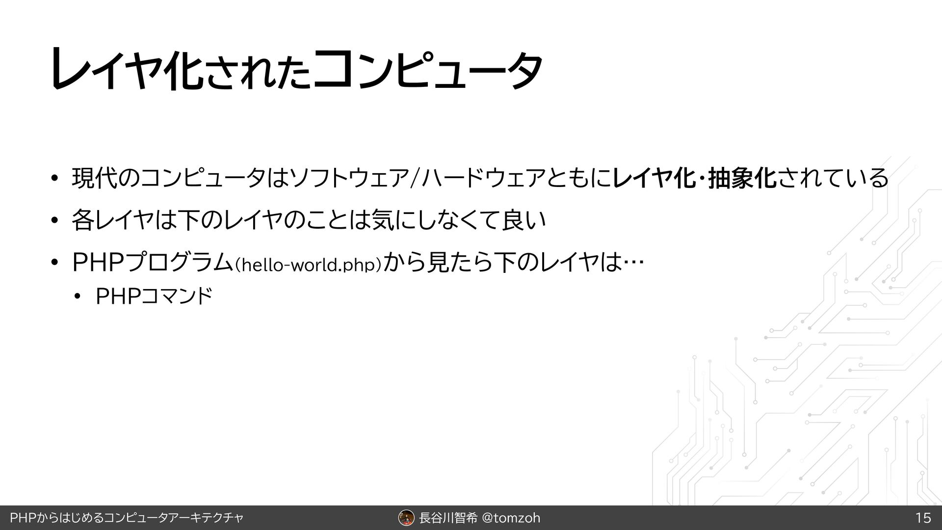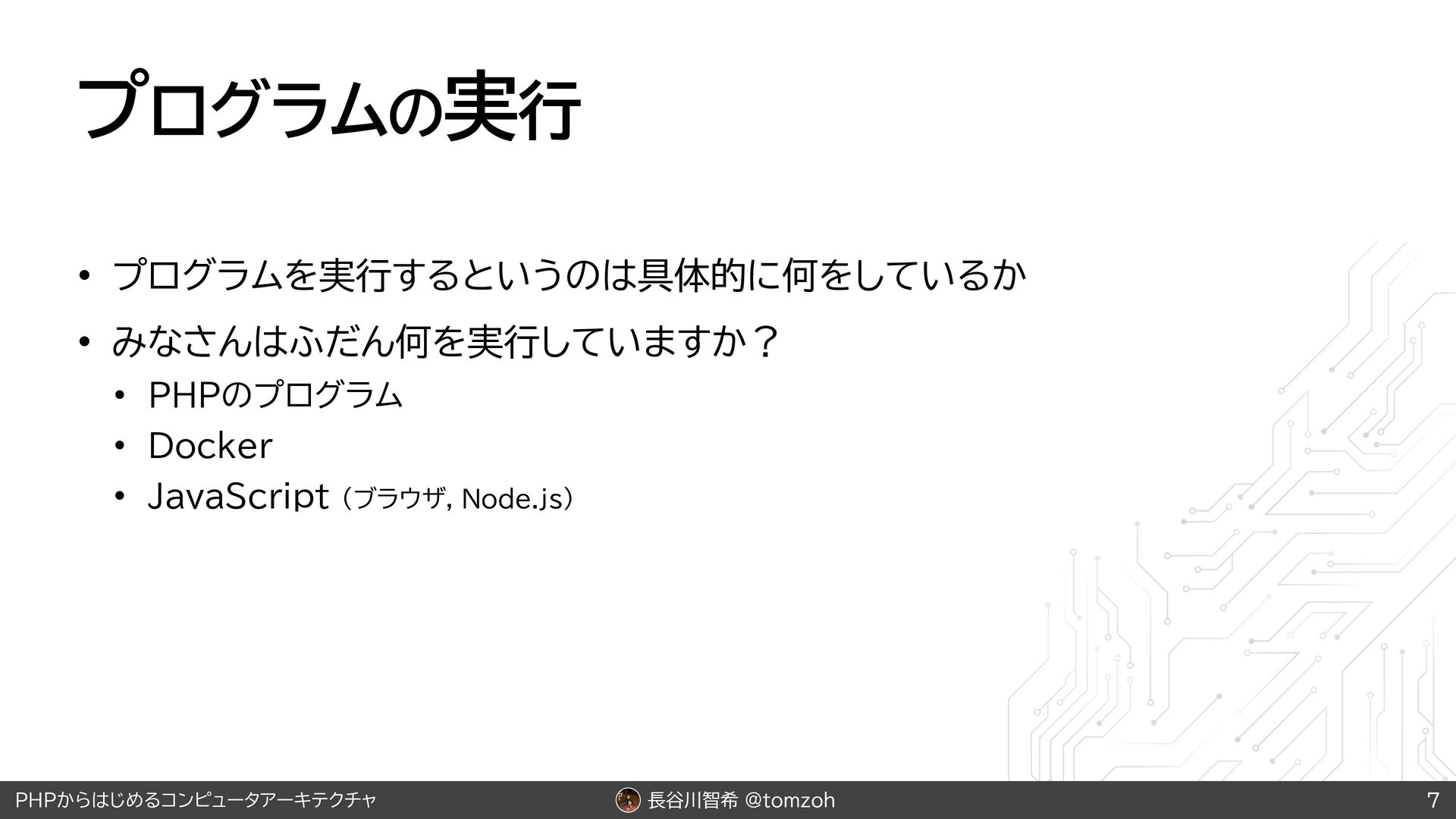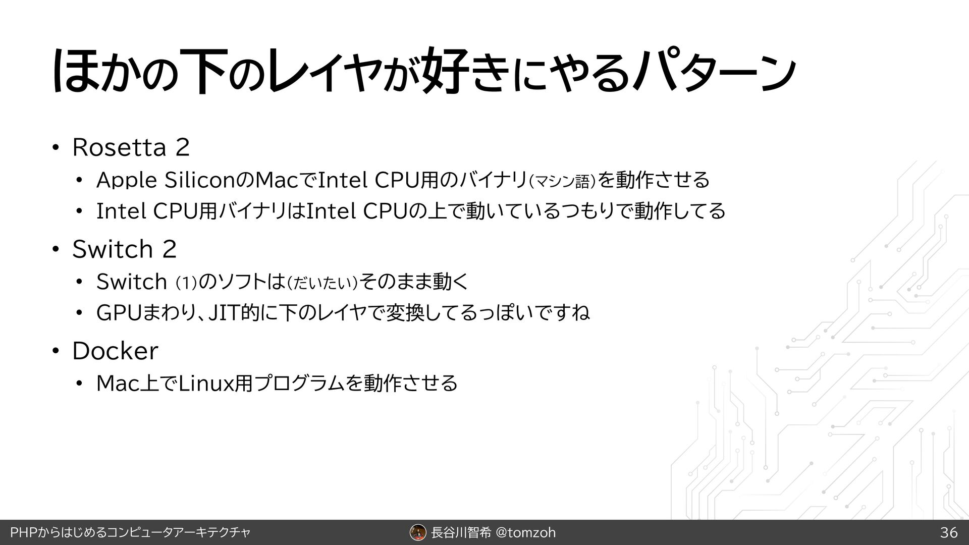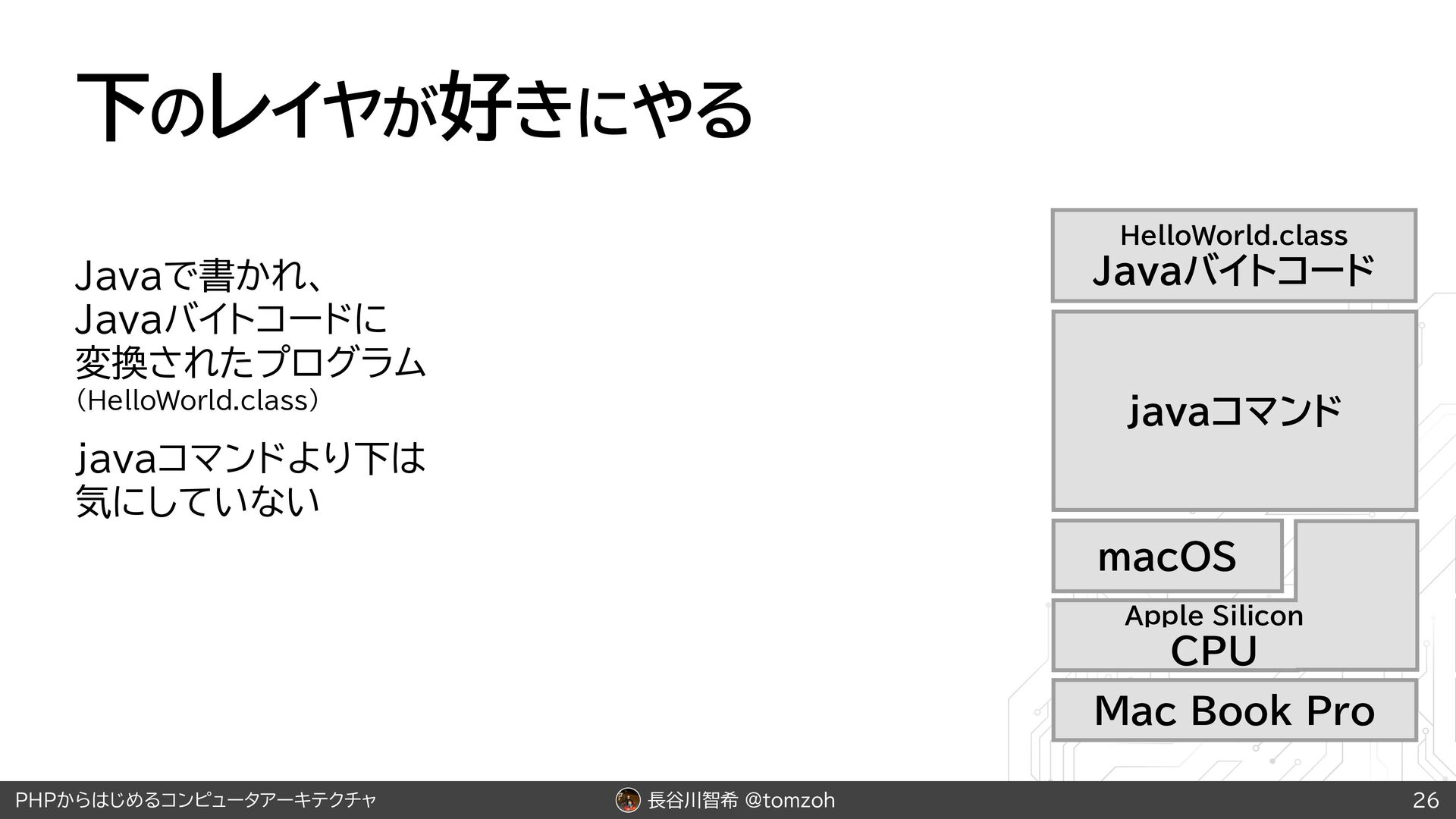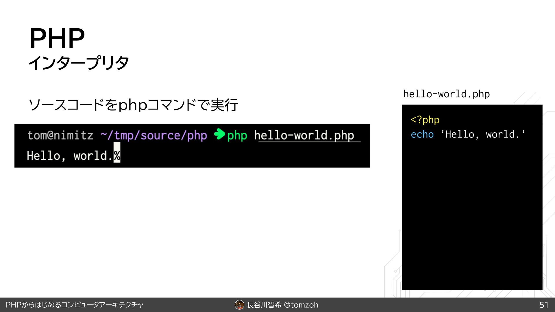 → マシン語(バイナリ) CPUで実行 $ ./hello-world 55 #include <stdio.h> int main(void){ printf("Hello, world."); } hello-world.c .LC0: .string "Hello, world." : main: endbr64 pushq %rbp movq %rsp, %rbp leaq .LC0(%rip), %rdi movl $0, %eax call printf@PLT movl $0, %eax : hello-world.s 00000000 7f 45 4c 46 02 01 01 00 00 00 00 00 00 00 00 00 |.ELF............| 00000010 03 00 3e 00 01 00 00 00 60 10 00 00 00 00 00 00 |..>.....`.......| 00000020 40 00 00 00 00 00 00 00 80 39 00 00 00 00 00 00 |@........9......| : hello-world