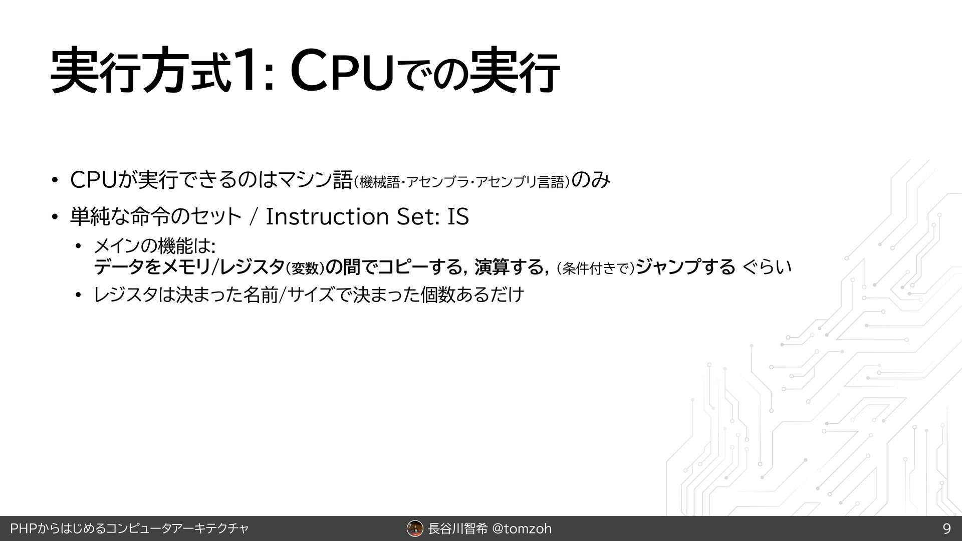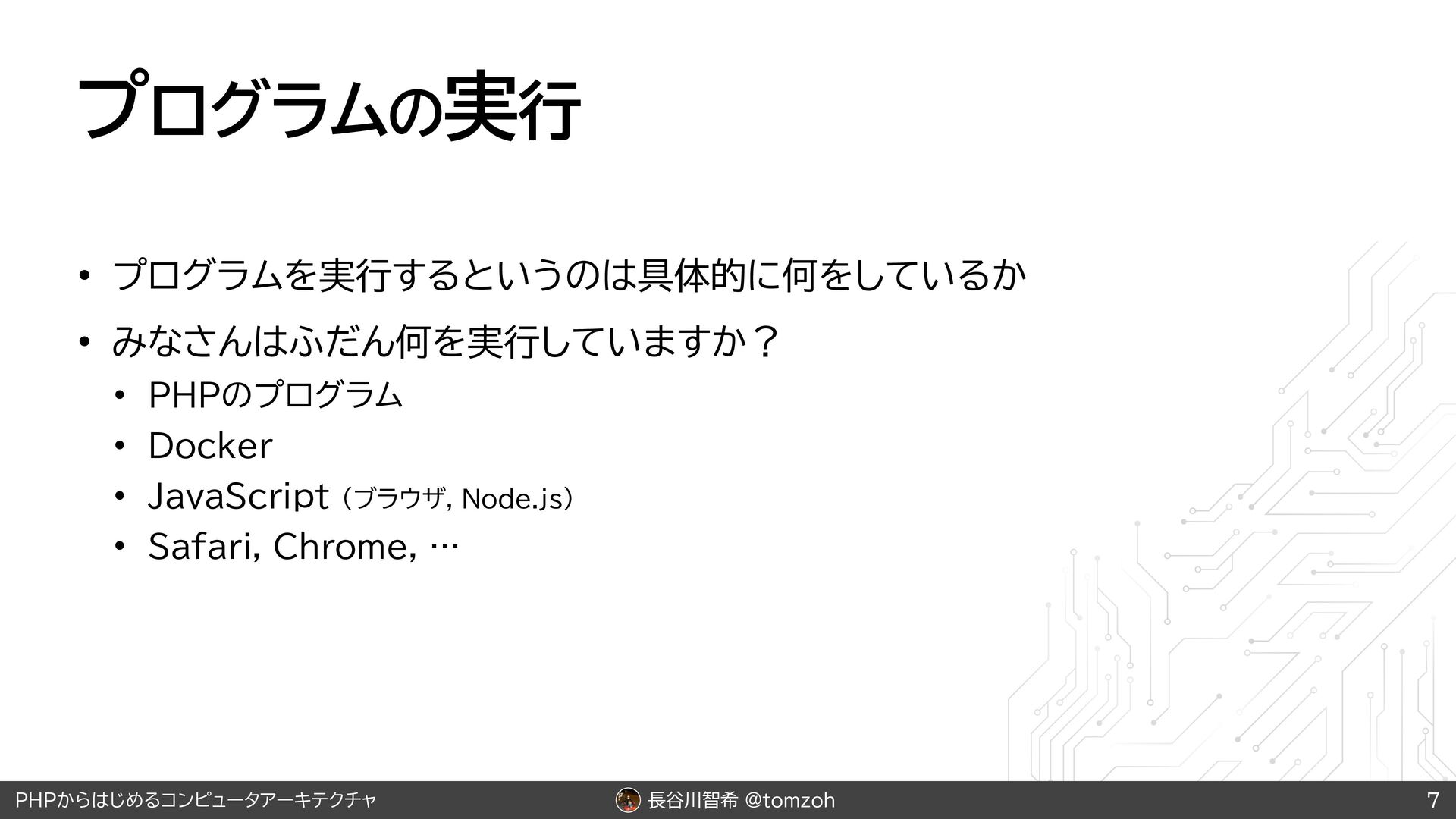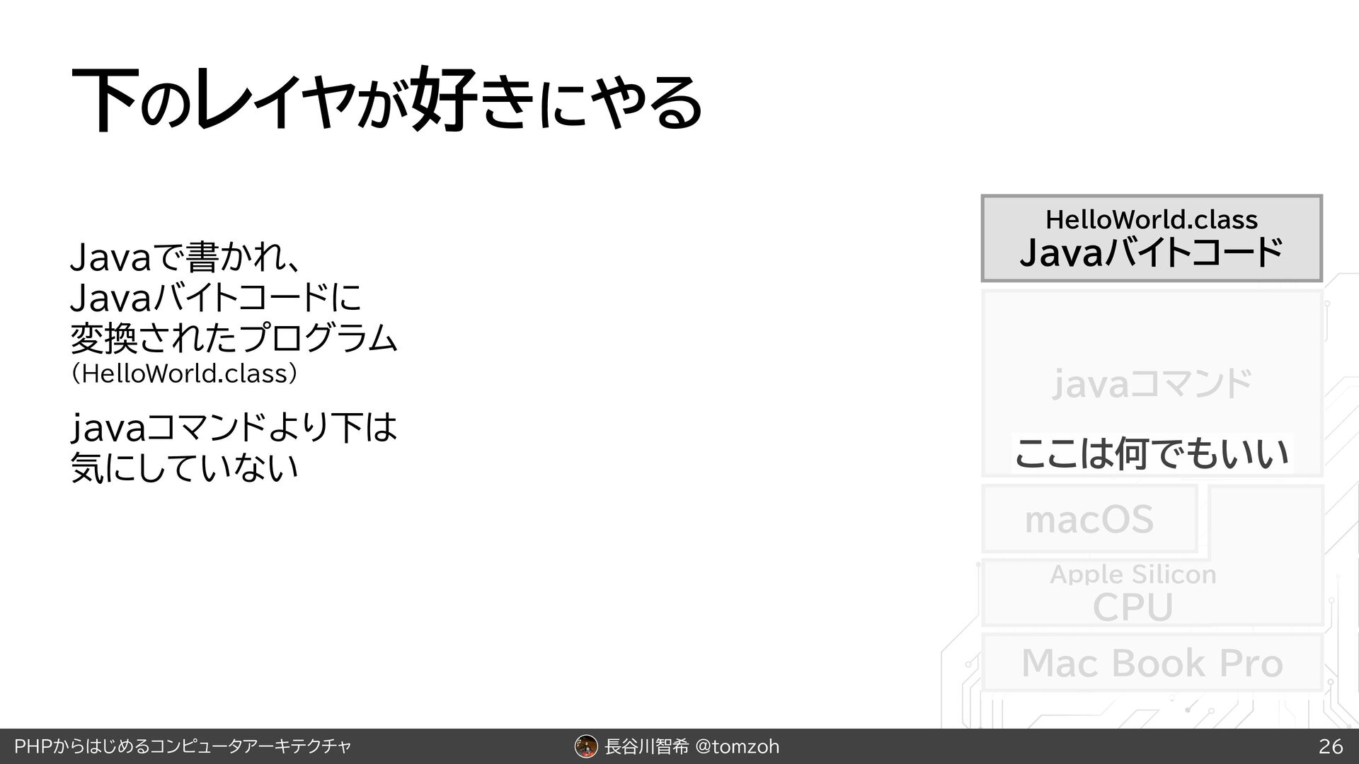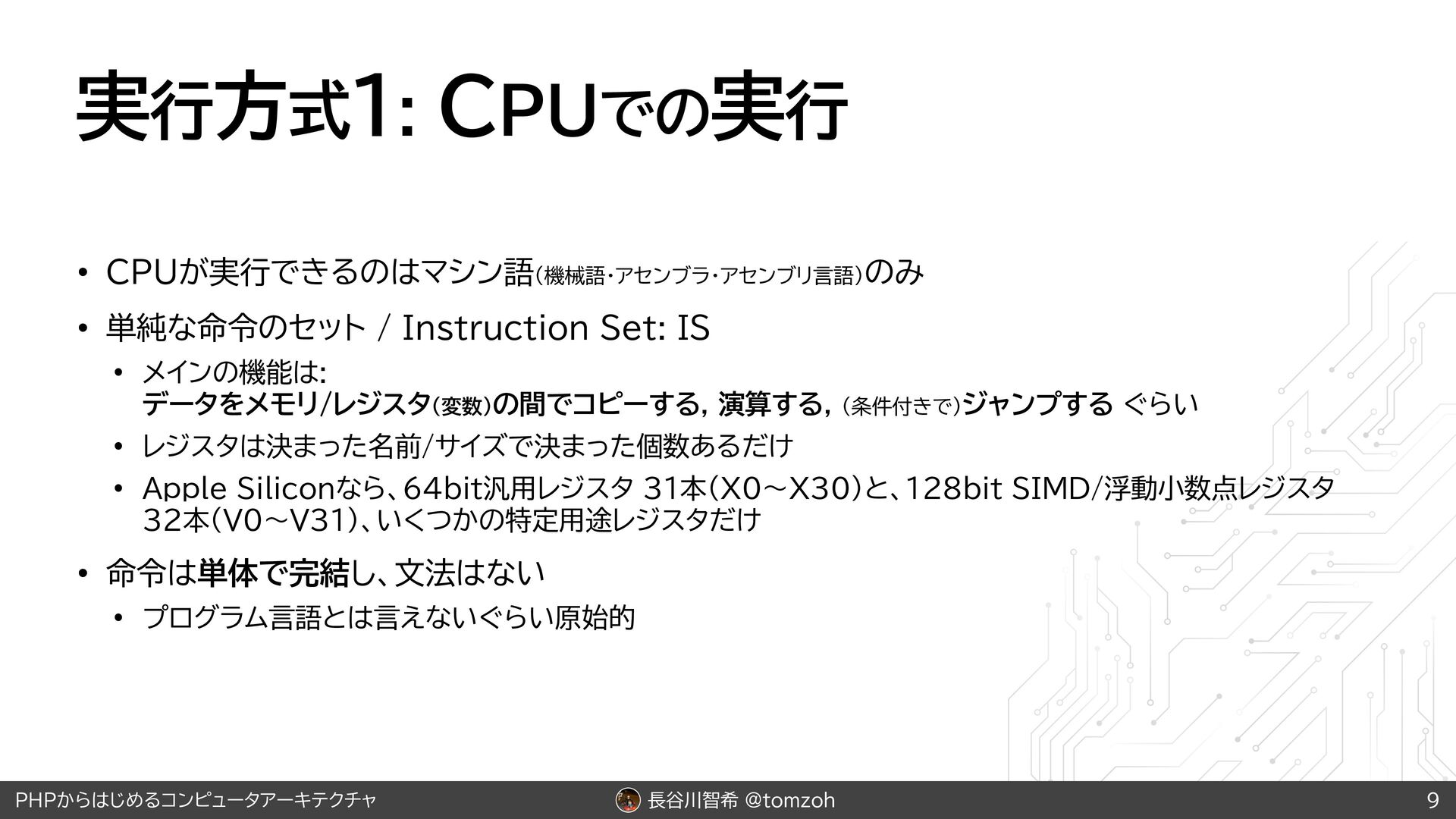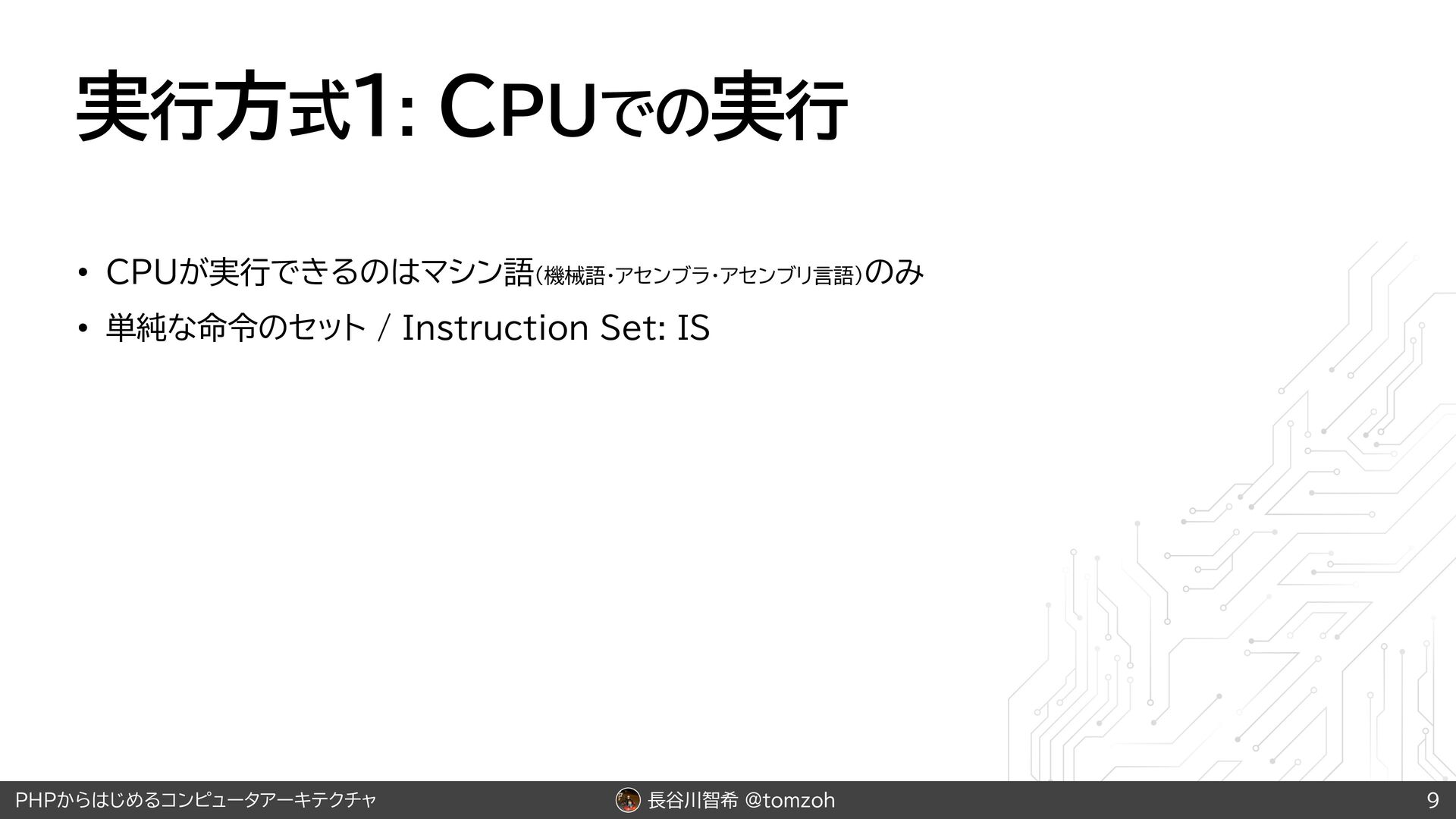 → マシン語(バイナリ) CPUで実行 $ ./hello-world 55 #include <stdio.h> int main(void){ printf("Hello, world."); } hello-world.c .LC0: .string "Hello, world." : main: endbr64 pushq %rbp movq %rsp, %rbp leaq .LC0(%rip), %rdi movl $0, %eax call printf@PLT movl $0, %eax : hello-world.s 00000000 7f 45 4c 46 02 01 01 00 00 00 00 00 00 00 00 00 |.ELF............| 00000010 03 00 3e 00 01 00 00 00 60 10 00 00 00 00 00 00 |..>.....`.......| 00000020 40 00 00 00 00 00 00 00 80 39 00 00 00 00 00 00 |@........9......| : hello-world