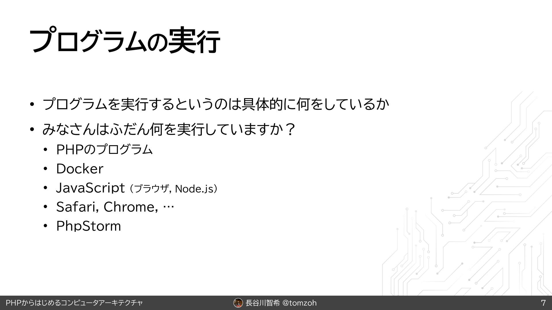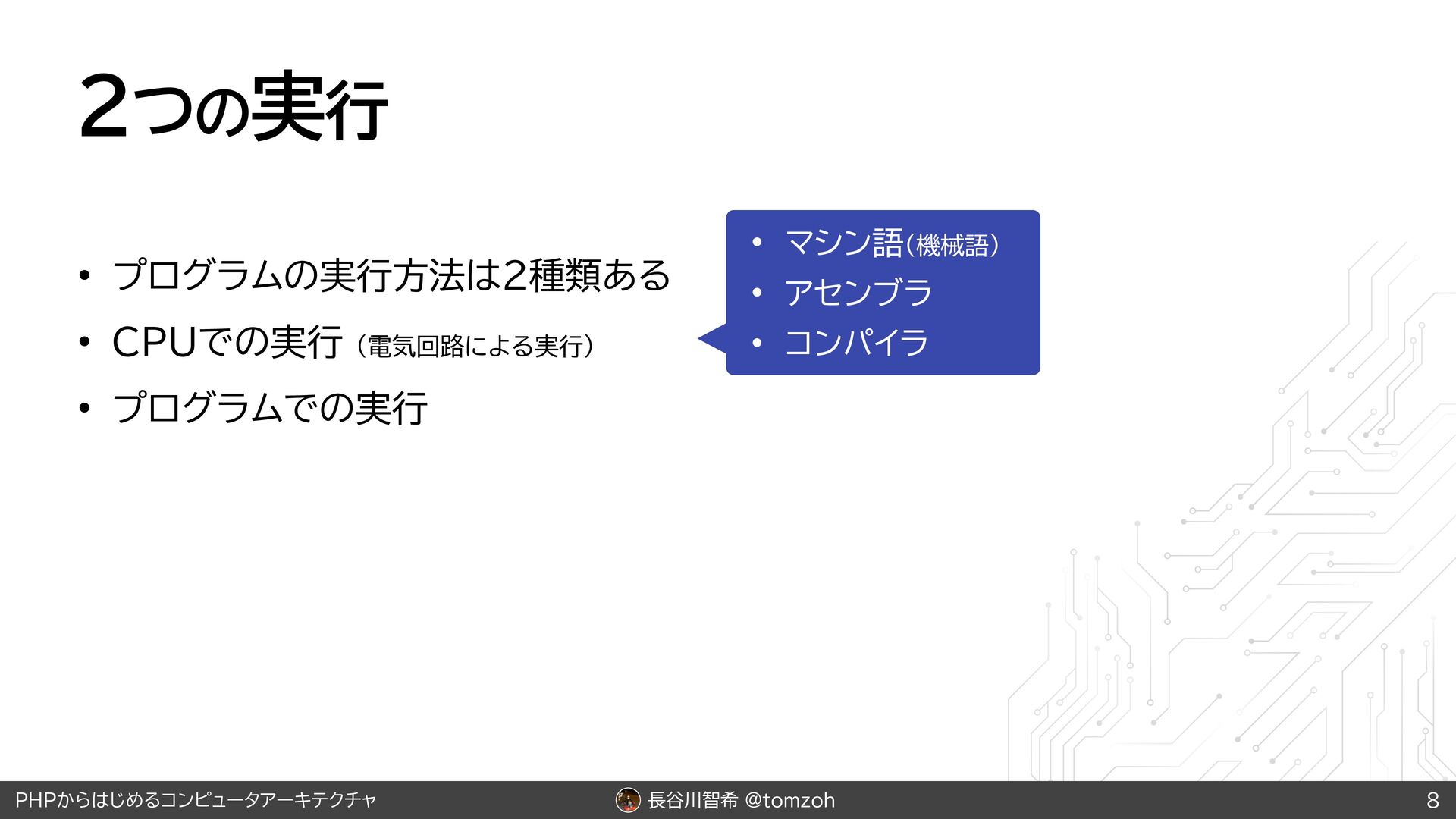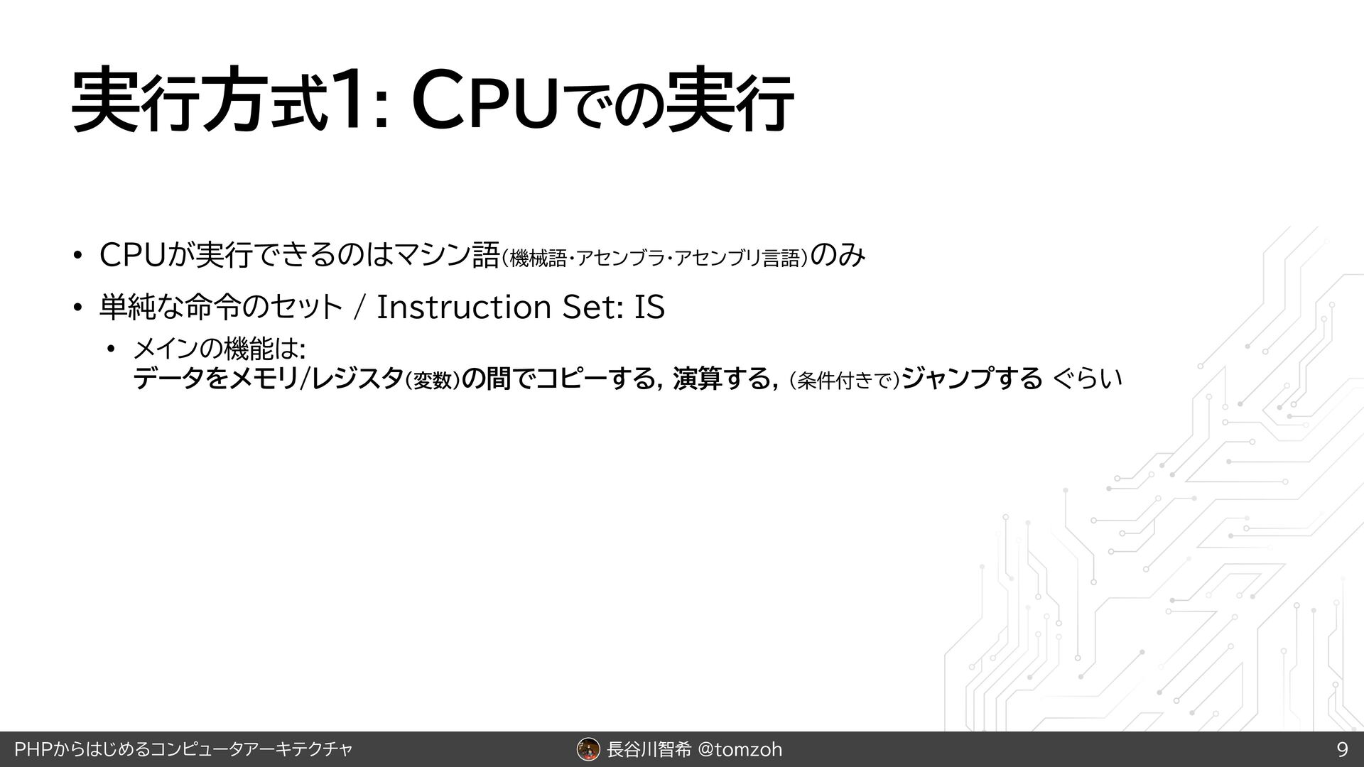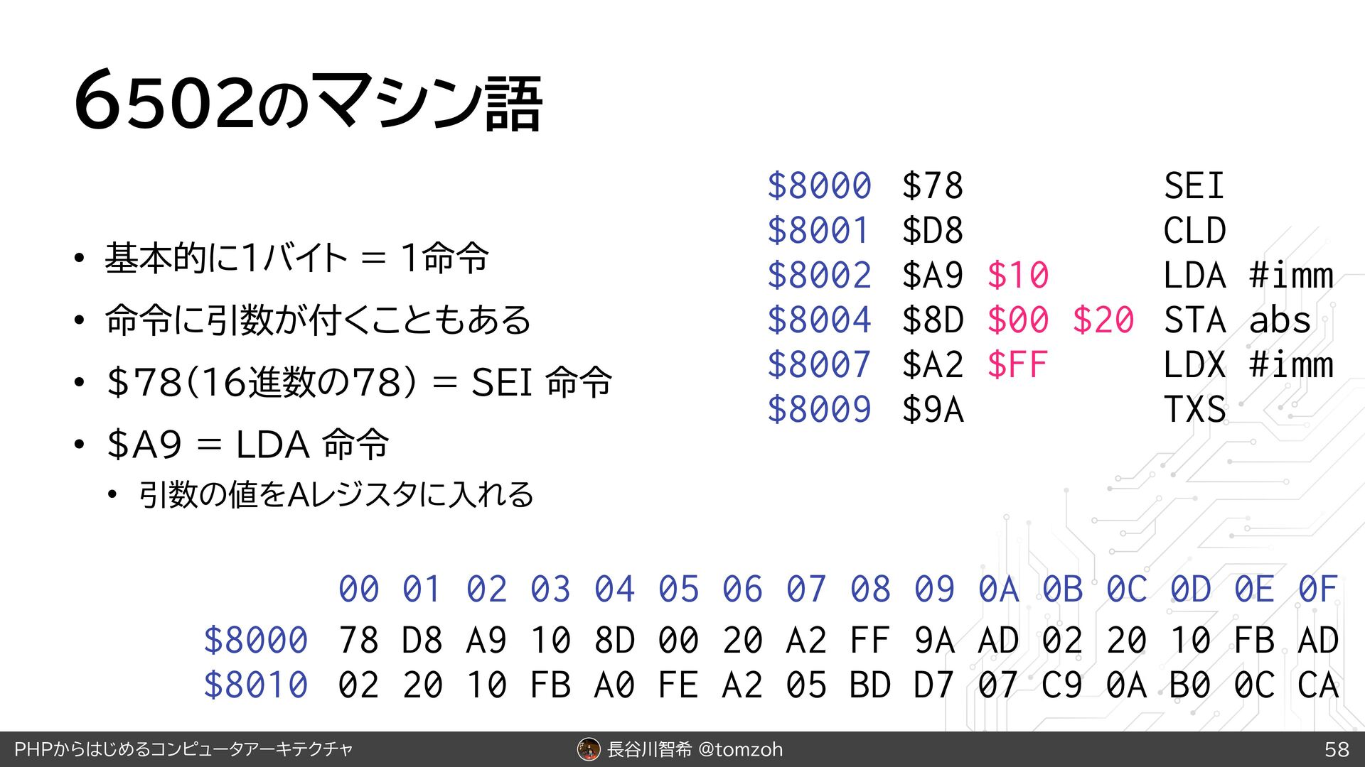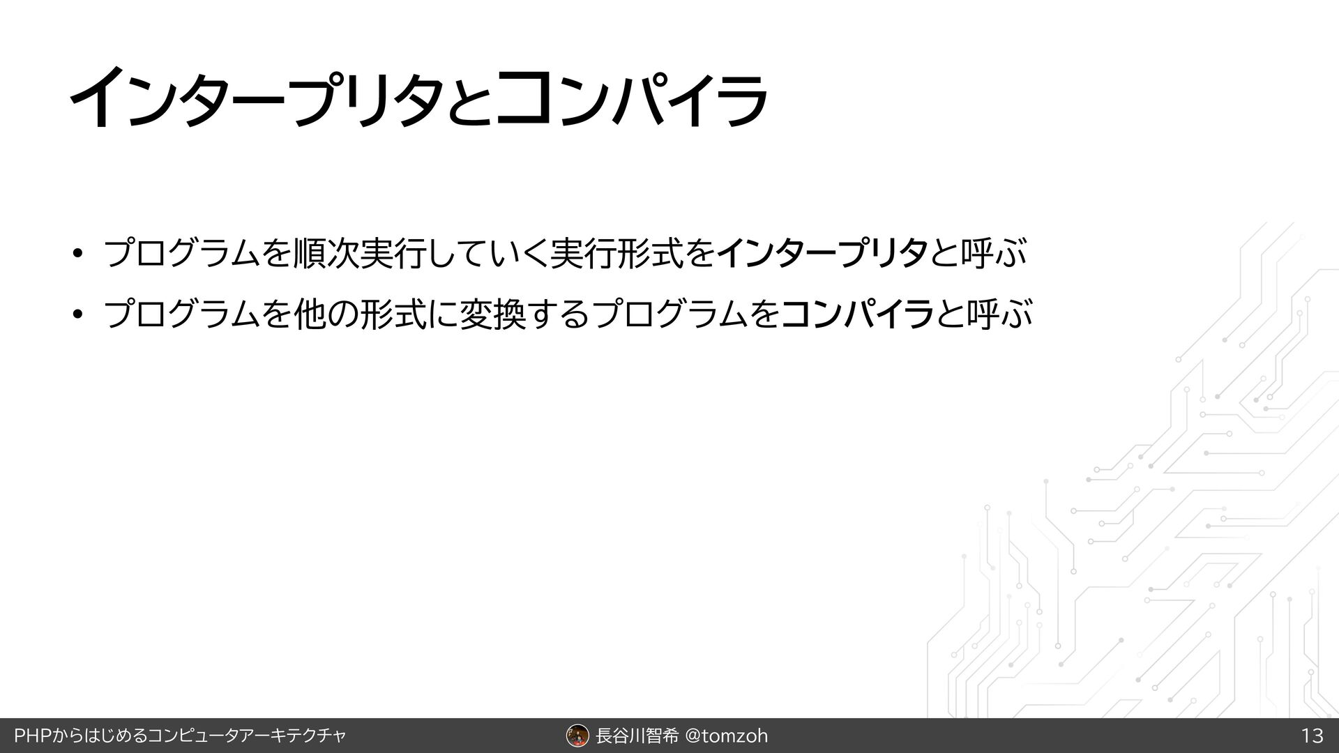 → マシン語(バイナリ) CPUで実行 $ ./hello-world 55 #include <stdio.h> int main(void){ printf("Hello, world."); } hello-world.c .LC0: .string "Hello, world." : main: endbr64 pushq %rbp movq %rsp, %rbp leaq .LC0(%rip), %rdi movl $0, %eax call printf@PLT movl $0, %eax : hello-world.s 00000000 7f 45 4c 46 02 01 01 00 00 00 00 00 00 00 00 00 |.ELF............| 00000010 03 00 3e 00 01 00 00 00 60 10 00 00 00 00 00 00 |..>.....`.......| 00000020 40 00 00 00 00 00 00 00 80 39 00 00 00 00 00 00 |@........9......| : hello-world